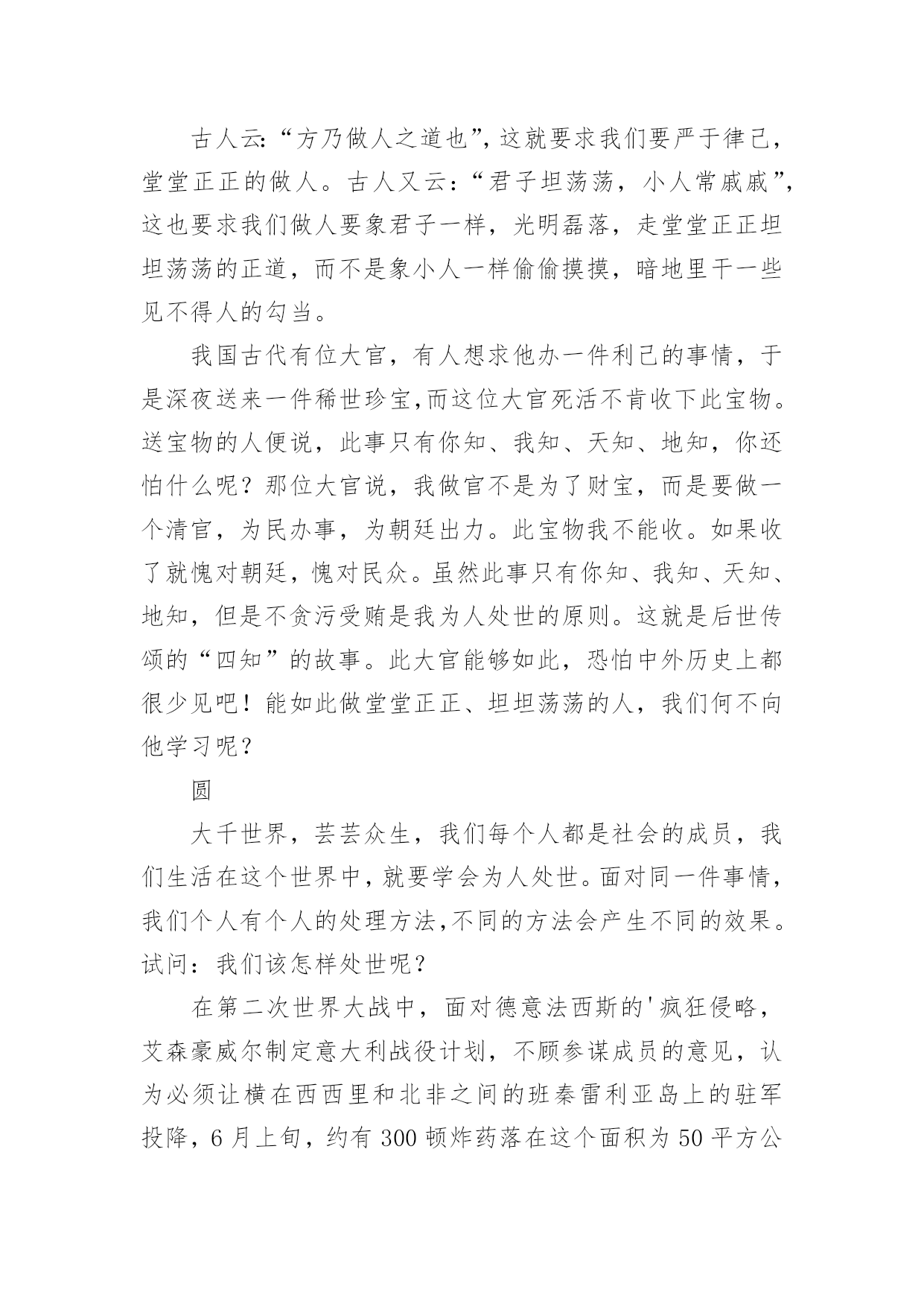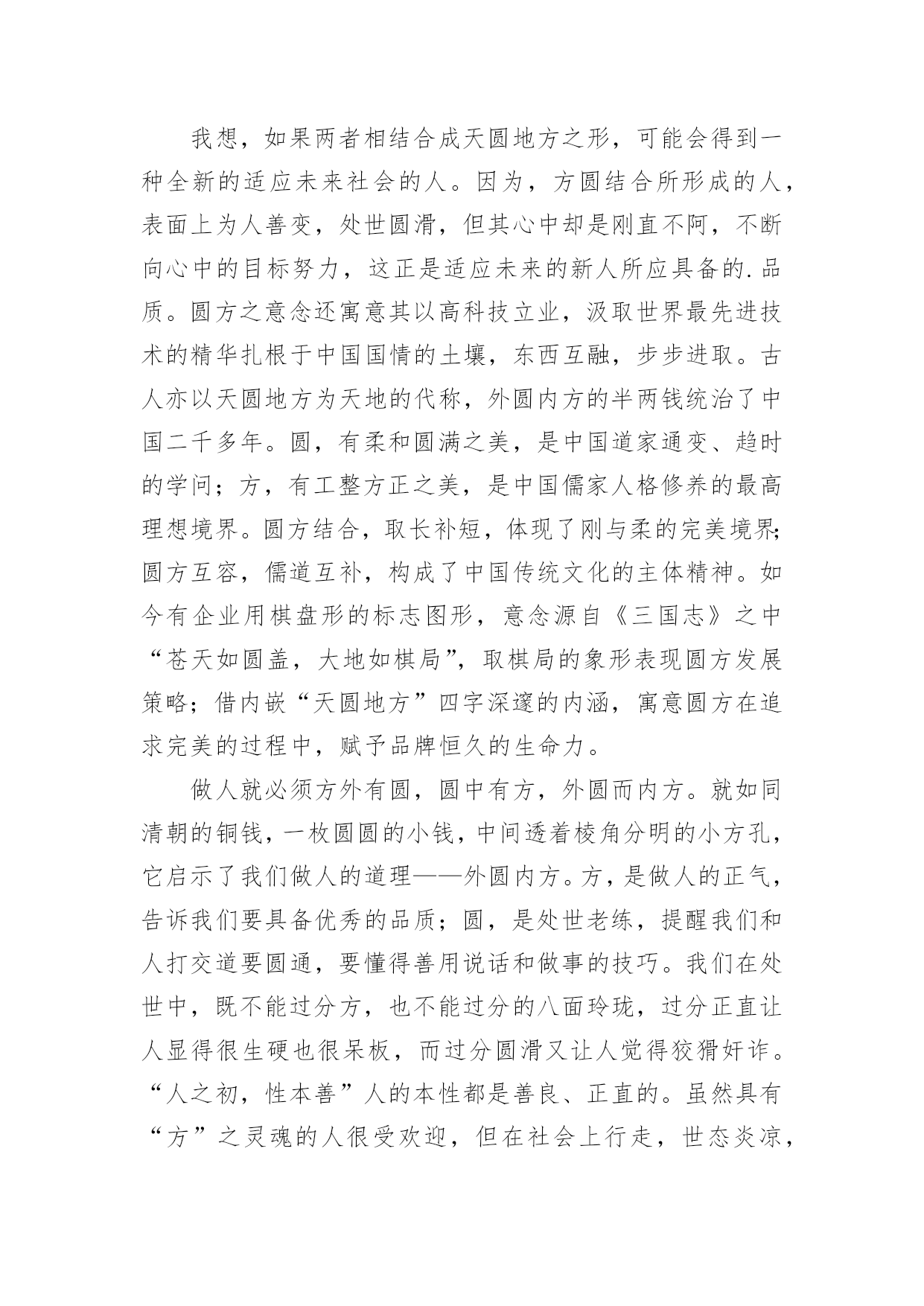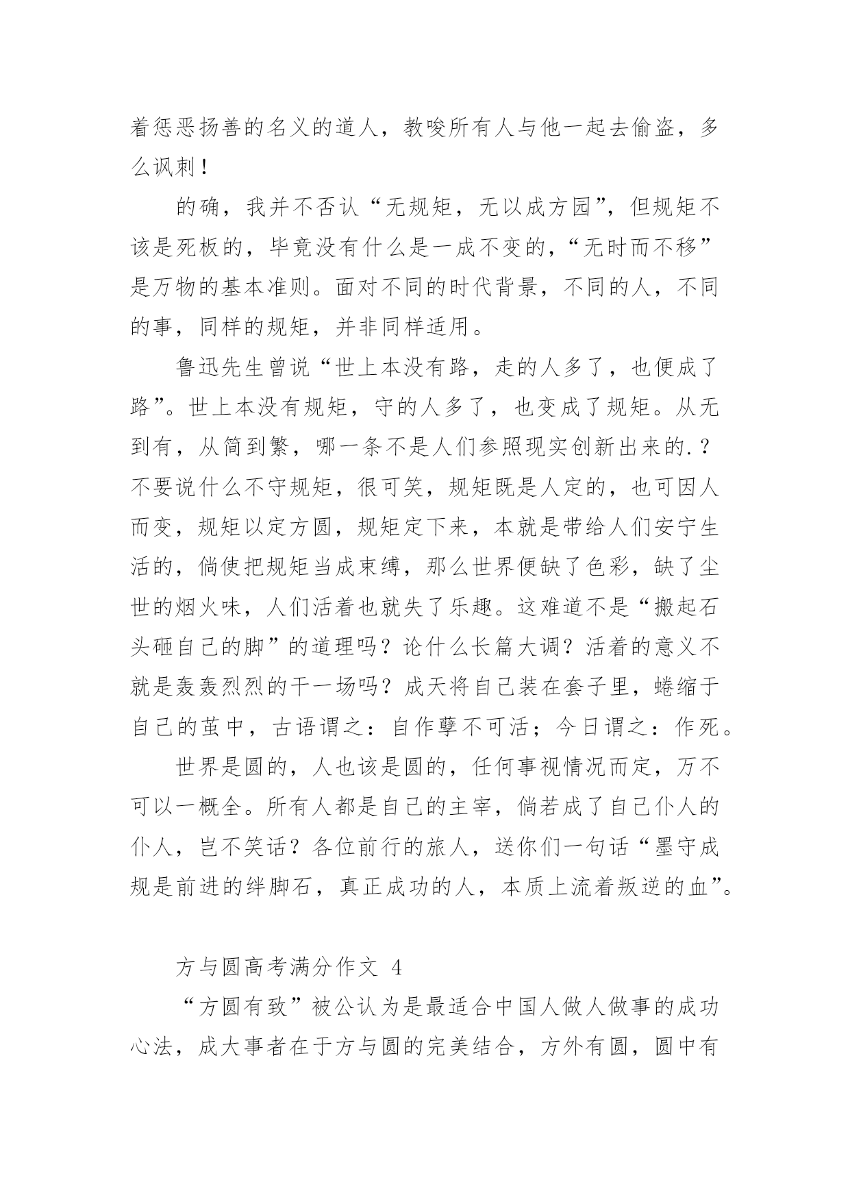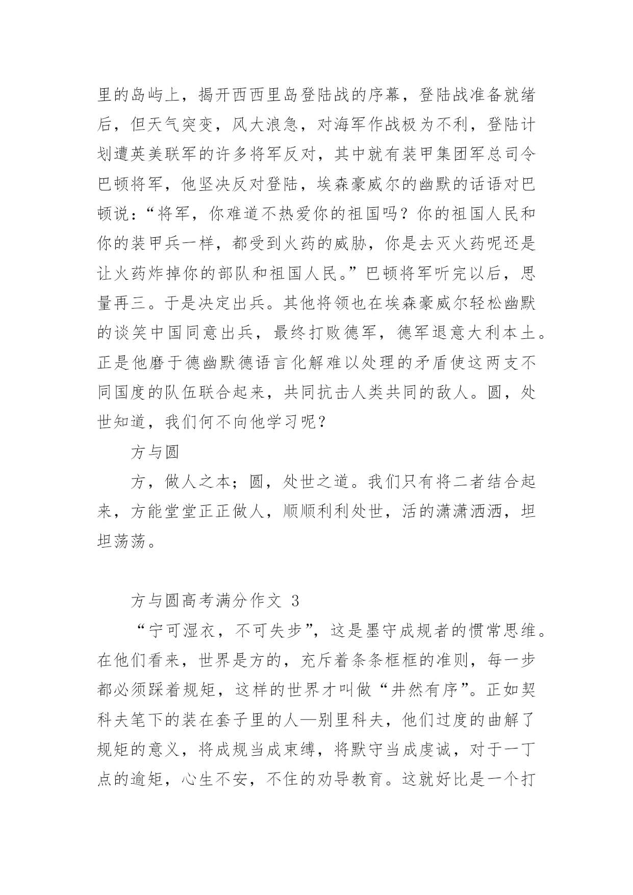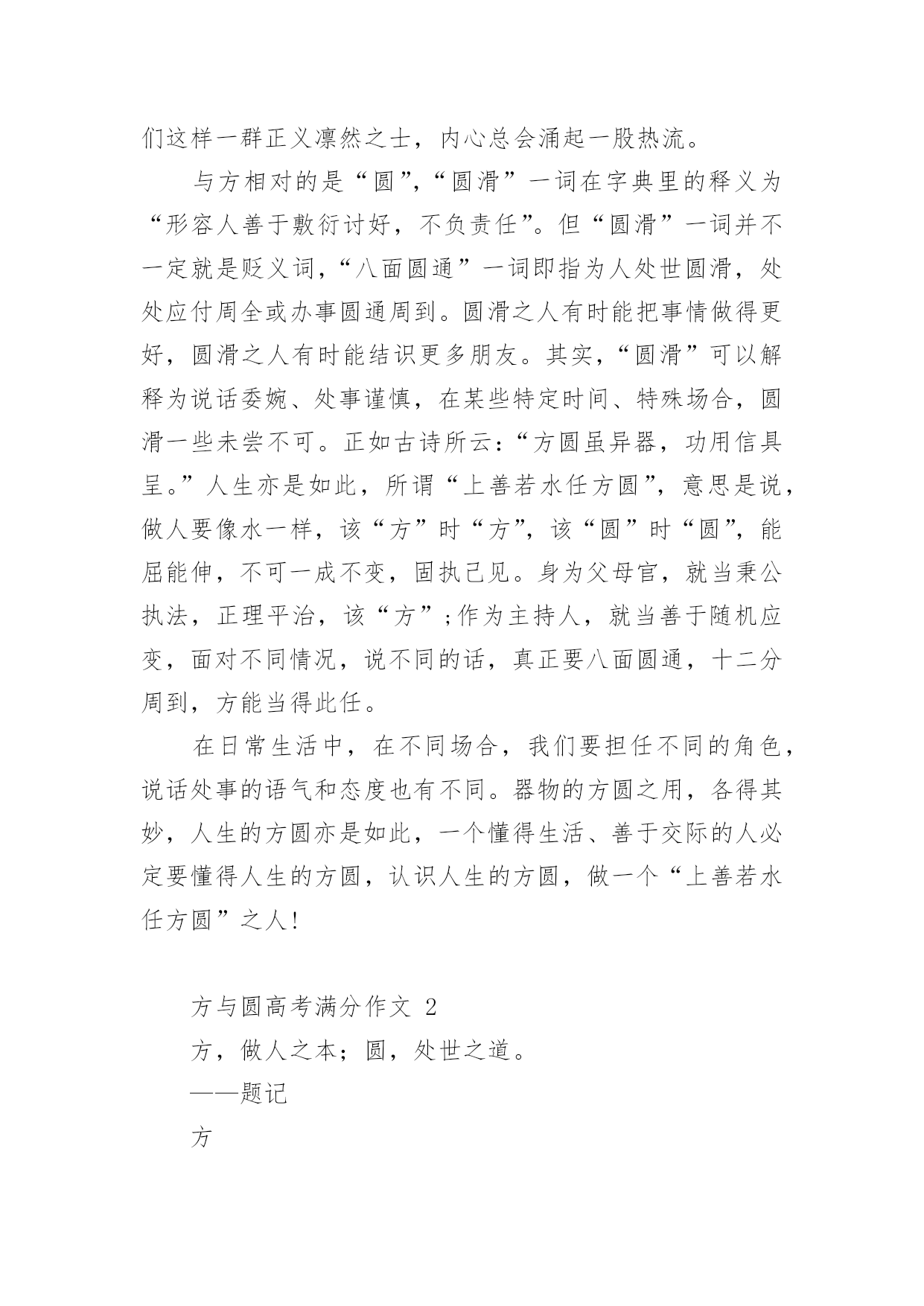 方与圆高考满分作文方与圆高考满分作文(精选6篇)在平时的学习、工作或生活中,大家都不可避免地会接触到作文吧,作文是人们以书面形式表情达意的言语活动。那么你有了解过作文吗?下面是小编为大家收集的方与圆高考满分作文,希望对大家有所帮助。方与圆高考满分作文1“方形”与“圆形”是两种格格不入的图形,正所谓“方枘圆凿”,意思是说,方榫头和圆卯眼,两者合不起来。由此引申出的“方正”与“圆滑”,也表达了相反的意思。谈到“方”,很容易让人联想到“正”:正色直言、正身明法、正身清心、正气凛然、正言不讳、正己守道……这些词,形容的都是“方正”之士。所谓“方正之士”,指的是品行正直、不阿谀奉承的.人。司马迁便是这样一个典型人物,他出生于史官之家,继承父业,专门负责整理编纂前朝史料史书和搜集记录本朝史实。对,是“史实”!他要记录的就是史实。面对汉武帝的威逼,面临正义与尊严的艰难抉择,他,并没有屈服,默默忍受着宫刑的屈辱,他,含泪写下了《史记》这部不朽的传世巨作。倘若他不是一个正身明法之人,又怎会作出这样的选择?倘若他不是一个方正之士,又怎会有《史记》这样震惊后世的著作的诞生?每每想到他们这样一群正义凛然之士,内心总会涌起一股热流。与方相对的是“圆”,“圆滑”一词在字典里的释义为“形容人善于敷衍讨好,不负责任”。但“圆滑”一词并不一定就是贬义词,“八面圆通”一词即指为人处世圆滑,处处应付周全或办事圆通周到。圆滑之人有时能把事情做得更好,圆滑之人有时能结识更多朋友。其实,“圆滑”可以解释为说话委婉、处事谨慎,在某些特定时间、特殊场合,圆滑一些未尝不可。正如古诗所云:“方圆虽异器,功用信具呈。”人生亦是如此,所谓“上善若水任方圆”,意思是说,做人要像水一样,该“方”时“方”,该“圆”时“圆”,能屈能伸,不可一成不变,固执己见。身为父母官,就当秉公执法,正理平治,该“方”;作为主持人,就当善于随机应变,面对不同情况,说不同的话,真正要八面圆通,十二分周到,方能当得此任。在日常生活中,在不同场合,我们要担任不同的角色,说话处事的语气和态度也有不同。器物的方圆之用,各得其妙,人生的方圆亦是如此,一个懂得生活、善于交际的人必定要懂得人生的方圆,认识人生的方圆,做一个“上善若水任方圆”之人!方与圆高考满分作文2方,做人之本;圆,处世之道。——题记方古人云:“方乃做人之道也”,这就要求我们要严于律己,堂堂正正的做人。古人又云:“君子坦荡荡,小人常戚戚”,这也要求我们做人要象君子一样,光明磊落,走堂堂正正坦坦荡荡的正道,而不是象小人一样偷偷摸摸,暗地里干一些见不得人的勾当。我国古代有位大官,有人想求他办一件利己的事情,于是深夜送来一件稀世珍宝,而这位大官死活不肯收下此宝物。送宝物的人便说,此事只有你知、我知、天知、地知,你还怕什么呢?那位大官说,我做官不是为了财宝,而是要做一个清官,为民办事,为朝廷出力。此宝物我不能收。如果收了就愧对朝廷,愧对民众。虽然此事只有你知、我知、天知、地知,但是不贪污受贿是我为人处世的原则。这就是后世传颂的“四知”的故事。此大官能够如此,恐怕中外历史上都很少见吧!能如此做堂堂正正、坦坦荡荡的人,我们何不向他学习呢?圆大千世界,芸芸众生,我们每个人都是社会的成员,我们生活在这个世界中,就要学会为人处世。面对同一件事情,我们个人有个人的处理方法,不同的方法会产生不同的效果。试问:我们该怎样处世呢?在第二次世界大战中,面对德意法西斯的'疯狂侵略,艾森豪威尔制定意大利战役计划,不顾参谋成员的意见,认为必须让横在西西里和北非之间的班秦雷利亚岛上的驻军投降,6月上旬,约有300顿炸药落在这个面积为50平方公里的岛屿上,揭开西西里岛登陆战的序幕,登陆战准备就绪后,但天气突变,风大浪急,对海军作战极为不利,登陆计划遭英美联军的许多将军反对,其中就有装甲集团军总司令巴顿将军,他坚决反对登陆,埃森豪威尔的幽默的话语对巴顿说:“将军,你难道不热爱你的祖国吗?你的祖国人民和你的装甲兵一样,都受到火药的威胁,你是去灭火药呢还是让火药炸掉你的部队和祖国人民。”巴顿将军听完以后,思量再三。于是决定出兵。其他将领也在埃森豪威尔轻松幽默的谈笑中国同意出兵,最终打败德军,德军退意大利本土。正是他磨于德幽默德语言化解难以处理的矛盾使这两支不同国度的队伍联合起来,共同抗击人类共同的敌人。圆,处世知道,我们何不向他学习呢?方与圆方,做人之本;圆,处世之道。我们只有将二者结合起来,方能堂堂正正做人,顺顺利利处世,活的潇潇洒洒,坦坦荡荡。方与圆高考满分作文3“宁可湿衣,不可失步”,这是墨守成规者的惯常思维。在他们看来,世界是方的,充斥着条条框框的准则,每一步都必须踩着规矩,这样的世界才叫做“井然有序”。正如契科夫笔下的装在套子里的人—别里科夫,他们过度的曲解了规矩的意义,将成规当成束