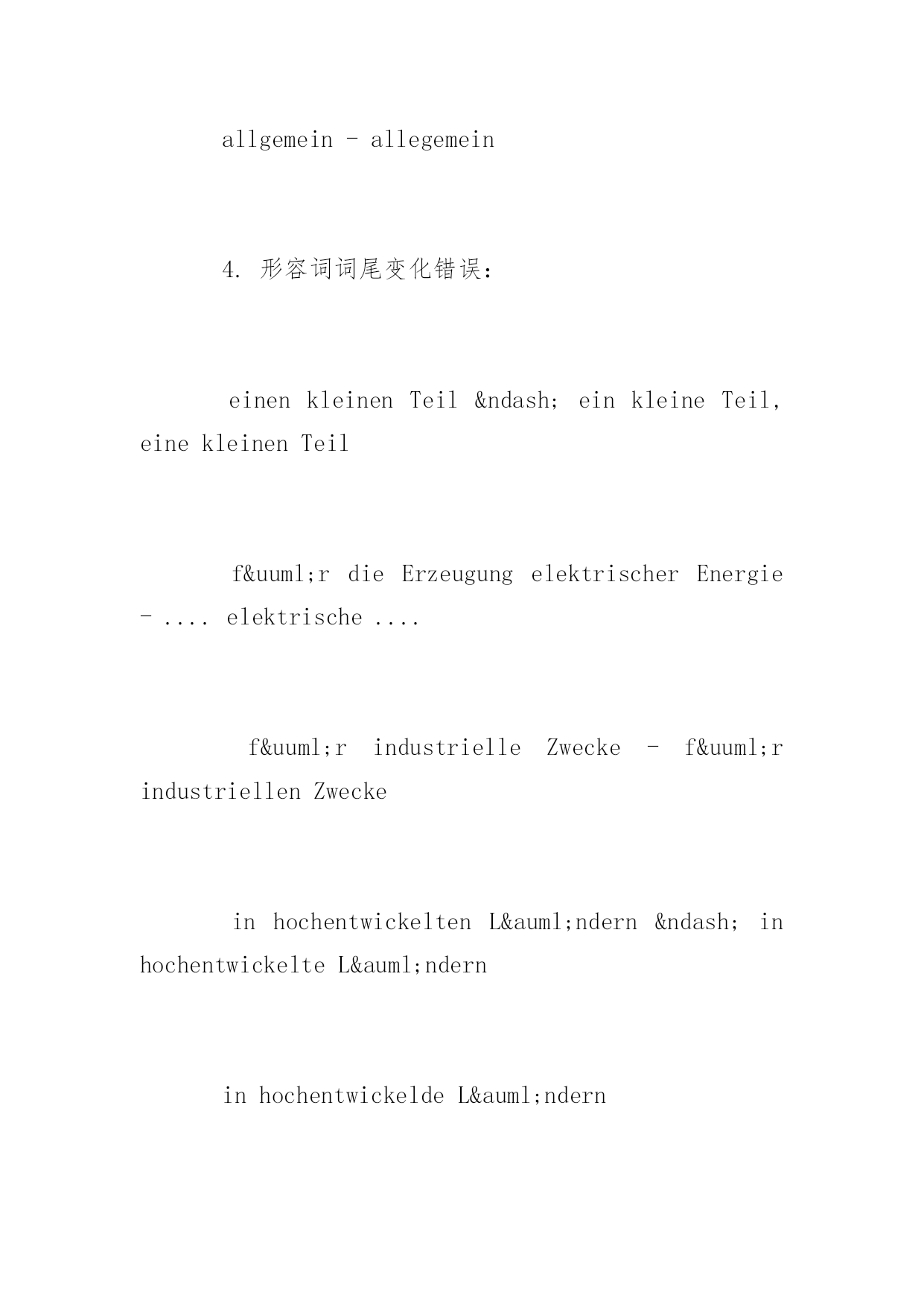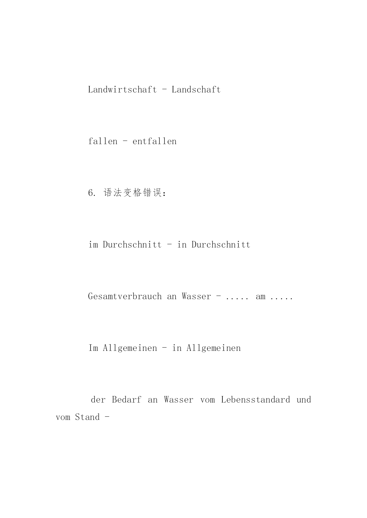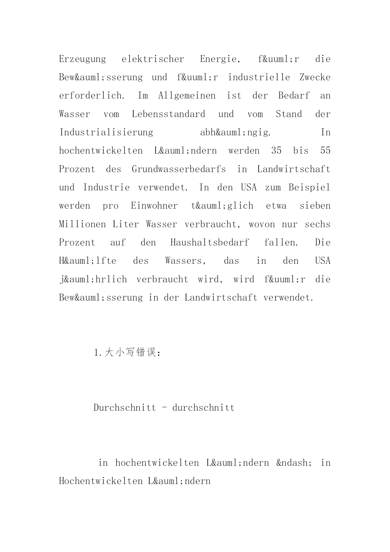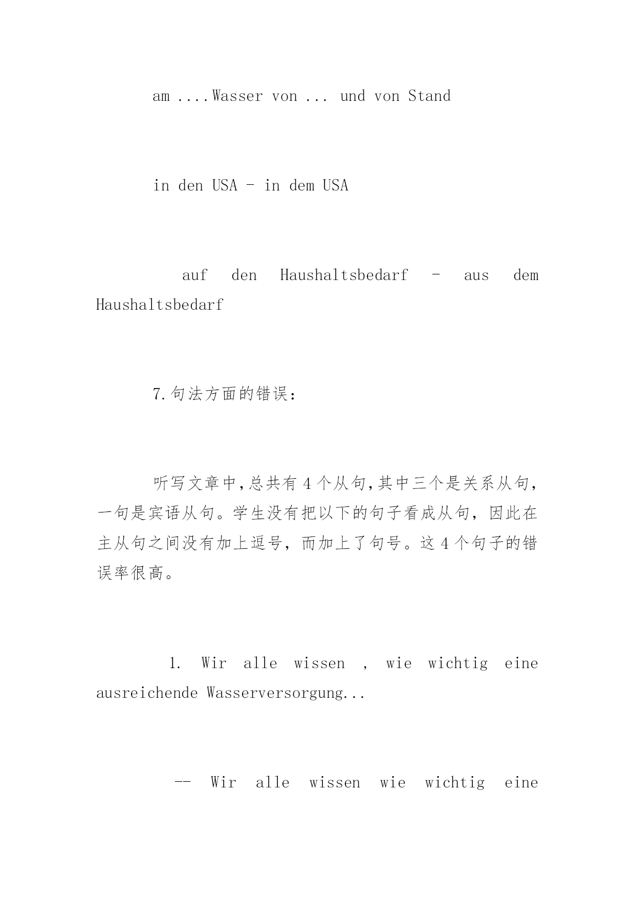 德语公共四级考试题型解析德语公共四级考试题型解析成功=艰苦劳动+正确方法+少说空话。以下是小编为大家搜索整理的德语公共四级考试题型解析,希望能给大家带来帮助!更多精彩内容请及时关注我们应届毕业生考试网!一、听写部分结果分析听写原文WasserfürjedenZweckWirallewissen,wiewichtigeineausreichendeWasserversorgungfürdastäglicheLebenist.DerMenschtrinktimDurchschnittzweiLiterproTag,wasnureinenkleinenTeildesGesamtverbrauchsanWasserausmacht.WesentlichmehristfürdieErzeugungelektrischerEnergie,fürdieBewässerungundfürindustrielleZweckeerforderlich.ImAllgemeinenistderBedarfanWasservomLebensstandardundvomStandderIndustrialisierungabhängig.InhochentwickeltenLändernwerden35bis55ProzentdesGrundwasserbedarfsinLandwirtschaftundIndustrieverwendet.IndenUSAzumBeispielwerdenproEinwohnertäglichetwasiebenMillionenLiterWasserverbraucht,wovonnursechsProzentaufdenHaushaltsbedarffallen.DieHälftedesWassers,dasindenUSAjährlichverbrauchtwird,wirdfürdieBewässerunginderLandwirtschaftverwendet.1.大小写错误:Durchschnitt-durchschnittinhochentwickeltenLändern–inHochentwickeltenLändernproTag-protagIndustrie-industrie2.名词与复合词拼写错误:Energie-Energy,EnegieIndustrialisierung-Industriealisierung,IndustrielizierungWasserversorgung-Wasserversorgung,WasserversorgenGesamtverbrauch-Gesammtverbrauch,Gesamtgebrauch,gesamtenVerbrauchLebensstandard-Lebenstandstart,LebensstardGrundwasserbedarf-GrundwasserBedarfHaushaltsbedarf-Haushaltbedarf,HaushaltBedarf3.形容词拼写错误:wesentlich-wiesentlich,wesendlicherforderlich-erfordlich,erfolglichindustriell-industrill,industrielallgemein-allegemein4.形容词词尾变化错误:einenkleinenTeil–einkleineTeil,einekleinenTeilfürdieErzeugungelektrischerEnergie-....elektrische....fürindustrielleZwecke-fürindustriellenZweckeinhochentwickeltenLändern–inhochentwickelteLänderninhochentwickeldeLändern5.错词:wiralle-wieallestäglich-technischErzeugung-Abzeugung,VerzeugungZwecke-ZweigLiter-MeterproEinwohner-proeinMonat,proeinWocheBewässerung-Verbesserung,Bewesserung,Be