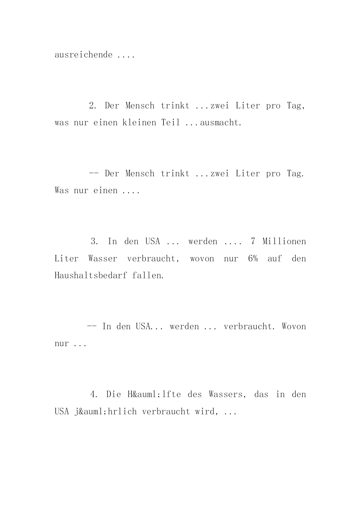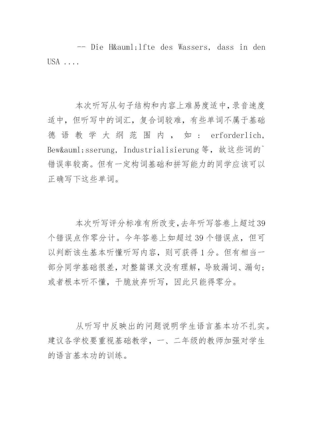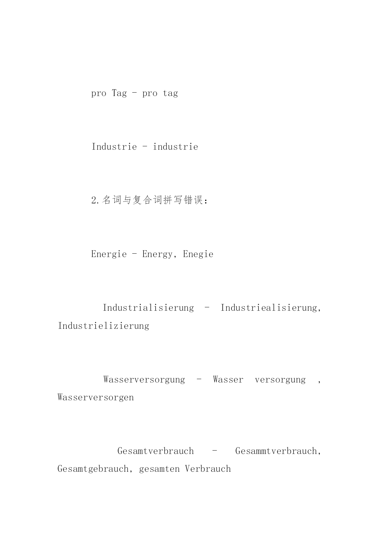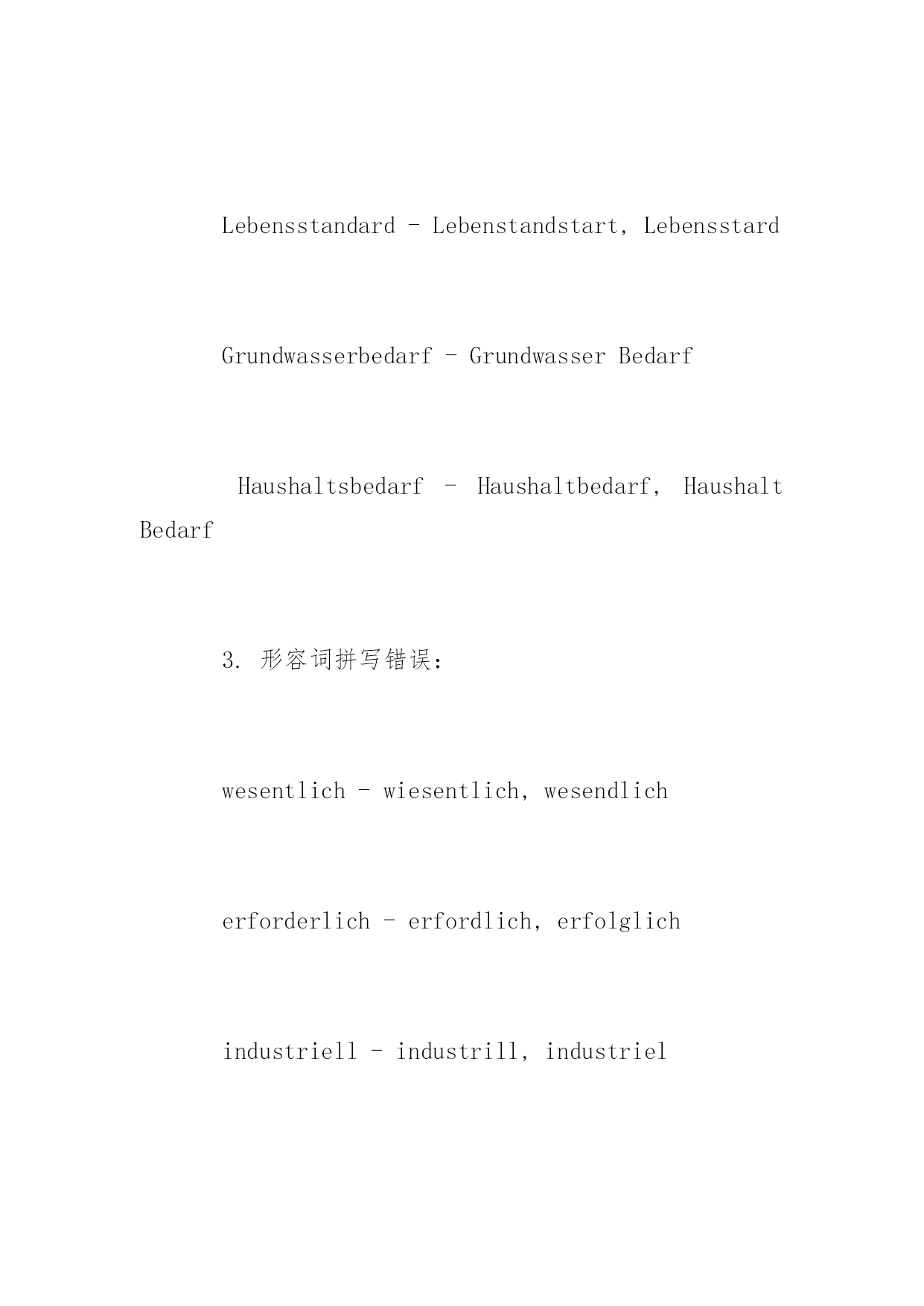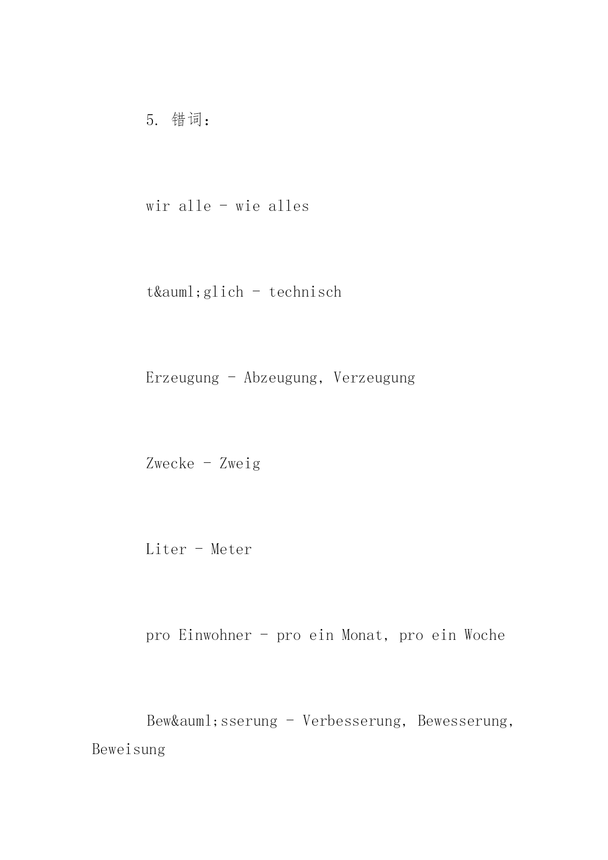 德语公共四级考试题型解析德语公共四级考试题型解析成功=艰苦劳动+正确方法+少说空话。以下是小编为大家搜索整理的德语公共四级考试题型解析,希望能给大家带来帮助!更多精彩内容请及时关注我们应届毕业生考试网!一、听写部分结果分析听写原文WasserfürjedenZweckWirallewissen,wiewichtigeineausreichendeWasserversorgungfürdastäglicheLebenist.DerMenschtrinktimDurchschnittzweiLiterproTag,wasnureinenkleinenTeildesGesamtverbrauchsanWasserausmacht.WesentlichmehristfürdieErzeugungelektrischerEnergie,fürdieBewässerungundfürindustrielleZweckeerforderlich.ImAllgemeinenistderBedarfanWasservomLebensstandardundvomStandderIndustrialisierungabhängig.InhochentwickeltenLändernwerden35bis55ProzentdesGrundwasserbedarfsinLandwirtschaftundIndustrieverwendet.IndenUSAzumBeispielwerdenproEinwohnertäglichetwasiebenMillionenLiterWasserverbraucht,wovonnursechsProzentaufdenHaushaltsbedarffallen.DieHälftedesWassers,dasindenUSAjährlichverbrauchtwird,wirdfürdieBewässerunginderLandwirtschaftverwendet.1.大小写错误:Durchschnitt-durchschnittinhochentwickeltenLändern–inHochentwickeltenLändernproTag-protagIndustrie-industrie2.名词与复合词拼写错误:Energie-Energy,EnegieIndustrialisierung-Industriealisierung,IndustrielizierungWasserversorgung-Wasserversorgung,WasserversorgenGesamtverbrauch-Gesammtverbrauch,Gesamtgebrauch,gesamtenVerbrauchLebensstandard-Lebenstandstart,LebensstardGrundwasserbedarf-GrundwasserBedarfHaushaltsbedarf-Haushaltbedarf,HaushaltBedarf3.形容词拼写错误:wesentlich-wiesentlich,wesendlicherforderlich-erfordlich,erfolglichindustriell-industrill,industrielallgemein-allegemein4.形容词词尾变化错误:einenkleinenTeil–einkleineTeil,einekleinenTeilfürdieErzeugungelektrischerEnergie-....elektrische....fürindustrielleZwecke-fürindustriellenZweckeinhochentwickeltenLändern–inhochentwickelteLänderninhochentwickeldeLändern5.错词:wiralle-wieallestäglich-technischErzeugung-Abzeugung,VerzeugungZwecke-ZweigLiter-MeterproEinwohner-proeinMonat,proeinWocheBewässerung-Verbesserung,Bewesserung,Be
