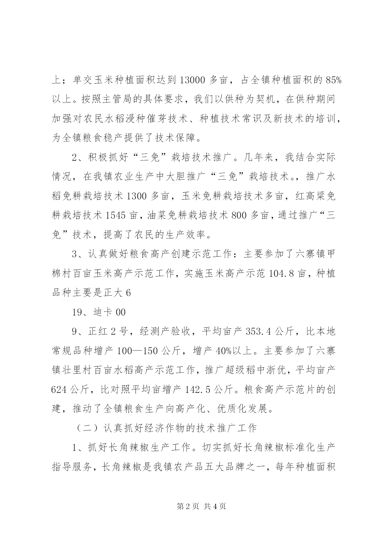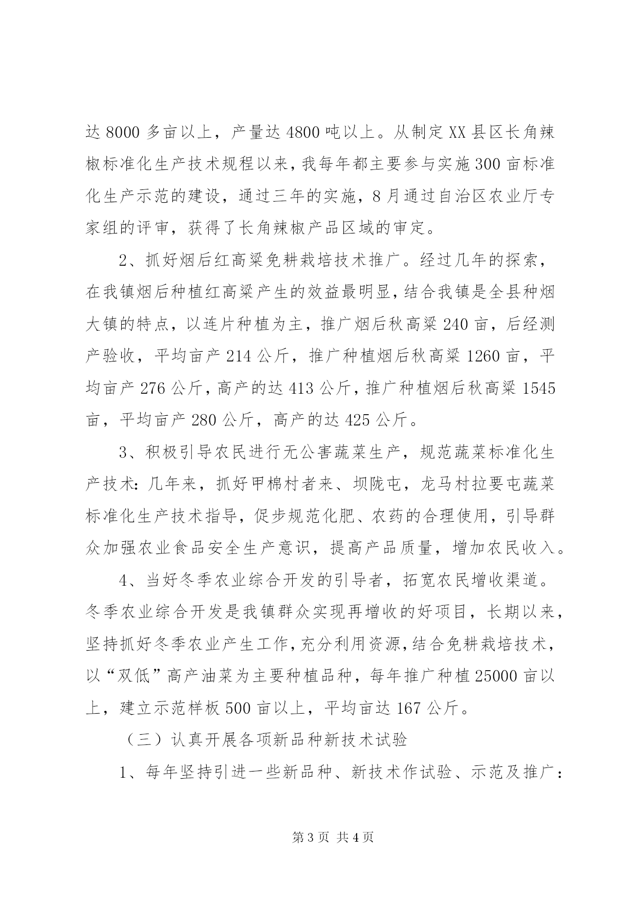 第PAGE\*Arabic\*MERGEFORMAT4页共NUMPAGES\*MERGEFORMAT4页[精品]晋升农艺师职称专业技术工总结本人于1992年7月参加工作,1998年12月获得助理农艺师资格。现任镇推广站副站长。自任现职以来,本人热爱本职工作,不断学习、更新专业技术知识,于9月参加广西大学农学专科函授班学习,6月顺利毕业;同时长期深入田间地头开展各项技术指导,把农业科技培训送到生产第一线,较好地完成本职工作。现将任现职以来的专业技术工作总结如下:一、在政治思想和道德建设方面本人坚决拥护中国共产党,热爱社会主义,平时积极利用报纸、电视、网络等媒体认真学习马列著作、毛泽东思想、邓小平理论、“三个代表”的重要思想,科学发展观等各种政治理论知识,用政治理论武装头脑,并积极参加广西大学大专班函授及本系统组织的各种农业技术培训,以提高自身素质,更好地服务“三农”,为我县的农业发展、农民增收竭尽自己的所能。二、在工作业务表现及主要业绩方面(一)认真抓好粮食高产栽培技术的推广工作1、积极做好双杂良种推广,抓好粮食安全生产工作,确保全镇粮食稳产增产,不断提高粮食向优质化方向发展:多年来,积极做好良种良法的推广,认真抓好各个关键环节的培训、指导服务工作。使全镇38000多亩水稻良种种植覆盖率达到97%以上,推广优质谷种植面积达28500多亩,占良种种植覆盖率达75%以上;单交玉米种植面积达到13000多亩,占全镇种植面积的85%以上。按照主管局的具体要求,我们以供种为契机,在供种期间加强对农民水稻浸种催芽技术、种植技术常识及新技术的培训,为全镇粮食稳产提供了技术保障。2、积极抓好“三免”栽培技术推广。几年来,我结合实际情况,在我镇农业生产中大胆推广“三免”栽培技术。,推广水稻免耕栽培技术1300多亩,玉米免耕栽培技术多亩,红高粱免耕栽培技术1545亩,油菜免耕栽培技术800多亩,通过推广“三免”技术,提高了农民的生产效率。3、认真做好粮食高产创建示范工作:主要参加了六寨镇甲棉村百亩玉米高产示范工作,实施玉米高产示范104.8亩,种植品种主要是正大619、迪卡009、正红2号,经测产验收,平均亩产353.4公斤,比本地常规品种增产100—150公斤,增产40%以上。主要参加了六寨镇壮里村百亩水稻高产示范工作,推广超级稻中浙优,平均亩产624公斤,比对照平均亩增产142.5公斤。粮食高产示范片的创建,推动了全镇粮食生产向高产化、优质化发展。(二)认真抓好经济作物的技术推广工作1、抓好长角辣椒生产工作。切实抓好长角辣椒标准化生产指导服务,长角辣椒是我镇农产品五大品牌之一,每年种植面积达8000多亩以上,产量达4800吨以上。从制定XX县区长角辣椒标准化生产技术规程以来,我每年都主要参与实施300亩标准化生产示范的建设,通过三年的实施,8月通过自治区农业厅专家组的评审,获得了长角辣椒产品区域的审定。2、抓好烟后红高粱免耕栽培技术推广。经过几年的探索,在我镇烟后种植红高粱产生的效益最明显,结合我镇是全县种烟大镇的特点,以连片种植为主,推广烟后秋高粱240亩,后经测产验收,平均亩产214公斤,推广种植烟后秋高粱1260亩,平均亩产276公斤,高产的达413公斤,推广种植烟后秋高粱1545亩,平均亩产280公斤,高产的达425公斤。3、积极引导农民进行无公害蔬菜生产,规范蔬菜标准化生产技术:几年来,抓好甲棉村者来、坝陇屯,龙马村拉要屯蔬菜标准化生产技术指导,促步规范化肥、农药的合理使用,引导群众加强农业食品安全生产意识,提高产品质量,增加农民收入。4、当好冬季农业综合开发的引导者,拓宽农民增收渠道。冬季农业综合开发是我镇群众实现再增收的好项目,长期以来,坚持抓好冬季农业产生工作,充分利用资源,结合免耕栽培技术,以“双低”高产油菜为主要种植品种,每年推广种植25000亩以上,建立示范样板500亩以上,平均亩达167公斤。(三)认真开展各项新品种新技术试验1、每年坚持引进一些新品种、新技术作试验、示范及推广:几年来,每年结合一些新技术进行10个超级稻品种、10个玉米品种、3—5个红高粱品种、2—3个长角辣椒品种、3—5个油菜品种试验、示范,为种植模式和生产用种提供理论依据,为当地农业结构调整提供科学资料。2、完成烟地套种红(彩)薯引种试种任务。作为主要参与者完成烟地套种红(彩)薯引种试种任务,经实地测产,红薯平均亩产1047公斤,一般商品红薯800多公斤,亩产经济效益480元,试验取得成功。3、开展油菜、马铃薯免耕栽培试验示范。作为主要参与者,一是开展油菜、水稻固定厢沟免耕栽培试验取得成功。