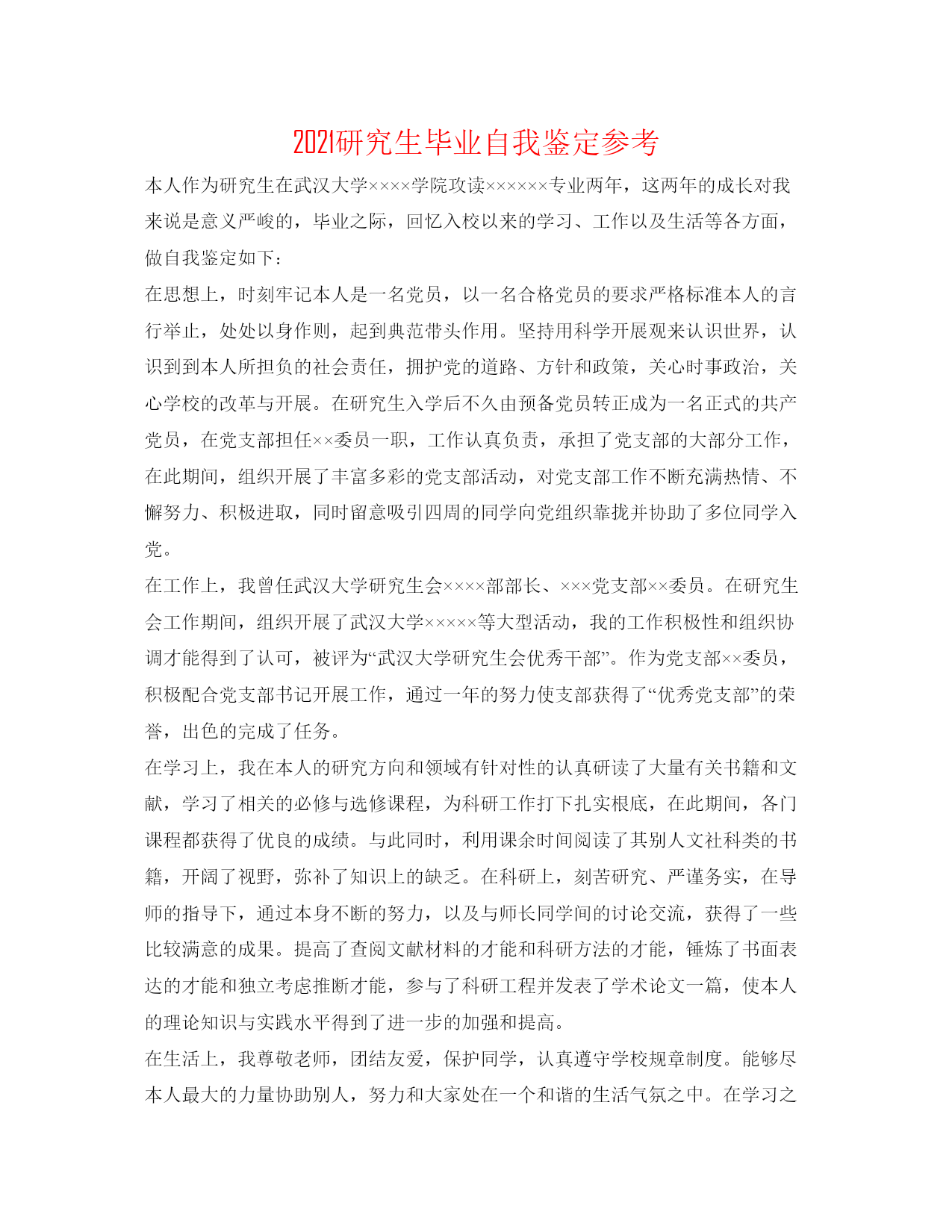 2021研究生毕业自我鉴定参考本人作为研究生在武汉大学××××学院攻读××××××专业两年,这两年的成长对我来说是意义严峻的,毕业之际,回忆入校以来的学习、工作以及生活等各方面,做自我鉴定如下:在思想上,时刻牢记本人是一名党员,以一名合格党员的要求严格标准本人的言行举止,处处以身作则,起到典范带头作用。坚持用科学开展观来认识世界,认识到到本人所担负的社会责任,拥护党的道路、方针和政策,关心时事政治,关心学校的改革与开展。在研究生入学后不久由预备党员转正成为一名正式的共产党员,在党支部担任××委员一职,工作认真负责,承担了党支部的大部分工作,在此期间,组织开展了丰富多彩的党支部活动,对党支部工作不断充满热情、不懈努力、积极进取,同时留意吸引四周的同学向党组织靠拢并协助了多位同学入党。在工作上,我曾任武汉大学研究生会××××部部长、×××党支部××委员。在研究生会工作期间,组织开展了武汉大学×××××等大型活动,我的工作积极性和组织协调才能得到了认可,被评为“武汉大学研究生会优秀干部”。作为党支部××委员,积极配合党支部书记开展工作,通过一年的努力使支部获得了“优秀党支部”的荣誉,出色的完成了任务。在学习上,我在本人的研究方向和领域有针对性的认真研读了大量有关书籍和文献,学习了相关的必修与选修课程,为科研工作打下扎实根底,在此期间,各门课程都获得了优良的成绩。与此同时,利用课余时间阅读了其别人文社科类的书籍,开阔了视野,弥补了知识上的缺乏。在科研上,刻苦研究、严谨务实,在导师的指导下,通过本身不断的努力,以及与师长同学间的讨论交流,获得了一些比较满意的成果。提高了查阅文献材料的才能和科研方法的才能,锤炼了书面表达的才能和独立考虑推断才能,参与了科研工程并发表了学术论文一篇,使本人的理论知识与实践水平得到了进一步的加强和提高。在生活上,我尊敬老师,团结友爱,保护同学,认真遵守学校规章制度。能够尽本人最大的力量协助别人,努力和大家处在一个和谐的生活气氛之中。在学习之余,我也特别注重个人综合素养的提升,我参加征文竞赛,获得较好成绩,参加学校的举办的兴趣运动会活动,参加研究生迎新晚会和本科生毕业晚会的节目表演,屡次参与班级组织的旅游活动,平时经常和同学一起跑步、打乒乓球、羽毛球等,这些活动不仅锻炼了身心,还加深了同学之间的友谊。在研究生阶段,从学业、科研工作,到个人素养,都得到了充分的培养和锻炼,是充实且有意义的两年。这些经历和积累都将成为人生道路上的宝贵财富。从××大学毕业是一段学习历程的完毕,更重要的是我人生中一个崭新的启程,感谢××大学对我培养教育,我将积极进取,勇于开拓,为理想而奋斗,争取为母校添彩,为社会做出奉献。