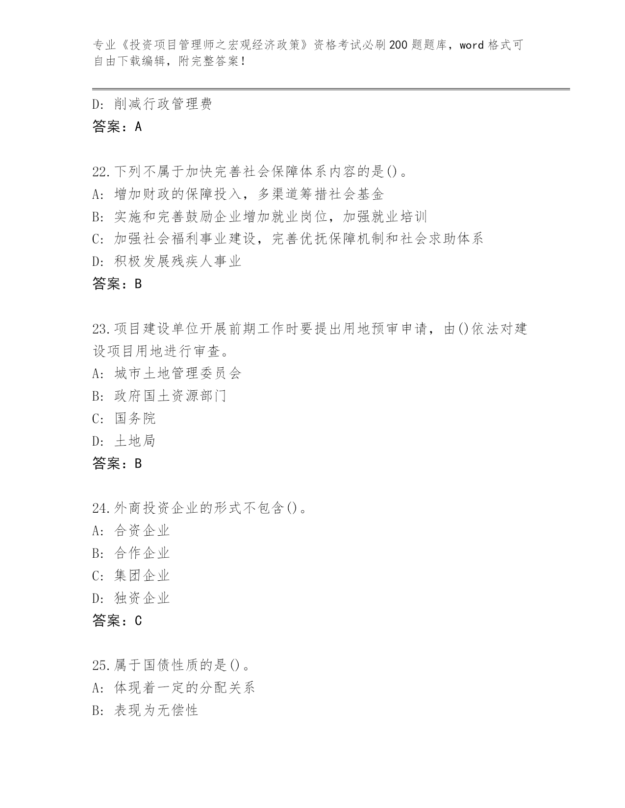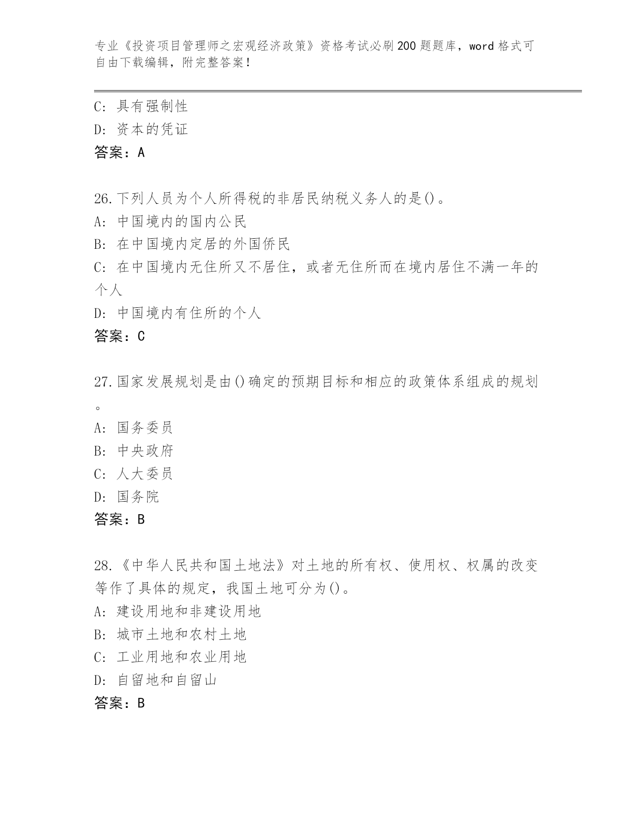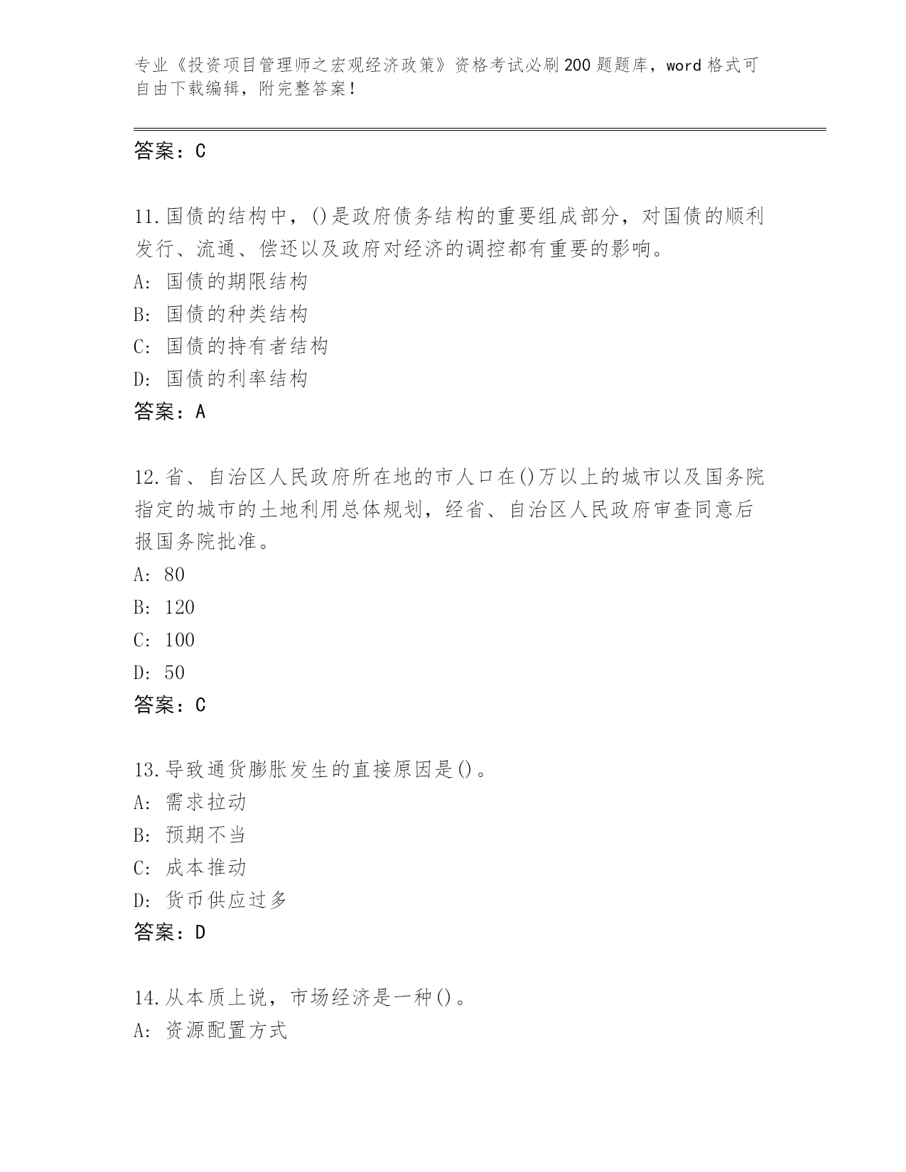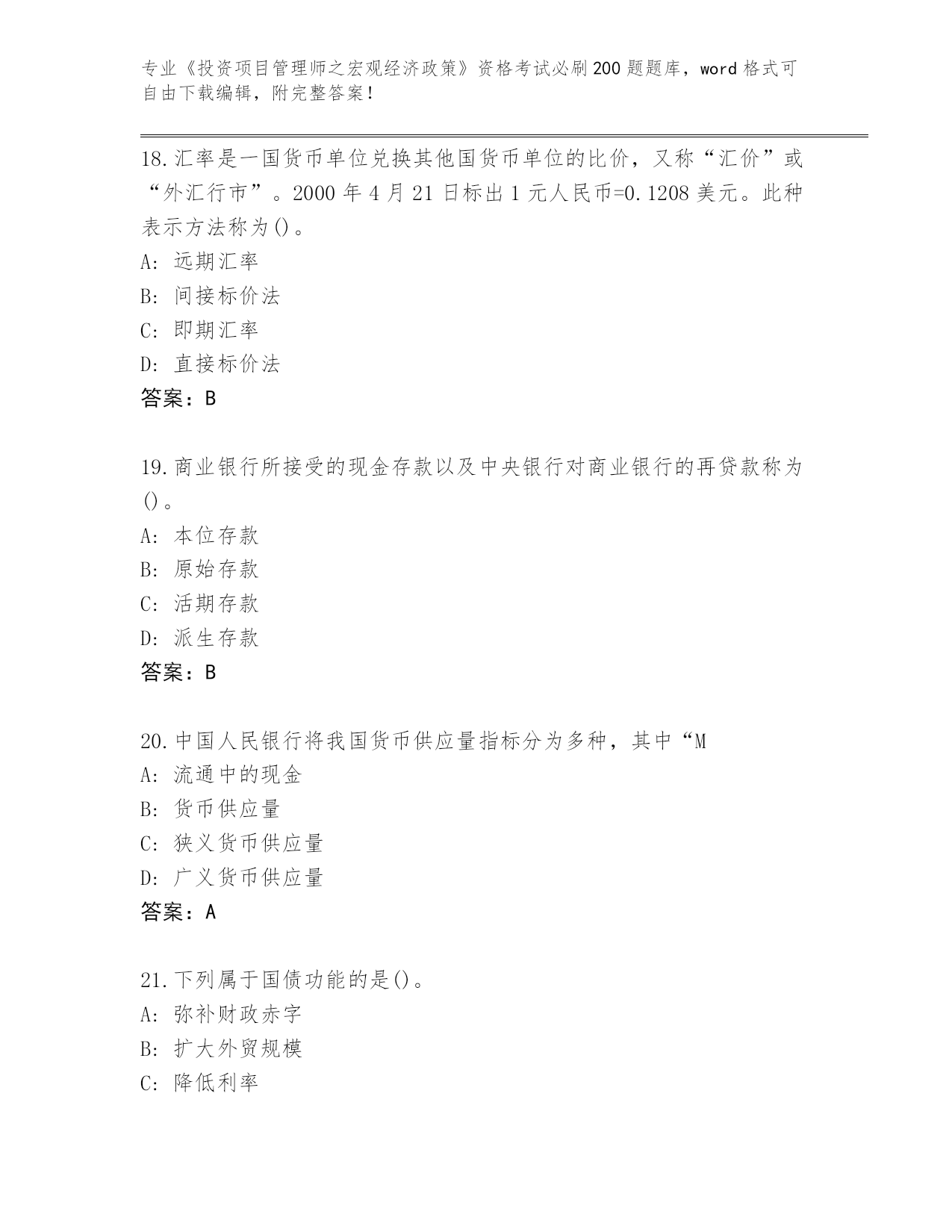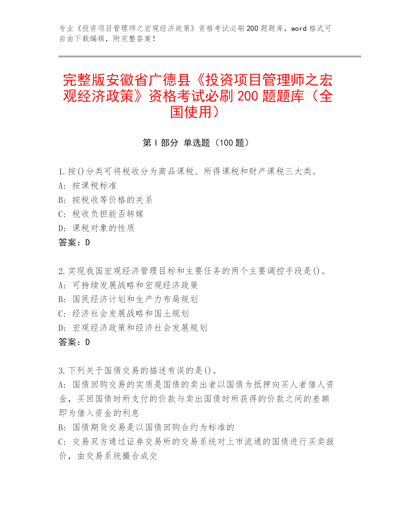 完整版安徽省广德县《投资项目管理师之宏观经济政策》资格考试必刷200题题库(全国使用)