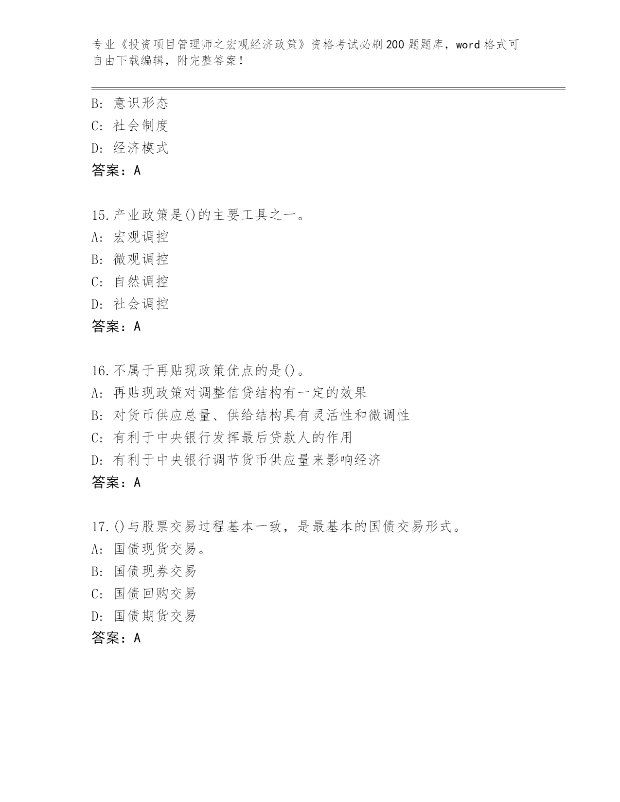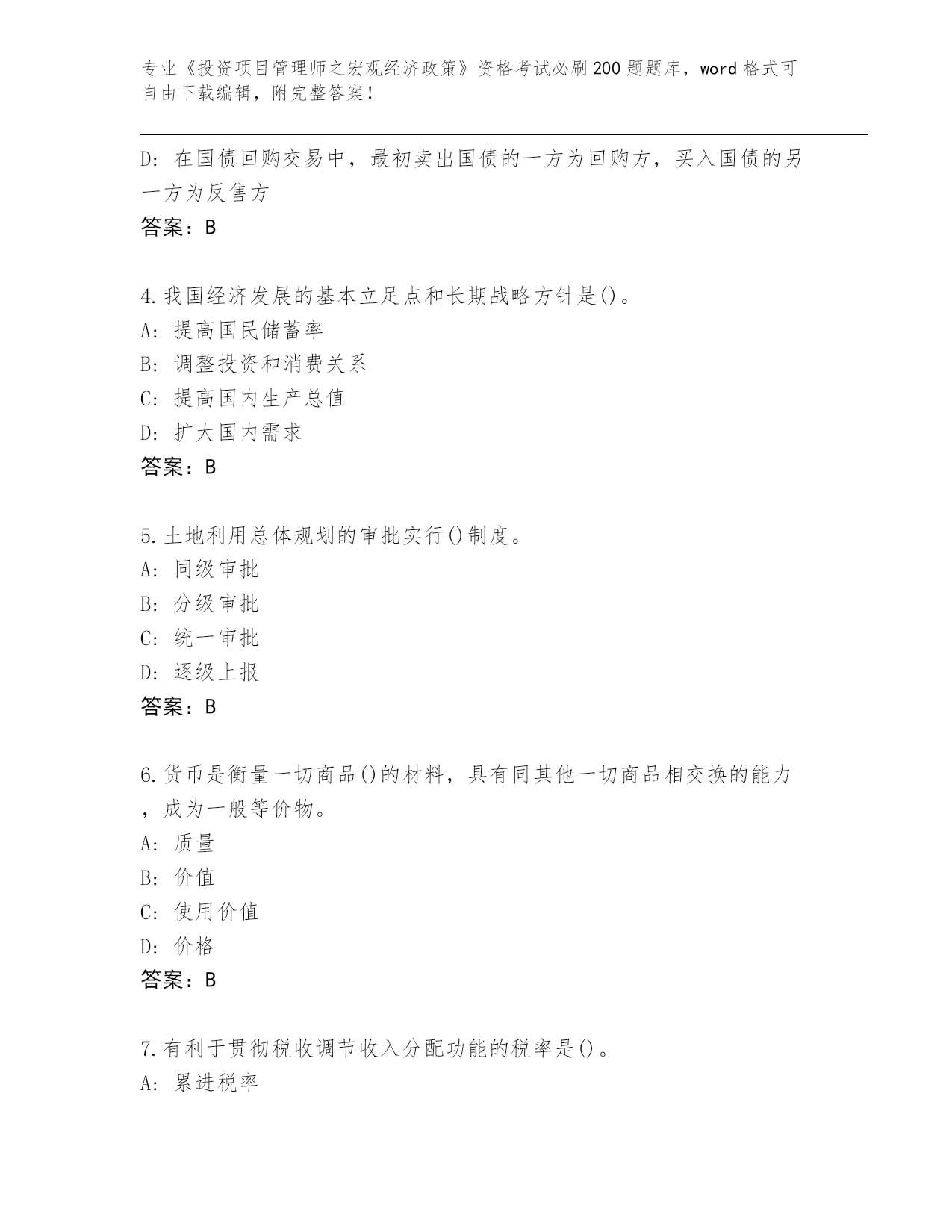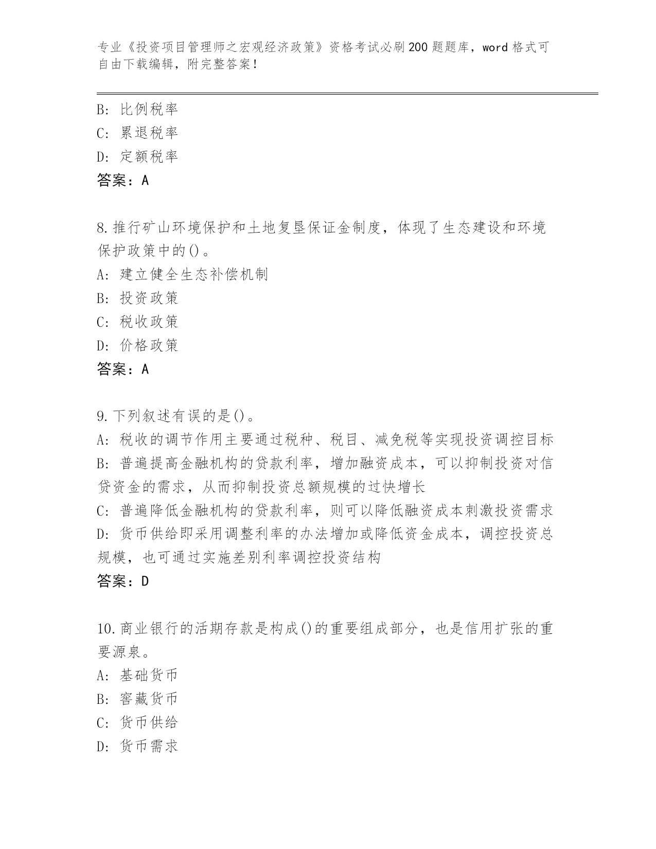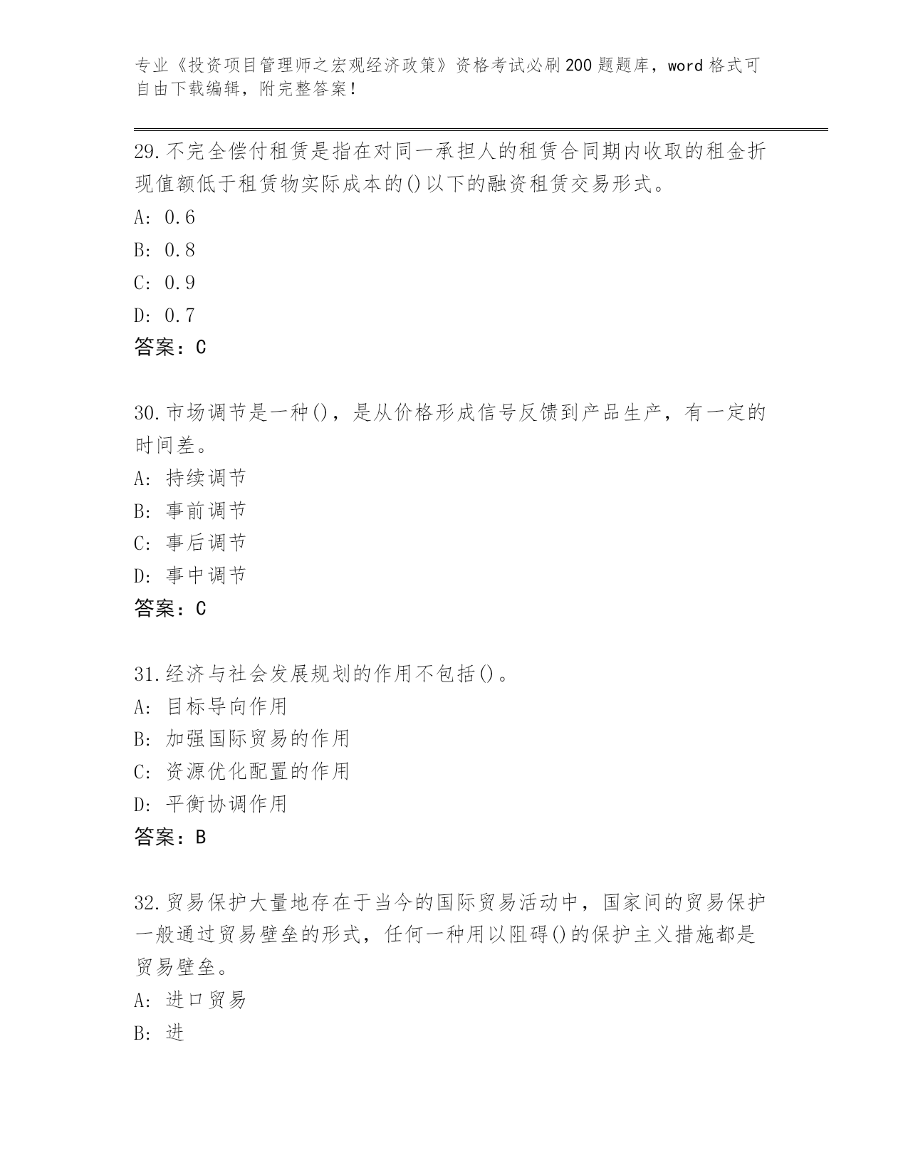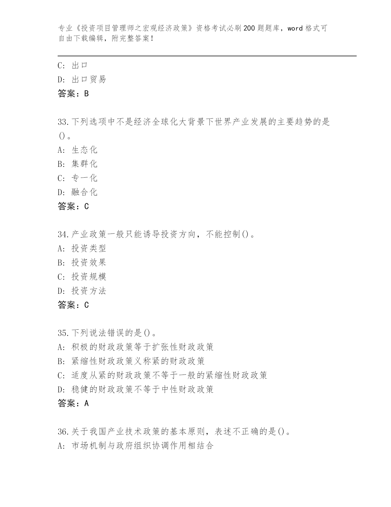 完整版安徽省义安区《投资项目管理师之宏观经济政策》考试必刷200题真题及答案【全国使用】