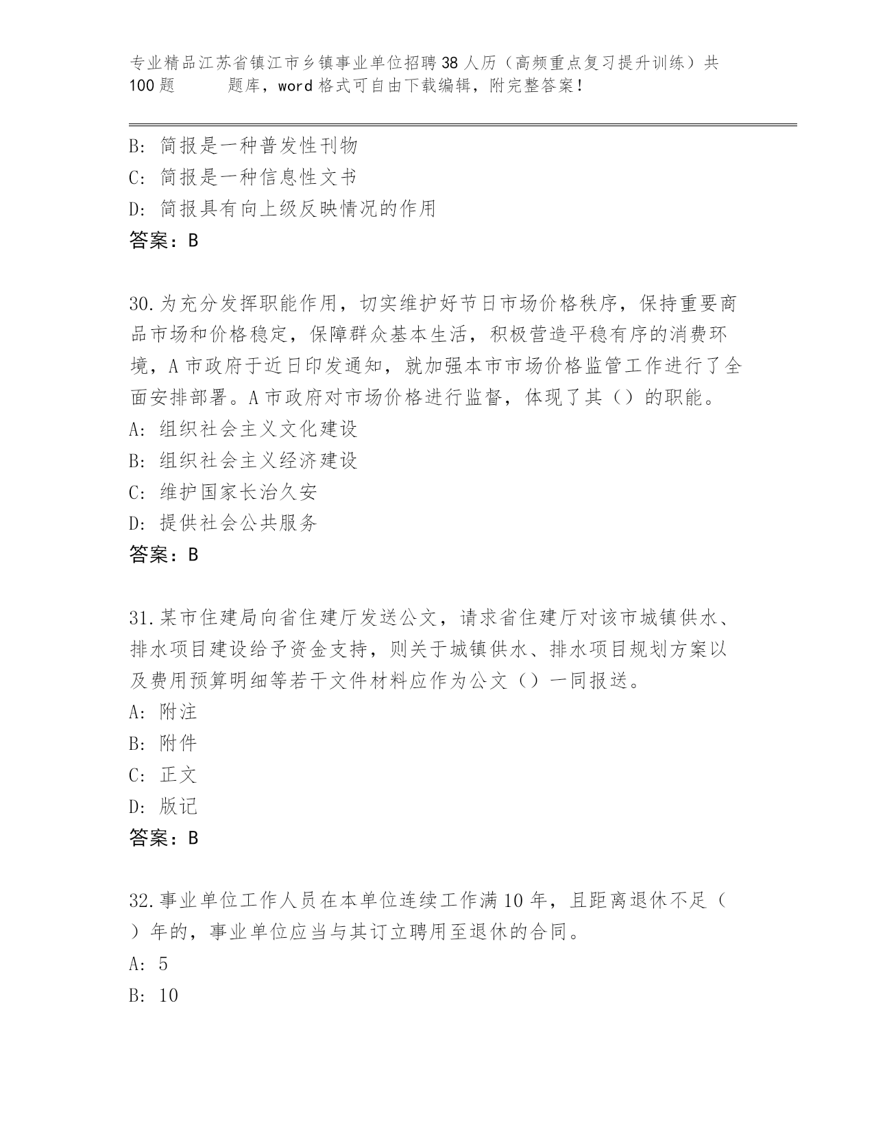 精品江苏省镇江市乡镇事业单位招聘38人历(高频重点复习提升训练)共100题 真题精品加答案