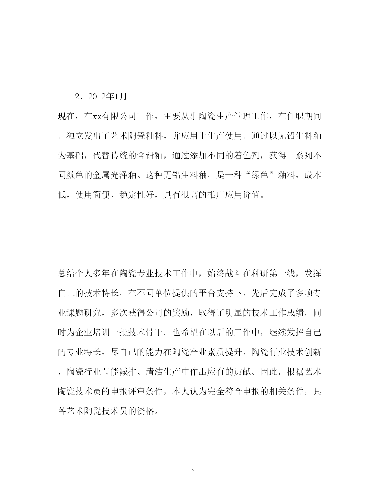此资料由网络收集而来,如有侵权请告知上传者立即删除。资料共分享,我们负责传递知识。PAGEPAGE3陶瓷工艺专业技术自我总结陶瓷工艺专业技术自我总结xxx,年月毕业于工业学校,毕业后一直从事陶瓷工艺技术及生产管理工作,期间不断更新专业知识结构,努力钻研业务,专业技术水平不断提高,具有专业技术工作能力和指导能力强,能够独立完成多项重大的技术研究,现把个人5年来的专业技术工作情况总结如下:1、2008年8月-2013年12月,在xx陶瓷有限公司工作,主要从事陶瓷釉料的研发应用及生产管理工作。进行高温釉料的研发试验,研究原材料的`工艺性能特性,通过反复试验,进行原料的优化组合,同时对企业技术人员进行专业技术培训,提高技术人员的专业技术水平,为企业创造效益,降低生产成本。2、2012年1月-现在,在xx有限公司工作,主要从事陶瓷生产管理工作,在任职期间。独立发出了艺术陶瓷釉料,并应用于生产使用。通过以无铅生料釉为基础,代替传统的含铅釉,通过添加不同的着色剂,获得一系列不同颜色的金属光泽釉。这种无铅生料釉,是一种“绿色”釉料,成本低,使用简便,稳定性好,具有很高的推广应用价值。总结个人多年在陶瓷专业技术工作中,始终战斗在科研第一线,发挥自己的技术特长,在不同单位提供的平台支持下,先后完成了多项专业课题研究,多次获得公司的奖励,取得了明显的技术工作成绩,同时为企业培训一批技术骨干。也希望在以后的工作中,继续发挥自己的专业特长,尽自己的能力在陶瓷产业素质提升,陶瓷行业技术创新,陶瓷行业节能减排、清洁生产中作出应有的贡献。因此,根据艺术陶瓷技术员的申报评审条件,本人认为完全符合申报的相关条件,具备艺术陶瓷技术员的资格。