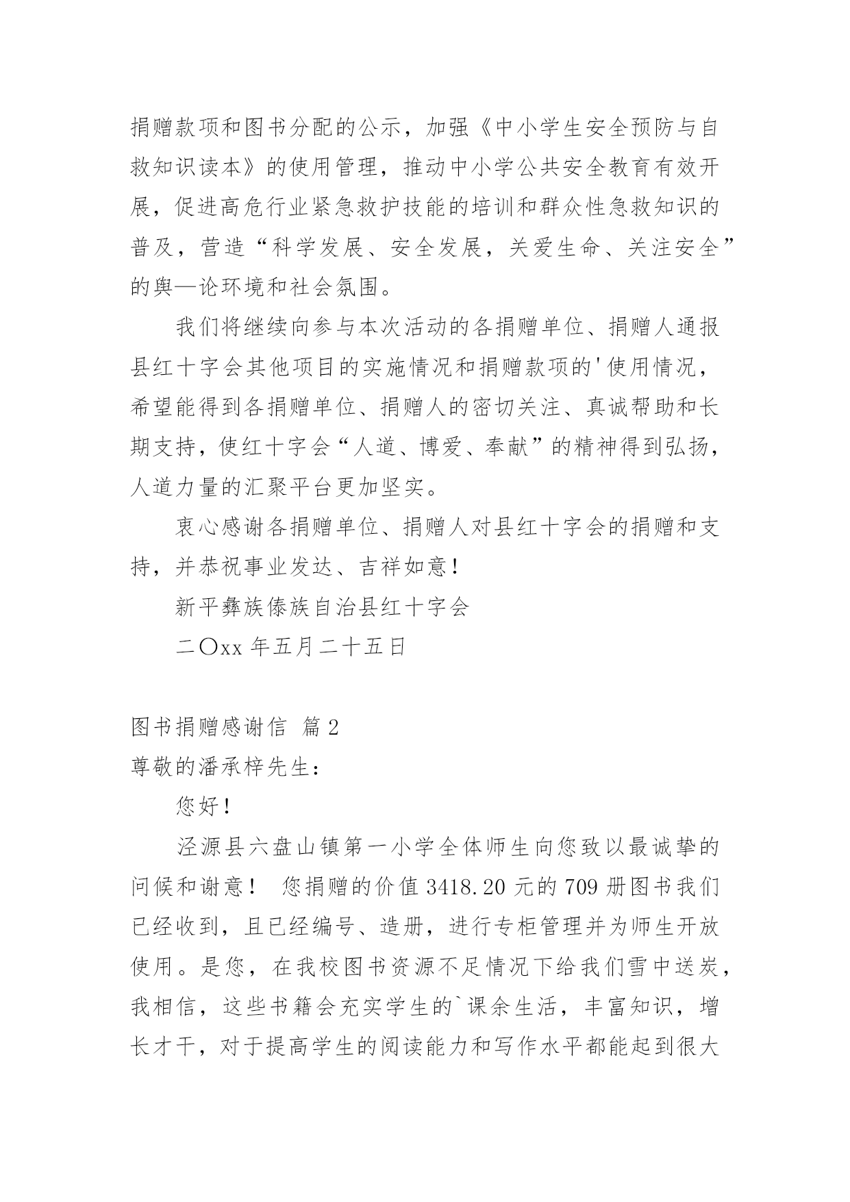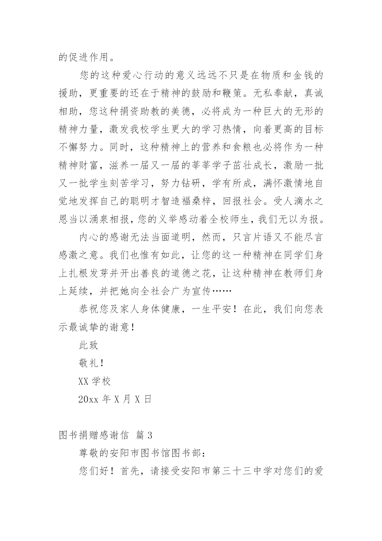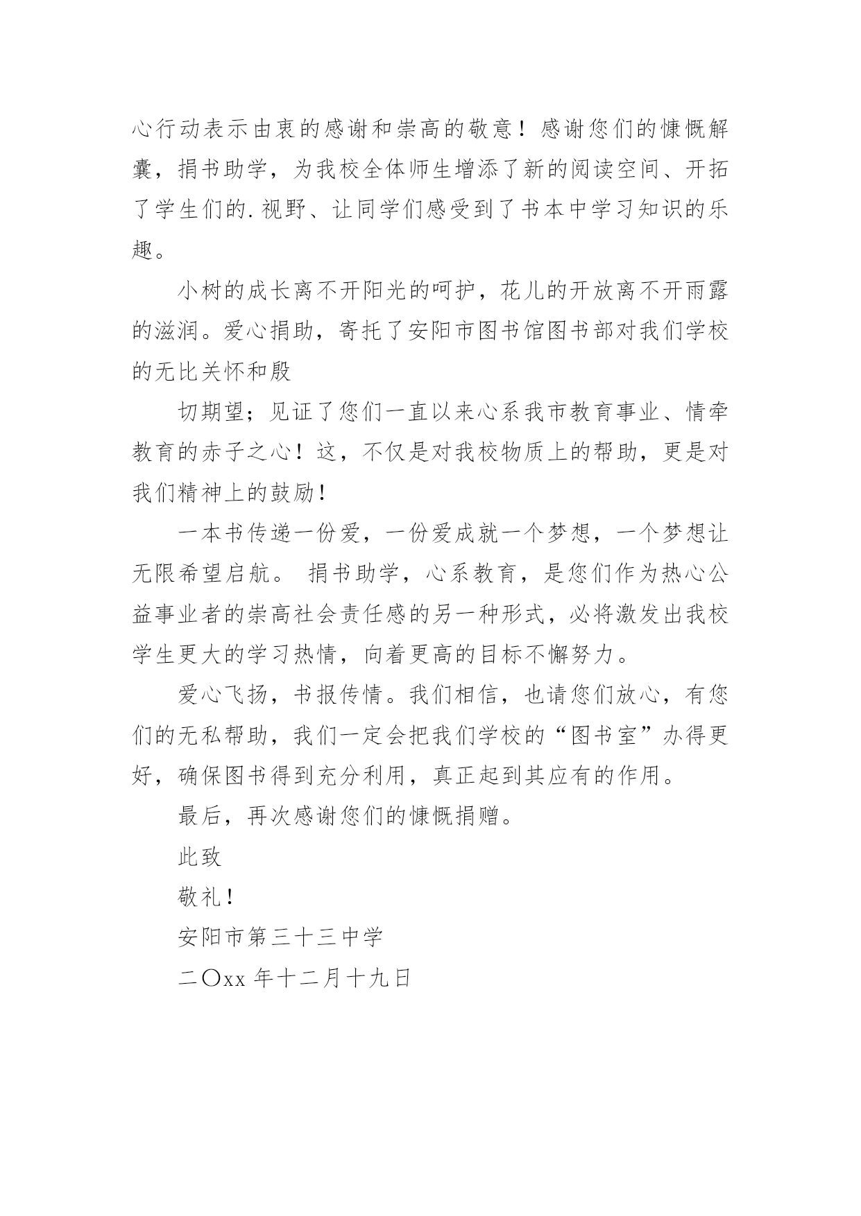 图书捐赠感谢信实用的图书捐赠感谢信3篇在我们平凡的日常里,越来越多人都去使用感谢信,在写作上,感谢信具有一定的要求。千万不要把感谢信写成流水账喔!下面是小编精心整理的图书捐赠感谢信3篇,希望对大家有所帮助。图书捐赠感谢信篇1值此“六·一”国际儿童节和全国“安全生产月”到来之际,新平彝族傣族自治县红十字会向各捐赠单位、捐赠人表示崇高的敬意和衷心的感谢!xx年2月至5月,县红十字会在全县组织开展了“安全知识进校园我为孩子捐本书”募捐活动,编印面向中小学生的安全教育读物,增强学生的安全意识,增加学生安全常识,培养学生自我保护能力。这一活动得到各捐赠单位、捐赠人的大力支持和慷慨捐助,三个月时间动员到07家单位或职工和个人的捐款,捐款总额487526元。这是县红十字会刚独立建制后的第一次定向募捐,虽然工作运行还有很多方面欠缺,但在县委政府和各相关部门的指导下,通过众多志愿者的努力,得到了社会各界的帮助,活动顺利结束并取得较好的社会效益。下一步,我们将联合县教育局、县安监局,进一步做好捐赠款项和图书分配的公示,加强《中小学生安全预防与自救知识读本》的使用管理,推动中小学公共安全教育有效开展,促进高危行业紧急救护技能的培训和群众性急救知识的普及,营造“科学发展、安全发展,关爱生命、关注安全”的舆—论环境和社会氛围。我们将继续向参与本次活动的各捐赠单位、捐赠人通报县红十字会其他项目的实施情况和捐赠款项的'使用情况,希望能得到各捐赠单位、捐赠人的密切关注、真诚帮助和长期支持,使红十字会“人道、博爱、奉献”的精神得到弘扬,人道力量的汇聚平台更加坚实。衷心感谢各捐赠单位、捐赠人对县红十字会的捐赠和支持,并恭祝事业发达、吉祥如意!新平彝族傣族自治县红十字会二〇xx年五月二十五日图书捐赠感谢信篇2尊敬的潘承梓先生:您好!泾源县六盘山镇第一小学全体师生向您致以最诚挚的问候和谢意!您捐赠的价值3418.20元的709册图书我们已经收到,且已经编号、造册,进行专柜管理并为师生开放使用。是您,在我校图书资源不足情况下给我们雪中送炭,我相信,这些书籍会充实学生的`课余生活,丰富知识,增长才干,对于提高学生的阅读能力和写作水平都能起到很大的促进作用。您的这种爱心行动的意义远远不只是在物质和金钱的援助,更重要的还在于精神的鼓励和鞭策。无私奉献,真诚相助,您这种捐资助教的美德,必将成为一种巨大的无形的精神力量,激发我校学生更大的学习热情,向着更高的目标不懈努力。同时,这种精神上的营养和食粮也必将作为一种精神财富,滋养一届又一届的莘莘学子茁壮成长,激励一批又一批学生刻苦学习,努力钻研,学有所成,满怀激情地自觉地发挥自己的聪明才智造福桑梓,回报社会。受人滴水之恩当以涌泉相报,您的义举感动着全校师生,我们无以为报。内心的感谢无法当面道明,然而,只言片语又不能尽言感激之意。我们也惟有如此,让您的这一种精神在同学们身上扎根发芽并开出善良的道德之花,让这种精神在教师们身上延续,并把她向全社会广为宣传……恭祝您及家人身体健康,一生平安!在此,我们向您表示最诚挚的谢意!此致敬礼!XX学校20xx年X月X日图书捐赠感谢信篇3尊敬的安阳市图书馆图书部:您们好!首先,请接受安阳市第三十三中学对您们的爱心行动表示由衷的感谢和崇高的敬意!感谢您们的慷慨解囊,捐书助学,为我校全体师生增添了新的阅读空间、开拓了学生们的.视野、让同学们感受到了书本中学习知识的乐趣。小树的成长离不开阳光的呵护,花儿的开放离不开雨露的滋润。爱心捐助,寄托了安阳市图书馆图书部对我们学校的无比关怀和殷切期望;见证了您们一直以来心系我市教育事业、情牵教育的赤子之心!这,不仅是对我校物质上的帮助,更是对我们精神上的鼓励!一本书传递一份爱,一份爱成就一个梦想,一个梦想让无限希望启航。捐书助学,心系教育,是您们作为热心公益事业者的崇高社会责任感的另一种形式,必将激发出我校学生更大的学习热情,向着更高的目标不懈努力。爱心飞扬,书报传情。我们相信,也请您们放心,有您们的无私帮助,我们一定会把我们学校的“图书室”办得更好,确保图书得到充分利用,真正起到其应有的作用。最后,再次感谢您们的慷慨捐赠。此致敬礼!安阳市第三十三中学二〇xx年十二月十九日