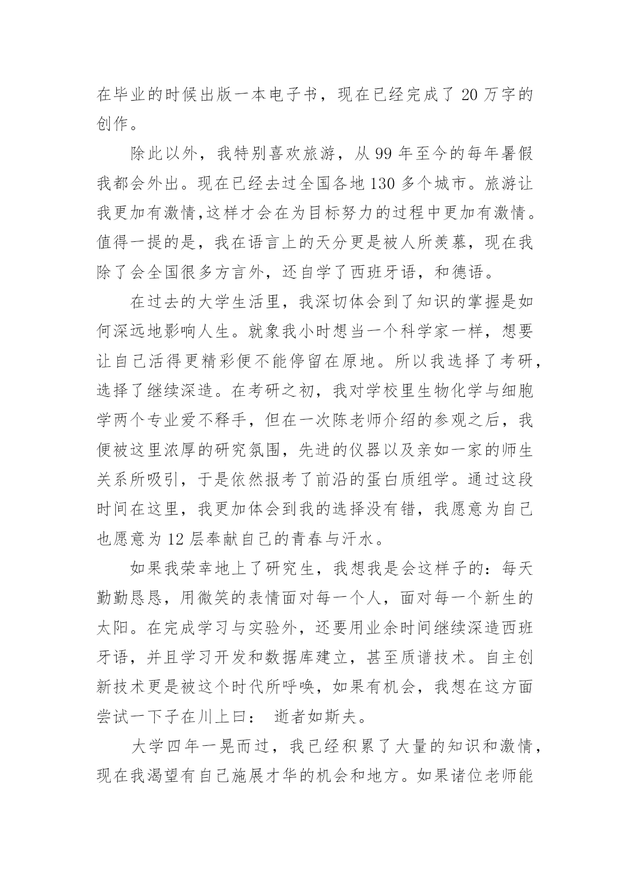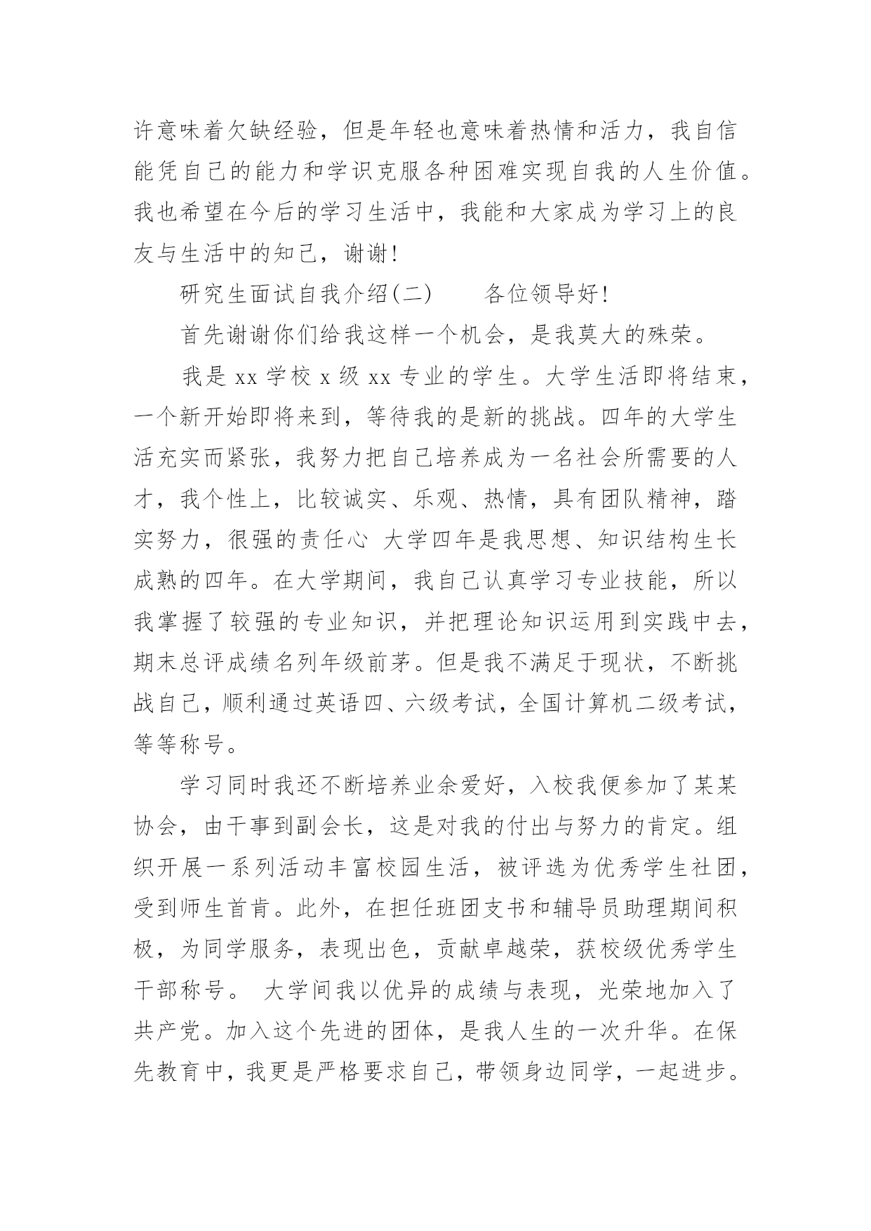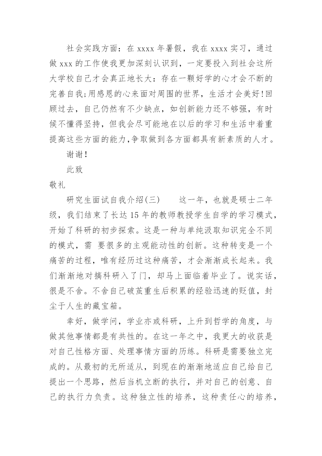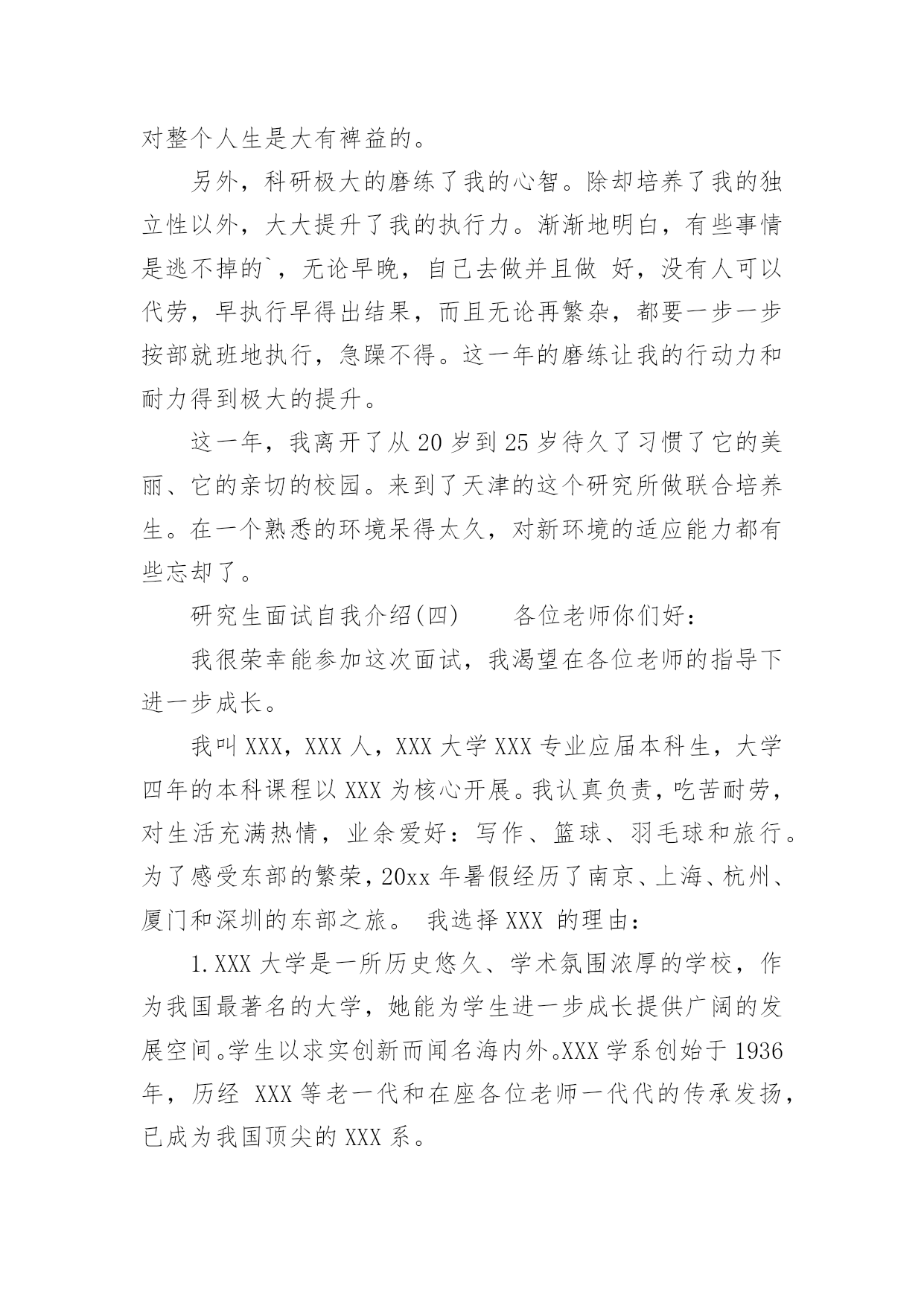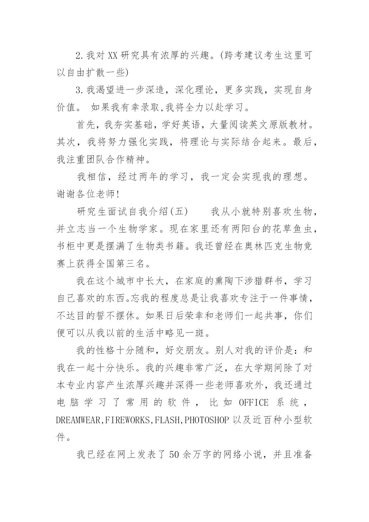 研究生面试自我介绍研究生面试自我介绍范文五篇时光如流水,转眼间,考研成绩又出来了。下面是小编为大家搜集整理的研究生面试自我介绍,欢迎阅读。研究生面试自我介绍(一)各位老师:大家好,很荣幸能来参加这次研究生面试,请先允许我自我介绍一下:我叫xxxx,今年xx岁。本科就读于xxxxx大学xx专业。我从踏入大学门槛的那天起,经过良师的精心指导以及自己的奋力拼搏、自强不息,我逐渐成为了一个能适应社会要求的新时代大学生,并为做一个知识型的社会主义建设者打下坚实的基础。在大学期间,我始终以提高自身的综合素质为目的,以个人的全面发展为奋斗方向,树立正确的人生观、价值观和世界观。为适应社会发展的需求,我认真学习专业知识,发挥自己的特长;挖掘自身的潜力,结合暑期社会实践,从而提高了自己的学习能力和分析处理问题能力。“学而知不足”是我学习、工作的动力,除了必修课外,还自学Office、Flash、FrontPage2000、Photoshop、DreamweaverMX等软件。学习之余,我坚持参加各种体育活动与社交活动。在思想行为方面,我作风优良、待人诚恳,能较好处理人际关际,处事冷静稳健,能合理地统筹安排生活中的事务。作为一名研究新生,我所拥有的是年青和知识。年轻也许意味着欠缺经验,但是年轻也意味着热情和活力,我自信能凭自己的能力和学识克服各种困难实现自我的人生价值。我也希望在今后的学习生活中,我能和大家成为学习上的良友与生活中的知己,谢谢!研究生面试自我介绍(二)各位领导好!首先谢谢你们给我这样一个机会,是我莫大的殊荣。我是xx学校x级xx专业的学生。大学生活即将结束,一个新开始即将来到,等待我的是新的挑战。四年的大学生活充实而紧张,我努力把自己培养成为一名社会所需要的人才,我个性上,比较诚实、乐观、热情,具有团队精神,踏实努力,很强的责任心大学四年是我思想、知识结构生长成熟的四年。在大学期间,我自己认真学习专业技能,所以我掌握了较强的专业知识,并把理论知识运用到实践中去,期末总评成绩名列年级前茅。但是我不满足于现状,不断挑战自己,顺利通过英语四、六级考试,全国计算机二级考试,等等称号。学习同时我还不断培养业余爱好,入校我便参加了某某协会,由干事到副会长,这是对我的付出与努力的肯定。组织开展一系列活动丰富校园生活,被评选为优秀学生社团,受到师生首肯。此外,在担任班团支书和辅导员助理期间积极,为同学服务,表现出色,贡献卓越荣,获校级优秀学生干部称号。大学间我以优异的成绩与表现,光荣地加入了共产党。加入这个先进的团体,是我人生的一次升华。在保先教育中,我更是严格要求自己,带领身边同学,一起进步。社会实践方面:在xxxx年暑假,我在xxxx实习,通过做xxx的工作使我更加深刻认识到,一定要投入到社会这所大学校自己才会真正地长大:存在一颗好学的心才会不断的完善自我;用感恩的心来面对周围的世界,生活才会美好!回顾过去,自己仍然有不少缺点,如创新能力还不够强,有时候不懂得坚持,但我会尽可能地在以后的学习和生活中着重提高这些方面的能力,争取做到各方面都具有新素质的人才。谢谢!此致敬礼研究生面试自我介绍(三)这一年,也就是硕士二年级,我们结束了长达15年的教师教授学生自学的学习模式,开始了科研的初步探索。这是一种与单纯汲取知识完全不同的模式,需要很多的主观能动性的创新。这种转变是一个痛苦的过程,唯有经历过这种痛苦,才会渐渐成长起来。我们渐渐地对搞科研入了门,却马上面临着毕业了。说实话,很是不舍。不舍自己破茧重生后积累的经验迅速的贬值,封尘于人生的藏宝箱。幸好,做学问,学业亦或科研,上升到哲学的角度,与做其他事情都是有共性的。在这一年之中,我更大的收获是对自己性格方面、处理事情方面的历练。科研是需要独立完成的。从最初的无所适从,到现在的渐渐地适应自己给自己提出一个思路,然后当机立断的执行,并对自己的创意、自己的执行力负责。这种独立性的培养,这种责任心的培养,对整个人生是大有裨益的。另外,科研极大的磨练了我的心智。除却培养了我的独立性以外,大大提升了我的执行力。渐渐地明白,有些事情是逃不掉的`,无论早晚,自己去做并且做好,没有人可以代劳,早执行早得出结果,而且无论再繁杂,都要一步一步按部就班地执行,急躁不得。这一年的磨练让我的行动力和耐力得到极大的提升。这一年,我离开了从20岁到25岁待久了习惯了它的美丽、它的亲切的校园。来到了天津的这个研究所做联合培养生。在一个熟悉的环境呆得太久,对新环境的适应能力都有些忘却了。研究生面试自我介绍(四)各位老师你们好:我很荣幸能参加这次面试,我渴望在各位老师的指导下进一步成长。我叫XXX,XXX人,XXX大学XXX专业应届本科生,大学四年的本科课程以XXX为核心开展。我认真负责,吃苦耐劳,对生活充满热情,业余爱好:写作、篮