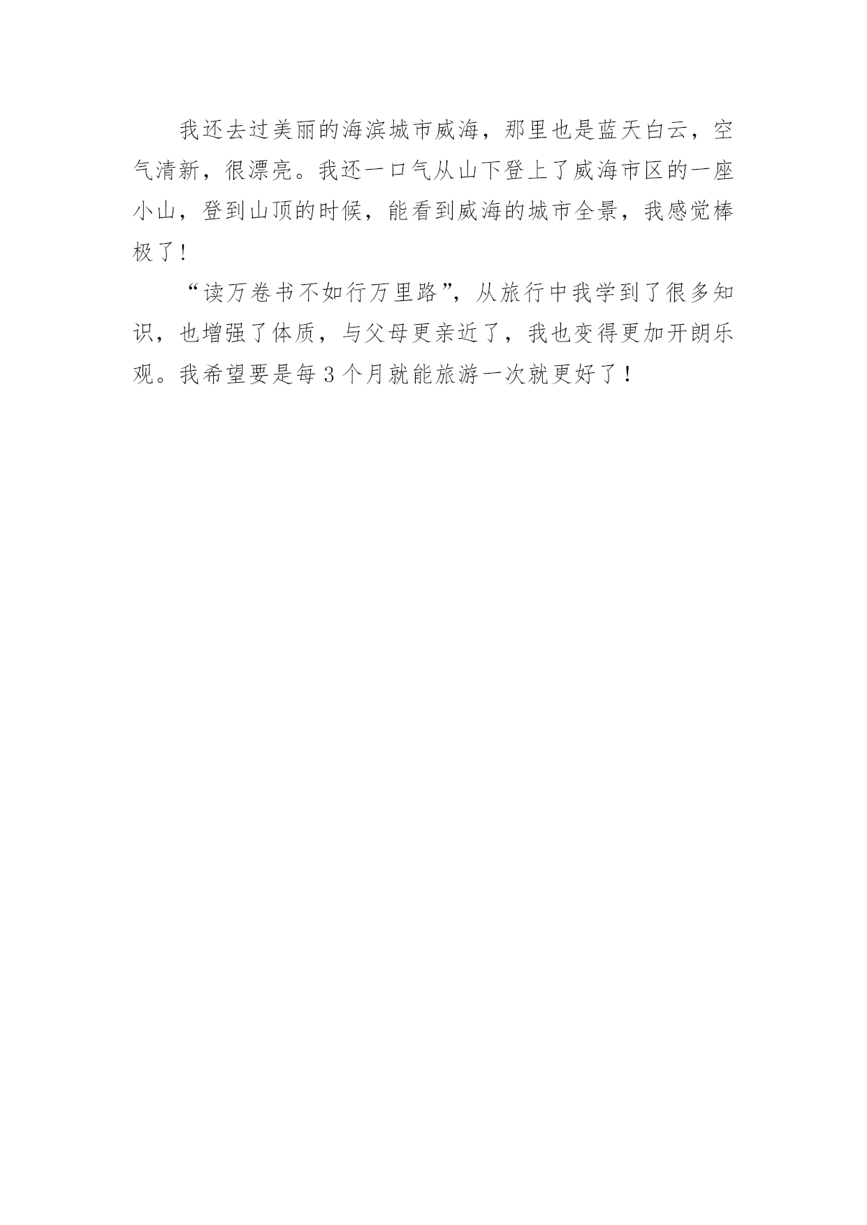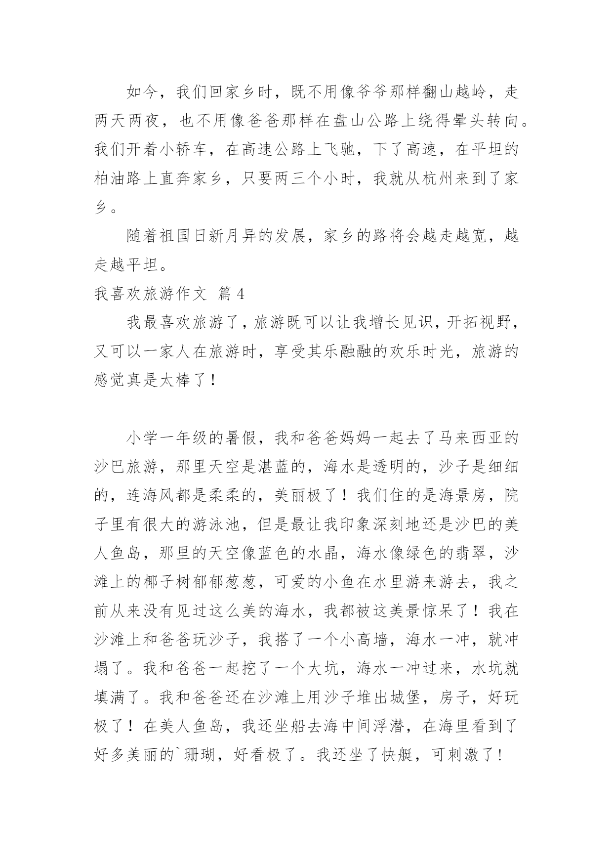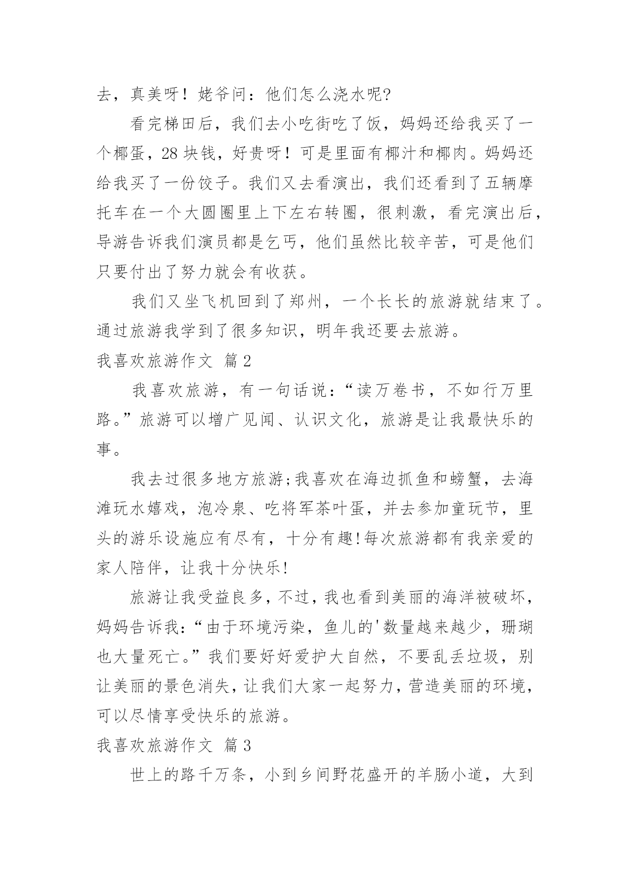 我喜欢旅游作文精选我喜欢旅游作文四篇在日常学习、工作和生活中,大家最不陌生的就是作文了吧,写作文是培养人们的观察力、联想力、想象力、思考力和记忆力的重要手段。你知道作文怎样才能写的好吗?下面是小编为大家整理的我喜欢旅游作文4篇,欢迎阅读,希望大家能够喜欢。我喜欢旅游作文篇1我喜欢旅游,因为旅游可以让我们学到各地方的文化。今年暑假,妈妈带我和姥姥、姥爷去广西的桂林和阳朔的兴坪漓江,广西是一个少数民族自治区。漓江的水很深,可是很清,可以看见江底的沙石。我还认识了一种鸟叫鸬鹚。我还知道广西人喜欢吃米粉,阳朔人喜欢吃啤酒鱼。我们爬了瀑布,瀑布有大人爬的.和儿童爬的,有深水区和浅水区。深水区有野生鱼,野生鱼游得飞快。我们还去了多耶古寨,在这里我还知道了长发族这个民族,我们看到了她们的头发有2米6的长度,比她们自己还长呢!多耶古寨里面人们说谢谢就说“多耶”。我们往前走,到了一个卖用银子做的东西的地方,有银碗、银梳子、银勺子、银筷子、银首饰等等,妈妈给我买了一个银碗。我们还去看了龙脊梯田,刚上观景台就下雨了,我们打着雨伞看风景,梯田真像梯子呀,一片金黄一片碧绿,一层一层的铺下去,真美呀!姥爷问:他们怎么浇水呢?看完梯田后,我们去小吃街吃了饭,妈妈还给我买了一个椰蛋,28块钱,好贵呀!可是里面有椰汁和椰肉。妈妈还给我买了一份饺子。我们又去看演出,我们还看到了五辆摩托车在一个大圆圈里上下左右转圈,很刺激,看完演出后,导游告诉我们演员都是乞丐,他们虽然比较辛苦,可是他们只要付出了努力就会有收获。我们又坐飞机回到了郑州,一个长长的旅游就结束了。通过旅游我学到了很多知识,明年我还要去旅游。我喜欢旅游作文篇2我喜欢旅游,有一句话说:“读万卷书,不如行万里路。”旅游可以增广见闻、认识文化,旅游是让我最快乐的事。我去过很多地方旅游;我喜欢在海边抓鱼和螃蟹,去海滩玩水嬉戏,泡冷泉、吃将军茶叶蛋,并去参加童玩节,里头的游乐设施应有尽有,十分有趣!每次旅游都有我亲爱的家人陪伴,让我十分快乐!旅游让我受益良多,不过,我也看到美丽的海洋被破坏,妈妈告诉我:“由于环境污染,鱼儿的'数量越来越少,珊瑚也大量死亡。”我们要好好爱护大自然,不要乱丢垃圾,别让美丽的景色消失,让我们大家一起努力,营造美丽的环境,可以尽情享受快乐的旅游。我喜欢旅游作文篇3世上的路千万条,小到乡间野花盛开的羊肠小道,大到城市四通八达的高速公路。鲁迅先生曾经说过,“其实地上本没有路,走的人多了,也便成了路。”我们脚下的路,随着时代的变迁,也在不断的变宽、变平。在我的家乡,路有着翻天覆地的变化。在一九六零年那会,年轻的爷爷要进城参军,天还蒙蒙亮时,爷爷就背着干粮和行李出发了,因为村里通向外面的只有一条山路,没有车子去县城,只能走,要翻过好几个山头,走两天两夜才能到县城。那会的村民,有的`一辈子都没有进过城。到了爸爸出生那会,村里人明白了,“要致富,先修路。”于是,村民们开始集资修路,历尽了千辛万苦,终于修了一条简易的盘山公路。但是,这路并不好走,它在雨天时泥泞不堪,踩在上面深一脚浅一脚的;晴天时,车子开过,带起一阵尘土,真可谓“晴天一身土,雨天一身泥。”而且山路一个弯接着一个弯,村民进一次城,都要被绕得晕头转向,甚至有的晕车历害的人,进了一次城,就像生了一场大病。爸爸就是走着这条路去县城上的学,虽然晕,但总算是有车子坐。到了我出生的时候,随着千岛湖旅游业的发展,政府花巨资给每个村修了一条又宽又平的柏油马路。从此,这条路带着家乡的人们,通向了幸福的生活。有了这条大路,村民们办起了渔场,开起了农家乐,大量的游客不断来到千岛湖,使千岛湖从一个小城镇,变成了一个旅游大城市,家乡的人们终于走出了大山。如今,我们回家乡时,既不用像爷爷那样翻山越岭,走两天两夜,也不用像爸爸那样在盘山公路上绕得晕头转向。我们开着小轿车,在高速公路上飞驰,下了高速,在平坦的柏油路上直奔家乡,只要两三个小时,我就从杭州来到了家乡。随着祖国日新月异的发展,家乡的路将会越走越宽,越走越平坦。我喜欢旅游作文篇4我最喜欢旅游了,旅游既可以让我增长见识,开拓视野,又可以一家人在旅游时,享受其乐融融的欢乐时光,旅游的感觉真是太棒了!小学一年级的暑假,我和爸爸妈妈一起去了马来西亚的沙巴旅游,那里天空是湛蓝的,海水是透明的,沙子是细细的,连海风都是柔柔的,美丽极了!我们住的是海景房,院子里有很大的游泳池,但是最让我印象深刻地还是沙巴的美人鱼岛,那里的天空像蓝色的水晶,海水像绿色的翡翠,沙滩上的椰子树郁郁葱葱,可爱的小鱼在水里游来游去,我之前从来没有见过这么美的海水,我都被这美景惊呆了!我在沙滩上和爸爸玩沙子,我搭了一个小高墙,海水一冲,就冲塌了。我和爸爸一起挖了一个大坑,海水一冲过来,水坑就填满了。我和爸爸还在沙滩上用沙子堆出城堡,房子,好玩极了!