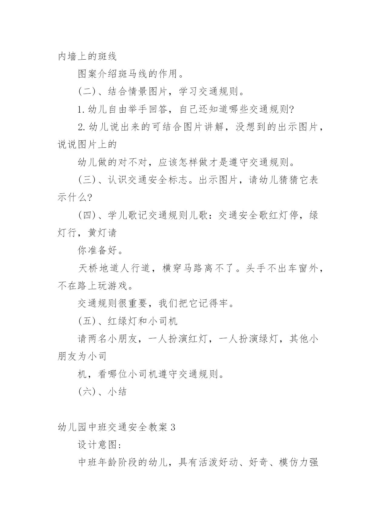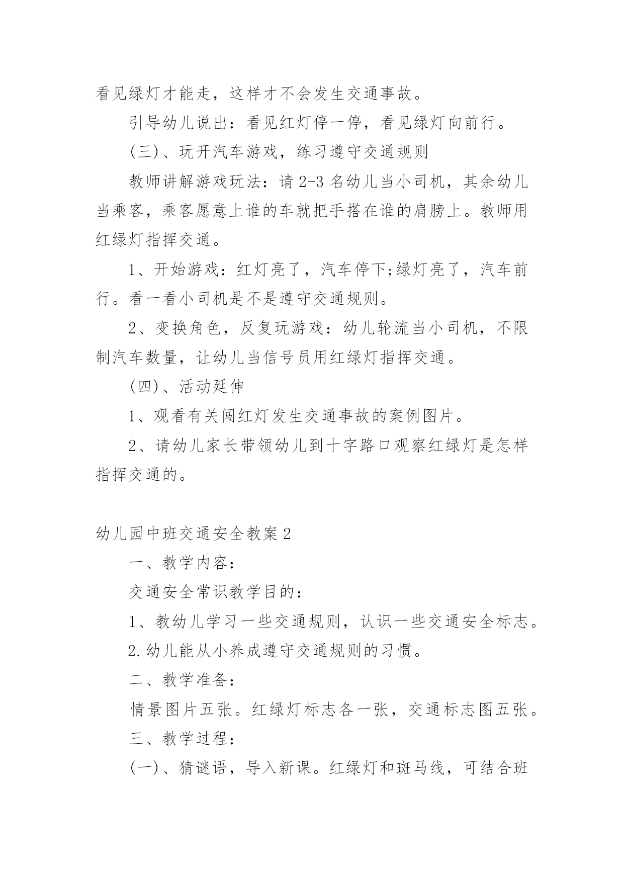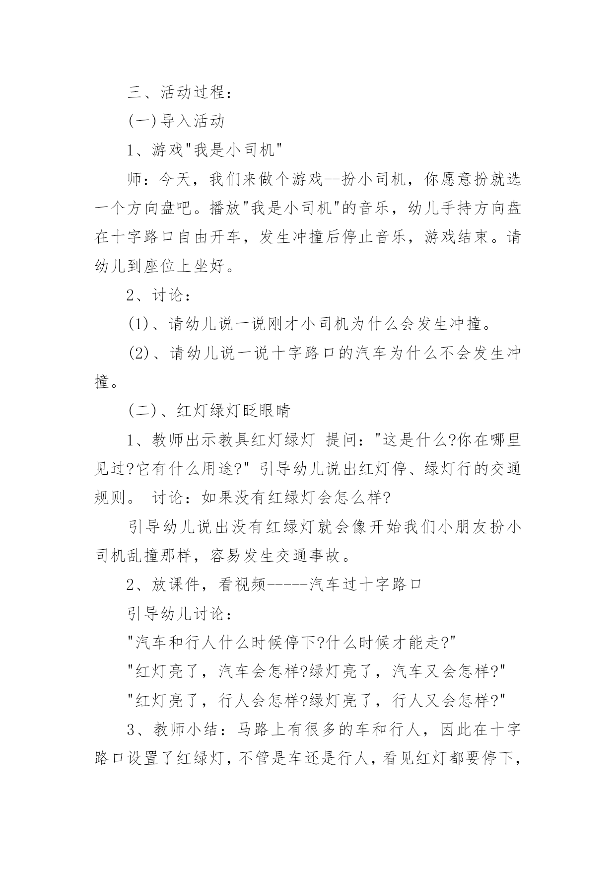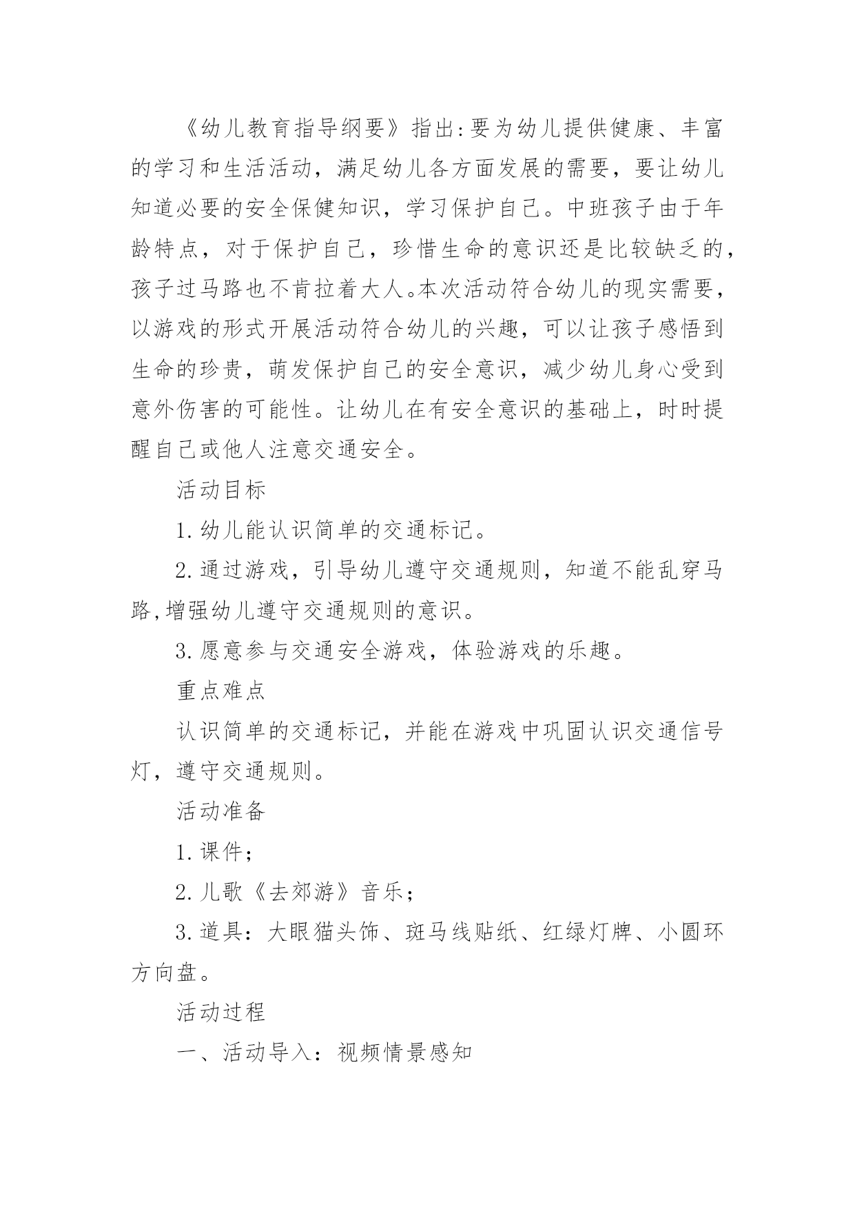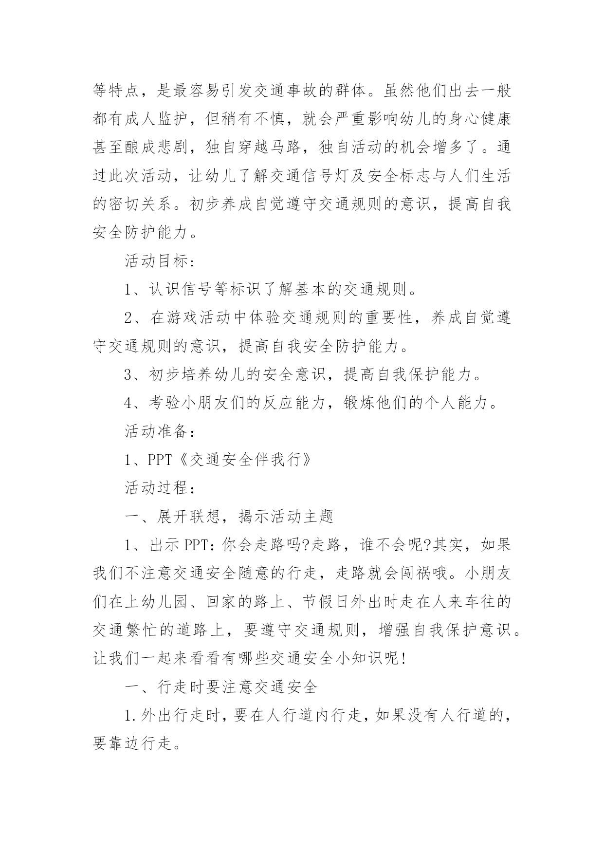 幼儿园中班交通安全教案幼儿园中班交通安全教案【推荐】作为一位优秀的人民教师,时常需要用到教案,教案是实施教学的主要依据,有着至关重要的作用。我们该怎么去写教案呢?以下是小编收集整理的幼儿园中班交通安全教案,欢迎大家借鉴与参考,希望对大家有所帮助。幼儿园中班交通安全教案1一、活动目标1、知道在马路上要遵守"红灯停、绿灯行"的交通规则。2、理解"红灯停,绿灯行"的重要性,强化幼儿的安全意识和遵守规则的能力。3、体验模仿游戏的快乐。4、遵守社会行为规则,不做“禁止”的事。5、幼儿可以用完整的普通话进行交流。二、活动准备1、事先安排家长带孩子观察马路上的车、交通设施和标志等。2、布置马路场景:马路的十字路口、红绿灯信号牌。3、课件视频:汽车过十字路口。4、拟人化的红灯、绿灯(在两个长方形纸板上分别贴上圆形的红、绿色蜡光纸,画上眼睛)。5、音乐"我是小司机"、方向盘若干。三、活动过程:(一)导入活动1、游戏"我是小司机"师:今天,我们来做个游戏--扮小司机,你愿意扮就选一个方向盘吧。播放"我是小司机"的音乐,幼儿手持方向盘在十字路口自由开车,发生冲撞后停止音乐,游戏结束。请幼儿到座位上坐好。2、讨论:(1)、请幼儿说一说刚才小司机为什么会发生冲撞。(2)、请幼儿说一说十字路口的汽车为什么不会发生冲撞。(二)、红灯绿灯眨眼睛1、教师出示教具红灯绿灯提问:"这是什么?你在哪里见过?它有什么用途?"引导幼儿说出红灯停、绿灯行的交通规则。讨论:如果没有红绿灯会怎么样?引导幼儿说出没有红绿灯就会像开始我们小朋友扮小司机乱撞那样,容易发生交通事故。2、放课件,看视频-----汽车过十字路口引导幼儿讨论:"汽车和行人什么时候停下?什么时候才能走?""红灯亮了,汽车会怎样?绿灯亮了,汽车又会怎样?""红灯亮了,行人会怎样?绿灯亮了,行人又会怎样?"3、教师小结:马路上有很多的车和行人,因此在十字路口设置了红绿灯,不管是车还是行人,看见红灯都要停下,看见绿灯才能走,这样才不会发生交通事故。引导幼儿说出:看见红灯停一停,看见绿灯向前行。(三)、玩开汽车游戏,练习遵守交通规则教师讲解游戏玩法:请2-3名幼儿当小司机,其余幼儿当乘客,乘客愿意上谁的车就把手搭在谁的肩膀上。教师用红绿灯指挥交通。1、开始游戏:红灯亮了,汽车停下;绿灯亮了,汽车前行。看一看小司机是不是遵守交通规则。2、变换角色,反复玩游戏:幼儿轮流当小司机,不限制汽车数量,让幼儿当信号员用红绿灯指挥交通。(四)、活动延伸1、观看有关闯红灯发生交通事故的案例图片。2、请幼儿家长带领幼儿到十字路口观察红绿灯是怎样指挥交通的。幼儿园中班交通安全教案2一、教学内容:交通安全常识教学目的:1、教幼儿学习一些交通规则,认识一些交通安全标志。2.幼儿能从小养成遵守交通规则的习惯。二、教学准备:情景图片五张。红绿灯标志各一张,交通标志图五张。三、教学过程:(一)、猜谜语,导入新课。红绿灯和斑马线,可结合班内墙上的斑线图案介绍斑马线的作用。(二)、结合情景图片,学习交通规则。1.幼儿自由举手回答,自己还知道哪些交通规则?2.幼儿说出来的可结合图片讲解,没想到的出示图片,说说图片上的幼儿做的对不对,应该怎样做才是遵守交通规则。(三)、认识交通安全标志。出示图片,请幼儿猜猜它表示什么?(四)、学儿歌记交通规则儿歌:交通安全歌红灯停,绿灯行,黄灯请你准备好。天桥地道人行道,横穿马路离不了。头手不出车窗外,不在路上玩游戏。交通规则很重要,我们把它记得牢。(五)、红绿灯和小司机请两名小朋友,一人扮演红灯,一人扮演绿灯,其他小朋友为小司机,看哪位小司机遵守交通规则。(六)、小结幼儿园中班交通安全教案3设计意图:中班年龄阶段的幼儿,具有活泼好动、好奇、模仿力强等特点,是最容易引发交通事故的群体。虽然他们出去一般都有成人监护,但稍有不慎,就会严重影响幼儿的身心健康甚至酿成悲剧,独自穿越马路,独自活动的机会增多了。通过此次活动,让幼儿了解交通信号灯及安全标志与人们生活的密切关系。初步养成自觉遵守交通规则的意识,提高自我安全防护能力。活动目标:1、认识信号等标识了解基本的交通规则。2、在游戏活动中体验交通规则的重要性,养成自觉遵守交通规则的意识,提高自我安全防护能力。3、初步培养幼儿的安全意识,提高自我保护能力。4、考验小朋友们的反应能力,锻炼他们的个人能力。活动准备:1、PPT《交通安全伴我行》活动过程:一、展开联想,揭示活动主题1、出示PPT:你会走路吗?走路,谁不会呢?其实,如果我们不注意交通安全随意的行走,走路就会闯祸哦。小朋友们在上幼儿园、回家的路上、节假日外出时走在人来车往的交通繁忙的道路上,要遵守交通规则,增强自我保护意识。让我们一起来看看有哪些交通安全小知识呢!一、行走时要注意交通安全1.外出行走时,要在人行道内行