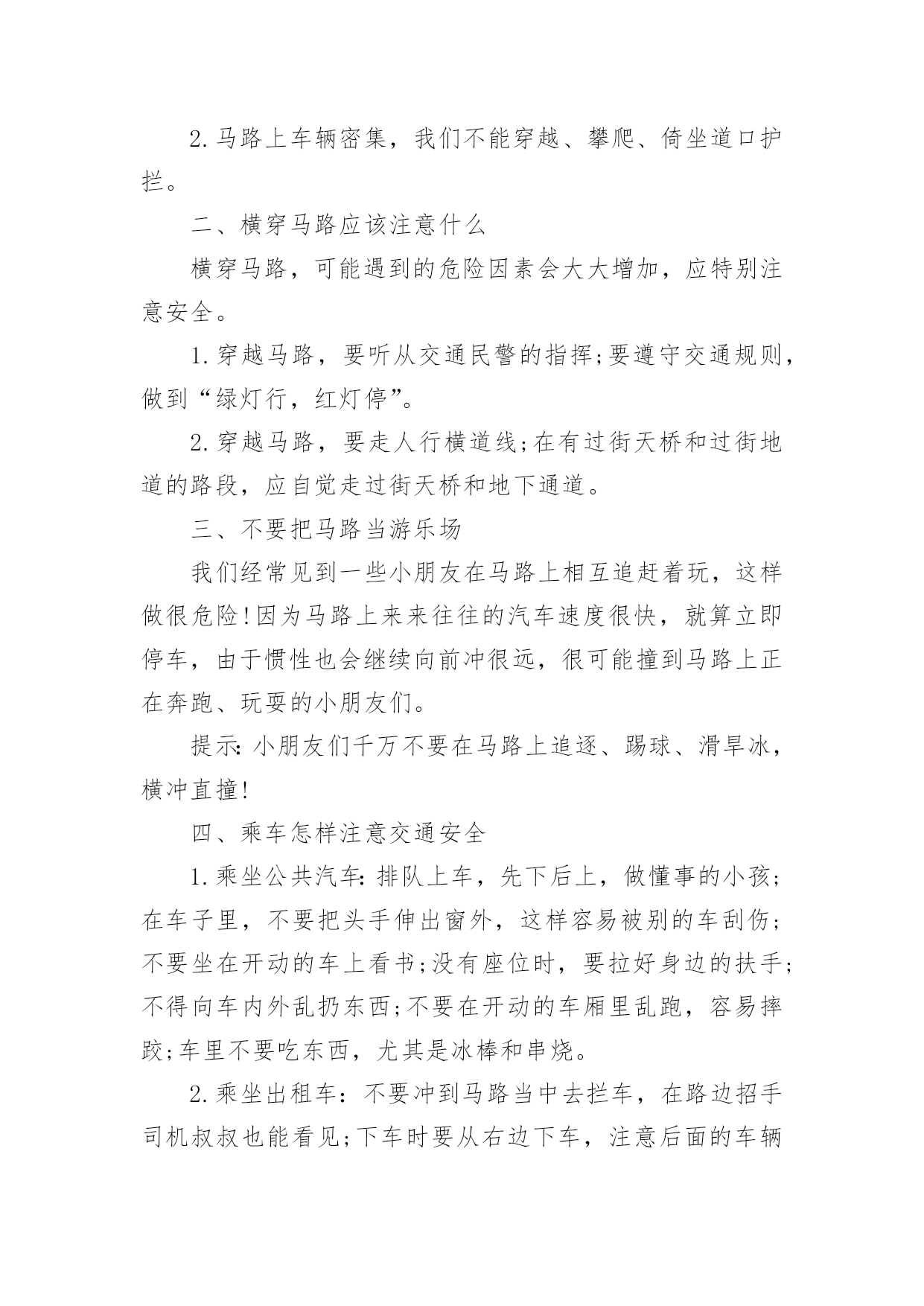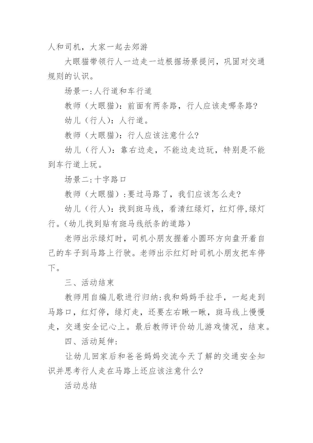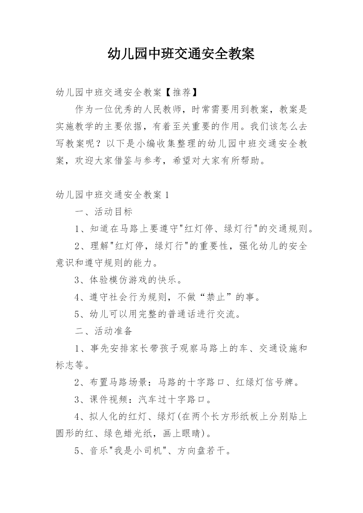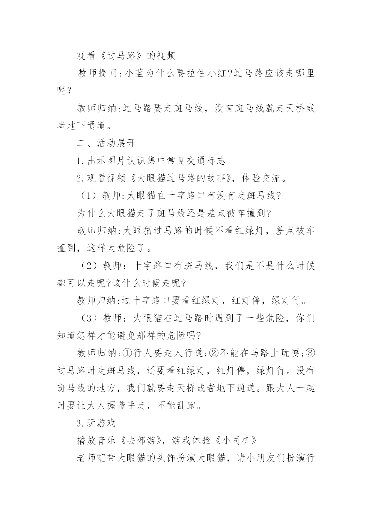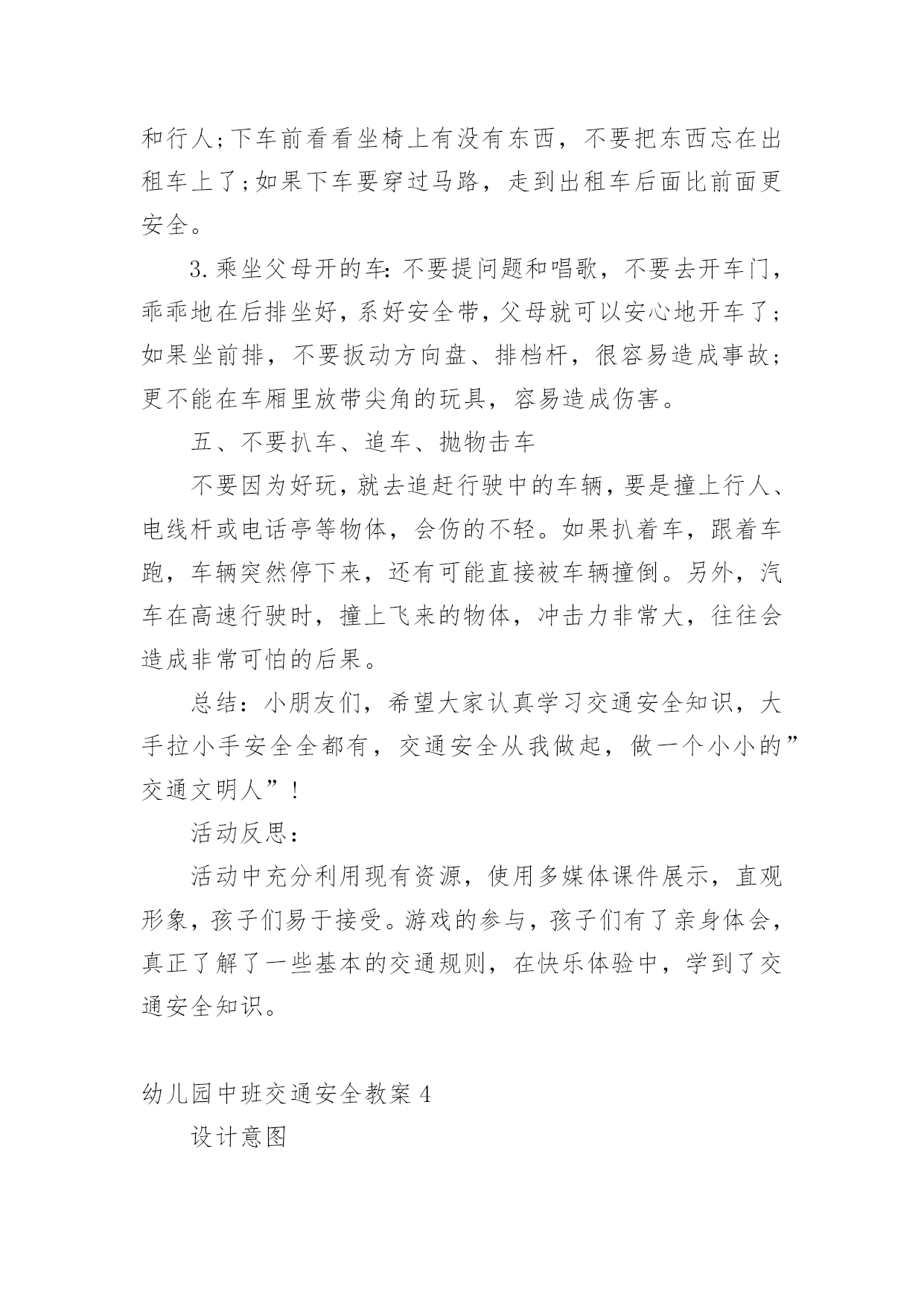 幼儿园中班交通安全教案幼儿园中班交通安全教案【推荐】作为一位优秀的人民教师,时常需要用到教案,教案是实施教学的主要依据,有着至关重要的作用。我们该怎么去写教案呢?以下是小编收集整理的幼儿园中班交通安全教案,欢迎大家借鉴与参考,希望对大家有所帮助。幼儿园中班交通安全教案1一、活动目标1、知道在马路上要遵守"红灯停、绿灯行"的交通规则。2、理解"红灯停,绿灯行"的重要性,强化幼儿的安全意识和遵守规则的能力。3、体验模仿游戏的快乐。4、遵守社会行为规则,不做“禁止”的事。5、幼儿可以用完整的普通话进行交流。二、活动准备1、事先安排家长带孩子观察马路上的车、交通设施和标志等。2、布置马路场景:马路的十字路口、红绿灯信号牌。3、课件视频:汽车过十字路口。4、拟人化的红灯、绿灯(在两个长方形纸板上分别贴上圆形的红、绿色蜡光纸,画上眼睛)。5、音乐"我是小司机"、方向盘若干。三、活动过程:(一)导入活动1、游戏"我是小司机"师:今天,我们来做个游戏--扮小司机,你愿意扮就选一个方向盘吧。播放"我是小司机"的音乐,幼儿手持方向盘在十字路口自由开车,发生冲撞后停止音乐,游戏结束。请幼儿到座位上坐好。2、讨论:(1)、请幼儿说一说刚才小司机为什么会发生冲撞。(2)、请幼儿说一说十字路口的汽车为什么不会发生冲撞。(二)、红灯绿灯眨眼睛1、教师出示教具红灯绿灯提问:"这是什么?你在哪里见过?它有什么用途?"引导幼儿说出红灯停、绿灯行的交通规则。讨论:如果没有红绿灯会怎么样?引导幼儿说出没有红绿灯就会像开始我们小朋友扮小司机乱撞那样,容易发生交通事故。2、放课件,看视频-----汽车过十字路口引导幼儿讨论:"汽车和行人什么时候停下?什么时候才能走?""红灯亮了,汽车会怎样?绿灯亮了,汽车又会怎样?""红灯亮了,行人会怎样?绿灯亮了,行人又会怎样?"3、教师小结:马路上有很多的车和行人,因此在十字路口设置了红绿灯,不管是车还是行人,看见红灯都要停下,看见绿灯才能走,这样才不会发生交通事故。引导幼儿说出:看见红灯停一停,看见绿灯向前行。(三)、玩开汽车游戏,练习遵守交通规则教师讲解游戏玩法:请2-3名幼儿当小司机,其余幼儿当乘客,乘客愿意上谁的车就把手搭在谁的肩膀上。教师用红绿灯指挥交通。1、开始游戏:红灯亮了,汽车停下;绿灯亮了,汽车前行。看一看小司机是不是遵守交通规则。2、变换角色,反复玩游戏:幼儿轮流当小司机,不限制汽车数量,让幼儿当信号员用红绿灯指挥交通。(四)、活动延伸1、观看有关闯红灯发生交通事故的案例图片。2、请幼儿家长带领幼儿到十字路口观察红绿灯是怎样指挥交通的。幼儿园中班交通安全教案2一、教学内容:交通安全常识教学目的:1、教幼儿学习一些交通规则,认识一些交通安全标志。2.幼儿能从小养成遵守交通规则的习惯。二、教学准备:情景图片五张。红绿灯标志各一张,交通标志图五张。三、教学过程:(一)、猜谜语,导入新课。红绿灯和斑马线,可结合班内墙上的斑线图案介绍斑马线的作用。(二)、结合情景图片,学习交通规则。1.幼儿自由举手回答,自己还知道哪些交通规则?2.幼儿说出来的可结合图片讲解,没想到的出示图片,说说图片上的幼儿做的对不对,应该怎样做才是遵守交通规则。(三)、认识交通安全标志。出示图片,请幼儿猜猜它表示什么?(四)、学儿歌记交通规则儿歌:交通安全歌红灯停,绿灯行,黄灯请你准备好。天桥地道人行道,横穿马路离不了。头手不出车窗外,不在路上玩游戏。交通规则很重要,我们把它记得牢。(五)、红绿灯和小司机请两名小朋友,一人扮演红灯,一人扮演绿灯,其他小朋友为小司机,看哪位小司机遵守交通规则。(六)、小结幼儿园中班交通安全教案3设计意图:中班年龄阶段的幼儿,具有活泼好动、好奇、模仿力强等特点,是最容易引发交通事故的群体。虽然他们出去一般都有成人监护,但稍有不慎,就会严重影响幼儿的身心健康甚至酿成悲剧,独自穿越马路,独自活动的机会增多了。通过此次活动,让幼儿了解交通信号灯及安全标志与人们生活的密切关系。初步养成自觉遵守交通规则的意识,提高自我安全防护能力。活动目标:1、认识信号等标识了解基本的交通规则。2、在游戏活动中体验交通规则的重要性,养成自觉遵守交通规则的意识,提高自我安全防护能力。3、初步培养幼儿的安全意识,提高自我保护能力。4、考验小朋友们的反应能力,锻炼他们的个人能力。活动准备:1、PPT《交通安全伴我行》活动过程:一、展开联想,揭示活动主题1、出示PPT:你会走路吗?走路,谁不会呢?其实,如果我们不注意交通安全随意的行走,走路就会闯祸哦。小朋友们在上幼儿园、回家的路上、节假日外出时走在人来车往的交通繁忙的道路上,要遵守交通规则,增强自我保护意识。让我们一起来看看有哪些交通安全小知识呢!一、行走时要注意交通安全1.外出行走时,要在人行道内行