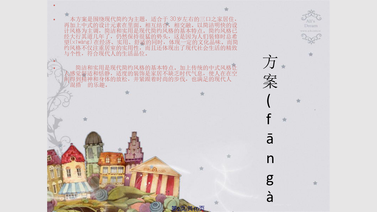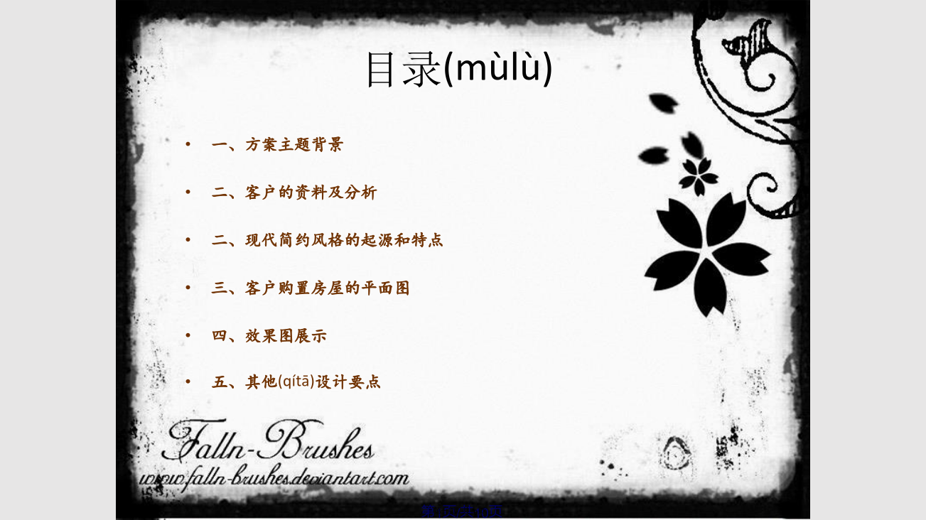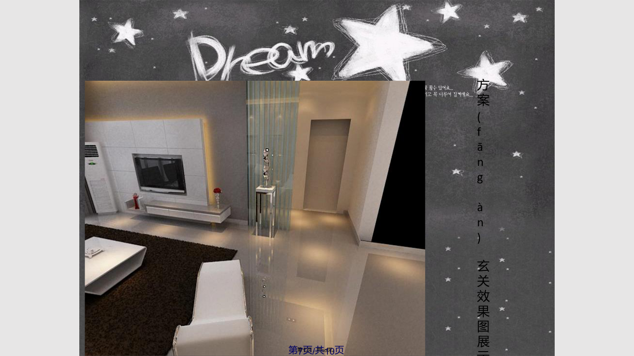 目录(mùlù)本方案是围绕现代简约为主题,适合于30岁左右的三口之家居住,再加上中式的设计元素在里面。相互结合,相交融。以简洁明快的设计风格为主调,简洁和实用是现代简约风格的基本特点。简约风格已经大行其道几年了,仍然保持很猛的势头,这是因为人们装修时总希望(xīwàng)在经济、实用、舒适的同时,体现一定的文化品味。而简约风格不仅注重居室的实用性,而且还体现出了现代社会生活的精致与个性,符合现代人的生活品位。简洁和实用是现代简约风格的基本特点。加上传统的中式风格让人感觉舒适和恬静,适度的装饰是家居不缺乏时代气息,使人在在空间得到精神和身体的放松,并紧跟着时尚的步伐,也满足的现代人‘混搭’的乐趣。这是一家三口的家庭,夫妇(fūfù)和儿子,他们生活得很开心,都是很为家人着想的,互相迁就的,很少有争执的。他们对于住宅的设计要求都比较接近的,即使不太一样的,也会相互迁就的。对这样的条件的话,也比较容易设计的,也很容易去处理。二、现代简约风格的起源(qǐyuán)和特点五、客户购置(gòuzhì)房屋的平面图方案(fāngàn)客厅效果图展示方案(fāngàn)玄关效果图展示所用(suǒyònɡ)的主要材质总结:我觉得营造真正有特色的现代风格的居室在经济、实用、舒适的同时,体现一定(yīdìng)的文化品味,即现代简约。感谢您的观看(guānkàn)!