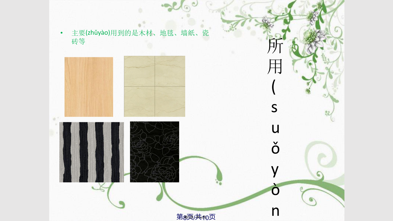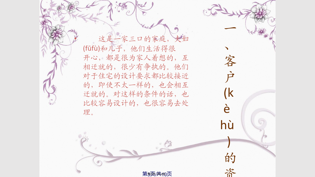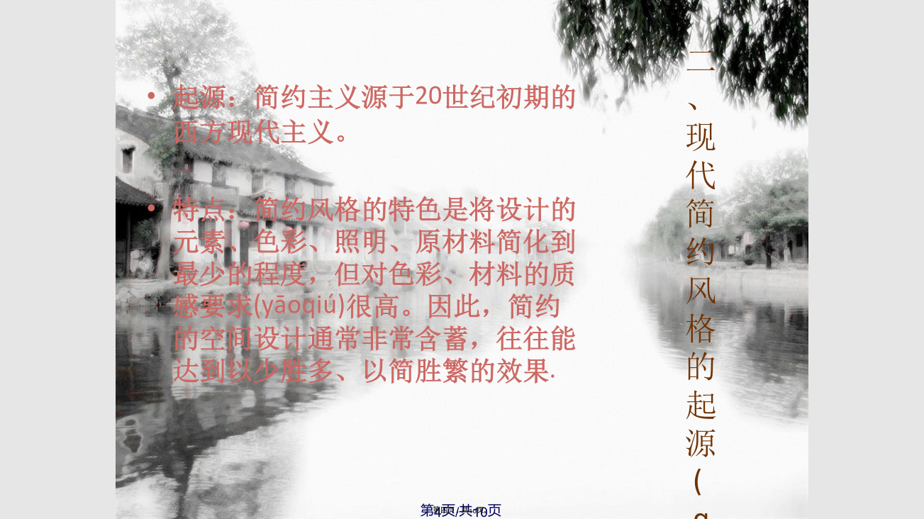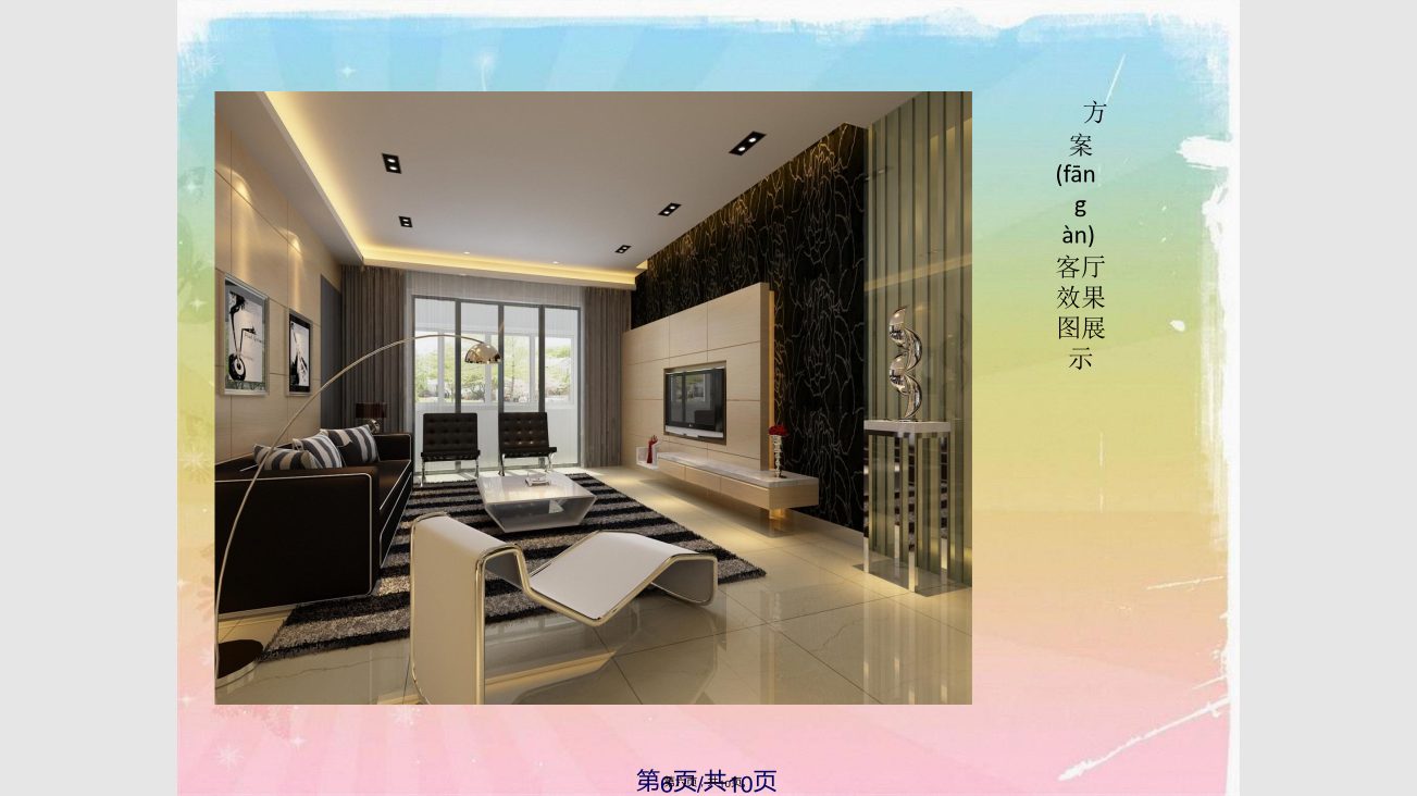 目录(mùlù)本方案是围绕现代简约为主题,适合于30岁左右的三口之家居住,再加上中式的设计元素在里面。相互结合,相交融。以简洁明快的设计风格为主调,简洁和实用是现代简约风格的基本特点。简约风格已经大行其道几年了,仍然保持很猛的势头,这是因为人们装修时总希望(xīwàng)在经济、实用、舒适的同时,体现一定的文化品味。而简约风格不仅注重居室的实用性,而且还体现出了现代社会生活的精致与个性,符合现代人的生活品位。简洁和实用是现代简约风格的基本特点。加上传统的中式风格让人感觉舒适和恬静,适度的装饰是家居不缺乏时代气息,使人在在空间得到精神和身体的放松,并紧跟着时尚的步伐,也满足的现代人‘混搭’的乐趣。这是一家三口的家庭,夫妇(fūfù)和儿子,他们生活得很开心,都是很为家人着想的,互相迁就的,很少有争执的。他们对于住宅的设计要求都比较接近的,即使不太一样的,也会相互迁就的。对这样的条件的话,也比较容易设计的,也很容易去处理。二、现代简约风格的起源(qǐyuán)和特点五、客户购置(gòuzhì)房屋的平面图方案(fāngàn)客厅效果图展示方案(fāngàn)玄关效果图展示所用(suǒyònɡ)的主要材质总结:我觉得营造真正有特色的现代风格的居室在经济、实用、舒适的同时,体现一定(yīdìng)的文化品味,即现代简约。感谢您的观看(guānkàn)!