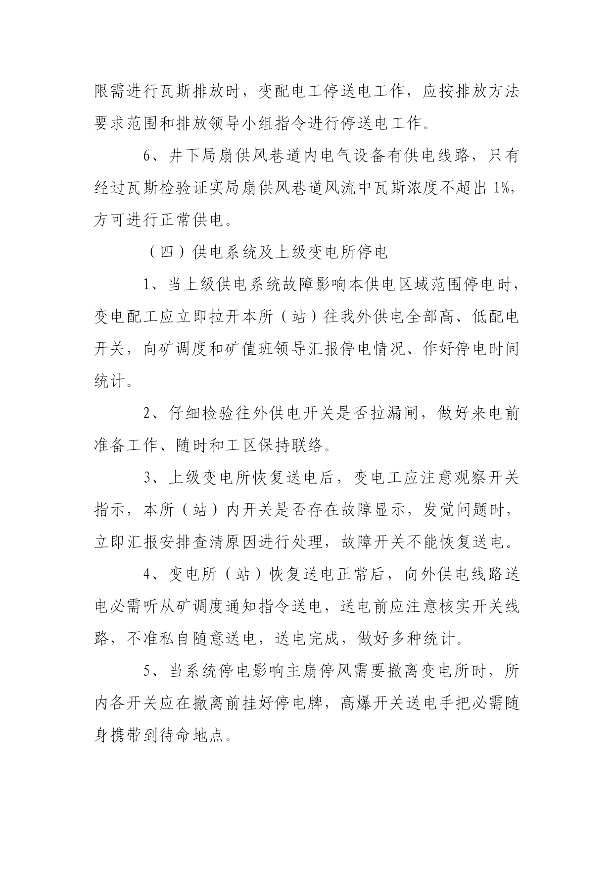 机电、运输管理制度一井下设备安装验收移交制度1、井下全部设备要安装必需严格根据《机电设备完好标准》,《机电运输质量标准化标准》和《机电设备安装标准》进行安装验收移交。2、安装单位接到安装任务后,严格按要求和相关要求组织安装,按期完成安装任务。3、皮带,溜子等大型设备安装过程中,机电必需现场监督安装质量、指导安装,发觉问题立即纠正。4、安装好设备,由机电组织安装和使用单位相关人员到现场进行检验验收,所查出问题由安装单位限期整改完善,整改合格后,再进行验收,而且由三方在现场办理移交手续,并签字后投入使用。5、安装单位安装工程结束后,送电试车前,必需检验电气设备不失爆,供电系统符合设计要求,一切无误后,方可送电试车。6、奖罚要求:(1)安装单位未按要求时间完成任务,超期一天罚100—500元。(2)安装单位未按整改时间要求完成整改任务,超期一天加罚50-100元。(3)安装完工工程,机电(业务管理部门)必需立即组织安装和验收移交工作,无故不参与者每次罚款责任人100元。(4)安装单位按期完成任务达成设计和验收规范要求,结合具体情况,能够给合适奖励。二入井设备检验验收及发放制度1、入井全部设备必需严格根据《煤矿机电设备检修质量标准》和《煤矿矿井机电设备完好标准》进行检验验收。2、检验验收由机电(机电业务管理部门)设备管理员负责,设备专职验收人员、技术员和班长参与。对验收合格设备,办理准入井证。3、验收时间要求:入井设备验收定于天天下午5点到6点30分进行,对生产急需用设备,随时验收。4、天天下午5点前机修必需将需检修好或第2天需移交(或入井)设备清单报给设备管理员(或验收员)。5、对下列设备必需进行整机试车,检验运行无异常。各类绞车、溜子、皮带机、耙斗机、喷浆机、煤机、钻机、喷雾泵、乳化泵、水泵等。6、对于电气设备检修不得有失爆,开关必需带电机试运行,40KW以上电机必需带检漏试车,潜水泵,必需放入水中试运转,不得漏水。7、电气设备相同部位连接螺栓必需统一规格。8、对于新进设备必需检验润滑部分油量和电气设备绝缘情况,整机运行有没有异常。9、检验验收好设备必需填上验收合格证(即准入井证),并注明验收人和检修人姓名,多种开关检修完后,必需进行防腐处理并将编号编在固定位置。10、经验收合格并填上合格证后设备严禁拆套。11、检验验收合格设备必需进行统计,使用单位领用时,必需开票经机电设备管理员审批后发放。并注明使用单位和使用地点及用途。12、检验验收合格设备,到井下运行使用二十四小时内,如出现故障经分析是验收人员责任时,对验收人员各处50元罚款。13、检验验收合格设备机厂凭发票发放。三井下设备回收入厂检验验收制度(一)回收要求1、实施谁使用谁回收移交送厂标准。2、对井下待回收设备由机电设备管理员统一下发回收通知单,回收单位按要求立即回收。3、如工作需要安排其它单位回收时,必需由机电(机电业务管理部门)组织回收单位和使用单位到回收现场检验设备完整情况,并办理相关手续后,方可进行回收。4、机电业务管理部门设备管理人员,必需掌握井下闲置设备情况,立即下达回收通知单。(二)检验验收要求1、凡回收进厂设备必需确保零部件齐全完整。2、验收组织,机电设备管理员组织,技术员,班长和回收单位人员参与。3、检验验收后,设备管理员写出验收移交清单,并三方签字。4、清单上必需注明回收单位,使用单位,使用地点及用途,并统计清楚零部件,损坏丢失及数量。(三)处罚要求1、各回收单位必需按通知回收时间要求主动组织回收,如未按期回收,延期一天,每台件罚款10元。2、对于多种烧坏电机,经分析属于使用不妥造成,对责任单位实施每kw处罚30元。3、损坏部件,经分析属人为损坏,对责任单位按原值50%赔偿,部分损坏视其轻重进行处罚。4、丢失部件对责任单位按其原值赔偿。四变电所(变电站)停送电操作管理制度为确保井下安全供电,规范停送电操作,杜绝各类供电事故发生,现特制订本制度,(一)有计划检修停送电及试验1、正常检修申请停电时,必需按停电申请批按时间进行停电检修,无特殊情况,不得提前或推延。2、变配电工在接到检修停电申请后,应注意审查停送电时间及审批手续是否齐全,确定停电施工责任人是否属实;查对停电开关线路及影响范围是否符合实际,确定无误,向矿调度室值班调度员和矿值班领导汇报,得到明确指示无特殊更改,方能按规程要求进行停送电操作停电闭锁,挂"有些人工作,严禁合闸"牌,写好停送电统计。3、停电检修线路送电时,必需是停电责任人联络,其它人员联络拒绝恢复送电,变电工得到恢复送电通知后,查对正确无误,摘去停电牌,打开闭锁,先试送一次,无异常情况,才能正常合闸送电;送电完成,认真填写送电统计,汇报矿