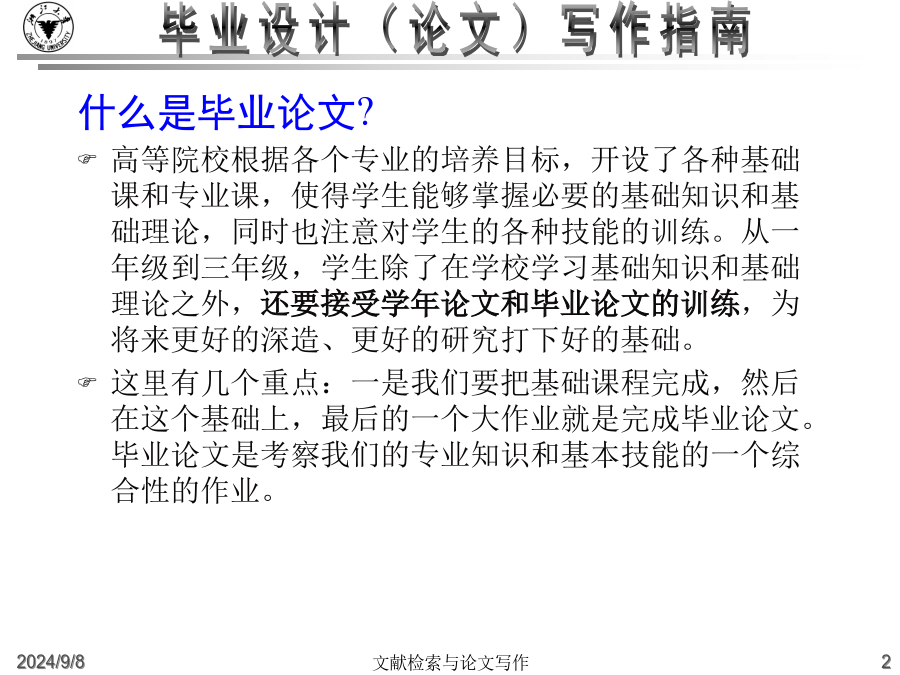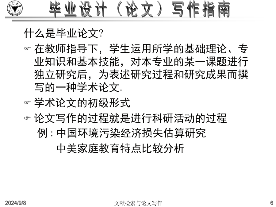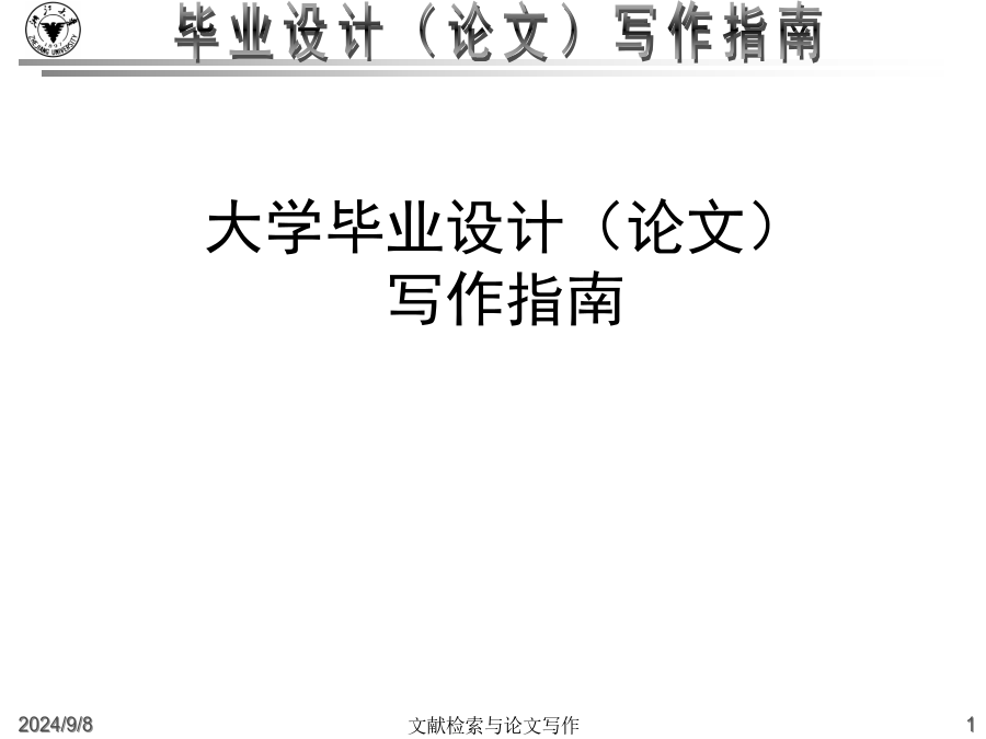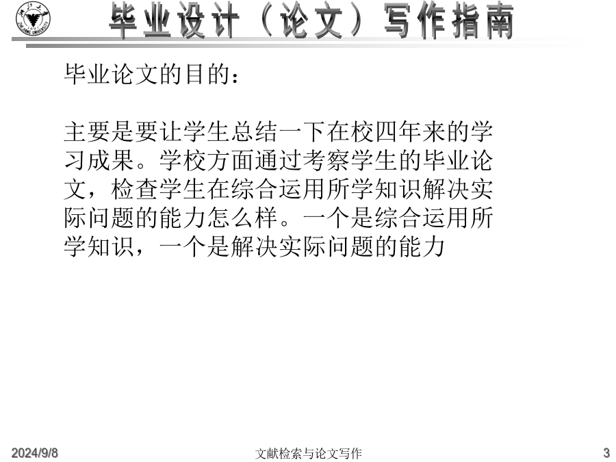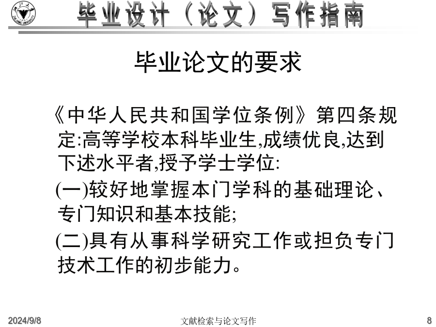 大学毕业设计(论文)写作指南什么是毕业论文?高等院校根据各个专业的培养目标,开设了各种基础课和专业课,使得学生能够掌握必要的基础知识和基础理论,同时也注意对学生的各种技能的训练。从一年级到三年级,学生除了在学校学习基础知识和基础理论之外,还要接受学年论文和毕业论文的训练,为将来更好的深造、更好的研究打下好的基础。这里有几个重点:一是我们要把基础课程完成,然后在这个基础上,最后的一个大作业就是完成毕业论文。毕业论文是考察我们的专业知识和基本技能的一个综合性的作业。毕业论文的目的:主要是要让学生总结一下在校四年来的学习成果。学校方面通过考察学生的毕业论文,检查学生在综合运用所学知识解决实际问题的能力怎么样。一个是综合运用所学知识,一个是解决实际问题的能力毕业论文是学术论文的一种学术论文就是用来进行科学研究和描述科研成果的文章,简称为论文。它既是探讨问题进行科学研究的一种手段,又是描述科研成果进行学术交流的一种工具。它包括学年论文、毕业论文、学位论文、科技论文等,总称为学术论文。什么是毕业论文?毕业论文就是高等院校应届毕业生独立完成的一篇总结性的学术论文。这里有这样几点需要大家注意:一是应届毕业生;二是独立完成,当然是在老师的指导下;三是总结性的什么是毕业论文?在教师指导下,学生运用所学的基础理论、专业知识和基本技能,对本专业的某一课题进行独立研究后,为表述研究过程和研究成果而撰写的一种学术论文.学术论文的初级形式论文写作的过程就是进行科研活动的过程例:中国环境污染经济损失估算研究中美家庭教育特点比较分析写作步骤:1、选题2、搜集材料3、材料整理和分析4、提炼论点5、拟定论文提纲6、动笔写作7、修改定稿毕业论文的要求毕业(科技)论文的特点:1、创新性2、实践性3、可重复性4、独立性5、关联性6、规范性7、可传播性8、半衰期格式规范性(“规范性学术论文”)学位论文已经形成的约定俗成的规范格式。这些基本格式已经列入《国家标准》,“国际标准化组织”也对学位论文制定了一系列的《国际标准》。在文面行款、基本格式等要素上,正日益趋于规范化、标准化,各学校根据具体情况都制定了详细的论文格式规范。学士学位论文的独创性学士学位论文的独创性:学士学位论文的独创性(续)学士学位论文的独创性(续)毕业论文的参考文献必须按照规范标注清楚。通篇没有标注的论文是不合格论文。没有标注,没有参考文献并不表示你的论文有创新。毕业设计(论文)写作常见问题(一)毕业设计(论文)的学术定位:2.毕业论文要求创新这是由科学研究的任务所决定的。科学研究的任务是对新的知识的探求,在综合别人研究成果的基础上去发现别人没有发现过或者涉及过的问题。3.毕业论文要求专业性因为毕业论文要考察学生在所学专业领域中是否较好地掌握了本学科的基础理论、专门知识和基本技能,是否具备了从事科学研究工作或是负担专门技术的能力4.毕业论文要求通俗性论文内容要求专业,语言要求通俗,便于传播与交流。这就要求毕业论文写作的目的:锻炼怎样写论文、社会贡献毕业设计(论文)写作常见问题(二)毕业设计(论文)的选题原则(学术角度):4.是对通说中的不科学的观念进行纠正:敢于纠正长期存在的不科学的“通说”5.对前说作补充作为自己选题的目标6.选题的大小要适中,难度要适度;利用灵感来选题毕业设计(论文)的写作原则(学术角度):毕业设计(论文)的基本结构2.毕业论文的主体部分a.引言(或绪论),说明研究工作的概况、问题所在、目的等b.正文,各专业有各专业的具体要求c.结论d.致谢e.参考文献3.毕业论文的附录和结尾a.附录,过大的补充材料b.结尾,为了便于检索,可以编排分类索引、著者索引、关键词索引毕业设计(论文)的质量评价毕业设计(论文)的题名1.题名的意义a.题名的重要性b.题名的定义2.题名的规范化使用a.文题统一b.信息量大c.用词要求严格d.不用问句式题名e.题名字数:一般不宜超过20个字f.英文题名3.题名的结构a.方法词(或工具词)、动词(或动名词)、限定词(范围)、研究对象b.方法词(或工具词)、研究对象、动词(或动名词)c.限定词(范围)、研究对象、方法词(或工具词)、动词(或动名词)4.题名词语的修饰5.《全国报刊索引》(科技版)a.题录b.内容简介毕业设计(论文)的关键词1.关键词的意义a.关键词的定义b.关键词在信息传播中的作用2.关键词的选择原则a.关键词应包含论文的主题内容b.关键词的专指性规则c.关键词的数量:3~8个d.关键词的排列:第1关键词:论文所属学科名称第2关键词:成果名称第3关键词:所用方法名称第4关键词:研究对象第5、6关