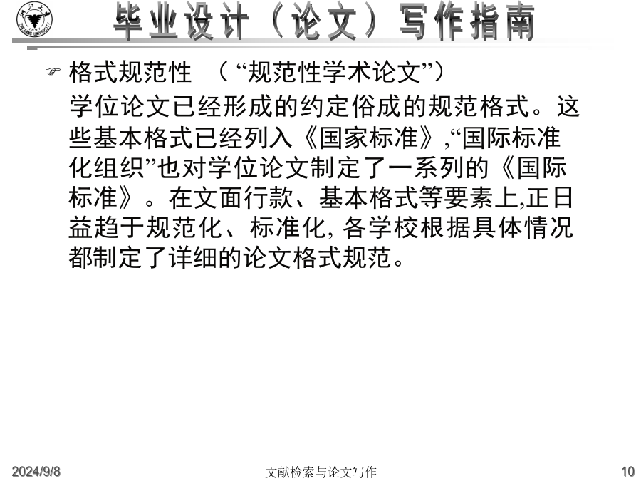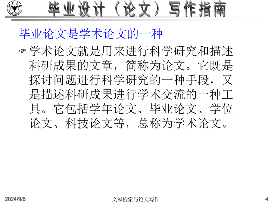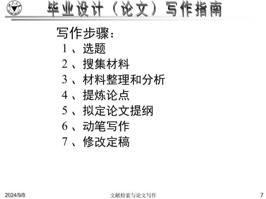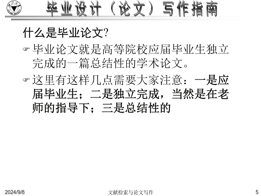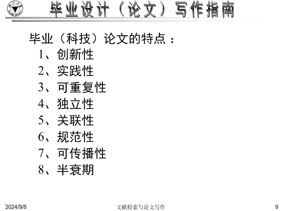 大学毕业设计(论文)写作指南什么是毕业论文?高等院校根据各个专业的培养目标,开设了各种基础课和专业课,使得学生能够掌握必要的基础知识和基础理论,同时也注意对学生的各种技能的训练。从一年级到三年级,学生除了在学校学习基础知识和基础理论之外,还要接受学年论文和毕业论文的训练,为将来更好的深造、更好的研究打下好的基础。这里有几个重点:一是我们要把基础课程完成,然后在这个基础上,最后的一个大作业就是完成毕业论文。毕业论文是考察我们的专业知识和基本技能的一个综合性的作业。毕业论文的目的:主要是要让学生总结一下在校四年来的学习成果。学校方面通过考察学生的毕业论文,检查学生在综合运用所学知识解决实际问题的能力怎么样。一个是综合运用所学知识,一个是解决实际问题的能力毕业论文是学术论文的一种学术论文就是用来进行科学研究和描述科研成果的文章,简称为论文。它既是探讨问题进行科学研究的一种手段,又是描述科研成果进行学术交流的一种工具。它包括学年论文、毕业论文、学位论文、科技论文等,总称为学术论文。什么是毕业论文?毕业论文就是高等院校应届毕业生独立完成的一篇总结性的学术论文。这里有这样几点需要大家注意:一是应届毕业生;二是独立完成,当然是在老师的指导下;三是总结性的什么是毕业论文?在教师指导下,学生运用所学的基础理论、专业知识和基本技能,对本专业的某一课题进行独立研究后,为表述研究过程和研究成果而撰写的一种学术论文.学术论文的初级形式论文写作的过程就是进行科研活动的过程例:中国环境污染经济损失估算研究中美家庭教育特点比较分析写作步骤:1、选题2、搜集材料3、材料整理和分析4、提炼论点5、拟定论文提纲6、动笔写作7、修改定稿毕业论文的要求毕业(科技)论文的特点:1、创新性2、实践性3、可重复性4、独立性5、关联性6、规范性7、可传播性8、半衰期格式规范性(“规范性学术论文”)学位论文已经形成的约定俗成的规范格式。这些基本格式已经列入《国家标准》,“国际标准化组织”也对学位论文制定了一系列的《国际标准》。在文面行款、基本格式等要素上,正日益趋于规范化、标准化,各学校根据具体情况都制定了详细的论文格式规范。学士学位论文的独创性学士学位论文的独创性:学士学位论文的独创性(续)学士学位论文的独创性(续)毕业论文的参考文献必须按照规范标注清楚。通篇没有标注的论文是不合格论文。没有标注,没有参考文献并不表示你的论文有创新。毕业设计(论文)写作常见问题(一)毕业设计(论文)的学术定位:2.毕业论文要求创新这是由科学研究的任务所决定的。科学研究的任务是对新的知识的探求,在综合别人研究成果的基础上去发现别人没有发现过或者涉及过的问题。3.毕业论文要求专业性因为毕业论文要考察学生在所学专业领域中是否较好地掌握了本学科的基础理论、专门知识和基本技能,是否具备了从事科学研究工作或是负担专门技术的能力4.毕业论文要求通俗性论文内容要求专业,语言要求通俗,便于传播与交流。这就要求毕业论文写作的目的:锻炼怎样写论文、社会贡献毕业设计(论文)写作常见问题(二)毕业设计(论文)的选题原则(学术角度):4.是对通说中的不科学的观念进行纠正:敢于纠正长期存在的不科学的“通说”5.对前说作补充作为自己选题的目标6.选题的大小要适中,难度要适度;利用灵感来选题毕业设计(论文)的写作原则(学术角度):毕业设计(论文)的基本结构2.毕业论文的主体部分a.引言(或绪论),说明研究工作的概况、问题所在、目的等b.正文,各专业有各专业的具体要求c.结论d.致谢e.参考文献3.毕业论文的附录和结尾a.附录,过大的补充材料b.结尾,为了便于检索,可以编排分类索引、著者索引、关键词索引毕业设计(论文)的质量评价毕业设计(论文)的题名1.题名的意义a.题名的重要性b.题名的定义2.题名的规范化使用a.文题统一b.信息量大c.用词要求严格d.不用问句式题名e.题名字数:一般不宜超过20个字f.英文题名3.题名的结构a.方法词(或工具词)、动词(或动名词)、限定词(范围)、研究对象b.方法词(或工具词)、研究对象、动词(或动名词)c.限定词(范围)、研究对象、方法词(或工具词)、动词(或动名词)4.题名词语的修饰5.《全国报刊索引》(科技版)a.题录b.内容简介毕业设计(论文)的关键词1.关键词的意义a.关键词的定义b.关键词在信息传播中的作用2.关键词的选择原则a.关键词应包含论文的主题内容b.关键词的专指性规则c.关键词的数量:3~8个d.关键词的排列:第1关键词:论文所属学科名称第2关键词:成果名称第3关键词:所用方法名称第4关键词:研究对象第5、6关