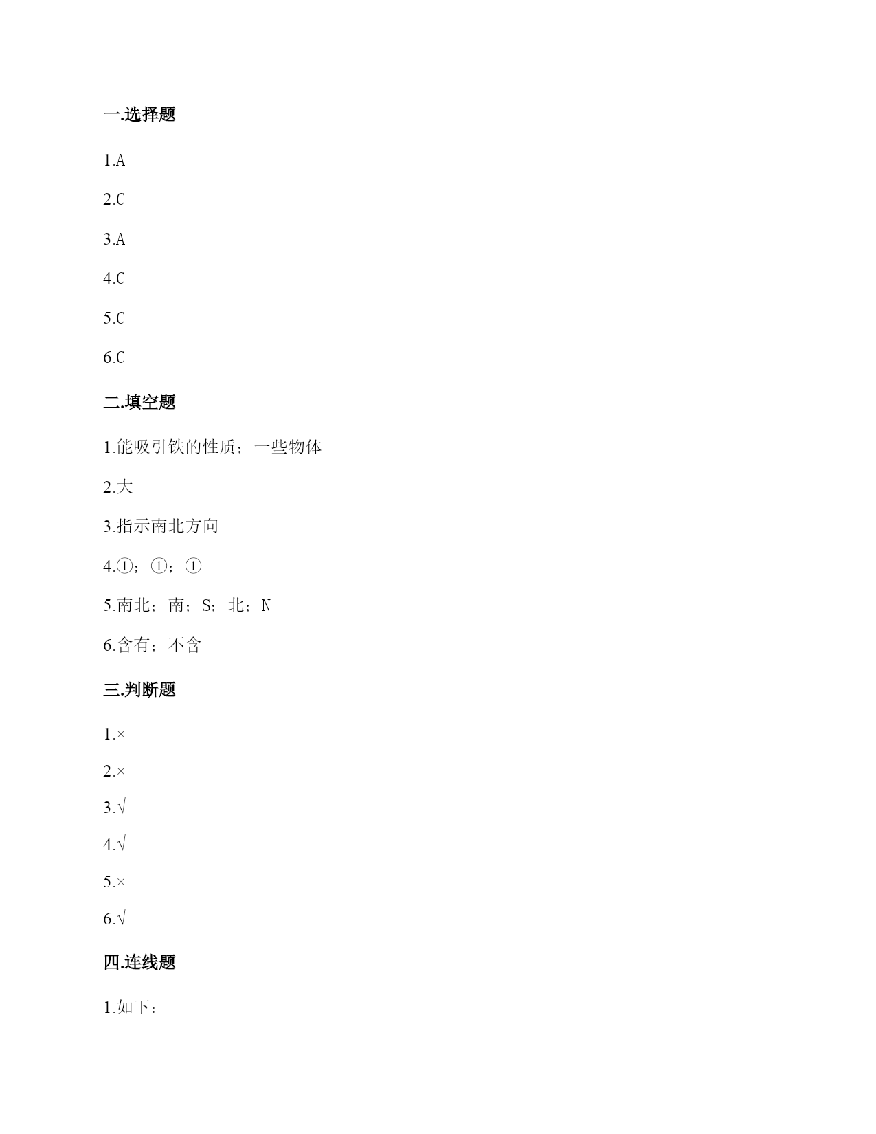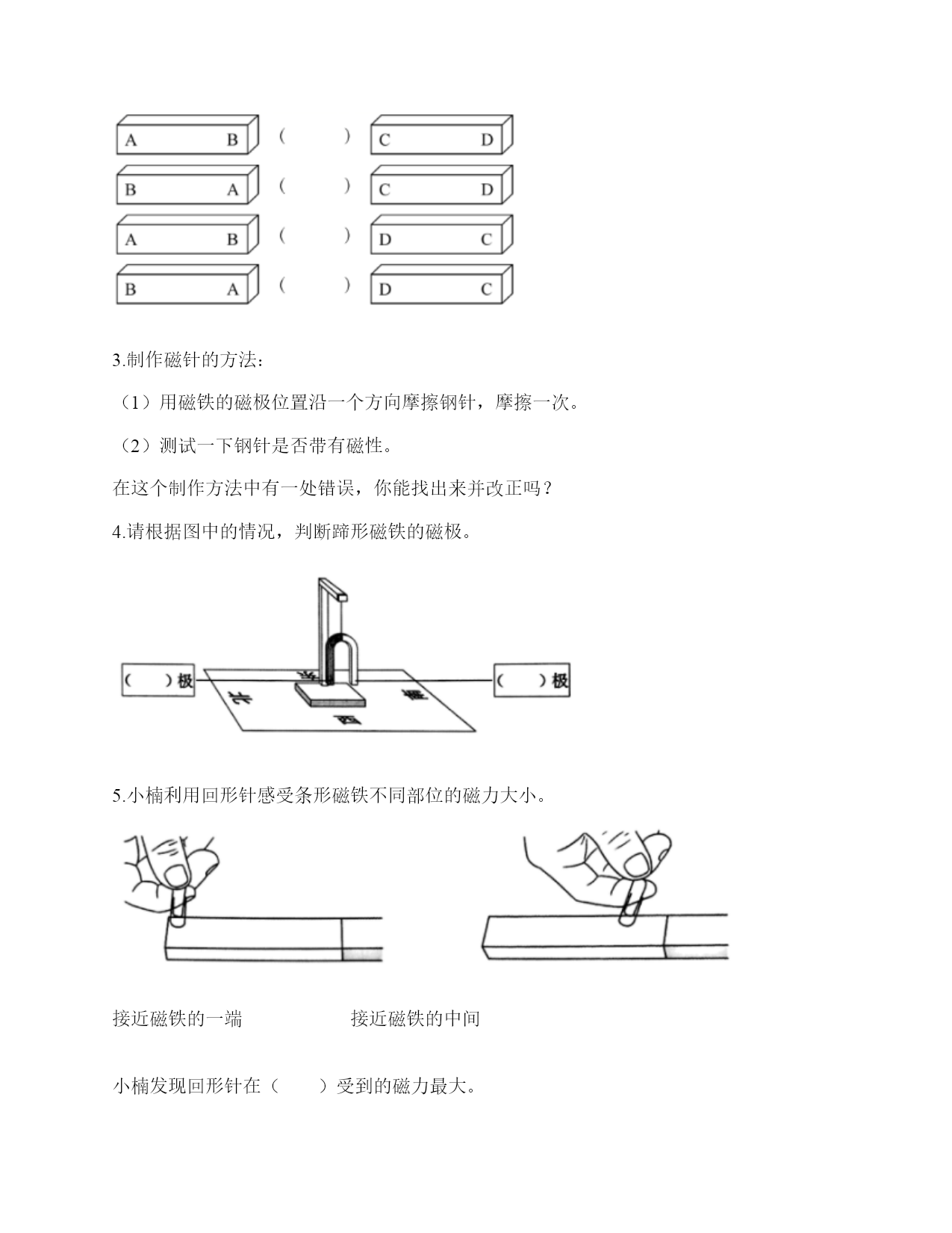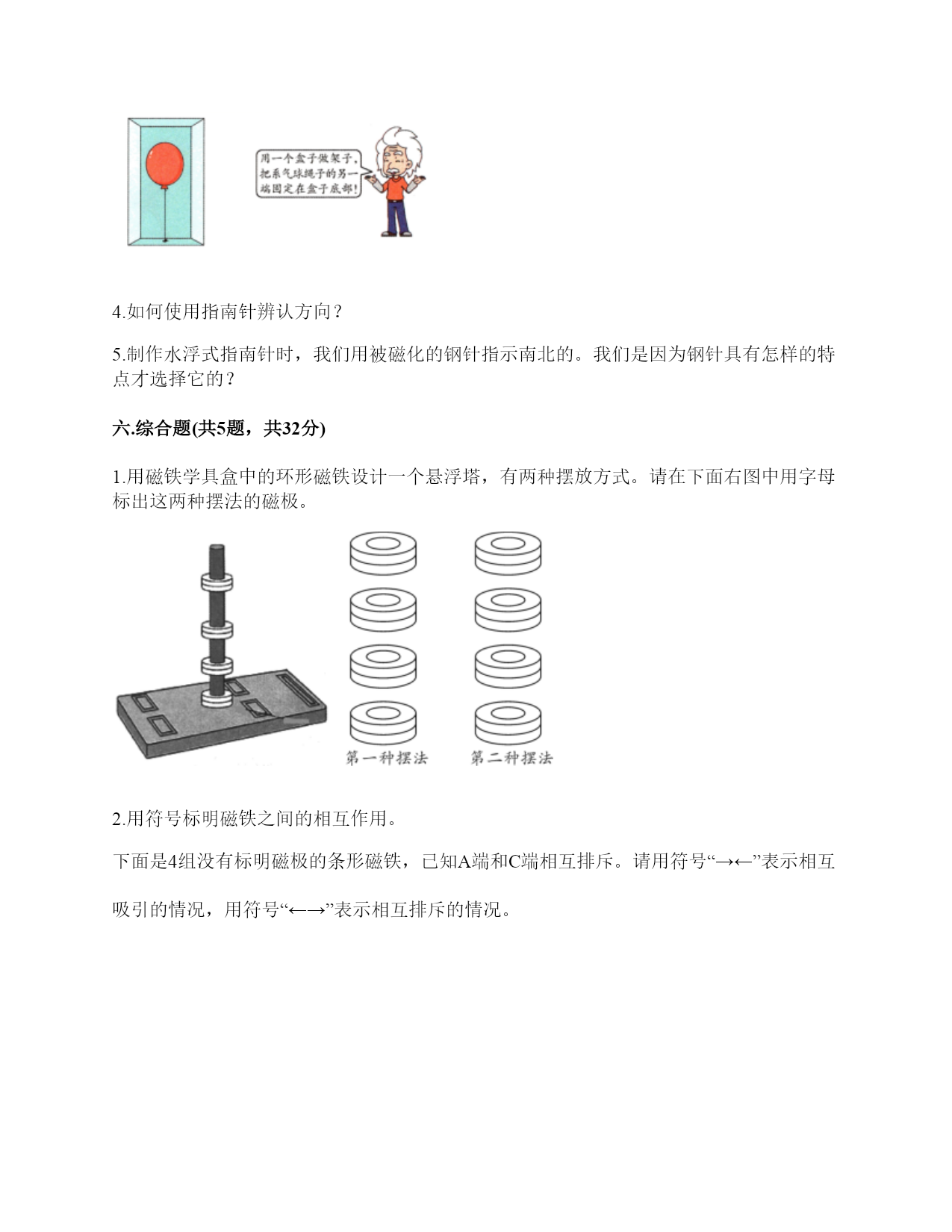 小学科学《磁铁》练习题一.选择题(共6题,共12分)1.指南针中字母S表示的方向为()。A.南B.北C.西2.保持磁铁与被吸引物体距离不变,把下列物体放在中间会影响磁铁磁力的是()。A.一张卡纸B.一块橡皮C.一个铁格尺3.使用指南针辨别方向时,附近有()对指南针没有影响。A.橡皮B.铁柜C.磁铁4.把一颗小钢珠放在磁性比较强的蹄形磁铁上,松开手,可能发生的现象是()。A.小钢珠不动B.小钢珠会掉下来C.小钢珠会滚向蹄形磁铁的磁极部位5.磁力黑板擦(如图)的发明,利用了()。A.磁铁能指示方向的特点B.磁极相互排斥的原理C.磁铁可以吸引铁的性质6.我们可以用“支架法”给()磁铁进行指示方向的实验。A.蹄形B.环形C.条形二.填空题(共6题,共28分)1.磁铁()叫磁性。磁铁隔着()也能吸铁。2.磁极是磁铁磁力最()的地方。3.指南针就是利用磁铁能()的特点制成的。4.下列各图中磁铁靠近小车(铁制)时,小车分别会向哪边移动?①向左②向右();();()5.磁铁能指示()方向,指南的磁极叫()极,用字母()表示;指北的磁极叫(),用字母()表示。6.用磁铁吸引回形针,结果回形针被吸引到了磁铁上,这说明回形针中()铁;用磁铁吸引电线,电线没有被磁铁吸引,这说明电线中()铁。(填“含有”或“不含”)三.判断题(共6题,共12分)1.拉力和磁力都可以驱动木质的小车。()2.磁铁的各个部位都有磁力,但磁力大小不同。()3.磁铁隔着布也能吸铁。()4.这个玩具应用了“相同磁极相互排斥”的原理。()5.当南极和北极用来指示方向时,有着不同的表现,即使有干扰的情况下,南极始终指示南方,北极始终指示北方。()6.如图“用磁铁的不同部位接触回形针”这种排列是对的。()四.连线题(共1题,共3分)1.把使小车动起来的力用线连起来。推力拉力磁力五.简答题(共5题,共27分)1.把下列物品按能否被磁铁吸引进行分类。①一次性纸杯②生锈的水龙头③铝制可乐瓶④铅笔⑤橡皮⑥玻璃球⑦木片⑧铜导线⑨铁钉⑩回形针大头针沙子直尺橡皮筋螺丝钉订书机含镍的硬币磁铁彩纸自行车能被吸引的:()不能被吸引的:()2.磁悬浮列车运用的是高科技手段,跟磁铁没什么关系。3.我们在游乐场会看到有卖向上漂浮的气球,这是因为里面装入了比空气轻的氢气或氦气,你能用磁铁的原理代替氢气做出漂浮气球的效果吗?(请想一想,画出你的设计想法)4.如何使用指南针辨认方向?5.制作水浮式指南针时,我们用被磁化的钢针指示南北的。我们是因为钢针具有怎样的特点才选择它的?六.综合题(共5题,共32分)1.用磁铁学具盒中的环形磁铁设计一个悬浮塔,有两种摆放方式。请在下面右图中用字母标出这两种摆法的磁极。2.用符号标明磁铁之间的相互作用。下面是4组没有标明磁极的条形磁铁,已知A端和C端相互排斥。请用符号“→←”表示相互吸引的情况,用符号“←→”表示相互排斥的情况。3.制作磁针的方法:(1)用磁铁的磁极位置沿一个方向摩擦钢针,摩擦一次。(2)测试一下钢针是否带有磁性。在这个制作方法中有一处错误,你能找出来并改正吗?4.请根据图中的情况,判断蹄形磁铁的磁极。5.小楠利用回形针感受条形磁铁不同部位的磁力大小。接近磁铁的一端接近磁铁的中间小楠发现回形针在()受到的磁力最大。A.两端B.中间C.中间和两端小楠根据发现判断条形磁铁的磁极在()。A.中间B.两端C.任意位置小楠按如图所示的方法,将磁铁慢慢靠近回形针,最先被吸过来的是()。A.1号和3号B.1号和5号C.3号和5号用条形磁铁的不同位置吸引回形针,下列说法错误的是()。A.a点吸引的回形针数量最少B.a点和e点吸引的回形针数量最多C.b点吸引的回形针数量比e点多参考答案一.选择题1.A2.C3.A4.C5.C6.C二.填空题1.能吸引铁的性质;一些物体2.大3.指示南北方向4.①;①;①5.南北;南;S;北;N6.含有;不含三.判断题1.×2.×3.√4.√5.×6.√四.连线题1.如下:五.简答题1.能被吸引的:;不能被吸引的:2.错,磁悬浮列车运用了磁极之间可以相互作用的原理。3.在气球顶上粘一个回形针,在气球上方的盒子上粘一块磁铁,让气球在磁铁的磁力作用下实现漂浮。4.静置在桌面上等待指针停止转动,待停止转动后将刻度盘上的北和指针红色的一端对齐,此时刻度盘上的方向就是真实的方向。5.钢针较轻,受外力影响较小,指示方向更准确。六.综合题1.如下:2.→←,←→,←→,→←。3.制作磁针时,应用磁铁的磁极位置沿一个方向多摩擦几次。解析:只摩擦一次