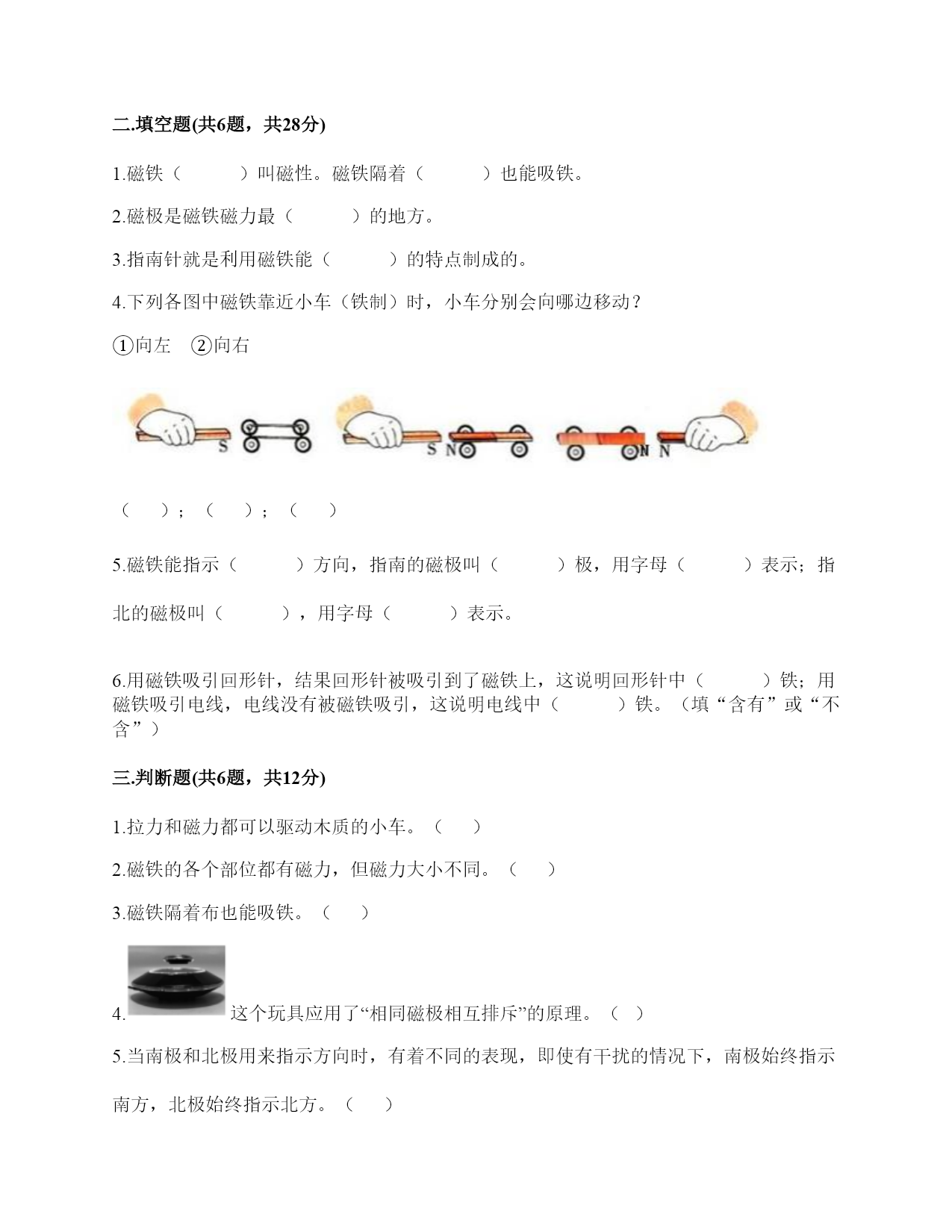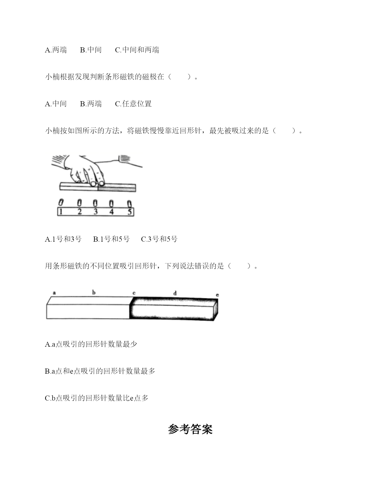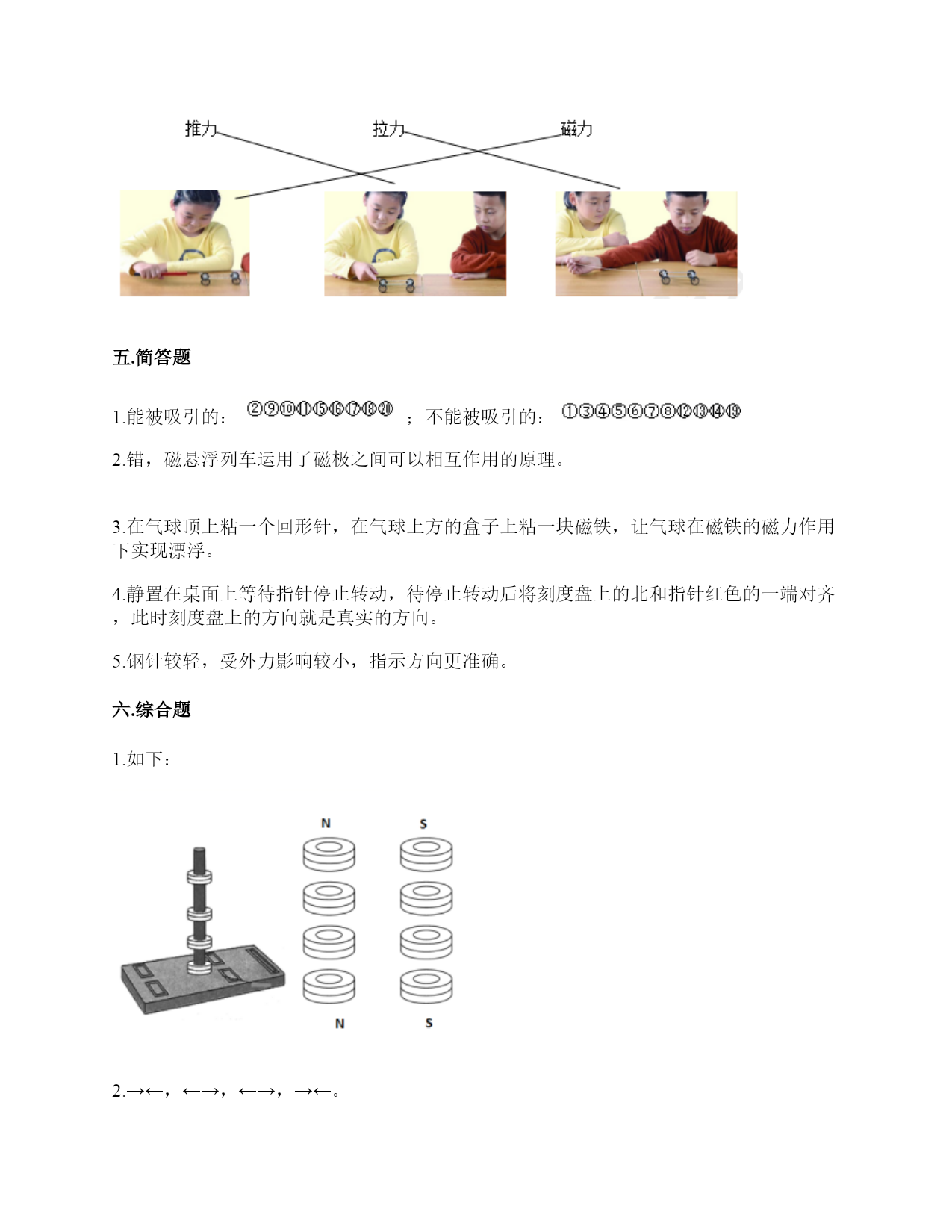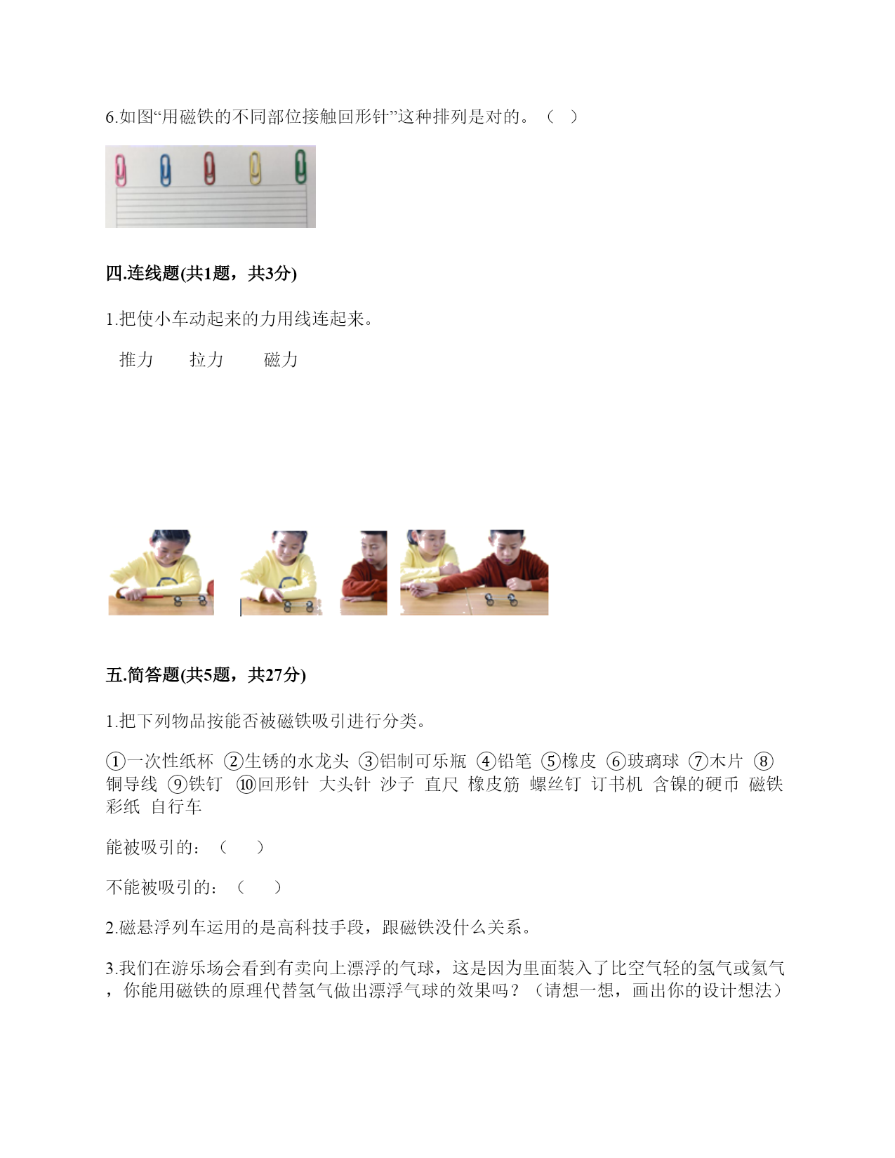 小学科学《磁铁》练习题一.选择题(共6题,共12分)1.指南针中字母S表示的方向为()。A.南B.北C.西2.保持磁铁与被吸引物体距离不变,把下列物体放在中间会影响磁铁磁力的是()。A.一张卡纸B.一块橡皮C.一个铁格尺3.使用指南针辨别方向时,附近有()对指南针没有影响。A.橡皮B.铁柜C.磁铁4.把一颗小钢珠放在磁性比较强的蹄形磁铁上,松开手,可能发生的现象是()。A.小钢珠不动B.小钢珠会掉下来C.小钢珠会滚向蹄形磁铁的磁极部位5.磁力黑板擦(如图)的发明,利用了()。A.磁铁能指示方向的特点B.磁极相互排斥的原理C.磁铁可以吸引铁的性质6.我们可以用“支架法”给()磁铁进行指示方向的实验。A.蹄形B.环形C.条形二.填空题(共6题,共28分)1.磁铁()叫磁性。磁铁隔着()也能吸铁。2.磁极是磁铁磁力最()的地方。3.指南针就是利用磁铁能()的特点制成的。4.下列各图中磁铁靠近小车(铁制)时,小车分别会向哪边移动?①向左②向右();();()5.磁铁能指示()方向,指南的磁极叫()极,用字母()表示;指北的磁极叫(),用字母()表示。6.用磁铁吸引回形针,结果回形针被吸引到了磁铁上,这说明回形针中()铁;用磁铁吸引电线,电线没有被磁铁吸引,这说明电线中()铁。(填“含有”或“不含”)三.判断题(共6题,共12分)1.拉力和磁力都可以驱动木质的小车。()2.磁铁的各个部位都有磁力,但磁力大小不同。()3.磁铁隔着布也能吸铁。()4.这个玩具应用了“相同磁极相互排斥”的原理。()5.当南极和北极用来指示方向时,有着不同的表现,即使有干扰的情况下,南极始终指示南方,北极始终指示北方。()6.如图“用磁铁的不同部位接触回形针”这种排列是对的。()四.连线题(共1题,共3分)1.把使小车动起来的力用线连起来。推力拉力磁力五.简答题(共5题,共27分)1.把下列物品按能否被磁铁吸引进行分类。①一次性纸杯②生锈的水龙头③铝制可乐瓶④铅笔⑤橡皮⑥玻璃球⑦木片⑧铜导线⑨铁钉⑩回形针大头针沙子直尺橡皮筋螺丝钉订书机含镍的硬币磁铁彩纸自行车能被吸引的:()不能被吸引的:()2.磁悬浮列车运用的是高科技手段,跟磁铁没什么关系。3.我们在游乐场会看到有卖向上漂浮的气球,这是因为里面装入了比空气轻的氢气或氦气,你能用磁铁的原理代替氢气做出漂浮气球的效果吗?(请想一想,画出你的设计想法)4.如何使用指南针辨认方向?5.制作水浮式指南针时,我们用被磁化的钢针指示南北的。我们是因为钢针具有怎样的特点才选择它的?六.综合题(共5题,共32分)1.用磁铁学具盒中的环形磁铁设计一个悬浮塔,有两种摆放方式。请在下面右图中用字母标出这两种摆法的磁极。2.用符号标明磁铁之间的相互作用。下面是4组没有标明磁极的条形磁铁,已知A端和C端相互排斥。请用符号“→←”表示相互吸引的情况,用符号“←→”表示相互排斥的情况。3.制作磁针的方法:(1)用磁铁的磁极位置沿一个方向摩擦钢针,摩擦一次。(2)测试一下钢针是否带有磁性。在这个制作方法中有一处错误,你能找出来并改正吗?4.请根据图中的情况,判断蹄形磁铁的磁极。5.小楠利用回形针感受条形磁铁不同部位的磁力大小。接近磁铁的一端接近磁铁的中间小楠发现回形针在()受到的磁力最大。A.两端B.中间C.中间和两端小楠根据发现判断条形磁铁的磁极在()。A.中间B.两端C.任意位置小楠按如图所示的方法,将磁铁慢慢靠近回形针,最先被吸过来的是()。A.1号和3号B.1号和5号C.3号和5号用条形磁铁的不同位置吸引回形针,下列说法错误的是()。A.a点吸引的回形针数量最少B.a点和e点吸引的回形针数量最多C.b点吸引的回形针数量比e点多参考答案一.选择题1.A2.C3.A4.C5.C6.C二.填空题1.能吸引铁的性质;一些物体2.大3.指示南北方向4.①;①;①5.南北;南;S;北;N6.含有;不含三.判断题1.×2.×3.√4.√5.×6.√四.连线题1.如下:五.简答题1.能被吸引的:;不能被吸引的:2.错,磁悬浮列车运用了磁极之间可以相互作用的原理。3.在气球顶上粘一个回形针,在气球上方的盒子上粘一块磁铁,让气球在磁铁的磁力作用下实现漂浮。4.静置在桌面上等待指针停止转动,待停止转动后将刻度盘上的北和指针红色的一端对齐,此时刻度盘上的方向就是真实的方向。5.钢针较轻,受外力影响较小,指示方向更准确。六.综合题1.如下:2.→←,←→,←→,→←。3.制作磁针时,应用磁铁的磁极位置沿一个方向多摩擦几次。解析:只摩擦一次