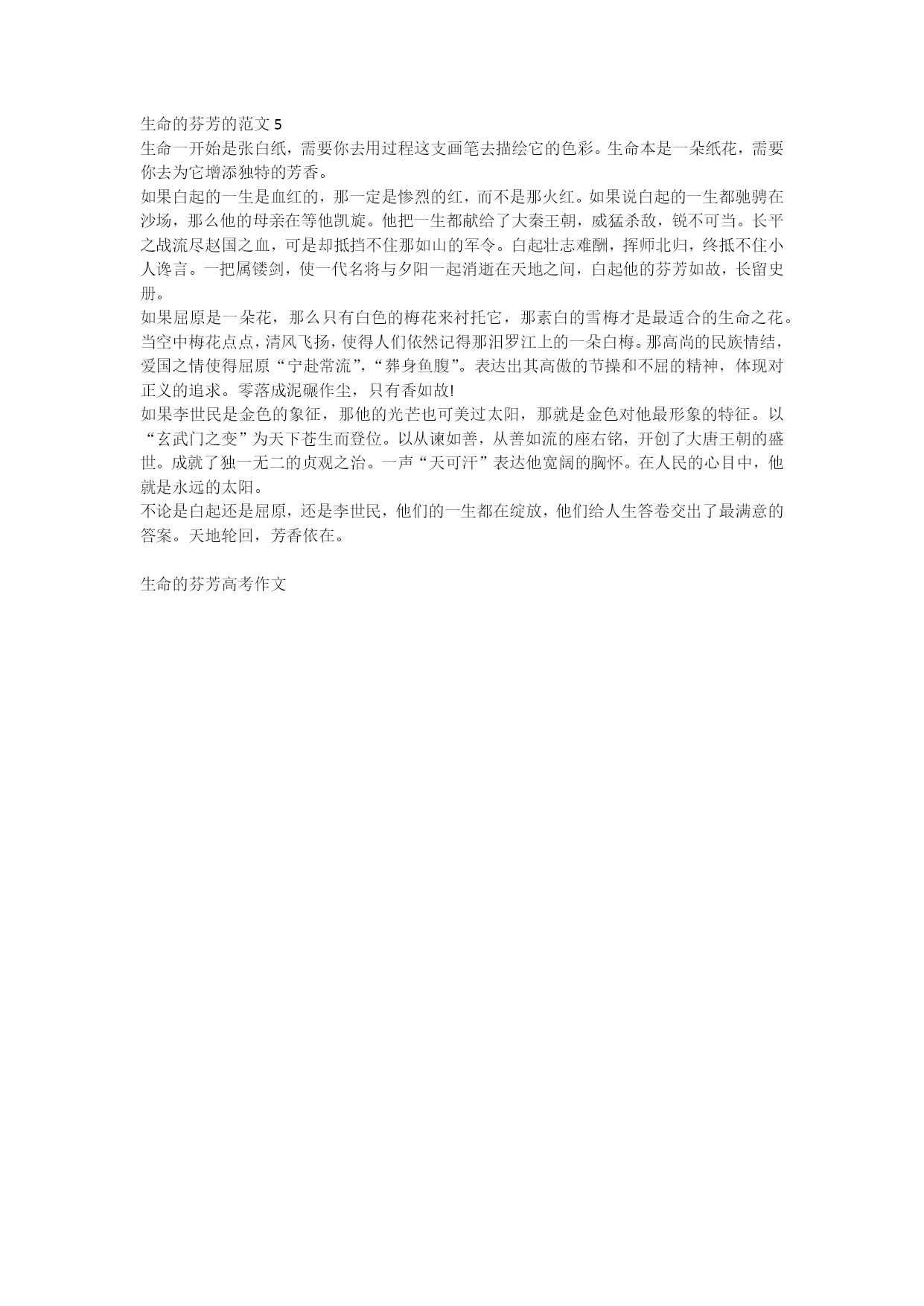 生命的芬芳高考作文每一个生命都有着每一个生命的价值,小到微生物,大到社会最底层的人。一起来看看关于生命的芬芳高考作文,欢迎大家查阅!生命的芬芳的范文1大家应该都见过中华田园犬吧,它是我们中国仅有的狗,俗称“土狗”,但是现在中国许多人都在养国外的名贵犬种,用来表示自己的“地位”,所以现在的流浪犬大多是中华田园犬,被关爱的是国外犬种,里里外外两个世界,同样是“毛孩子”,为什么会有不公平的对待呢?有一次,我在上学途中,看见一个小孩子走到马路中央,而且后方一辆车就要撞上来了,当时是多么的紧张呀。说时迟,那时快,一道黑色的“闪电”把小孩子推到一边,自己也及时逃脱了,我定睛一看,它是一只中华田园犬。过了几天,我在网上也看到了许多狗的照片。这时,一张照片顿时打动了我的心。照片上是一位老人,他已经失去双腿,坐在轮椅上,再向旁边一看,一根绳子系在这只中华田园犬的腰上,另一头则系在老人的轮椅上,它拉着老人观赏风景,看着它口喘粗气的样子,好像在说:“让我来做你的双腿吧。”此时,我已泪流满面。还有一次,我在手机上又看到那张照片,照片上是一只中华田园犬的后腿缠绕着纱布,我看了下面的文字,内容大致是这样:这只犬为了不让主人被火车撞倒,用力将主人顶开,但它自己没能及时逃脱,被撞伤了一条腿。我以前也养过一只中华田园犬,当时是在菜花地的一个大箱子里抱的,但箱子里还有两只,由于家里地方小,只能养一只。唉,没能拯救更多的“毛孩子”。它到了我家,我便给它取名为——多多,因为它吃得多,喝得多,睡得多。有一次,有小偷来“拜访”,那时的多多正巧睡在门那,它一听到脚步声,就“汪汪汪”吓跑了小偷。但是好景不长,它在我上学的时候跟着车跑,结果被其他车撞死了,而那个撞多多的人早已逃之夭夭。中华田园犬的生命固然短暂,但它能在这短暂的狗生中,散发出生命的芬芳。生命的芬芳的范文2龙胆花开,蝶儿飞来,半亩花田既往芬芳……想你,最爱的龙胆花,她的花语是爱看忧伤的你,如你一般的忧伤,然而,她坚强的绽放在悬崖上,数不清的龙胆你挨着我,我挤着你,爬满了山坡上、草丛间、石岩缝中……把山崖染得格外漂亮。她远离喧嚣市镇,永远生长在空气清纯的世界中,它那么高洁,一尘不染。那独有的蓝色,分明就是燃烧不熄的你,给人们带来一股淡淡的暖意;分明就是放荡不羁的你的召唤,给人们送去一种启迪,一种感悟。想你说,我愿意幸福,我只愿意幸福。我赞同,我赞同你所有任性的话。因为这任性里有不一般的执著与纯粹。“好好生活”这四个字并不慈悲。我知道,这样四个字是这么艰难、深邃。让人迷惑,让人痛苦,甚至让人绝望。你说,这是怎样的一种生活。日子纷落,竟让我无处躲藏。想你的日志:“如果可以,只让我的右眼流泪吧。另一只眼,让它拥有明媚与微笑。”我渐渐体会出在《花田半亩》的背后浅淡地流露出你略带忧伤的无可奈何,也感受得到你眼泪中浸润的笑意……在死亡的悲泣里,我看到欢颜,看到龙胆花的坚强。“花田半亩”,一语成谶,一个仙子般的少女留下半亩花田,化蝶而去。花已落,芬芳依旧……生命的芬芳的范文3人生一场大梦,梦影雾花皆是空。空留长叹一声,或是芬芳如兰,抑或是恶臭扑鼻。而那流传千古的几缕幽幽之香,那些不朽的传奇,他,东坡居士便是书写者之一。他一生坎坷,被贬官数次,曾下放至惠州、黄州、儋州、海南等地。条件艰苦便不再提了,而那每次燃起希望后的一瓢冷水总是令人绝望的。他擅诗赋。他在流放过程中创作出大量优秀的文学作品:大江东去,浪淘尽,千古风流人物;相顾无言,惟有泪千行;人生如梦,一樽还酹江月……数不胜数。他豪爽、开旷、热爱生活,在那最低谷之时依旧对酒当歌,对月抒情,实在令人佩服!他视每一处被贬之地都为故乡,倾听流水潺潺,描绘月光点点。是什么,造就了那开阔的胸襟和伟大的气魄呢?苏东坡在黄州时,写过前后两部《赤壁赋》。前一部大致是讲他与一位姓杨的道士在赤壁边划船、喝酒、赏月,扣船长啸,正尽兴之际,道士却忽然伤感起来,感叹人的渺小,生命的短暂。而苏东坡挥挥衣袖,道,江水和明月,若说是长久,那便已存在了千万年;若说是短暂,那么此刻眼前的江水,与一眨眼以后的江水就已不同了。所以,这般的短暂或是长远又有何意义呢?不过自寻烦恼罢了。不如让生命更有意义些,不求流芳百世,但也无愧于心了。那,怎样才能让生命有意义呢?所谓“生尽欢,死无憾”,人有悲欢离合,月有阴晴圆缺,如此乃天道,谁又能颠覆?每个人都是时间长河中的一位过客,而你的生命不过是流水中匆匆的浪花一朵。人生忽如寄,也不过是人世间走了一遭,难道还要渴求能留住江水和明月?在世之时,又何必去在意那些有的没的呢?做完想做的大事,尽完应尽的责任,那么死,也是一种对自己的肯定!这样的逝去,才是意义非凡的。更有甚者,如屈原一般,用尽一生来忧天下人,即使得不到回报。如此这般,死,更是