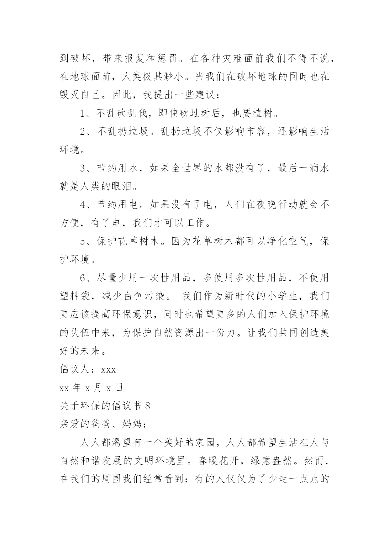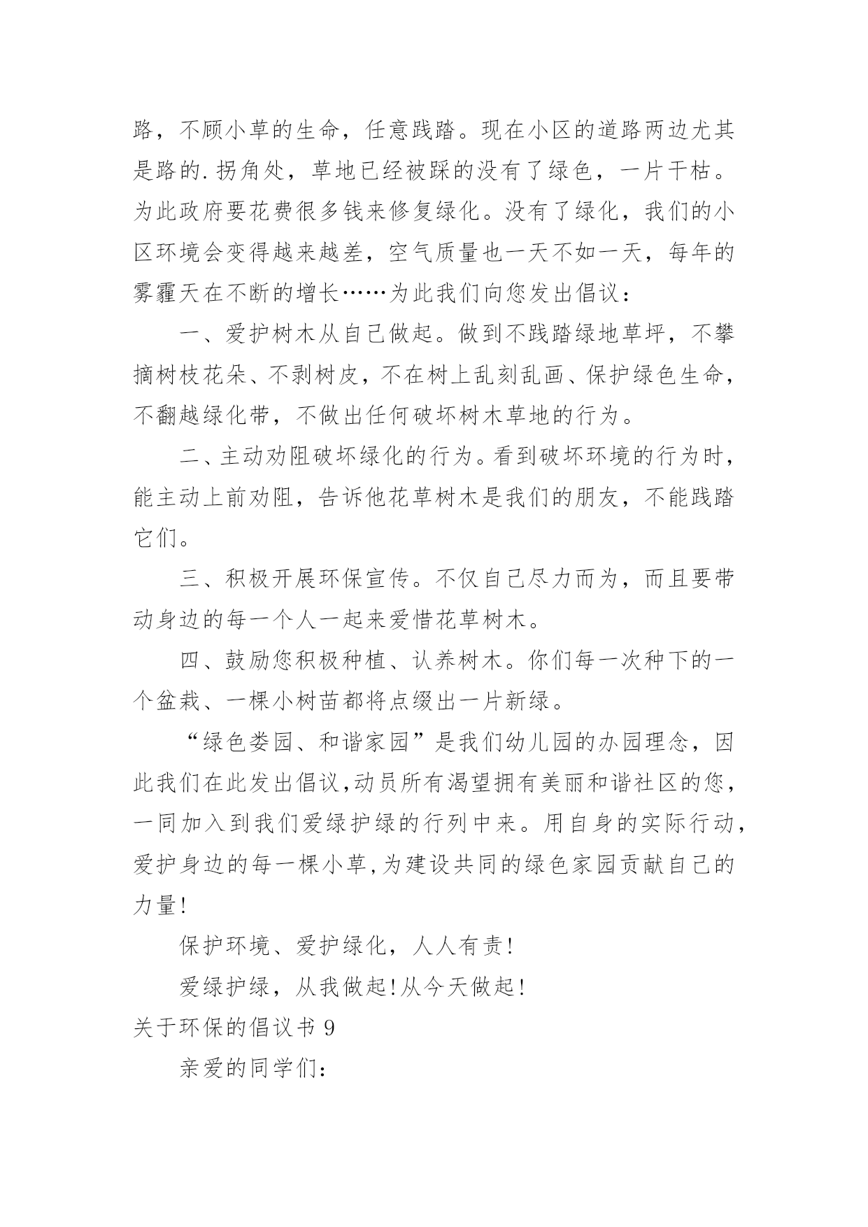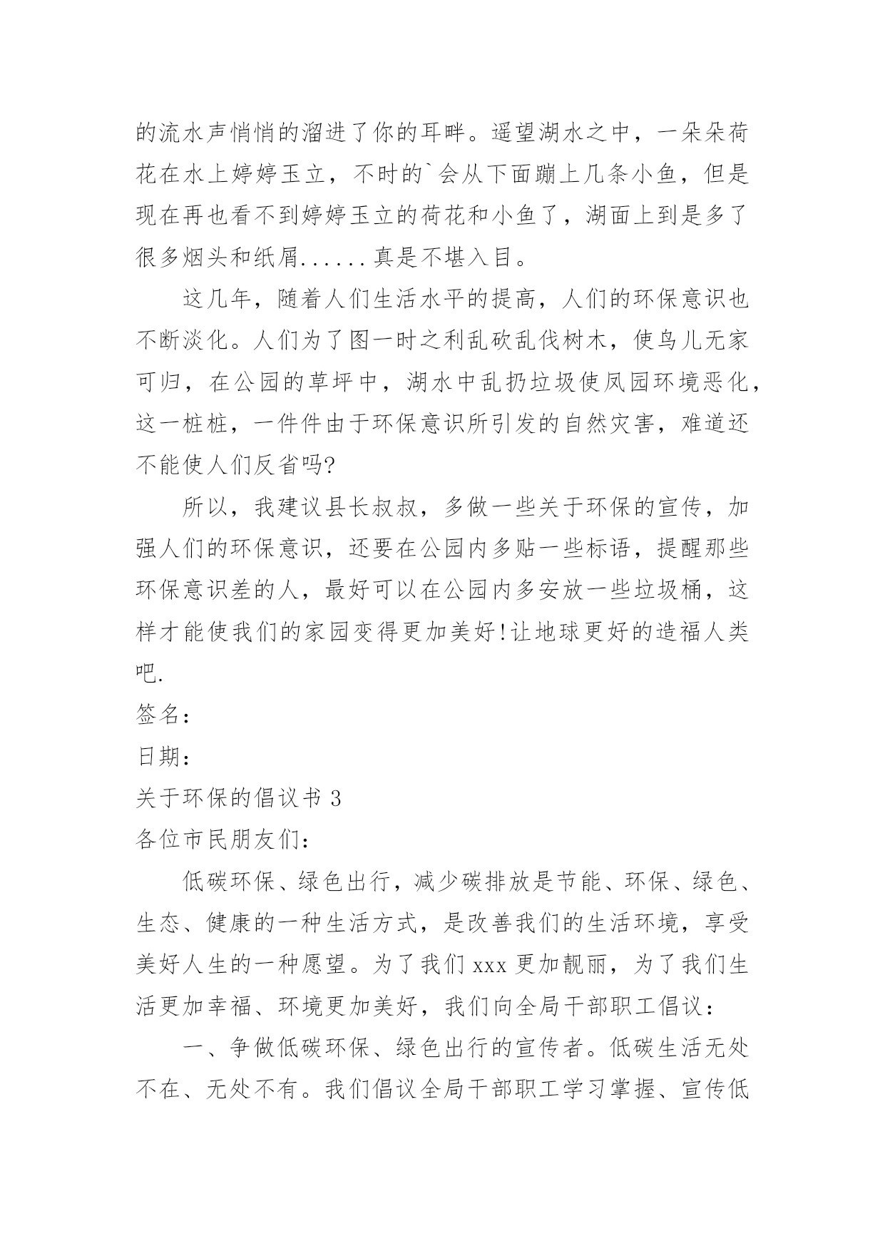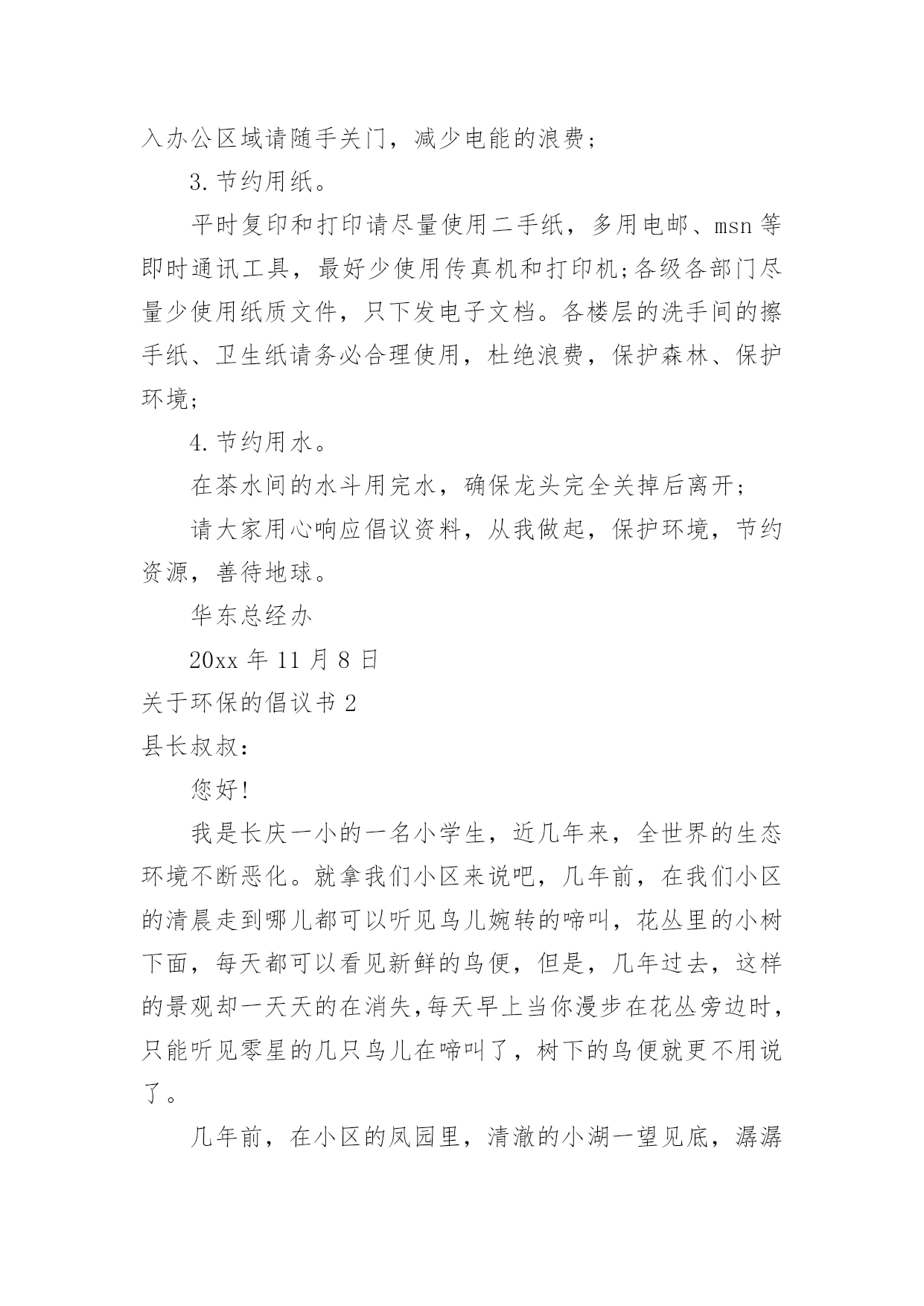 环保的倡议书关于环保的倡议书在不断进步的社会中,很多地方都会使用到倡议书,倡议书具有广泛的群众性的特征。那要怎么写好倡议书呢?以下是小编精心整理的关于环保的倡议书,仅供参考,欢迎大家阅读。关于环保的倡议书1各位同事:有效降低碳排放量,不仅仅仅是国际和国家的事情,为了我们的生存环境不再加速恶化,我们每一个地方、每一个部门、每一个人都就应用心行动起来,想尽一切办法减少碳排放量。长期以来的高碳排放,破坏了大气,破坏了自然生态系统,我们的`生存环境已经受到威胁。所以倡议大家:1.请尽量少乘电梯,多爬楼梯。员工平时工作去各楼层,请务必不乘电梯,使用楼梯,个性是相隔1、2个楼层的,步行上下楼梯,一方面锻炼身体,一方面节能环保。2.节约用电。员工下班请随手关掉各种电器电源;各独立办公室使用人离开时请及时关掉电灯和空调;冬、夏两个空调季节,出入办公区域请随手关门,减少电能的浪费;3.节约用纸。平时复印和打印请尽量使用二手纸,多用电邮、msn等即时通讯工具,最好少使用传真机和打印机;各级各部门尽量少使用纸质文件,只下发电子文档。各楼层的洗手间的擦手纸、卫生纸请务必合理使用,杜绝浪费,保护森林、保护环境;4.节约用水。在茶水间的水斗用完水,确保龙头完全关掉后离开;请大家用心响应倡议资料,从我做起,保护环境,节约资源,善待地球。华东总经办20xx年11月8日关于环保的倡议书2县长叔叔:您好!我是长庆一小的一名小学生,近几年来,全世界的生态环境不断恶化。就拿我们小区来说吧,几年前,在我们小区的清晨走到哪儿都可以听见鸟儿婉转的啼叫,花丛里的小树下面,每天都可以看见新鲜的鸟便,但是,几年过去,这样的景观却一天天的在消失,每天早上当你漫步在花丛旁边时,只能听见零星的几只鸟儿在啼叫了,树下的鸟便就更不用说了。几年前,在小区的凤园里,清澈的小湖一望见底,潺潺的流水声悄悄的溜进了你的耳畔。遥望湖水之中,一朵朵荷花在水上婷婷玉立,不时的`会从下面蹦上几条小鱼,但是现在再也看不到婷婷玉立的荷花和小鱼了,湖面上到是多了很多烟头和纸屑......真是不堪入目。这几年,随着人们生活水平的提高,人们的环保意识也不断淡化。人们为了图一时之利乱砍乱伐树木,使鸟儿无家可归,在公园的草坪中,湖水中乱扔垃圾使凤园环境恶化,这一桩桩,一件件由于环保意识所引发的自然灾害,难道还不能使人们反省吗?所以,我建议县长叔叔,多做一些关于环保的宣传,加强人们的环保意识,还要在公园内多贴一些标语,提醒那些环保意识差的人,最好可以在公园内多安放一些垃圾桶,这样才能使我们的家园变得更加美好!让地球更好的造福人类吧.签名:日期:关于环保的倡议书3各位市民朋友们:低碳环保、绿色出行,减少碳排放是节能、环保、绿色、生态、健康的一种生活方式,是改善我们的生活环境,享受美好人生的一种愿望。为了我们xxx更加靓丽,为了我们生活更加幸福、环境更加美好,我们向全局干部职工倡议:一、争做低碳环保、绿色出行的宣传者。低碳生活无处不在、无处不有。我们倡议全局干部职工学习掌握、宣传低碳知识,提高低碳意识,树立低碳理念,倡导低碳生活;向身边人宣传开展“低碳环保、绿色出行”的意义和方式,带动更多的人参与到行动中来。让我们的家园多一片蓝天,多一丝绿色,多一路畅通,多一些文明。二、争做低碳环保、绿色出行的践行者。我们倡导全局干部职工积极参与“低碳生活,绿色出行”活动,特提出如下倡议:(一)居住在城区范围内的`干部职工在不影响上、下班制度前提下,根据自身的身体素质选择步行或骑行的方式出行。(二)根据天气情况,在保障人身安全,不影响交通的前提下,每天下午下班后,由“低碳绿色骑行俱乐部”组织在城区车辆较少的路段骑行1小时。(三)本年度选择步行或骑行的出行方式,沿永定河、大清河、引清东干渠等河堤,组织2次以上的河流生态环境巡查活动。(四)利用周六、日组织一次远距离骑行,到周边县、市参观绿化、生态、污染治理的工程项目,并交流工作经验。(五)每周五设立为“无车日”。在不影响工作和生活的前提下,全局干部职工不使用机动车。集中执法行动或上级安排的集中活动除外。三、争做低碳环保、绿色出行的倡导者。我们倡议全局干部职工树立“能走不骑,能骑不坐,能坐不开”的出行理念,自觉遵循“低碳生活,绿色出行”倡议内容,尽可能采取乘坐公交车、骑自行车或步行等出行方式为广大居民作出表率。繁忙的道路,城市的未来,也许将从这一刻开始,更加通畅,更加光明!我们期待您的参与!xxxx关于环保的倡议书4亲爱的同学们:房间里长时间开着电灯、电视却空无一人;笔记本被随手扔进了垃圾桶却只用了几页,你们是否经历过?大家是否想到过,自然资源是有限的。现在世界上的自然资源已经开始减少了。如果我们有保护环境的意识,如果我们都能成为保护环境的使者,世界将是另一番景象,为了保护环境,保护我们的家