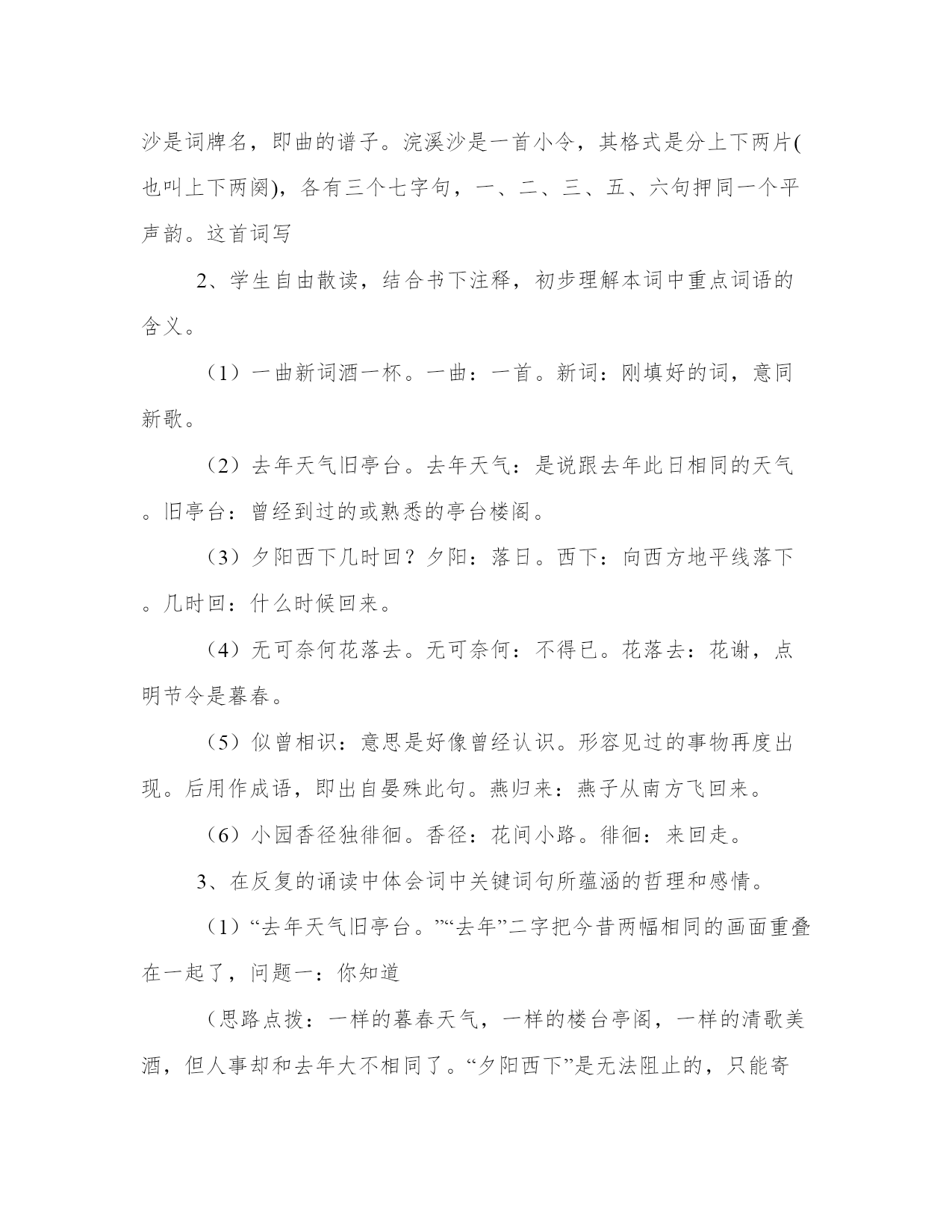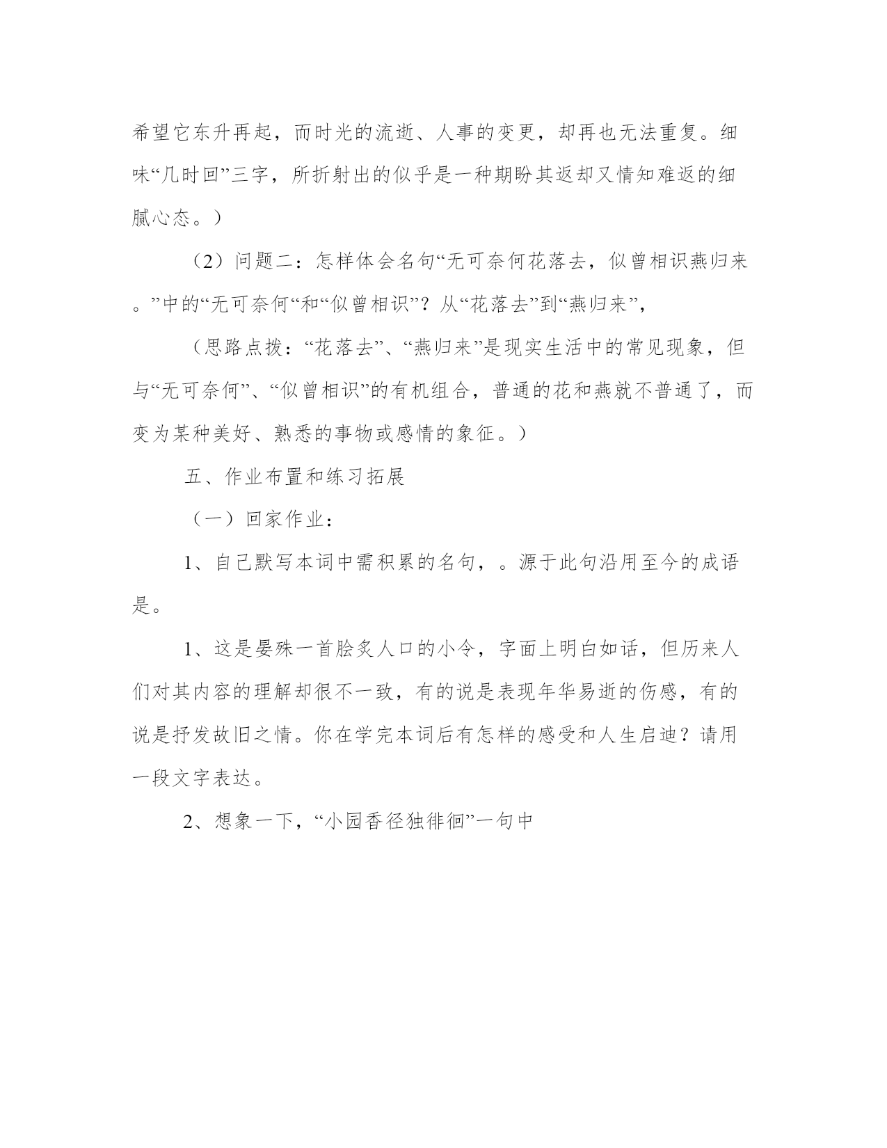 晏殊的浣溪沙课件一、学习目标1、在吟诵背诵中感受本词语言清丽自然的特色。2、体会本词的意境,感悟词人所表达的深刻感受。二、学法指导学生先在查阅资料和借助书下注释的基础上理解本词的大意,再通过重点字词和关键句子的讲解,引导学生去不断地挖掘本词的深刻内蕴,多角度地理解三、预习内容1、根据前一节课中学过的有关词的知识,回答这首词从字数和结构上分类分别属于和。2、你对晏殊是时期的词人,浣溪沙是词的,它选自。3、学有潜力的同学还可以思考下一部分中出现的问题。四、课堂学习重点内容(1课时完成)1、晏殊(991~1055)字同叔,抚州临川(今江西省抚州市)人。十三岁时,以神童召试,赐同进士出身。他是北宋前期较早的词家,作品大多反映富贵悠闲的生活,但他的词艺术成就较高,能以疏淡闲雅的语言写出较深的含义,音韵和谐,意境清新。这首词选自珠玉词。浣溪沙是词牌名,即曲的谱子。浣溪沙是一首小令,其格式是分上下两片(也叫上下两阕),各有三个七字句,一、二、三、五、六句押同一个平声韵。这首词写2、学生自由散读,结合书下注释,初步理解本词中重点词语的含义。(1)一曲新词酒一杯。一曲:一首。新词:刚填好的词,意同新歌。(2)去年天气旧亭台。去年天气:是说跟去年此日相同的天气。旧亭台:曾经到过的或熟悉的亭台楼阁。(3)夕阳西下几时回?夕阳:落日。西下:向西方地平线落下。几时回:什么时候回来。(4)无可奈何花落去。无可奈何:不得已。花落去:花谢,点明节令是暮春。(5)似曾相识:意思是好像曾经认识。形容见过的事物再度出现。后用作成语,即出自晏殊此句。燕归来:燕子从南方飞回来。(6)小园香径独徘徊。香径:花间小路。徘徊:来回走。3、在反复的诵读中体会词中关键词句所蕴涵的哲理和感情。(1)“去年天气旧亭台。”“去年”二字把今昔两幅相同的画面重叠在一起了,问题一:你知道(思路点拨:一样的暮春天气,一样的楼台亭阁,一样的清歌美酒,但人事却和去年大不相同了。“夕阳西下”是无法阻止的,只能寄希望它东升再起,而时光的流逝、人事的变更,却再也无法重复。细味“几时回”三字,所折射出的似乎是一种期盼其返却又情知难返的细腻心态。)(2)问题二:怎样体会名句“无可奈何花落去,似曾相识燕归来。”中的“无可奈何“和“似曾相识”?从“花落去”到“燕归来”,(思路点拨:“花落去”、“燕归来”是现实生活中的常见现象,但与“无可奈何”、“似曾相识”的有机组合,普通的花和燕就不普通了,而变为某种美好、熟悉的事物或感情的象征。)五、作业布置和练习拓展(一)回家作业:1、自己默写本词中需积累的名句,。源于此句沿用至今的成语是。1、这是晏殊一首脍炙人口的小令,字面上明白如话,但历来人们对其内容的理解却很不一致,有的说是表现年华易逝的伤感,有的说是抒发故旧之情。你在学完本词后有怎样的感受和人生启迪?请用一段文字表达。2、想象一下,“小园香径独徘徊”一句中