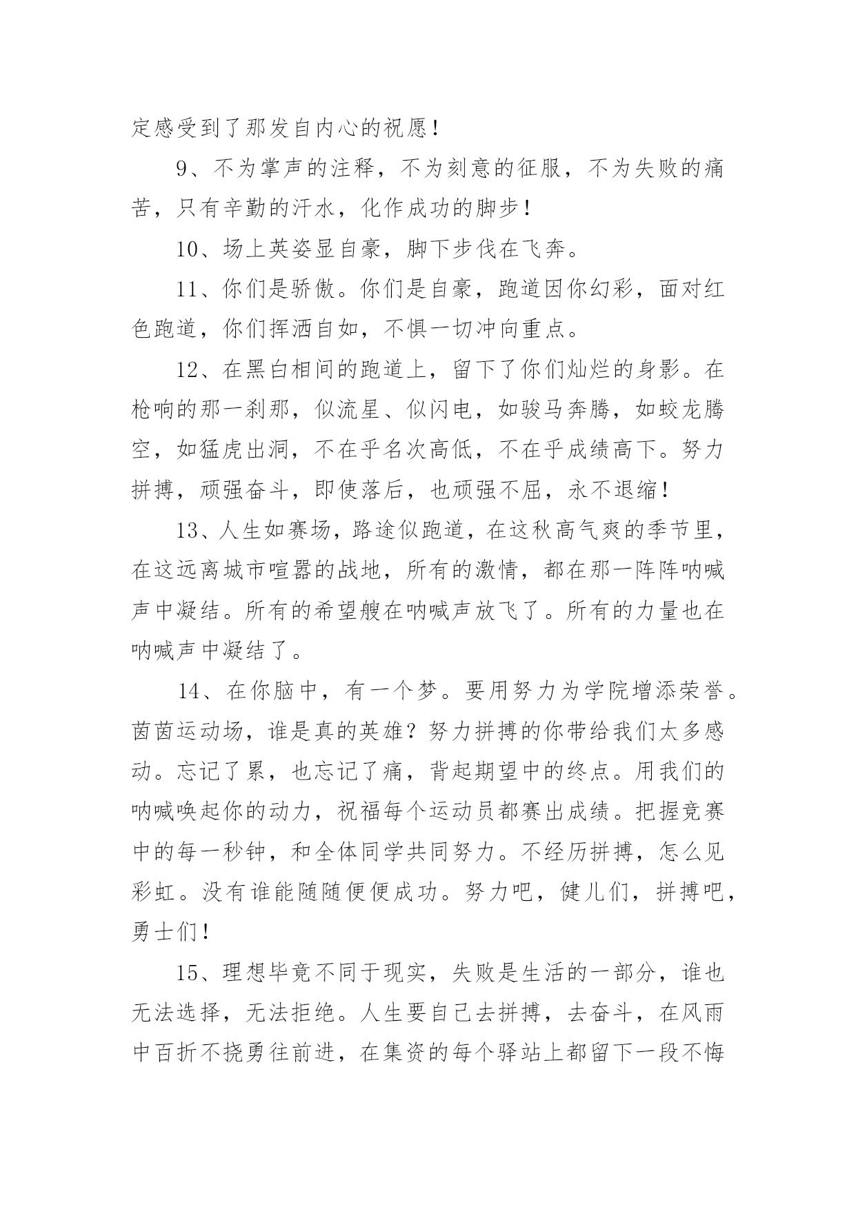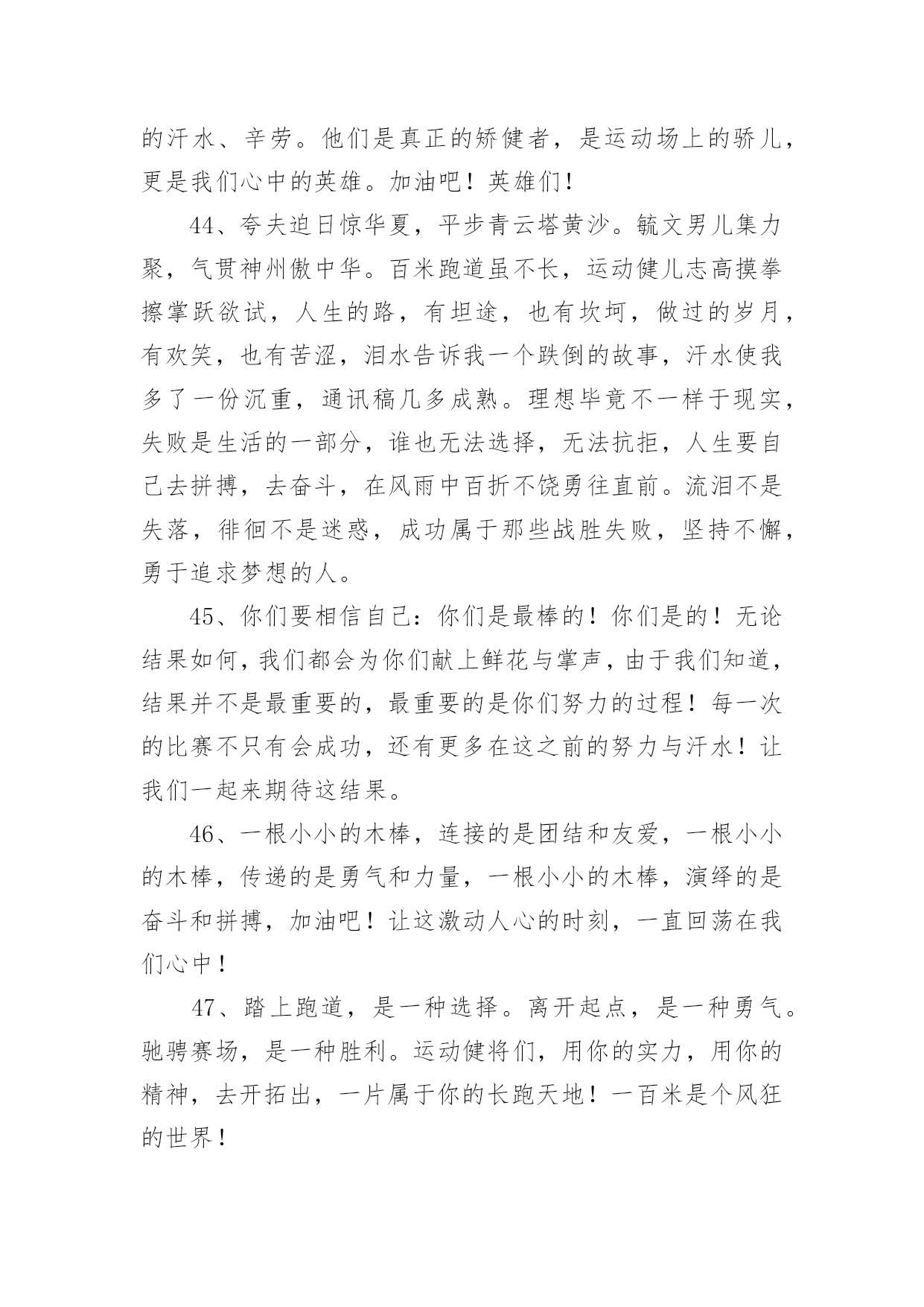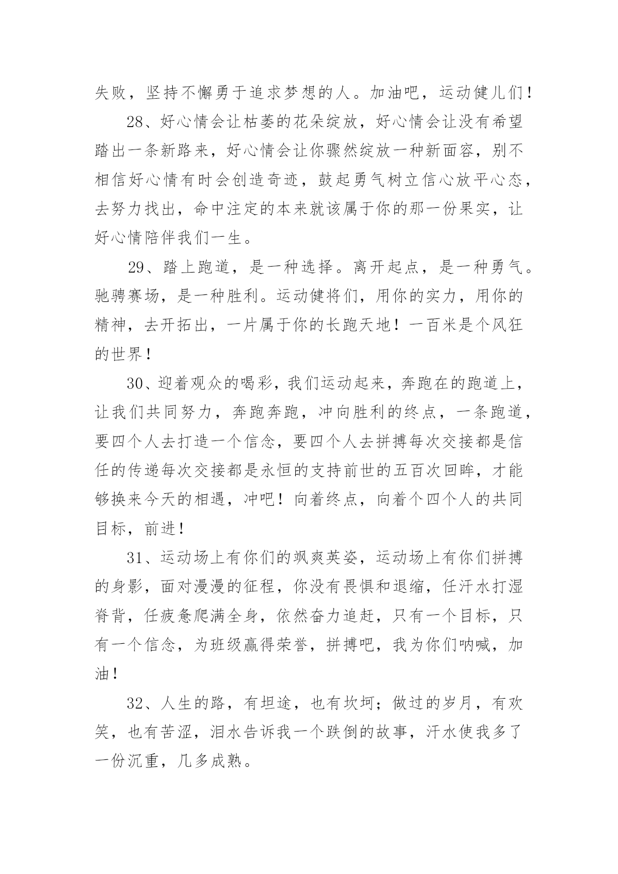 高中运动会加油稿【必备】高中运动会加油稿随着社会不断地进步,越来越多地方需要用到加油稿,借助加油稿可以激励他人的士气。相信写加油稿是一个让许多人都头痛的问题,以下是小编收集整理的高中运动会加油稿,希望对大家有所帮助。1、轰轰烈烈地投身于运动会中,无论是竭尽全力地冲刺,还是声嘶力竭地呐喊,无论感到欣慰满足成就感,或是自豪钦佩崇拜,都是一种体能的释放,一种心灵的洗礼。2、每一份辛劳都有一份收获,每一次的痛苦都是快乐的开始,没一声呐喊都是力量的呼唤。我们有着大浪拍岸的豪迈,所以你不必在乎小荷初露的恬静,我们有着春日的阳光明媚,所以不用去羡慕冬日乱玉碎琼,我们是雨天的一把伞,是寒冷冬日里的一盆碳火,温暖的不只是你我,而是大家的心。运动场上的健儿,掌声属于你们,鲜花属于你们,成功也是属于你们!3、亲爱的班健儿们,你们要充满自信。比赛中没有挡风的墙,没有遮风的伞,也没有撑船的帆,更没有拉船的纤。事在人为,人定胜天。原你们养精蓄锐,对充满爱意的世界说:“我自信,我拼搏,我会赢。4、真的,人生要是能有一个草稿,能再誊写一次,那该多好!我们会绝对认真地叙写自己的人生,也许不必须比别人写得更好,但肯定要比自己第一次写得漂亮。或许,人生不可能像自己想象的那样完美,一生的路也不可能都是平坦的,人的情绪也不会永远静如止水。5、是体育场上游走的火焰,是来去不息的脚步,是风中飞舞的树叶折射的金色光芒,藉此,可以诠释运动员兴奋的脸庞。那轻盈的步伐似飞鸟的翅膀,那清脆的枪声响彻天际,它粲然升起那跃动的渴望,起跑、加速、超越、冲刺,一步一步延向胜利的曙光。那是力的比拼,素质的较量,是石榴树上,跃动的心脏。6、面对艰苦的征程,你们毫不畏惧,接力棒在你们手中传递着集体的力量,听,我们在为你呐喊,你们诠释着奥运的精神,你们是我们心中的骄傲,深深的呼吸,等待你的是艰难的800米。相信胜利会属于你们,但在这征途上,需要你勇敢的心去面对。我们在为你加油,你是否听到了我们发自内心的呐喊,困难和胜利都在向你招手,去呀,不要犹豫,快去击败困难,快去夺取胜利,相信你会送给我们一个汗水浸湿的微笑。7、我们班可爱的“梁老大”“吴宝鸡”,我们会在身后默默支持你的!会永远记住你们标志性的动作的,无二,那将会是运动场上的亮点!8、真心祝愿机会是什么?是不可错过的刹那间。呐喊是什么?是为那刹那间的真心祝愿。加油!加油!你肯定听到了那一声声呐喊,你肯定看到了那双双期待的眼睛,你肯定感受到了那发自内心的祝愿!9、不为掌声的注释,不为刻意的征服,不为失败的痛苦,只有辛勤的汗水,化作成功的脚步!10、场上英姿显自豪,脚下步伐在飞奔。11、你们是骄傲。你们是自豪,跑道因你幻彩,面对红色跑道,你们挥洒自如,不惧一切冲向重点。12、在黑白相间的跑道上,留下了你们灿烂的身影。在枪响的那一刹那,似流星、似闪电,如骏马奔腾,如蛟龙腾空,如猛虎出洞,不在乎名次高低,不在乎成绩高下。努力拼搏,顽强奋斗,即使落后,也顽强不屈,永不退缩!13、人生如赛场,路途似跑道,在这秋高气爽的季节里,在这远离城市喧嚣的战地,所有的激情,都在那一阵阵呐喊声中凝结。所有的希望艘在呐喊声放飞了。所有的力量也在呐喊声中凝结了。14、在你脑中,有一个梦。要用努力为学院增添荣誉。茵茵运动场,谁是真的英雄?努力拼搏的你带给我们太多感动。忘记了累,也忘记了痛,背起期望中的终点。用我们的呐喊唤起你的动力,祝福每个运动员都赛出成绩。把握竞赛中的每一秒钟,和全体同学共同努力。不经历拼搏,怎么见彩虹。没有谁能随随便便成功。努力吧,健儿们,拼搏吧,勇士们!15、理想毕竟不同于现实,失败是生活的一部分,谁也无法选择,无法拒绝。人生要自己去拼搏,去奋斗,在风雨中百折不挠勇往前进,在集资的每个驿站上都留下一段不悔的回忆。流泪不是失落,徘徊不是迷惑,成功属于那些战胜失败,坚持不懈、勇于追求梦想的人。加油吧,运动健儿们!16、今天的你们英姿飒爽,今天的你们朝气蓬勃,今天的你们一马当先。相信自己,你是最棒的!不要放弃,不要气馁。成功永远属于你们。100米运动员啊!加油啊!17、大海如此的浩淼,鼓声多么美妙,运动员们,你们不再像平时那样渺小,我们默默的祈祷,以你们为骄傲,我们会永远为你们叫好!18、环形跑道上的坚持,毅力与精神活跃在会场上,湿透的衣衫,满头的大汗,无限追求,奋力追赶,我们为你欢呼跳跃,我们为你骄傲!19、看!运动场上那一幕幕,一股股,无论是哭是笑,市喜是悲,其中都融入了他们的汗水、辛劳。他们是真正的矫健者,是运动场上的骄儿,更是我们心中的英雄。加油吧!英雄们!20、你的汗水洒在跑道,浇灌着成功的花朵开放。你的欢笑飞扬在赛场,为班争光数你最棒。跑吧,追吧!在这广阔的赛场上,你似骏马似离铉的箭。跑吧,追吧你比虎猛比豹强!21、超越对手,超越自我,是我们的目
