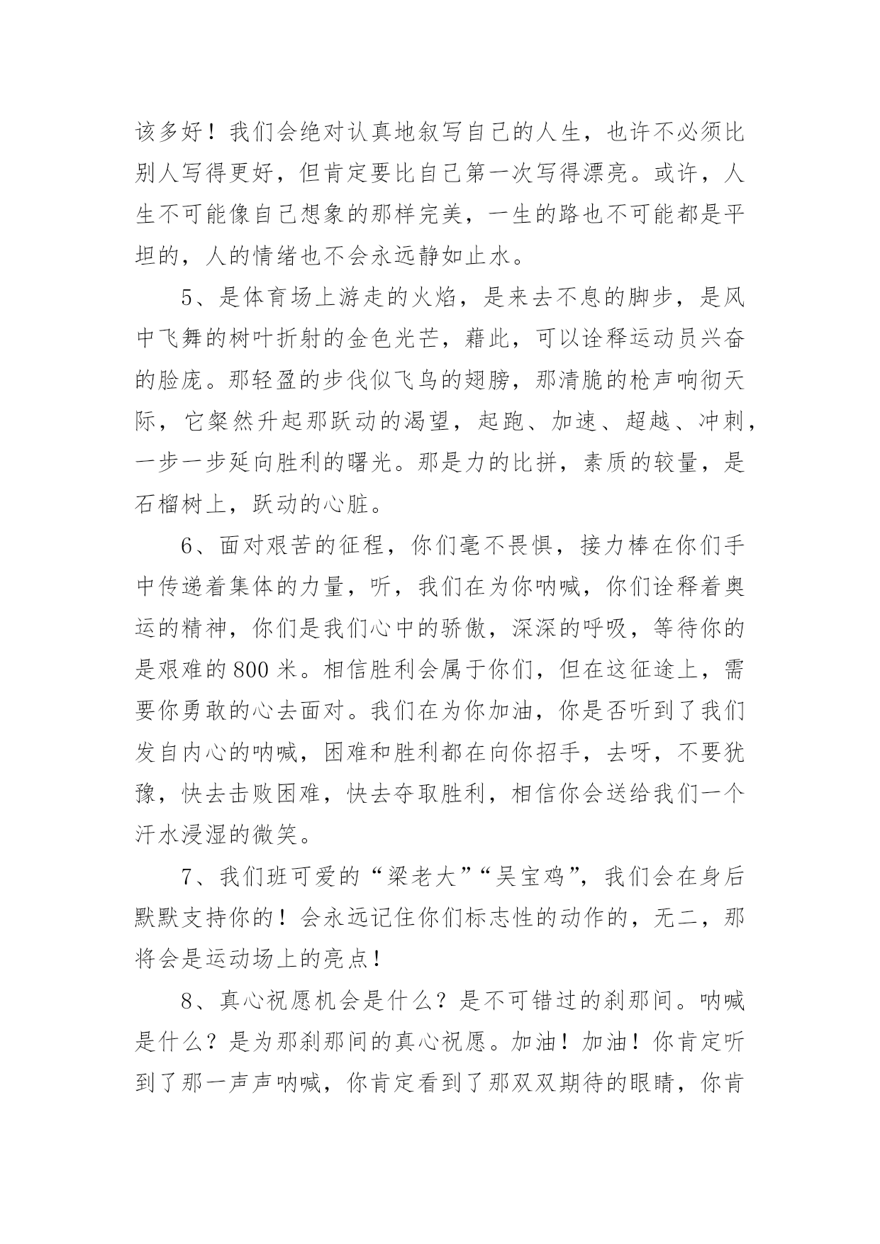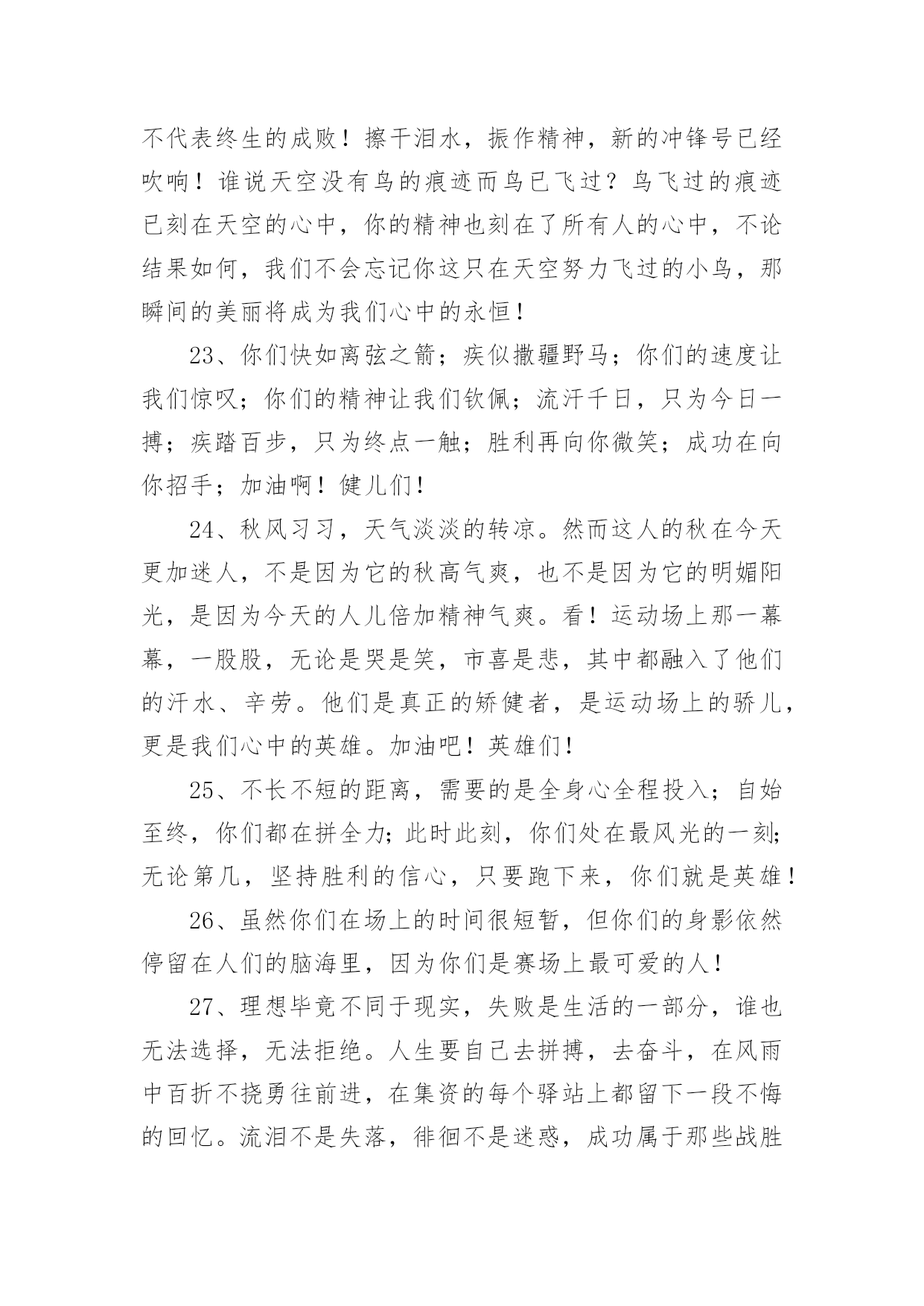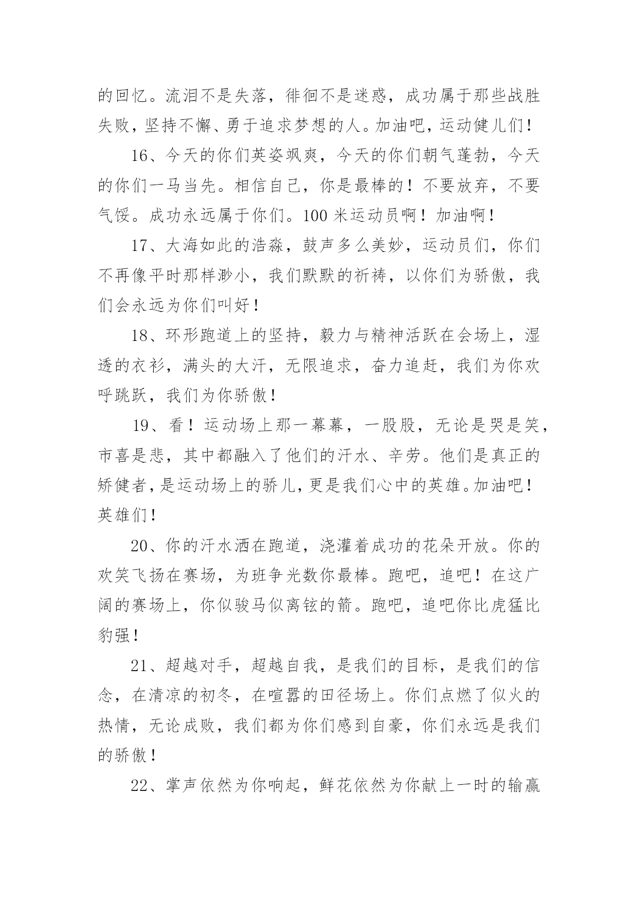 高中运动会加油稿【必备】高中运动会加油稿随着社会不断地进步,越来越多地方需要用到加油稿,借助加油稿可以激励他人的士气。相信写加油稿是一个让许多人都头痛的问题,以下是小编收集整理的高中运动会加油稿,希望对大家有所帮助。1、轰轰烈烈地投身于运动会中,无论是竭尽全力地冲刺,还是声嘶力竭地呐喊,无论感到欣慰满足成就感,或是自豪钦佩崇拜,都是一种体能的释放,一种心灵的洗礼。2、每一份辛劳都有一份收获,每一次的痛苦都是快乐的开始,没一声呐喊都是力量的呼唤。我们有着大浪拍岸的豪迈,所以你不必在乎小荷初露的恬静,我们有着春日的阳光明媚,所以不用去羡慕冬日乱玉碎琼,我们是雨天的一把伞,是寒冷冬日里的一盆碳火,温暖的不只是你我,而是大家的心。运动场上的健儿,掌声属于你们,鲜花属于你们,成功也是属于你们!3、亲爱的班健儿们,你们要充满自信。比赛中没有挡风的墙,没有遮风的伞,也没有撑船的帆,更没有拉船的纤。事在人为,人定胜天。原你们养精蓄锐,对充满爱意的世界说:“我自信,我拼搏,我会赢。4、真的,人生要是能有一个草稿,能再誊写一次,那该多好!我们会绝对认真地叙写自己的人生,也许不必须比别人写得更好,但肯定要比自己第一次写得漂亮。或许,人生不可能像自己想象的那样完美,一生的路也不可能都是平坦的,人的情绪也不会永远静如止水。5、是体育场上游走的火焰,是来去不息的脚步,是风中飞舞的树叶折射的金色光芒,藉此,可以诠释运动员兴奋的脸庞。那轻盈的步伐似飞鸟的翅膀,那清脆的枪声响彻天际,它粲然升起那跃动的渴望,起跑、加速、超越、冲刺,一步一步延向胜利的曙光。那是力的比拼,素质的较量,是石榴树上,跃动的心脏。6、面对艰苦的征程,你们毫不畏惧,接力棒在你们手中传递着集体的力量,听,我们在为你呐喊,你们诠释着奥运的精神,你们是我们心中的骄傲,深深的呼吸,等待你的是艰难的800米。相信胜利会属于你们,但在这征途上,需要你勇敢的心去面对。我们在为你加油,你是否听到了我们发自内心的呐喊,困难和胜利都在向你招手,去呀,不要犹豫,快去击败困难,快去夺取胜利,相信你会送给我们一个汗水浸湿的微笑。7、我们班可爱的“梁老大”“吴宝鸡”,我们会在身后默默支持你的!会永远记住你们标志性的动作的,无二,那将会是运动场上的亮点!8、真心祝愿机会是什么?是不可错过的刹那间。呐喊是什么?是为那刹那间的真心祝愿。加油!加油!你肯定听到了那一声声呐喊,你肯定看到了那双双期待的眼睛,你肯定感受到了那发自内心的祝愿!9、不为掌声的注释,不为刻意的征服,不为失败的痛苦,只有辛勤的汗水,化作成功的脚步!10、场上英姿显自豪,脚下步伐在飞奔。11、你们是骄傲。你们是自豪,跑道因你幻彩,面对红色跑道,你们挥洒自如,不惧一切冲向重点。12、在黑白相间的跑道上,留下了你们灿烂的身影。在枪响的那一刹那,似流星、似闪电,如骏马奔腾,如蛟龙腾空,如猛虎出洞,不在乎名次高低,不在乎成绩高下。努力拼搏,顽强奋斗,即使落后,也顽强不屈,永不退缩!13、人生如赛场,路途似跑道,在这秋高气爽的季节里,在这远离城市喧嚣的战地,所有的激情,都在那一阵阵呐喊声中凝结。所有的希望艘在呐喊声放飞了。所有的力量也在呐喊声中凝结了。14、在你脑中,有一个梦。要用努力为学院增添荣誉。茵茵运动场,谁是真的英雄?努力拼搏的你带给我们太多感动。忘记了累,也忘记了痛,背起期望中的终点。用我们的呐喊唤起你的动力,祝福每个运动员都赛出成绩。把握竞赛中的每一秒钟,和全体同学共同努力。不经历拼搏,怎么见彩虹。没有谁能随随便便成功。努力吧,健儿们,拼搏吧,勇士们!15、理想毕竟不同于现实,失败是生活的一部分,谁也无法选择,无法拒绝。人生要自己去拼搏,去奋斗,在风雨中百折不挠勇往前进,在集资的每个驿站上都留下一段不悔的回忆。流泪不是失落,徘徊不是迷惑,成功属于那些战胜失败,坚持不懈、勇于追求梦想的人。加油吧,运动健儿们!16、今天的你们英姿飒爽,今天的你们朝气蓬勃,今天的你们一马当先。相信自己,你是最棒的!不要放弃,不要气馁。成功永远属于你们。100米运动员啊!加油啊!17、大海如此的浩淼,鼓声多么美妙,运动员们,你们不再像平时那样渺小,我们默默的祈祷,以你们为骄傲,我们会永远为你们叫好!18、环形跑道上的坚持,毅力与精神活跃在会场上,湿透的衣衫,满头的大汗,无限追求,奋力追赶,我们为你欢呼跳跃,我们为你骄傲!19、看!运动场上那一幕幕,一股股,无论是哭是笑,市喜是悲,其中都融入了他们的汗水、辛劳。他们是真正的矫健者,是运动场上的骄儿,更是我们心中的英雄。加油吧!英雄们!20、你的汗水洒在跑道,浇灌着成功的花朵开放。你的欢笑飞扬在赛场,为班争光数你最棒。跑吧,追吧!在这广阔的赛场上,你似骏马似离铉的箭。跑吧,追吧你比虎猛比豹强!21、超越对手,超越自我,是我们的目