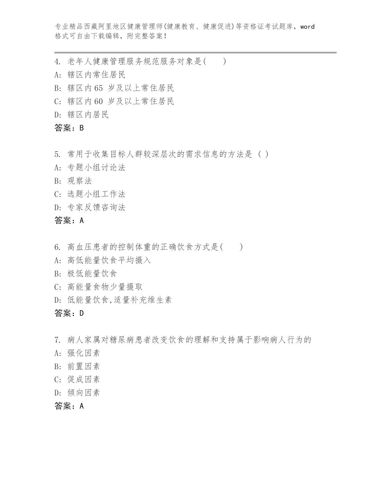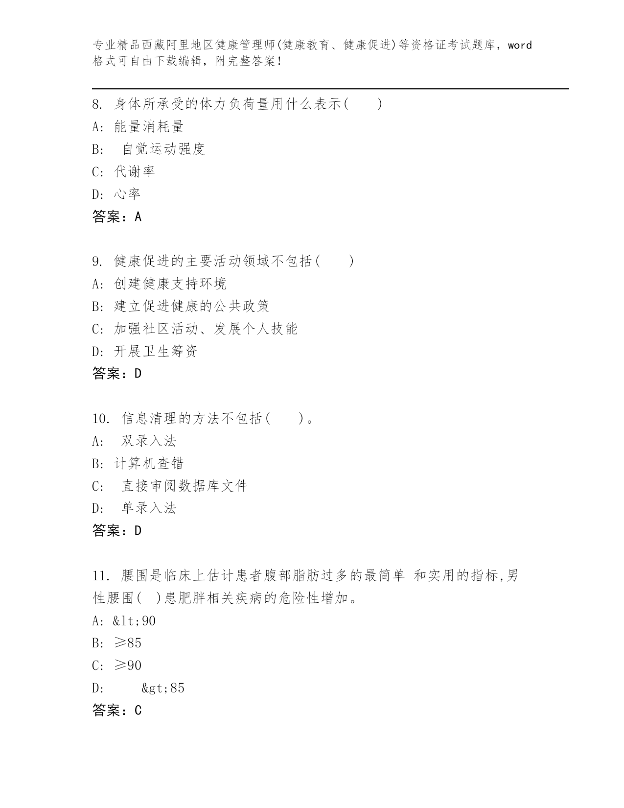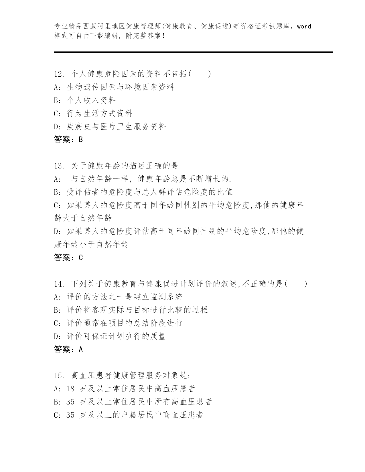 内部培训西藏阿里地区健康管理师(健康教育、健康促进)等资格证考试内部题库附答案(达标题)