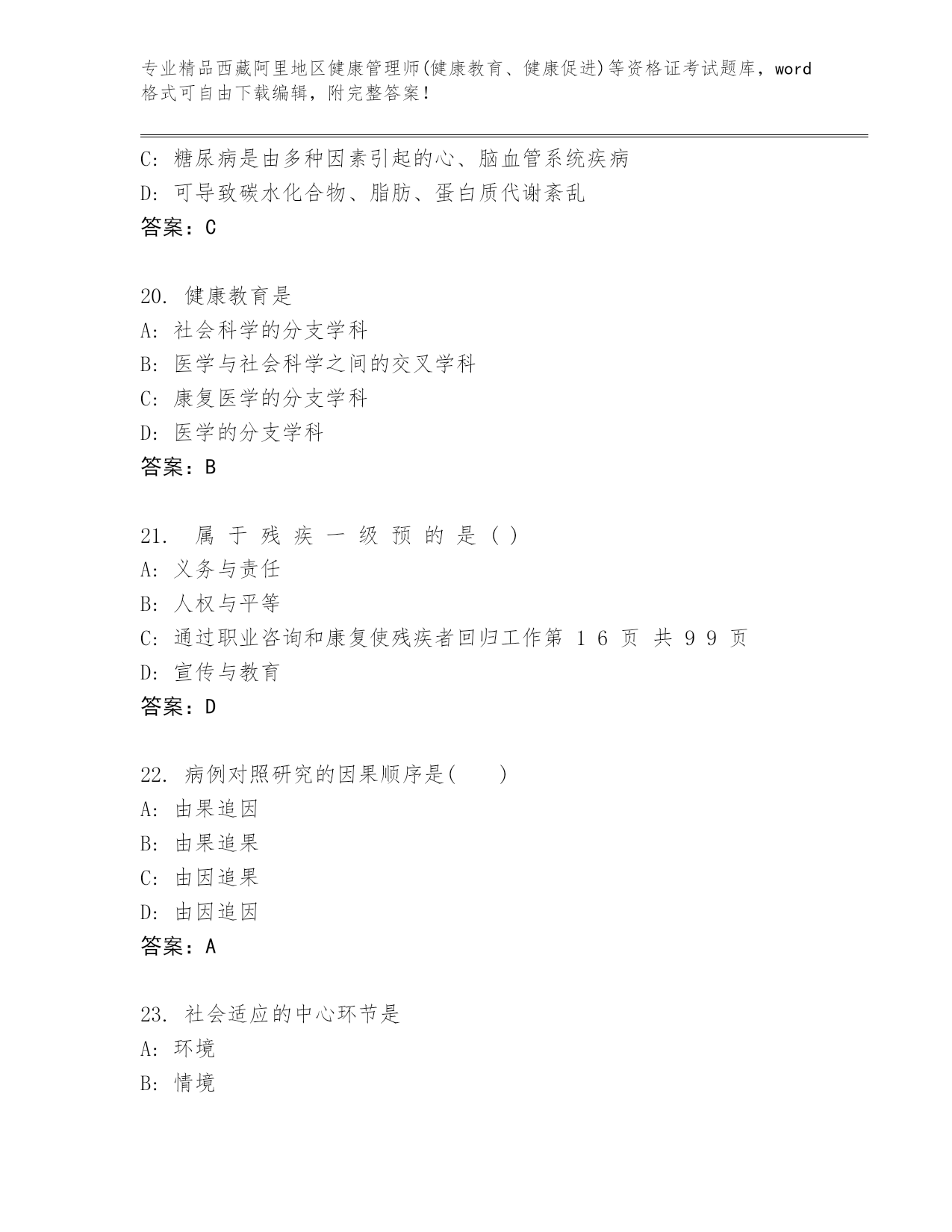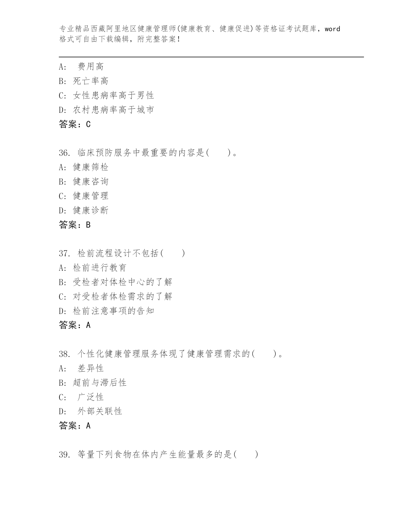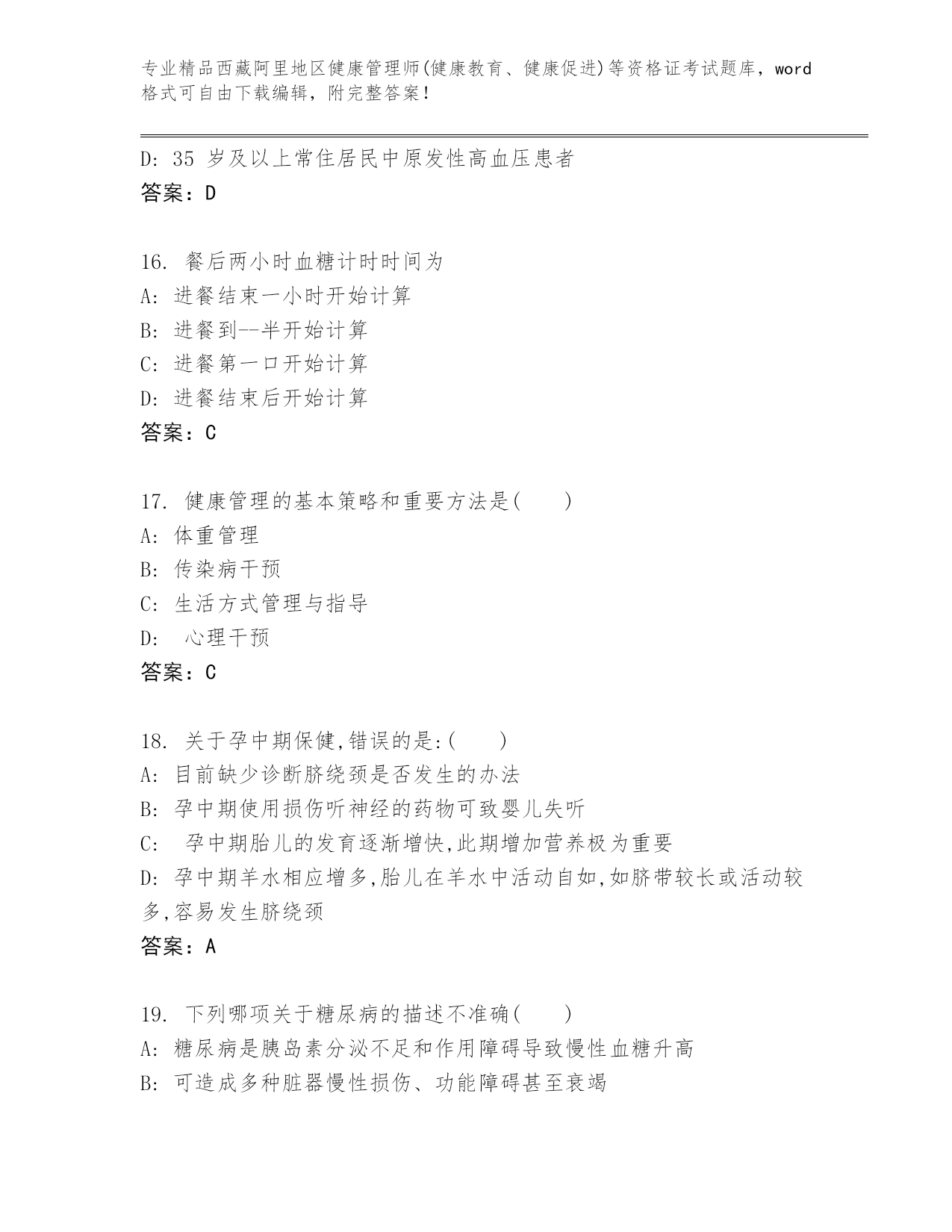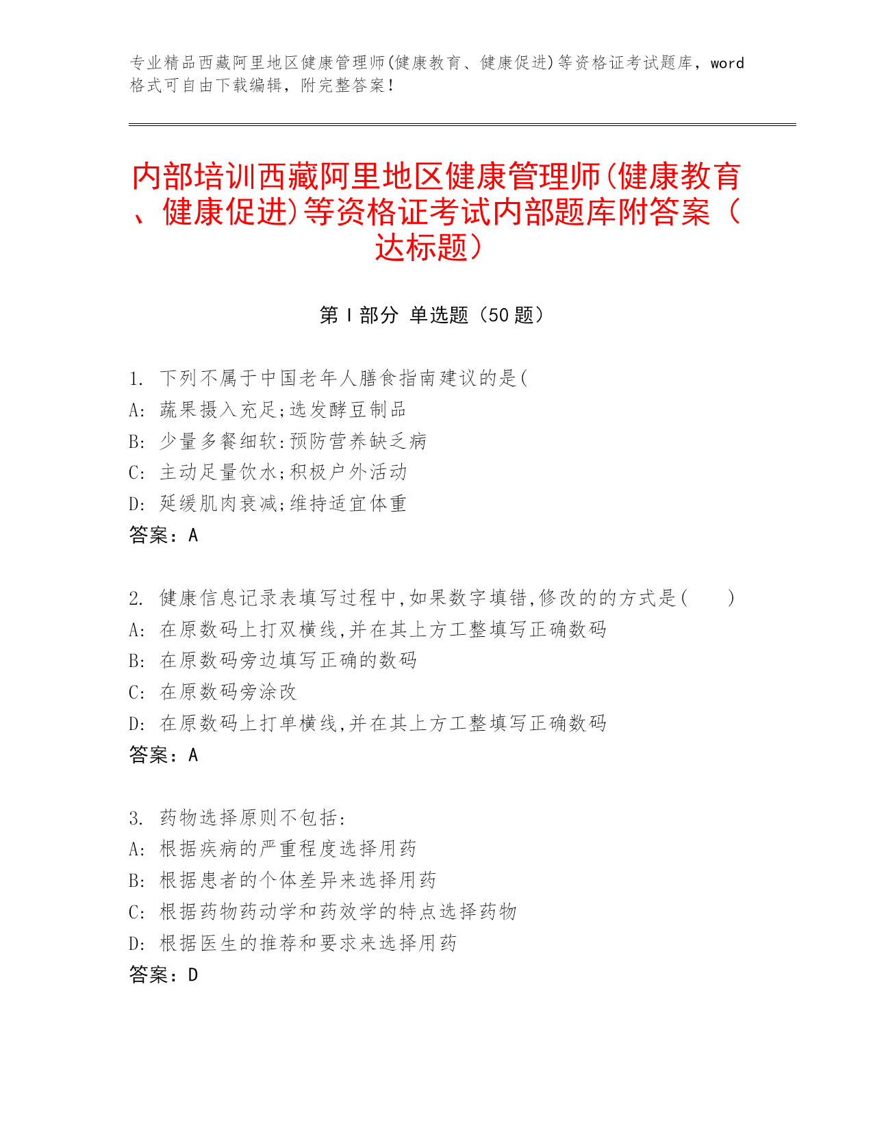 内部培训西藏阿里地区健康管理师(健康教育、健康促进)等资格证考试内部题库附答案(达标题)