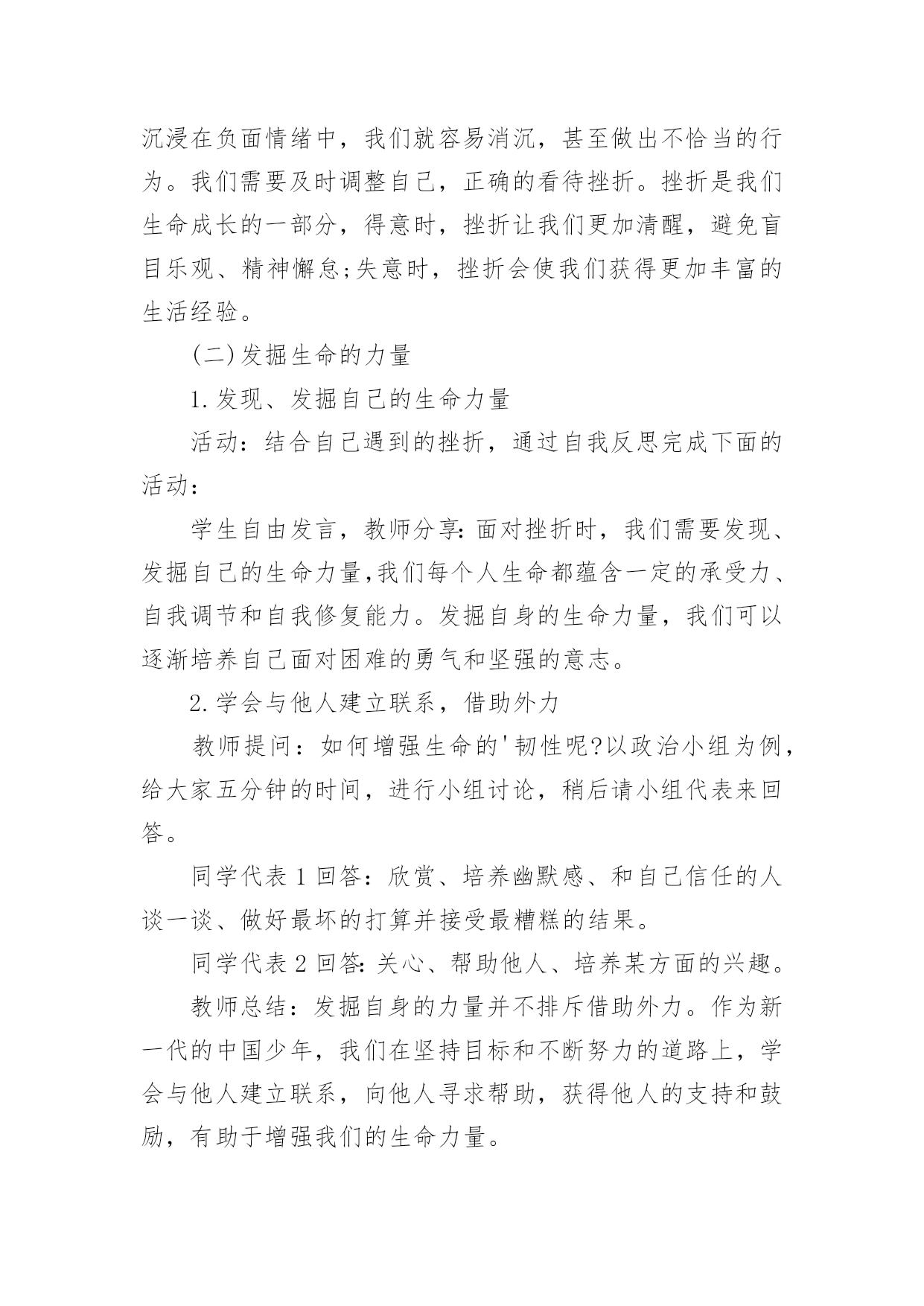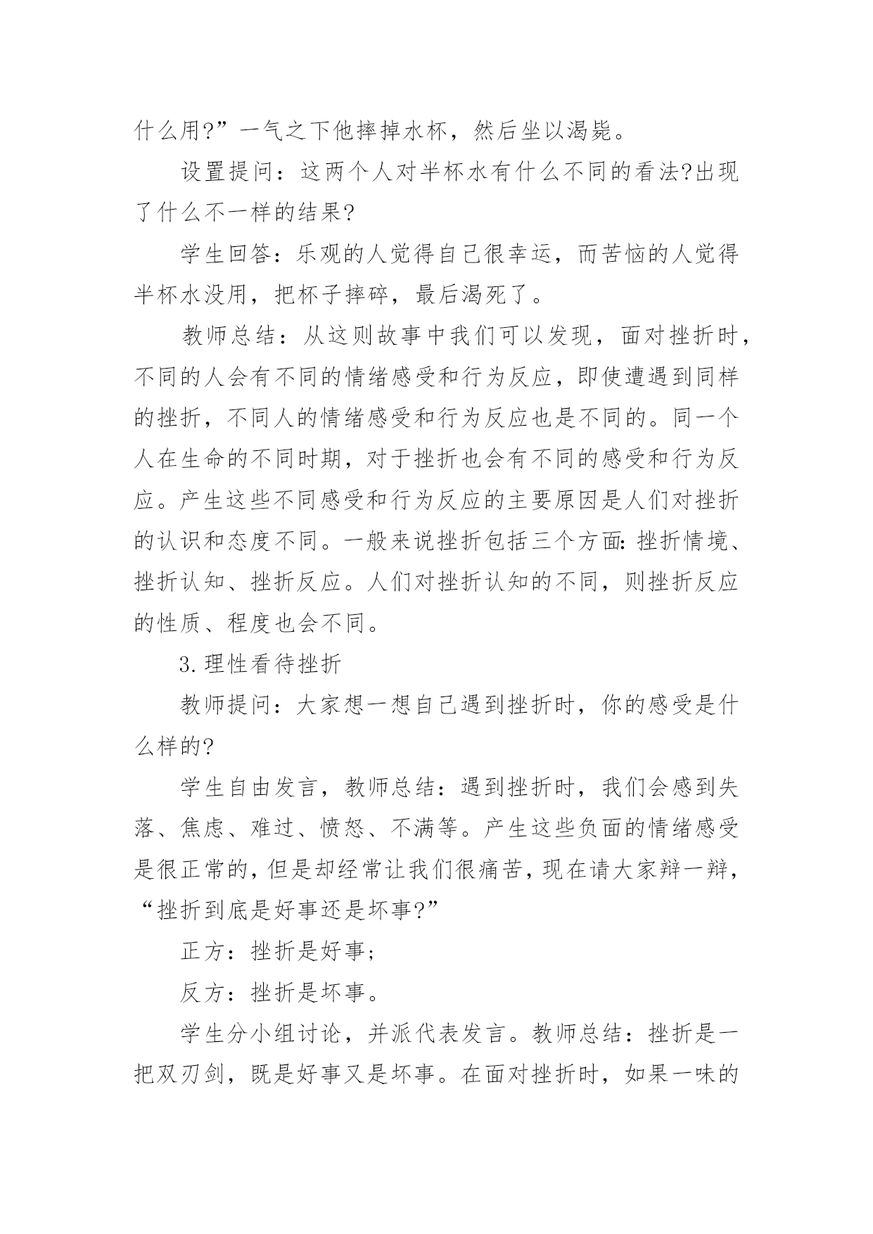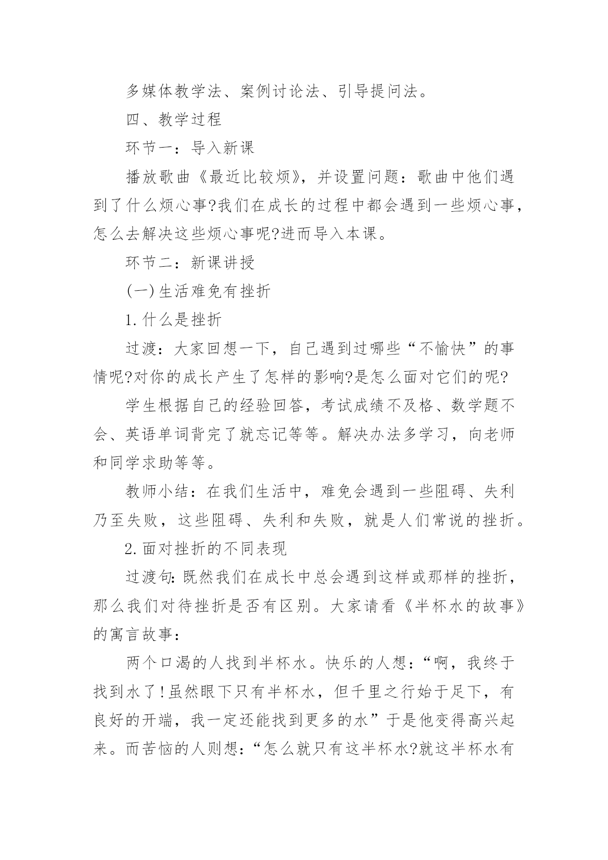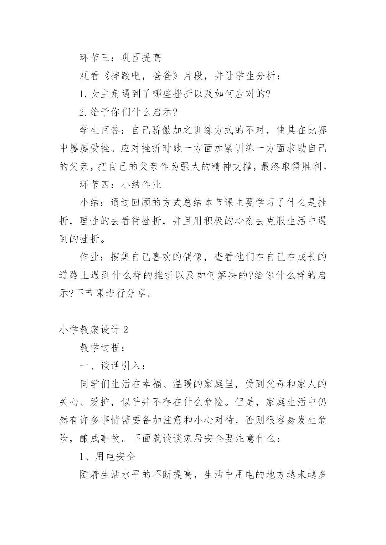 小学教案设计作为一位杰出的老师,总归要编写教案,借助教案可以有效提升自己的教学能力。教案应该怎么写呢?以下是小编精心整理的小学教案设计,希望对大家有所帮助。小学教案设计1一、教学目标【情感态度价值观目标】理性分析成长道路上的挫折,树立正确的挫折观,养成勇于克服困难,战胜挫折的优良品质。【能力目标】理性看待挫折,正确处理挫折的能力。【知识目标】1.理解什么是挫折;2.理解挫折的两面性;3.正确处理生活中的挫折。二、教学重难点【重点】1.理解挫折的两面性;2.正确处理生活中的挫折。【难点】理性对待挫折,正确面对挫折。三、教学方法多媒体教学法、案例讨论法、引导提问法。四、教学过程环节一:导入新课播放歌曲《最近比较烦》,并设置问题:歌曲中他们遇到了什么烦心事?我们在成长的过程中都会遇到一些烦心事,怎么去解决这些烦心事呢?进而导入本课。环节二:新课讲授(一)生活难免有挫折1.什么是挫折过渡:大家回想一下,自己遇到过哪些“不愉快”的事情呢?对你的成长产生了怎样的影响?是怎么面对它们的呢?学生根据自己的经验回答,考试成绩不及格、数学题不会、英语单词背完了就忘记等等。解决办法多学习,向老师和同学求助等等。教师小结:在我们生活中,难免会遇到一些阻碍、失利乃至失败,这些阻碍、失利和失败,就是人们常说的挫折。2.面对挫折的不同表现过渡句:既然我们在成长中总会遇到这样或那样的挫折,那么我们对待挫折是否有区别。大家请看《半杯水的故事》的寓言故事:两个口渴的人找到半杯水。快乐的人想:“啊,我终于找到水了!虽然眼下只有半杯水,但千里之行始于足下,有良好的开端,我一定还能找到更多的水”于是他变得高兴起来。而苦恼的人则想:“怎么就只有这半杯水?就这半杯水有什么用?”一气之下他摔掉水杯,然后坐以渴毙。设置提问:这两个人对半杯水有什么不同的看法?出现了什么不一样的结果?学生回答:乐观的人觉得自己很幸运,而苦恼的人觉得半杯水没用,把杯子摔碎,最后渴死了。教师总结:从这则故事中我们可以发现,面对挫折时,不同的人会有不同的情绪感受和行为反应,即使遭遇到同样的挫折,不同人的情绪感受和行为反应也是不同的。同一个人在生命的不同时期,对于挫折也会有不同的感受和行为反应。产生这些不同感受和行为反应的主要原因是人们对挫折的认识和态度不同。一般来说挫折包括三个方面:挫折情境、挫折认知、挫折反应。人们对挫折认知的不同,则挫折反应的性质、程度也会不同。3.理性看待挫折教师提问:大家想一想自己遇到挫折时,你的感受是什么样的?学生自由发言,教师总结:遇到挫折时,我们会感到失落、焦虑、难过、愤怒、不满等。产生这些负面的情绪感受是很正常的,但是却经常让我们很痛苦,现在请大家辩一辩,“挫折到底是好事还是坏事?”正方:挫折是好事;反方:挫折是坏事。学生分小组讨论,并派代表发言。教师总结:挫折是一把双刃剑,既是好事又是坏事。在面对挫折时,如果一味的沉浸在负面情绪中,我们就容易消沉,甚至做出不恰当的行为。我们需要及时调整自己,正确的看待挫折。挫折是我们生命成长的一部分,得意时,挫折让我们更加清醒,避免盲目乐观、精神懈怠;失意时,挫折会使我们获得更加丰富的生活经验。(二)发掘生命的力量1.发现、发掘自己的生命力量活动:结合自己遇到的挫折,通过自我反思完成下面的活动:学生自由发言,教师分享:面对挫折时,我们需要发现、发掘自己的生命力量,我们每个人生命都蕴含一定的承受力、自我调节和自我修复能力。发掘自身的生命力量,我们可以逐渐培养自己面对困难的勇气和坚强的意志。2.学会与他人建立联系,借助外力教师提问:如何增强生命的'韧性呢?以政治小组为例,给大家五分钟的时间,进行小组讨论,稍后请小组代表来回答。同学代表1回答:欣赏、培养幽默感、和自己信任的人谈一谈、做好最坏的打算并接受最糟糕的结果。同学代表2回答:关心、帮助他人、培养某方面的兴趣。教师总结:发掘自身的力量并不排斥借助外力。作为新一代的中国少年,我们在坚持目标和不断努力的道路上,学会与他人建立联系,向他人寻求帮助,获得他人的支持和鼓励,有助于增强我们的生命力量。环节三:巩固提高观看《摔跤吧,爸爸》片段,并让学生分析:1.女主角遇到了哪些挫折以及如何应对的?2.给予你们什么启示?学生回答:自己骄傲加之训练方式的不对,使其在比赛中屡屡受挫。应对挫折时她一方面加紧训练一方面求助自己的父亲,把自己的父亲作为强大的精神支撑,最终取得胜利。环节四:小结作业小结:通过回顾的方式总结本节课主要学习了什么是挫折,理性的去看待挫折,并且用积极的心态去克服生活中遇到的挫折。作业:搜集自己喜欢的偶像,查看他们在自己在成长的道路上遇到什么样的挫折以及如何解决的?给你什么样的启示?下节课进行分享。小学教案设计2教学过程:一、谈话引入:同学们生活在幸福、温暖的家庭里,受到父母和家人的