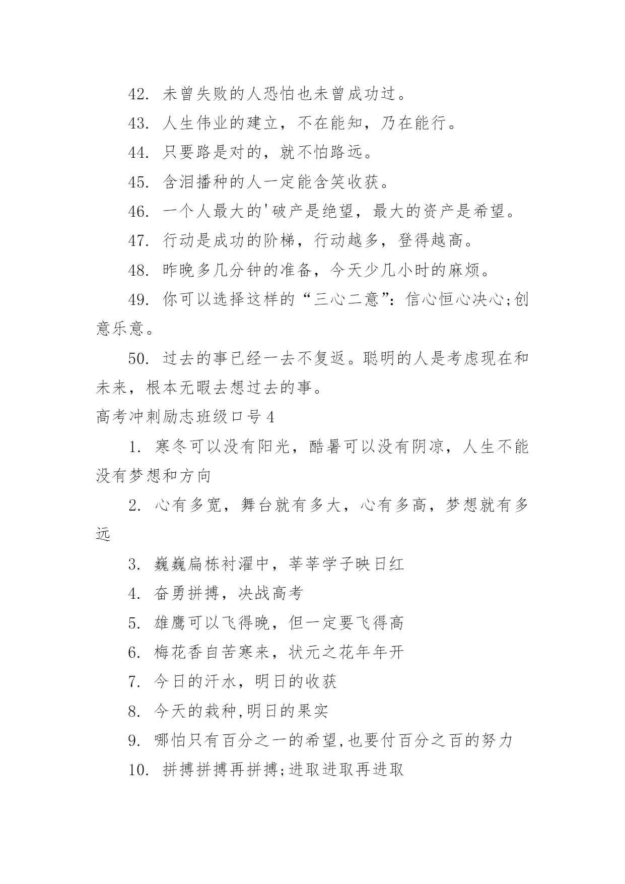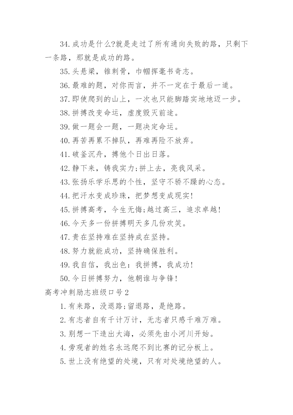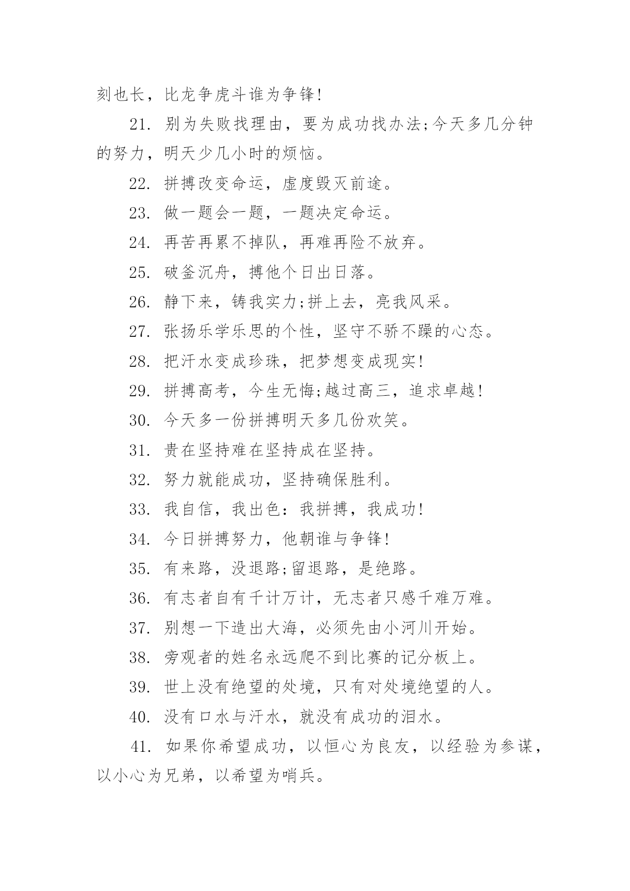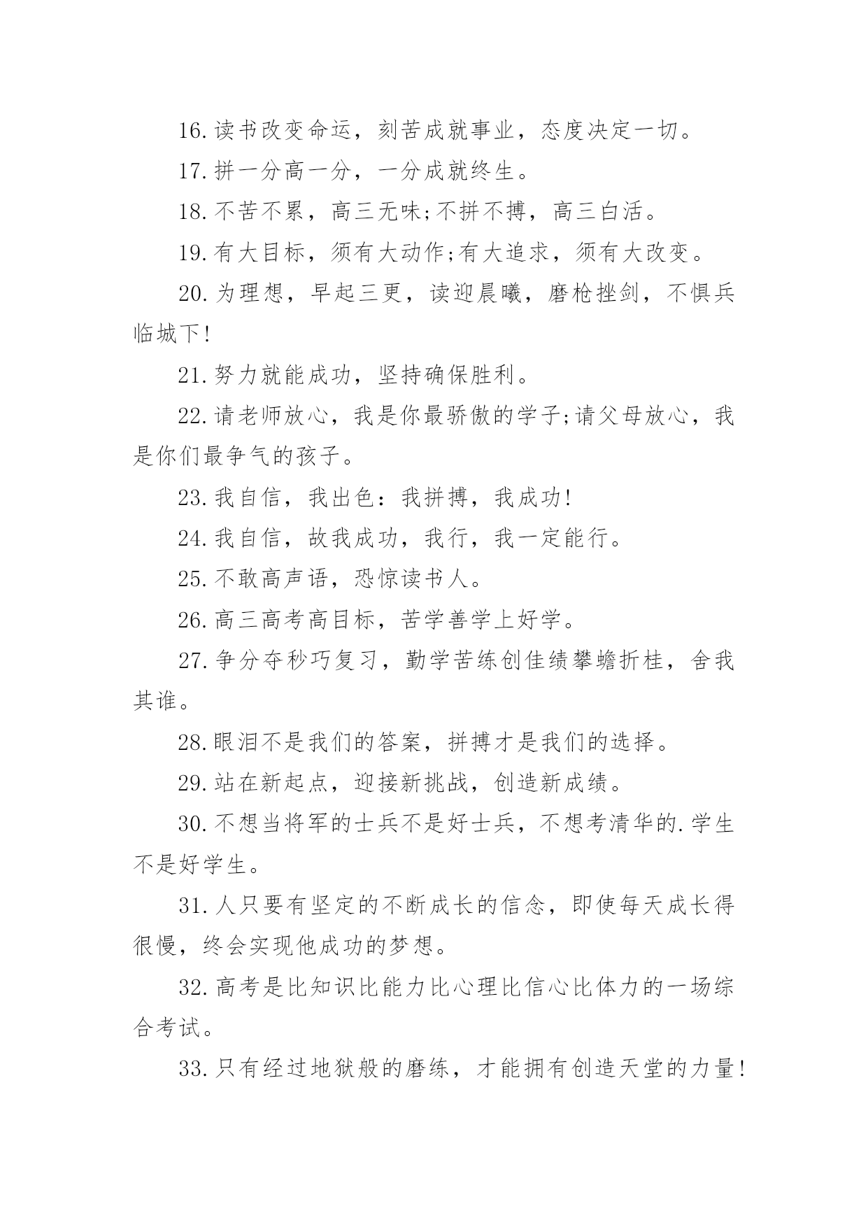 高考冲刺励志班级口号高考冲刺励志班级口号高考冲刺励志班级口号11.非学无以广才,非志无以成学。2.脚踏实地,心无旁骛,珍惜分分秒秒。紧跟老师,夯实基础。3.我努力,我坚持,我一定能成功!4.良辰美景惜时如金敢与金鸡争晨晖,书山学海甘之若饴誓同峨眉共比高。5.进更理想大学,铸更辉煌人生。须更刻苦的奋斗。6.灰心生失望,失望生动摇,动摇生失败。7.笑看人生峰高处,唯有磨难多正果。8.遇到会做的题:仔细;遇到不会做的题:冷静。9.把容易题作对,难题就会变容易。10.不求难题都做,先求中低档题不错。11.书越读越薄。学习“网络化”,“严密化”。12.保持平常心,营造好环境,扬起常笑脸,轻松迎高考。13.无才无以立足,不苦不能成才。14.回忆很美,尽管过程艰辛:也许结果总有遗憾,但我们无愧于心。15.因为我不能,所以一定要;因为一定要,所以一定能。16.读书改变命运,刻苦成就事业,态度决定一切。17.拼一分高一分,一分成就终生。18.不苦不累,高三无味;不拼不搏,高三白活。19.有大目标,须有大动作;有大追求,须有大改变。20.为理想,早起三更,读迎晨曦,磨枪挫剑,不惧兵临城下!21.努力就能成功,坚持确保胜利。22.请老师放心,我是你最骄傲的学子;请父母放心,我是你们最争气的孩子。23.我自信,我出色:我拼搏,我成功!24.我自信,故我成功,我行,我一定能行。25.不敢高声语,恐惊读书人。26.高三高考高目标,苦学善学上好学。27.争分夺秒巧复习,勤学苦练创佳绩攀蟾折桂,舍我其谁。28.眼泪不是我们的答案,拼搏才是我们的选择。29.站在新起点,迎接新挑战,创造新成绩。30.不想当将军的士兵不是好士兵,不想考清华的.学生不是好学生。31.人只要有坚定的不断成长的信念,即使每天成长得很慢,终会实现他成功的梦想。32.高考是比知识比能力比心理比信心比体力的一场综合考试。33.只有经过地狱般的磨练,才能拥有创造天堂的力量!34.成功是什么?就是走过了所有通向失败的路,只剩下一条路,那就是成功的路。35.头悬梁,锥刺骨,巾帼挥毫书奇志。36.最难的题,对你而言,并不一定在于最后一道。37.即使爬到的山上,一次也只能脚踏实地地迈一步。38.拼搏改变命运,虚度毁灭前途。39.做一题会一题,一题决定命运。40.再苦再累不掉队,再难再险不放弃。41.破釜沉舟,搏他个日出日落。42.静下来,铸我实力;拼上去,亮我风采。43.张扬乐学乐思的个性,坚守不骄不躁的心态。44.把汗水变成珍珠,把梦想变成现实!45.拼搏高考,今生无悔;越过高三,追求卓越!46.今天多一份拼搏明天多几份欢笑。47.贵在坚持难在坚持成在坚持。48.努力就能成功,坚持确保胜利。49.我自信,我出色:我拼搏,我成功!50.今日拼搏努力,他朝谁与争锋!高考冲刺励志班级口号21.有来路,没退路;留退路,是绝路。2.有志者自有千计万计,无志者只感千难万难。3.别想一下造出大海,必须先由小河川开始。4.旁观者的姓名永远爬不到比赛的记分板上。5.世上没有绝望的处境,只有对处境绝望的人。6.没有口水与汗水,就没有成功的泪水。7.如果你希望成功,以恒心为良友,以经验为参谋,以小心为兄弟,以希望为哨兵。8.未曾失败的人恐怕也未曾成功过。9.人生伟业的建立,不在能知,乃在能行。10.只要路是对的,就不怕路远。11.含泪播种的人一定能含笑收获。12.一个人的破产是绝望,的资产是希望。13.行动是成功的阶梯,行动越多,登得越高。14.昨晚多几分钟的准备,今天少几小时的麻烦。15.你可以选择这样的“三心二意”:信心恒心决心;创意乐意。16.过去的事已经一去不复返。聪明的人是考虑现在和未来,根本无暇去想过去的事。17.最重要的就是不要去看远方模糊的,而要做手边清楚的事。18.如果我们想要更多的玫瑰花,就必须种植更多的'玫瑰树。19.伟人所达到并保持着的高度,并不是一飞就到的,而是他们在同伴们都睡着的时候,一步步艰辛地向上攀爬着。20.失败是什么?没有什么,只是更走近成功一步;成功是什么?就是走过了所有通向失败的路,只剩下一条路,那就是成功的路。21.征服畏惧建立自信的最快最确实的方法,就是去做你害怕的事,直到你获得成功的经验。22.学习很辛苦,但并不痛苦;学习没有什么捷径,苦学才是根本;在你没有找到“不用重复就可以学习好”的方法之前,请不放弃“重复”这种最简单最有效的学习方法。23.机会从不会“失掉”,你失掉了,自有别人会得到。不要凡事在天,守株待兔,更不要寄希望于“机会”。机会只不过是相对于充分准备而又善于创造机会的人而言的。没有机会,就要创造机会;有了机会,就要巧妙地抓住机会,而高考就是你走上成功之路的第一个机会。24.热爱可以创造奇迹。如果我们热爱登山,我们可以不顾旅途的危险与劳顿,勇往直前;如果我们热