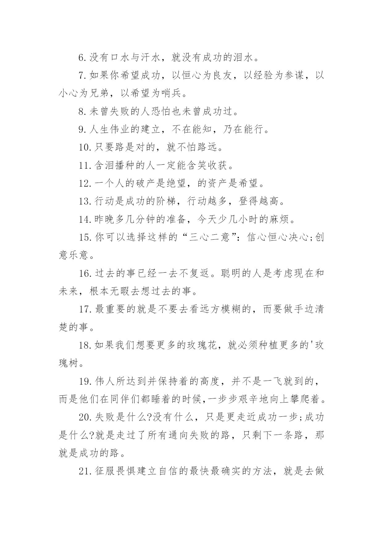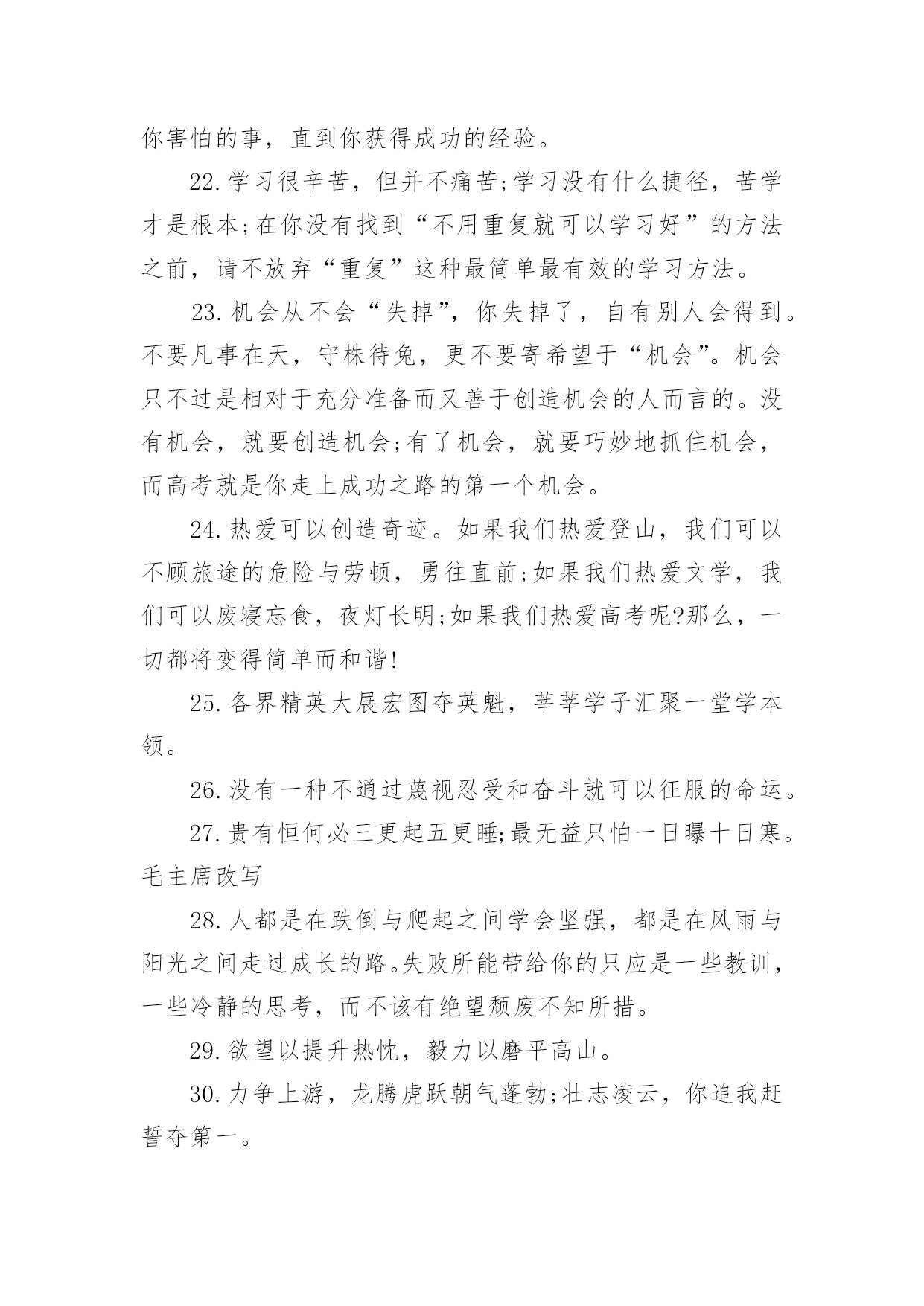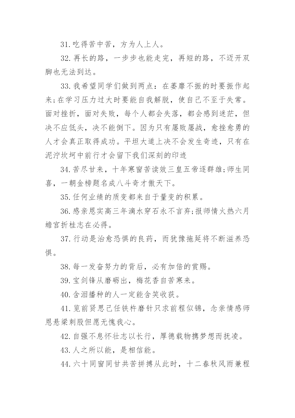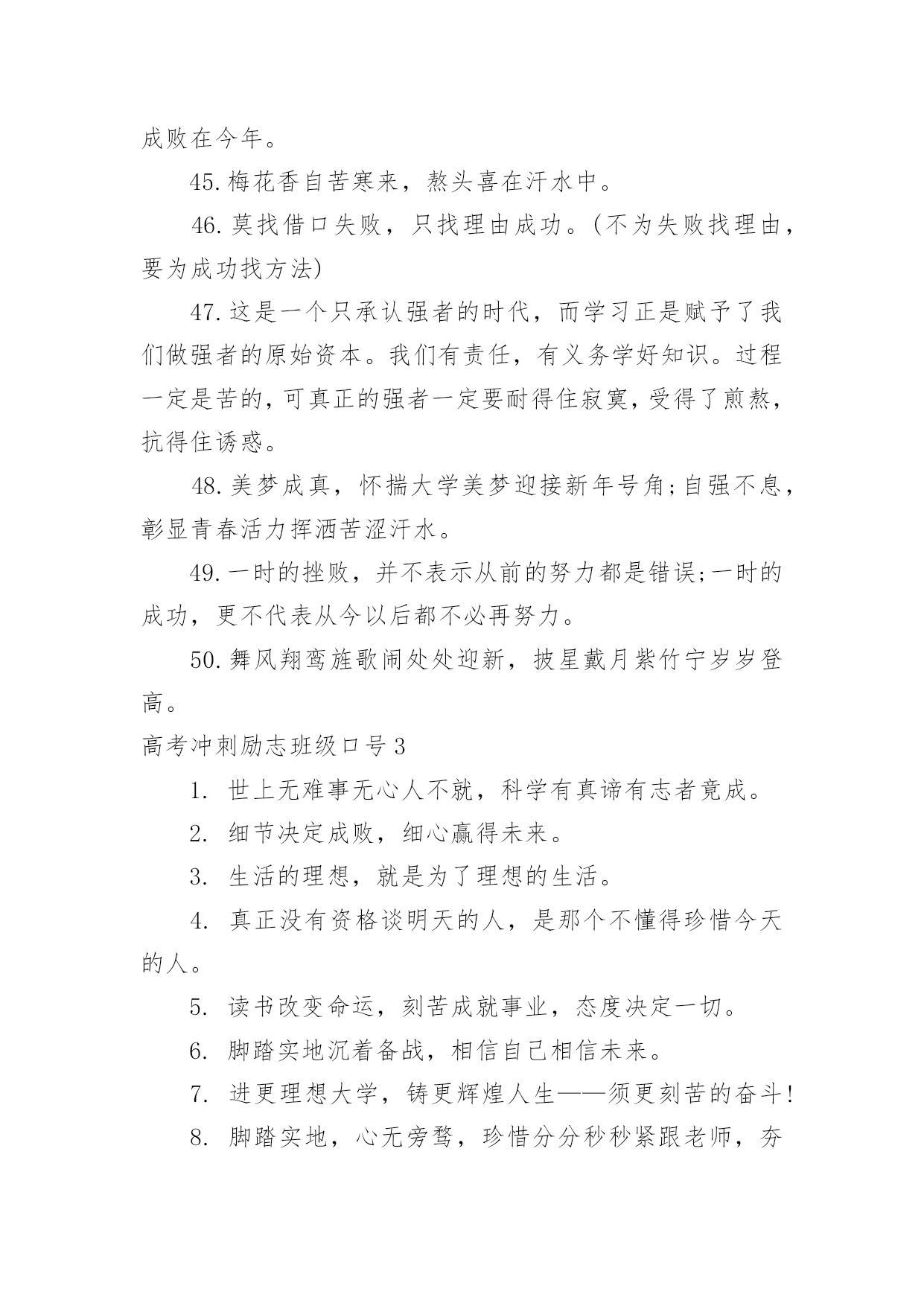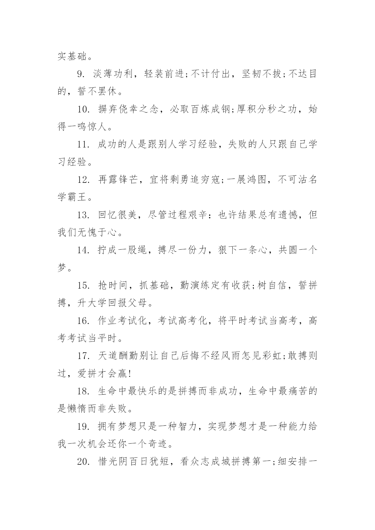 高考冲刺励志班级口号高考冲刺励志班级口号高考冲刺励志班级口号11.非学无以广才,非志无以成学。2.脚踏实地,心无旁骛,珍惜分分秒秒。紧跟老师,夯实基础。3.我努力,我坚持,我一定能成功!4.良辰美景惜时如金敢与金鸡争晨晖,书山学海甘之若饴誓同峨眉共比高。5.进更理想大学,铸更辉煌人生。须更刻苦的奋斗。6.灰心生失望,失望生动摇,动摇生失败。7.笑看人生峰高处,唯有磨难多正果。8.遇到会做的题:仔细;遇到不会做的题:冷静。9.把容易题作对,难题就会变容易。10.不求难题都做,先求中低档题不错。11.书越读越薄。学习“网络化”,“严密化”。12.保持平常心,营造好环境,扬起常笑脸,轻松迎高考。13.无才无以立足,不苦不能成才。14.回忆很美,尽管过程艰辛:也许结果总有遗憾,但我们无愧于心。15.因为我不能,所以一定要;因为一定要,所以一定能。16.读书改变命运,刻苦成就事业,态度决定一切。17.拼一分高一分,一分成就终生。18.不苦不累,高三无味;不拼不搏,高三白活。19.有大目标,须有大动作;有大追求,须有大改变。20.为理想,早起三更,读迎晨曦,磨枪挫剑,不惧兵临城下!21.努力就能成功,坚持确保胜利。22.请老师放心,我是你最骄傲的学子;请父母放心,我是你们最争气的孩子。23.我自信,我出色:我拼搏,我成功!24.我自信,故我成功,我行,我一定能行。25.不敢高声语,恐惊读书人。26.高三高考高目标,苦学善学上好学。27.争分夺秒巧复习,勤学苦练创佳绩攀蟾折桂,舍我其谁。28.眼泪不是我们的答案,拼搏才是我们的选择。29.站在新起点,迎接新挑战,创造新成绩。30.不想当将军的士兵不是好士兵,不想考清华的.学生不是好学生。31.人只要有坚定的不断成长的信念,即使每天成长得很慢,终会实现他成功的梦想。32.高考是比知识比能力比心理比信心比体力的一场综合考试。33.只有经过地狱般的磨练,才能拥有创造天堂的力量!34.成功是什么?就是走过了所有通向失败的路,只剩下一条路,那就是成功的路。35.头悬梁,锥刺骨,巾帼挥毫书奇志。36.最难的题,对你而言,并不一定在于最后一道。37.即使爬到的山上,一次也只能脚踏实地地迈一步。38.拼搏改变命运,虚度毁灭前途。39.做一题会一题,一题决定命运。40.再苦再累不掉队,再难再险不放弃。41.破釜沉舟,搏他个日出日落。42.静下来,铸我实力;拼上去,亮我风采。43.张扬乐学乐思的个性,坚守不骄不躁的心态。44.把汗水变成珍珠,把梦想变成现实!45.拼搏高考,今生无悔;越过高三,追求卓越!46.今天多一份拼搏明天多几份欢笑。47.贵在坚持难在坚持成在坚持。48.努力就能成功,坚持确保胜利。49.我自信,我出色:我拼搏,我成功!50.今日拼搏努力,他朝谁与争锋!高考冲刺励志班级口号21.有来路,没退路;留退路,是绝路。2.有志者自有千计万计,无志者只感千难万难。3.别想一下造出大海,必须先由小河川开始。4.旁观者的姓名永远爬不到比赛的记分板上。5.世上没有绝望的处境,只有对处境绝望的人。6.没有口水与汗水,就没有成功的泪水。7.如果你希望成功,以恒心为良友,以经验为参谋,以小心为兄弟,以希望为哨兵。8.未曾失败的人恐怕也未曾成功过。9.人生伟业的建立,不在能知,乃在能行。10.只要路是对的,就不怕路远。11.含泪播种的人一定能含笑收获。12.一个人的破产是绝望,的资产是希望。13.行动是成功的阶梯,行动越多,登得越高。14.昨晚多几分钟的准备,今天少几小时的麻烦。15.你可以选择这样的“三心二意”:信心恒心决心;创意乐意。16.过去的事已经一去不复返。聪明的人是考虑现在和未来,根本无暇去想过去的事。17.最重要的就是不要去看远方模糊的,而要做手边清楚的事。18.如果我们想要更多的玫瑰花,就必须种植更多的'玫瑰树。19.伟人所达到并保持着的高度,并不是一飞就到的,而是他们在同伴们都睡着的时候,一步步艰辛地向上攀爬着。20.失败是什么?没有什么,只是更走近成功一步;成功是什么?就是走过了所有通向失败的路,只剩下一条路,那就是成功的路。21.征服畏惧建立自信的最快最确实的方法,就是去做你害怕的事,直到你获得成功的经验。22.学习很辛苦,但并不痛苦;学习没有什么捷径,苦学才是根本;在你没有找到“不用重复就可以学习好”的方法之前,请不放弃“重复”这种最简单最有效的学习方法。23.机会从不会“失掉”,你失掉了,自有别人会得到。不要凡事在天,守株待兔,更不要寄希望于“机会”。机会只不过是相对于充分准备而又善于创造机会的人而言的。没有机会,就要创造机会;有了机会,就要巧妙地抓住机会,而高考就是你走上成功之路的第一个机会。24.热爱可以创造奇迹。如果我们热爱登山,我们可以不顾旅途的危险与劳顿,勇往直前;如果我们热