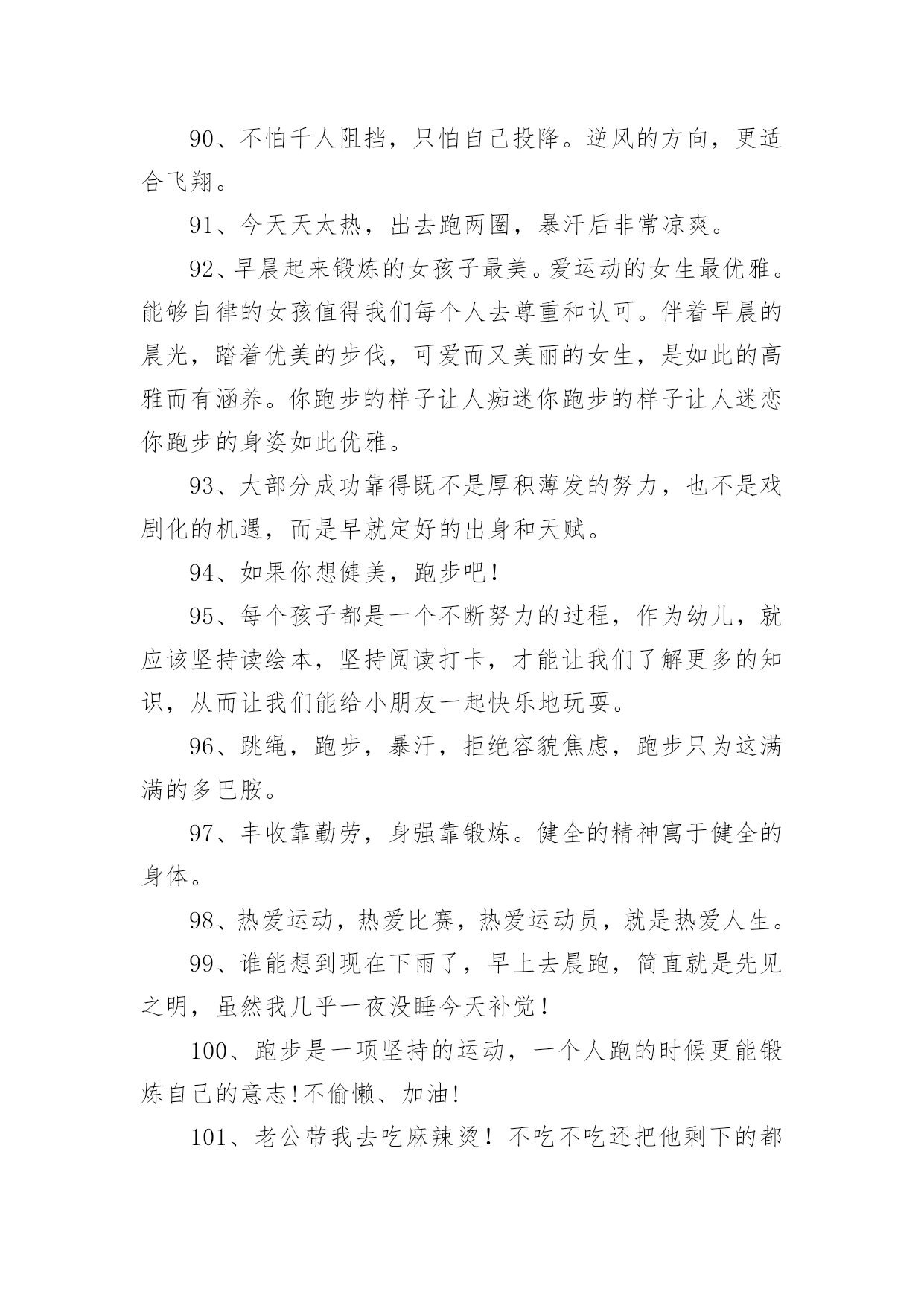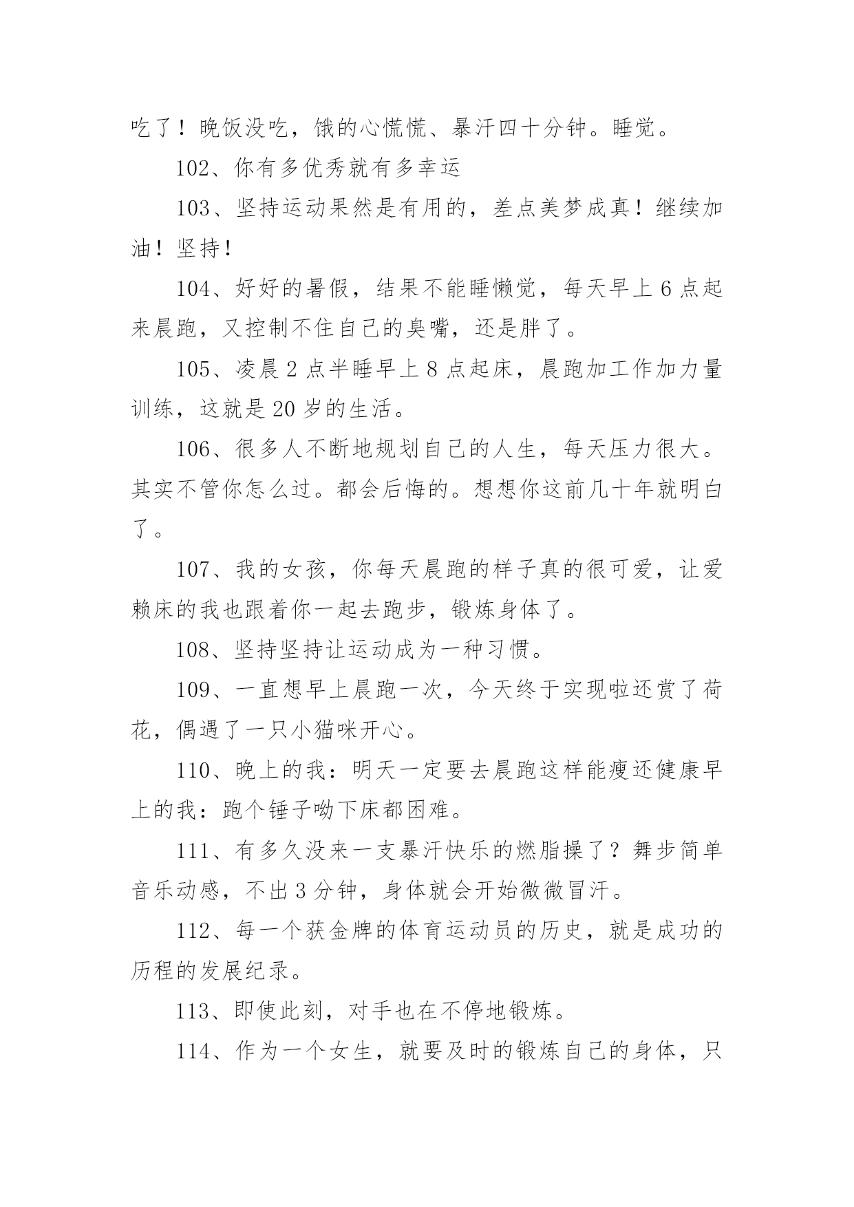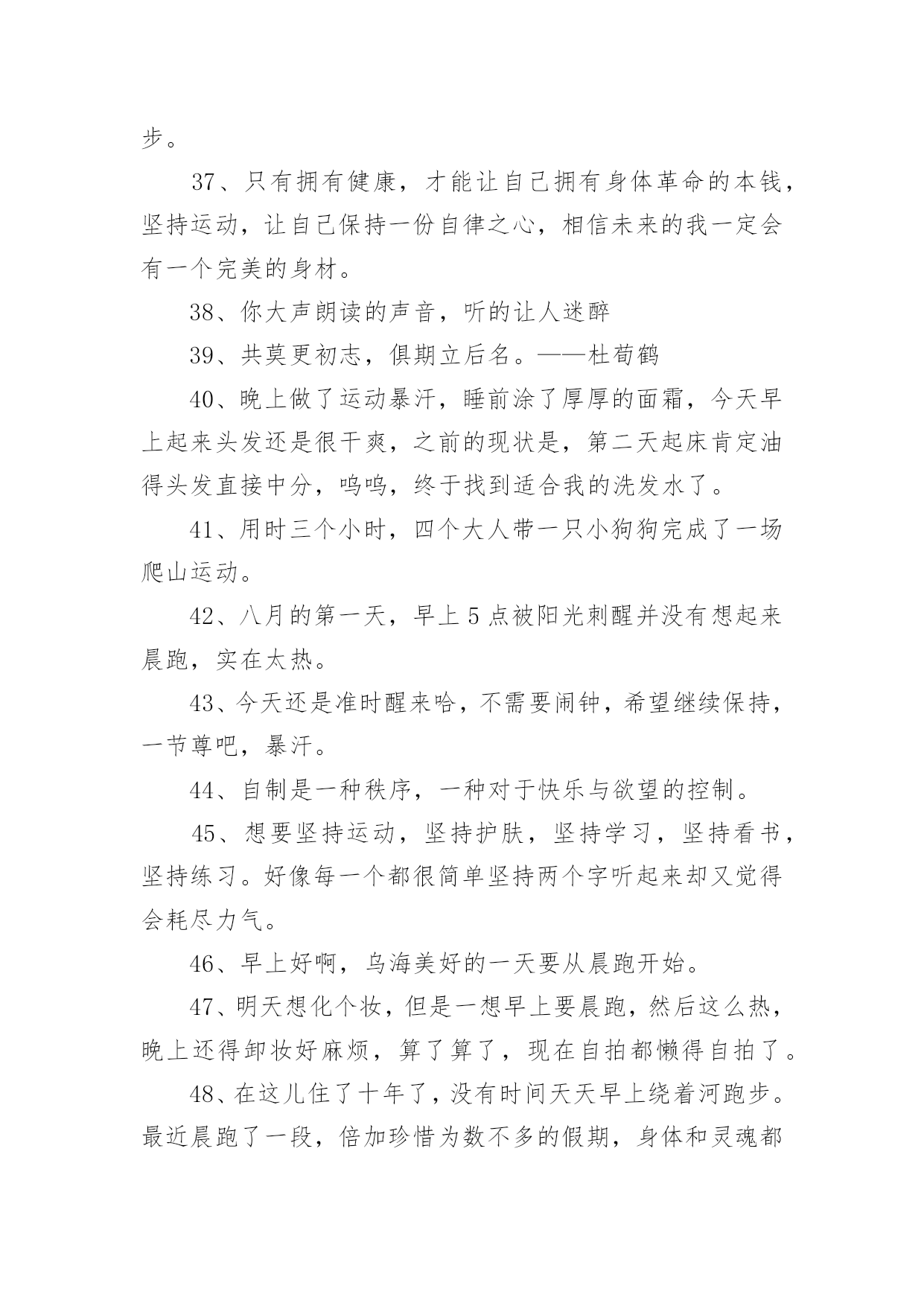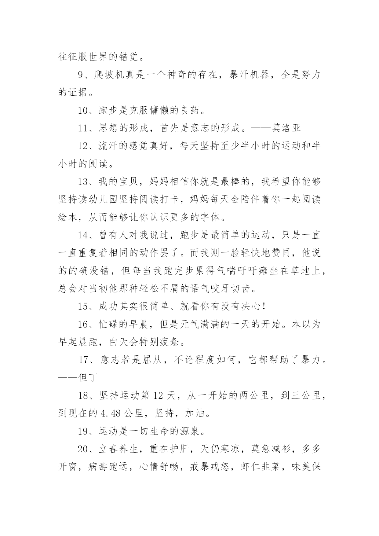 坚持运动打卡的激励语录的句子关于坚持运动打卡的激励语录的句子380句在平日的学习、工作和生活里,大家都看到过许多经典的句子吧,句子的组成部分,包括主语、谓语、宾语、定语、状语、补语六种。那什么样的句子才具有启发意义呢?以下是小编为大家整理的关于坚持运动打卡的激励语录的句子380句,仅供参考,大家一起来看看吧。1、暴汗了今天,可以迟到绝不缺席。2、喜欢暴汗的感觉,暴汗就感觉皮肤贼好。3、一路跑过去,一路享受清新宁静的感觉,速度并不快,有节奏地调整呼吸,五步一吸气、五步一呼气,汗水滑落,湿透衣裳。4、六公里,暴汗!早上没起来晨跑,晚上硬是在跑步机上完成了!挑战连续跑步一个月,加油!5、每天自我鼓励式运动,坚持运动坚持运动,练出马甲线,练出小腹肌,练出漫画腿,劈个大竖叉,再来个大横叉。6、别再拿身材和自律挂钩了,很多时候卸下铠甲舒缓一下,也是可以的,毕竟我们只是胖起来玩玩。7、武汉这种天气,穿正装提着游戏本等地铁去上班真的暴汗!8、早上听着《荣耀向我臣服》去晨跑,有种自己正前往征服世界的错觉。9、爬坡机真是一个神奇的存在,暴汗机器,全是努力的证据。10、跑步是克服慵懒的良药。11、思想的形成,首先是意志的形成。——莫洛亚12、流汗的感觉真好,每天坚持至少半小时的运动和半小时的阅读。13、我的宝贝,妈妈相信你就是最棒的,我希望你能够坚持读幼儿园坚持阅读打卡,妈妈每天会陪伴着你一起阅读绘本,从而能够让你认识更多的字体。14、曾有人对我说过,跑步是最简单的运动,只是一直一直重复着相同的动作罢了。而我则一脸轻快地赞同,他说的的确没错,但每当我跑完步累得气喘吁吁瘫坐在草地上,总会对当初他那种轻松不屑的语气咬牙切齿。15、成功其实很简单、就看你有没有决心!16、忙碌的早晨,但是元气满满的一天的开始。本以为早起晨跑,白天会特别疲惫。17、意志若是屈从,不论程度如何,它都帮助了暴力。——但丁18、坚持运动第12天,从一开始的两公里,到三公里,到现在的4.48公里,坚持,加油。19、运动是一切生命的源泉。20、立春养生,重在护肝,天仍寒凉,莫急减衫,多多开窗,病毒跑远,心情舒畅,戒暴戒怒,虾仁韭菜,味美保健,蘑菇山药,益气健脾,坚持运动,节奏和缓,慢跑快走,不宜大汗,关怀送到,愿你安康!21、流水不腐,户枢不蠹,动也。——(吕不韦)22、有时去跑跑步。23、我为什么要减肥,我又不是吃不起。24、你有多自律就有多自由。25、我觉得女孩晨跑真的很漂亮,每天精神奕奕的,每个人都应该锻炼身体,要有自觉性的去锻炼。26、夜跑打卡,跑完真是舒畅。硬拉着老公跑了3公里。平时早上太匆忙,周六日晨跑计划走起。27、完美的我们才能有坚强的希望,坚持运动的自律,才能让我们收获到更多的健康的动力。28、要好好运动,可以暴瘦变美29、早上起床,拥抱太阳,出来晨跑。30、早上晨跑途中下起了大雨,淋着雨跑完今日计划的路程,走回家后全身已湿透,为自己煮了一杯红糖枸杞姜茶。31、果然早上晨跑,不适合我我还是赶快去补一觉吧。32、你只有非常努力,才能看起来毫不费力。33、如果你坚持了自己的梦想、全世界都会为你让路!34、每天都让自己运动,坚持打卡,坚持运动,让自己养成严格自律的习惯,只有这样,才能让自己的人生有一个健康的身体。35、生命在于运动。36、夜跑是坚持晨跑才是挑战耸拉着脑袋静静看人家起步。37、只有拥有健康,才能让自己拥有身体革命的本钱,坚持运动,让自己保持一份自律之心,相信未来的我一定会有一个完美的身材。38、你大声朗读的声音,听的让人迷醉39、共莫更初志,俱期立后名。——杜荀鹤40、晚上做了运动暴汗,睡前涂了厚厚的面霜,今天早上起来头发还是很干爽,之前的现状是,第二天起床肯定油得头发直接中分,呜呜,终于找到适合我的洗发水了。41、用时三个小时,四个大人带一只小狗狗完成了一场爬山运动。42、八月的第一天,早上5点被阳光刺醒并没有想起来晨跑,实在太热。43、今天还是准时醒来哈,不需要闹钟,希望继续保持,一节尊吧,暴汗。44、自制是一种秩序,一种对于快乐与欲望的控制。45、想要坚持运动,坚持护肤,坚持学习,坚持看书,坚持练习。好像每一个都很简单坚持两个字听起来却又觉得会耗尽力气。46、早上好啊,乌海美好的一天要从晨跑开始。47、明天想化个妆,但是一想早上要晨跑,然后这么热,晚上还得卸妆好麻烦,算了算了,现在自拍都懒得自拍了。48、在这儿住了十年了,没有时间天天早上绕着河跑步。最近晨跑了一段,倍加珍惜为数不多的假期,身体和灵魂都要在路上。49、每个人都拿着自己的资本可劲骄傲,漂亮的恃靓行凶,瘦的把身材和自律成功挂一起,有钱的说经济基础决定上层建筑。50、昨天好不容易早睡想着今天上课结果早上我妈去晨跑的时候我有种彻夜未眠的感觉。51、有阳光的海最漂亮,蓝得让人迷恋。打卡观景山。