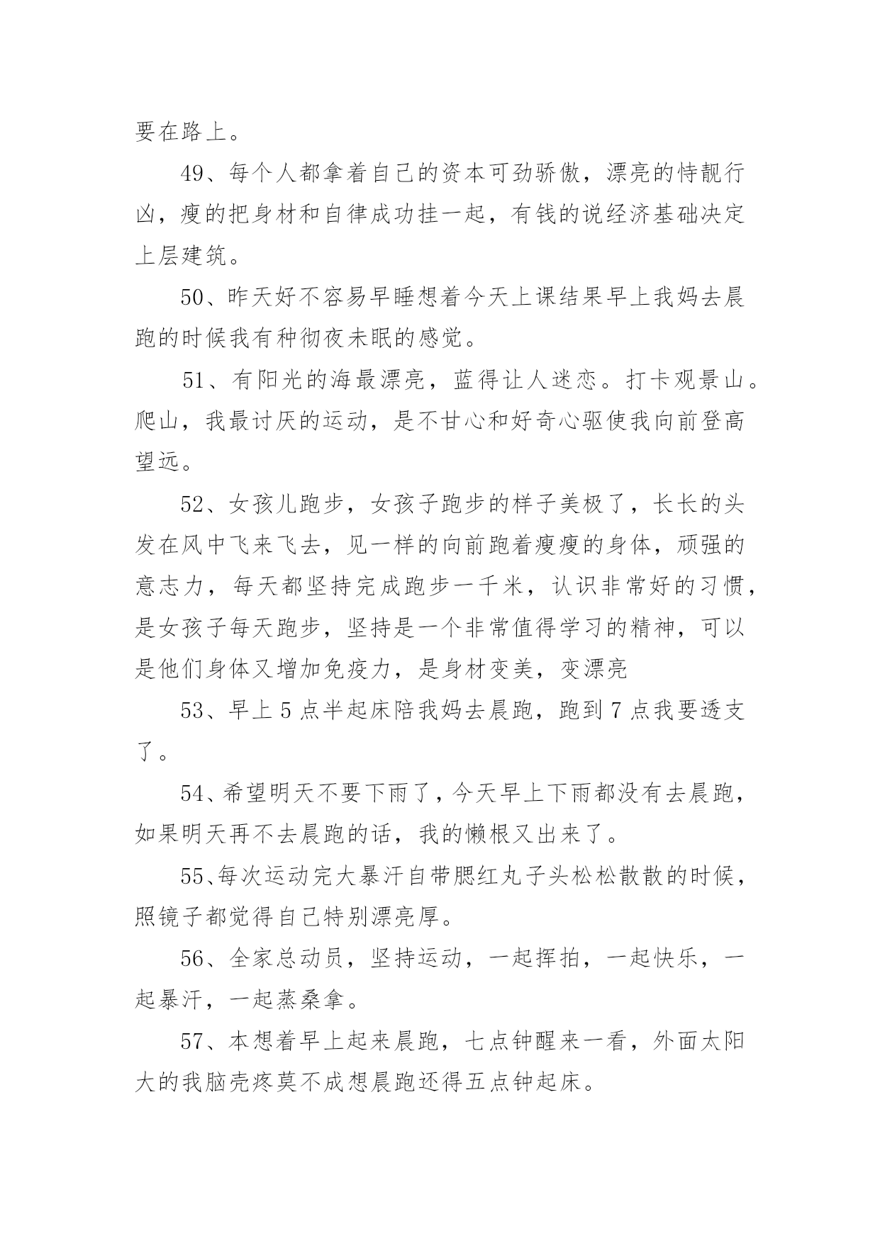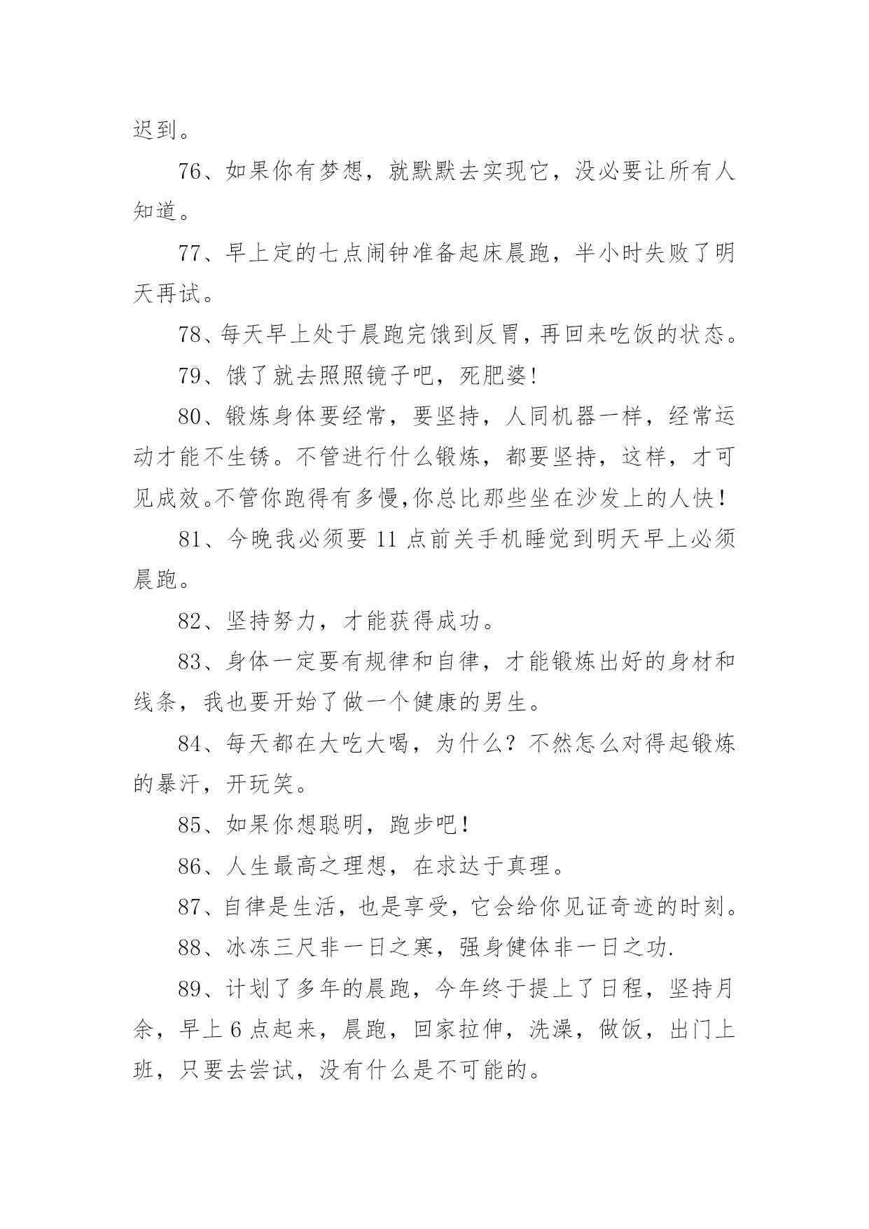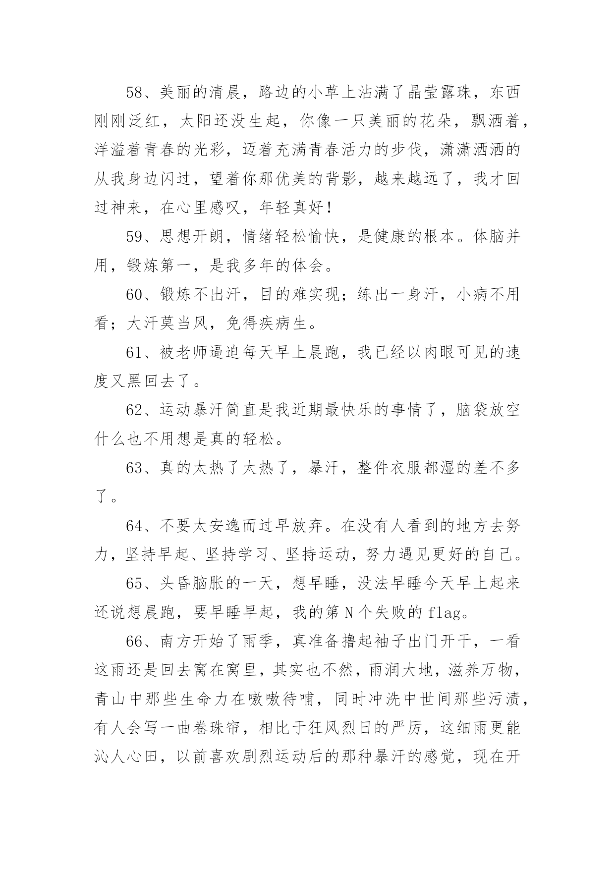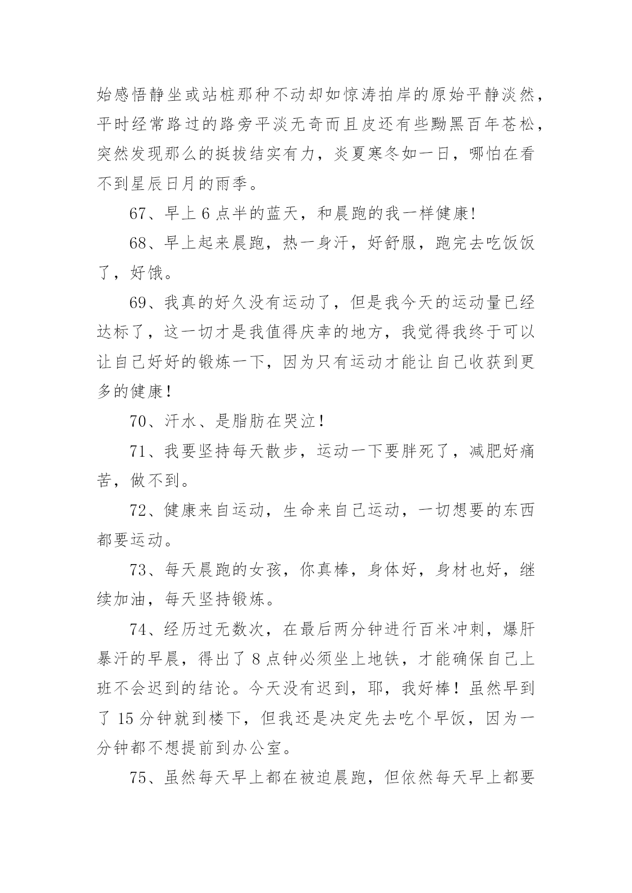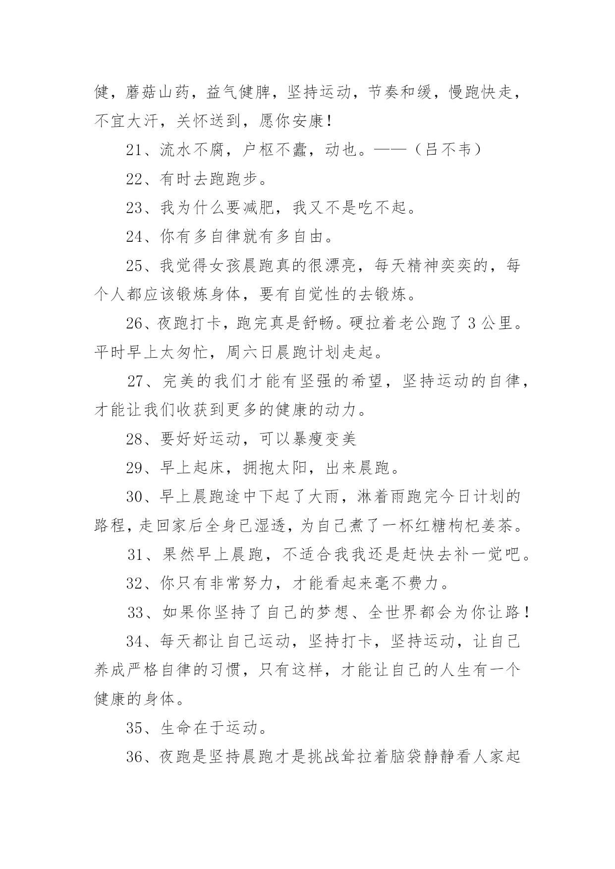 坚持运动打卡的激励语录的句子关于坚持运动打卡的激励语录的句子380句在平日的学习、工作和生活里,大家都看到过许多经典的句子吧,句子的组成部分,包括主语、谓语、宾语、定语、状语、补语六种。那什么样的句子才具有启发意义呢?以下是小编为大家整理的关于坚持运动打卡的激励语录的句子380句,仅供参考,大家一起来看看吧。1、暴汗了今天,可以迟到绝不缺席。2、喜欢暴汗的感觉,暴汗就感觉皮肤贼好。3、一路跑过去,一路享受清新宁静的感觉,速度并不快,有节奏地调整呼吸,五步一吸气、五步一呼气,汗水滑落,湿透衣裳。4、六公里,暴汗!早上没起来晨跑,晚上硬是在跑步机上完成了!挑战连续跑步一个月,加油!5、每天自我鼓励式运动,坚持运动坚持运动,练出马甲线,练出小腹肌,练出漫画腿,劈个大竖叉,再来个大横叉。6、别再拿身材和自律挂钩了,很多时候卸下铠甲舒缓一下,也是可以的,毕竟我们只是胖起来玩玩。7、武汉这种天气,穿正装提着游戏本等地铁去上班真的暴汗!8、早上听着《荣耀向我臣服》去晨跑,有种自己正前往征服世界的错觉。9、爬坡机真是一个神奇的存在,暴汗机器,全是努力的证据。10、跑步是克服慵懒的良药。11、思想的形成,首先是意志的形成。——莫洛亚12、流汗的感觉真好,每天坚持至少半小时的运动和半小时的阅读。13、我的宝贝,妈妈相信你就是最棒的,我希望你能够坚持读幼儿园坚持阅读打卡,妈妈每天会陪伴着你一起阅读绘本,从而能够让你认识更多的字体。14、曾有人对我说过,跑步是最简单的运动,只是一直一直重复着相同的动作罢了。而我则一脸轻快地赞同,他说的的确没错,但每当我跑完步累得气喘吁吁瘫坐在草地上,总会对当初他那种轻松不屑的语气咬牙切齿。15、成功其实很简单、就看你有没有决心!16、忙碌的早晨,但是元气满满的一天的开始。本以为早起晨跑,白天会特别疲惫。17、意志若是屈从,不论程度如何,它都帮助了暴力。——但丁18、坚持运动第12天,从一开始的两公里,到三公里,到现在的4.48公里,坚持,加油。19、运动是一切生命的源泉。20、立春养生,重在护肝,天仍寒凉,莫急减衫,多多开窗,病毒跑远,心情舒畅,戒暴戒怒,虾仁韭菜,味美保健,蘑菇山药,益气健脾,坚持运动,节奏和缓,慢跑快走,不宜大汗,关怀送到,愿你安康!21、流水不腐,户枢不蠹,动也。——(吕不韦)22、有时去跑跑步。23、我为什么要减肥,我又不是吃不起。24、你有多自律就有多自由。25、我觉得女孩晨跑真的很漂亮,每天精神奕奕的,每个人都应该锻炼身体,要有自觉性的去锻炼。26、夜跑打卡,跑完真是舒畅。硬拉着老公跑了3公里。平时早上太匆忙,周六日晨跑计划走起。27、完美的我们才能有坚强的希望,坚持运动的自律,才能让我们收获到更多的健康的动力。28、要好好运动,可以暴瘦变美29、早上起床,拥抱太阳,出来晨跑。30、早上晨跑途中下起了大雨,淋着雨跑完今日计划的路程,走回家后全身已湿透,为自己煮了一杯红糖枸杞姜茶。31、果然早上晨跑,不适合我我还是赶快去补一觉吧。32、你只有非常努力,才能看起来毫不费力。33、如果你坚持了自己的梦想、全世界都会为你让路!34、每天都让自己运动,坚持打卡,坚持运动,让自己养成严格自律的习惯,只有这样,才能让自己的人生有一个健康的身体。35、生命在于运动。36、夜跑是坚持晨跑才是挑战耸拉着脑袋静静看人家起步。37、只有拥有健康,才能让自己拥有身体革命的本钱,坚持运动,让自己保持一份自律之心,相信未来的我一定会有一个完美的身材。38、你大声朗读的声音,听的让人迷醉39、共莫更初志,俱期立后名。——杜荀鹤40、晚上做了运动暴汗,睡前涂了厚厚的面霜,今天早上起来头发还是很干爽,之前的现状是,第二天起床肯定油得头发直接中分,呜呜,终于找到适合我的洗发水了。41、用时三个小时,四个大人带一只小狗狗完成了一场爬山运动。42、八月的第一天,早上5点被阳光刺醒并没有想起来晨跑,实在太热。43、今天还是准时醒来哈,不需要闹钟,希望继续保持,一节尊吧,暴汗。44、自制是一种秩序,一种对于快乐与欲望的控制。45、想要坚持运动,坚持护肤,坚持学习,坚持看书,坚持练习。好像每一个都很简单坚持两个字听起来却又觉得会耗尽力气。46、早上好啊,乌海美好的一天要从晨跑开始。47、明天想化个妆,但是一想早上要晨跑,然后这么热,晚上还得卸妆好麻烦,算了算了,现在自拍都懒得自拍了。48、在这儿住了十年了,没有时间天天早上绕着河跑步。最近晨跑了一段,倍加珍惜为数不多的假期,身体和灵魂都要在路上。49、每个人都拿着自己的资本可劲骄傲,漂亮的恃靓行凶,瘦的把身材和自律成功挂一起,有钱的说经济基础决定上层建筑。50、昨天好不容易早睡想着今天上课结果早上我妈去晨跑的时候我有种彻夜未眠的感觉。51、有阳光的海最漂亮,蓝得让人迷恋。打卡观景山。