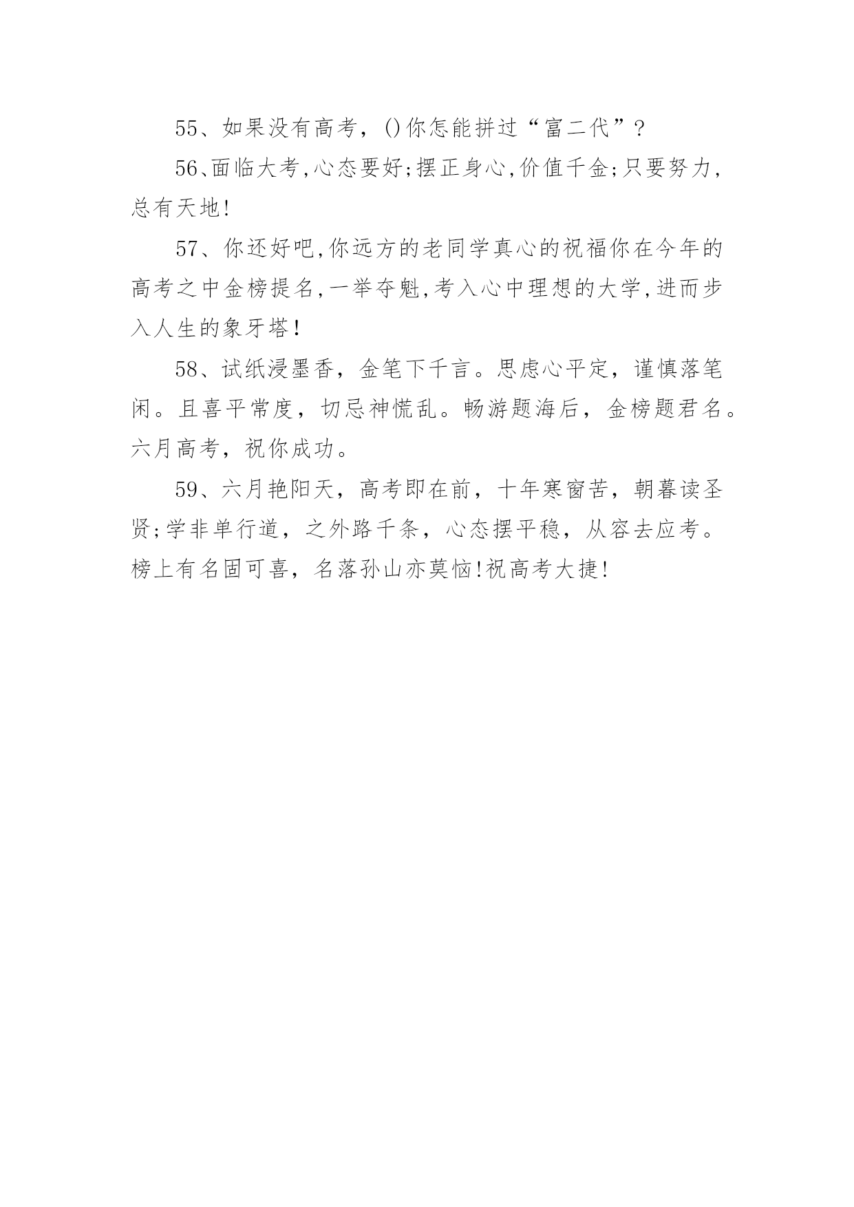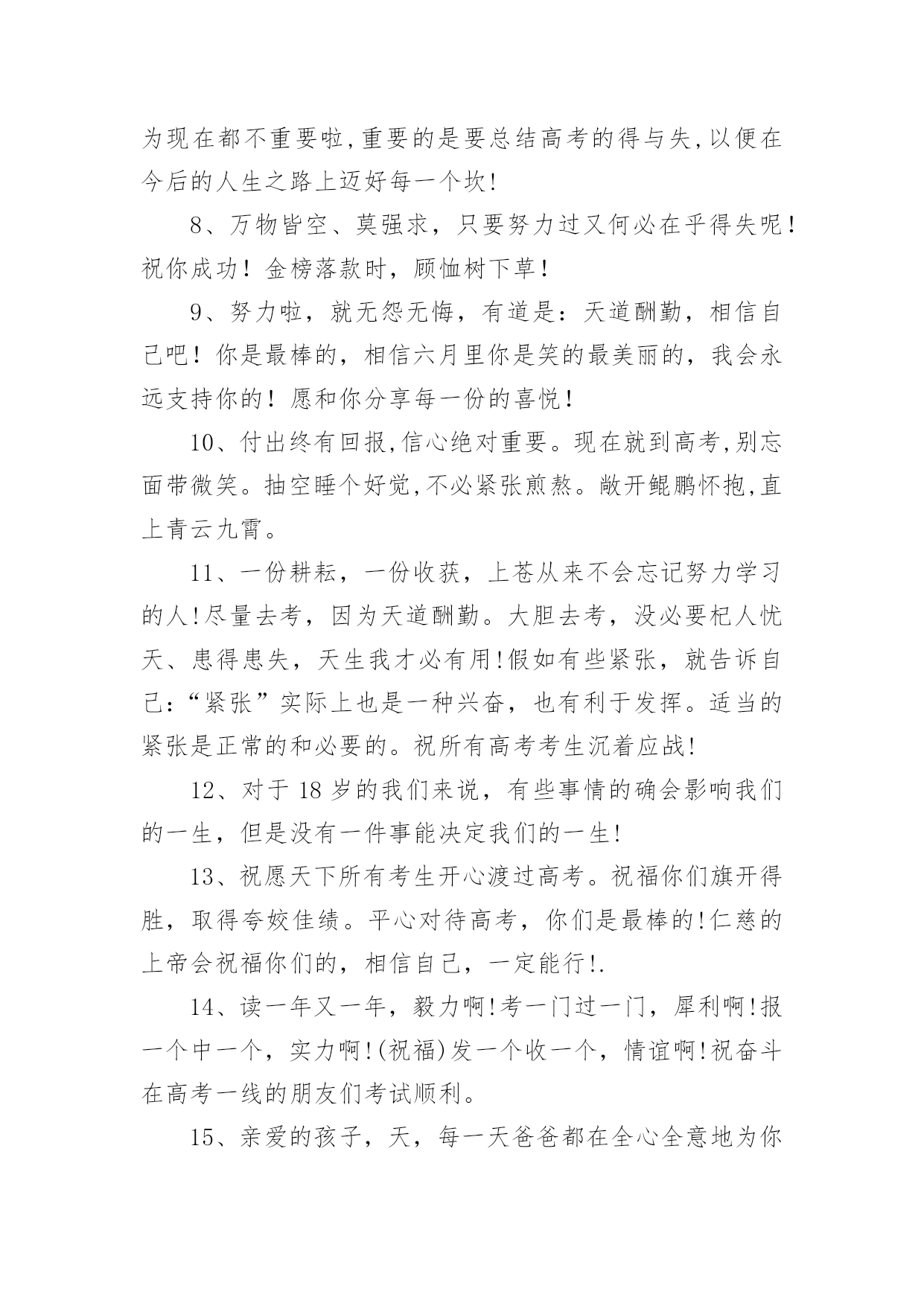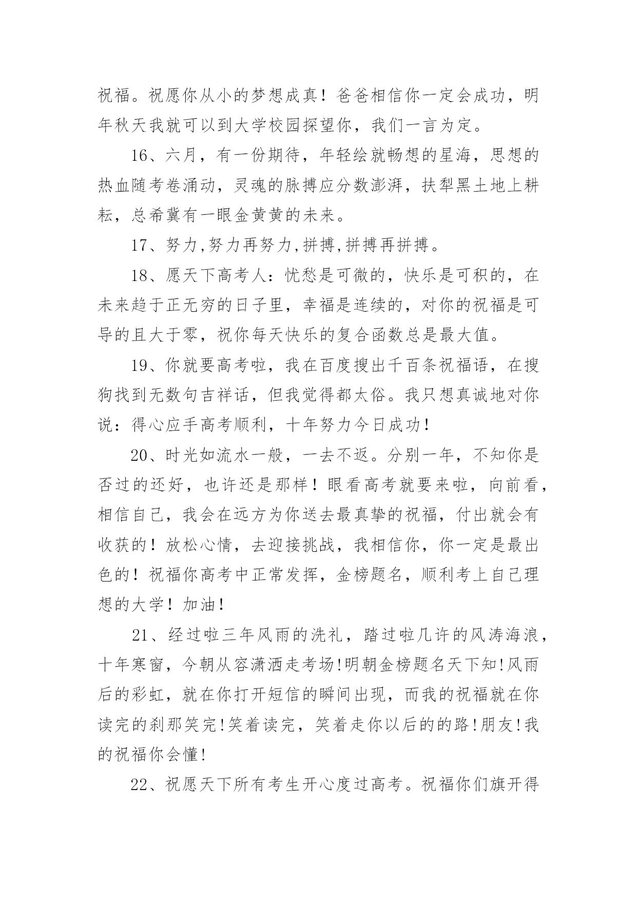为高考孩子加油的话为高考孩子加油的话为高考孩子加油的话有哪些?一份耕耘,一份收获,上苍从来不会忘记努力学习的人!尽量去考,因为天道酬勤。以下是小编为您整理的为高考孩子加油的话相关资料,欢迎阅读!为高考孩子加油的话1、奋斗在高考一线,埋头在书本之间,实力在清华上限,底线在北大保研,只要你能坚定信念,金榜题名只在弹指之间,愿你马到成功梦想实现!2、世界上最受欢迎的人从来不是那种不停地往后看着昨天的困苦、悲伤、失败和惨痛挫折的人,而是那种怀着信心、希望、勇气和愉快的求知欲而放眼未来的人。3、天道酬勤!丰硕的果实永远属于那些坚强不屈自强不息的辛勤耕耘者。4、到啦,到啦,高考就在眼前啦;快啦,快啦,梦想就快实现啦;微笑,微笑,把美好明天拥抱。5、想说爱你,感觉太沉;想说喜欢,感觉太轻;一每天地眷恋,一夜夜的无眠,我只有数着相思的绿莹帘珠,托星月寄到你窗前.祝考试顺意!6、高考加油!亲爱的朋友,平和一下自己的心态,控制自己的情绪,以平常心态应考,考完一门忘一门,让自己尽量放松,好好休息。希望你一举高中喔!7、高考像漫漫人生路上的一道坎,无论成败与否,我认为现在都不重要啦,重要的是要总结高考的得与失,以便在今后的人生之路上迈好每一个坎!8、万物皆空、莫强求,只要努力过又何必在乎得失呢!祝你成功!金榜落款时,顾恤树下草!9、努力啦,就无怨无悔,有道是:天道酬勤,相信自己吧!你是最棒的,相信六月里你是笑的最美丽的,我会永远支持你的!愿和你分享每一份的喜悦!10、付出终有回报,信心绝对重要。现在就到高考,别忘面带微笑。抽空睡个好觉,不必紧张煎熬。敞开鲲鹏怀抱,直上青云九霄。11、一份耕耘,一份收获,上苍从来不会忘记努力学习的人!尽量去考,因为天道酬勤。大胆去考,没必要杞人忧天、患得患失,天生我才必有用!假如有些紧张,就告诉自己:“紧张”实际上也是一种兴奋,也有利于发挥。适当的紧张是正常的和必要的。祝所有高考考生沉着应战!12、对于18岁的我们来说,有些事情的确会影响我们的一生,但是没有一件事能决定我们的一生!13、祝愿天下所有考生开心渡过高考。祝福你们旗开得胜,取得夸姣佳绩。平心对待高考,你们是最棒的!仁慈的上帝会祝福你们的,相信自己,一定能行!.14、读一年又一年,毅力啊!考一门过一门,犀利啊!报一个中一个,实力啊!(祝福)发一个收一个,情谊啊!祝奋斗在高考一线的朋友们考试顺利。15、亲爱的孩子,天,每一天爸爸都在全心全意地为你祝福。祝愿你从小的梦想成真!爸爸相信你一定会成功,明年秋天我就可以到大学校园探望你,我们一言为定。16、六月,有一份期待,年轻绘就畅想的星海,思想的热血随考卷涌动,灵魂的脉搏应分数澎湃,扶犁黑土地上耕耘,总希冀有一眼金黄黄的未来。17、努力,努力再努力,拼搏,拼搏再拼搏。18、愿天下高考人:忧愁是可微的,快乐是可积的,在未来趋于正无穷的日子里,幸福是连续的,对你的祝福是可导的且大于零,祝你每天快乐的复合函数总是最大值。19、你就要高考啦,我在百度搜出千百条祝福语,在搜狗找到无数句吉祥话,但我觉得都太俗。我只想真诚地对你说:得心应手高考顺利,十年努力今日成功!20、时光如流水一般,一去不返。分别一年,不知你是否过的还好,也许还是那样!眼看高考就要来啦,向前看,相信自己,我会在远方为你送去最真挚的祝福,付出就会有收获的!放松心情,去迎接挑战,我相信你,你一定是最出色的!祝福你高考中正常发挥,金榜题名,顺利考上自己理想的大学!加油!21、经过啦三年风雨的洗礼,踏过啦几许的风涛海浪,十年寒窗,今朝从容潇洒走考场!明朝金榜题名天下知!风雨后的彩虹,就在你打开短信的瞬间出现,而我的祝福就在你读完的刹那笑完!笑着读完,笑着走你以后的的路!朋友!我的祝福你会懂!22、祝愿天下所有考生开心度过高考。祝福你们旗开得胜,取得美好佳绩。平心对待高考,你们是最棒的!仁慈的上帝会祝福你们的,相信自己,一定能行!23、十磨百炼,铁杵成针;千淘万漉,沙尽金见。曾望功日遥遥,今顾旧事凄凄。当始之时,万日尚似甚远,近成之日,千年仍若一瞬。愿昨时同学,盈决心赴考,望往日校友,满形势应战。成功之讯,正待发布,胜利之报,已降天地。24、天道酬勤,曾经的每一分付出,必将收到百倍回报。不管揭晓的答案是什么,只要努力过、奋斗过,就不会后悔。25、没有付出,就没有收获,人只有上坡路才是最难走的,相信自己能成功,自己就一定能成功。努力吧,希望会属于你的。26、对待试题:冷静、乐观,对待考试:认真、自信。27、我的好朋友,我儿时的好玩伴,愿你高考考出好成绩,考上自己理想的好大学,在此道出我最真心的祝福,相信自己,你一定是最棒的!28、挥一挥手,送你先走,我的潇洒微笑,但愿你永远记住。高考如期而至,希望你我高中,相约在理想的学校里再见!29、“雄关漫道真如铁,而今迈步从头