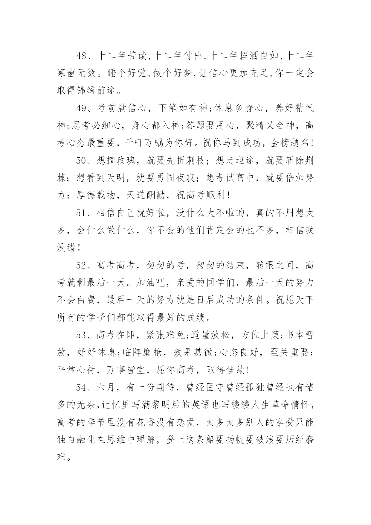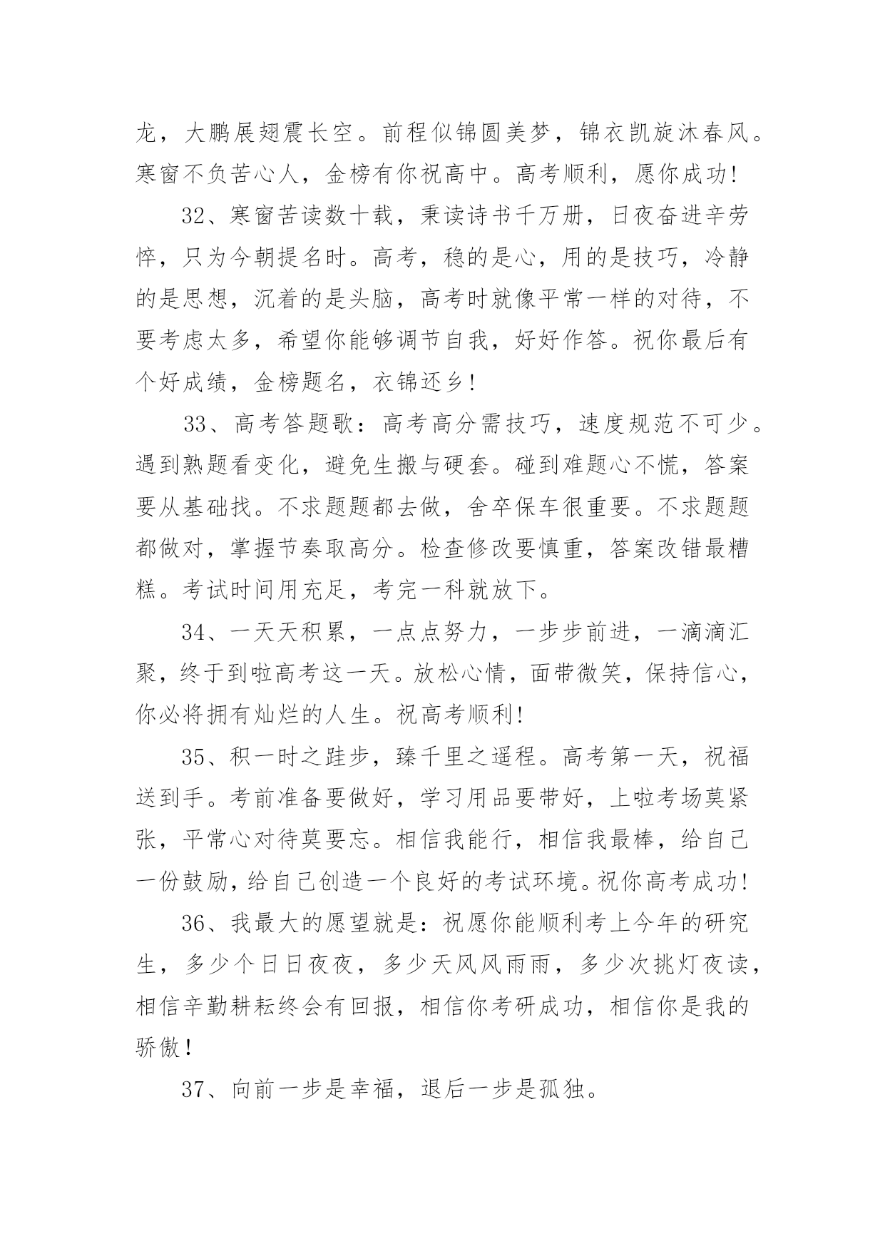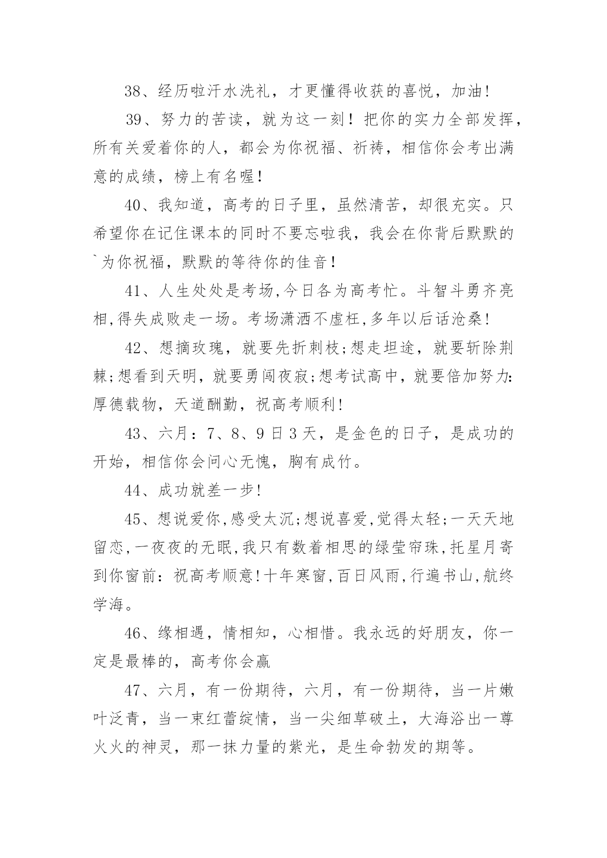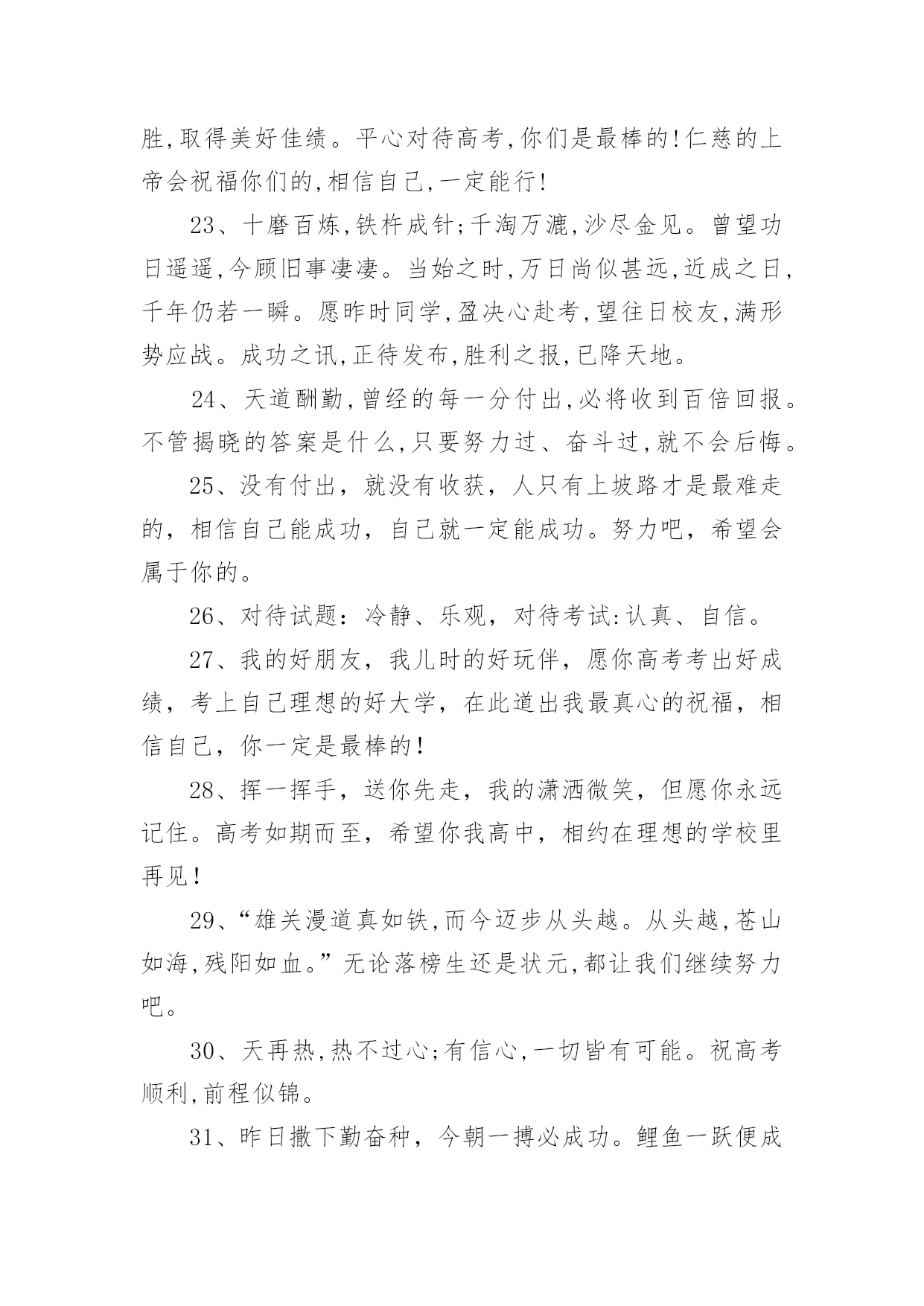为高考孩子加油的话为高考孩子加油的话为高考孩子加油的话有哪些?一份耕耘,一份收获,上苍从来不会忘记努力学习的人!尽量去考,因为天道酬勤。以下是小编为您整理的为高考孩子加油的话相关资料,欢迎阅读!为高考孩子加油的话1、奋斗在高考一线,埋头在书本之间,实力在清华上限,底线在北大保研,只要你能坚定信念,金榜题名只在弹指之间,愿你马到成功梦想实现!2、世界上最受欢迎的人从来不是那种不停地往后看着昨天的困苦、悲伤、失败和惨痛挫折的人,而是那种怀着信心、希望、勇气和愉快的求知欲而放眼未来的人。3、天道酬勤!丰硕的果实永远属于那些坚强不屈自强不息的辛勤耕耘者。4、到啦,到啦,高考就在眼前啦;快啦,快啦,梦想就快实现啦;微笑,微笑,把美好明天拥抱。5、想说爱你,感觉太沉;想说喜欢,感觉太轻;一每天地眷恋,一夜夜的无眠,我只有数着相思的绿莹帘珠,托星月寄到你窗前.祝考试顺意!6、高考加油!亲爱的朋友,平和一下自己的心态,控制自己的情绪,以平常心态应考,考完一门忘一门,让自己尽量放松,好好休息。希望你一举高中喔!7、高考像漫漫人生路上的一道坎,无论成败与否,我认为现在都不重要啦,重要的是要总结高考的得与失,以便在今后的人生之路上迈好每一个坎!8、万物皆空、莫强求,只要努力过又何必在乎得失呢!祝你成功!金榜落款时,顾恤树下草!9、努力啦,就无怨无悔,有道是:天道酬勤,相信自己吧!你是最棒的,相信六月里你是笑的最美丽的,我会永远支持你的!愿和你分享每一份的喜悦!10、付出终有回报,信心绝对重要。现在就到高考,别忘面带微笑。抽空睡个好觉,不必紧张煎熬。敞开鲲鹏怀抱,直上青云九霄。11、一份耕耘,一份收获,上苍从来不会忘记努力学习的人!尽量去考,因为天道酬勤。大胆去考,没必要杞人忧天、患得患失,天生我才必有用!假如有些紧张,就告诉自己:“紧张”实际上也是一种兴奋,也有利于发挥。适当的紧张是正常的和必要的。祝所有高考考生沉着应战!12、对于18岁的我们来说,有些事情的确会影响我们的一生,但是没有一件事能决定我们的一生!13、祝愿天下所有考生开心渡过高考。祝福你们旗开得胜,取得夸姣佳绩。平心对待高考,你们是最棒的!仁慈的上帝会祝福你们的,相信自己,一定能行!.14、读一年又一年,毅力啊!考一门过一门,犀利啊!报一个中一个,实力啊!(祝福)发一个收一个,情谊啊!祝奋斗在高考一线的朋友们考试顺利。15、亲爱的孩子,天,每一天爸爸都在全心全意地为你祝福。祝愿你从小的梦想成真!爸爸相信你一定会成功,明年秋天我就可以到大学校园探望你,我们一言为定。16、六月,有一份期待,年轻绘就畅想的星海,思想的热血随考卷涌动,灵魂的脉搏应分数澎湃,扶犁黑土地上耕耘,总希冀有一眼金黄黄的未来。17、努力,努力再努力,拼搏,拼搏再拼搏。18、愿天下高考人:忧愁是可微的,快乐是可积的,在未来趋于正无穷的日子里,幸福是连续的,对你的祝福是可导的且大于零,祝你每天快乐的复合函数总是最大值。19、你就要高考啦,我在百度搜出千百条祝福语,在搜狗找到无数句吉祥话,但我觉得都太俗。我只想真诚地对你说:得心应手高考顺利,十年努力今日成功!20、时光如流水一般,一去不返。分别一年,不知你是否过的还好,也许还是那样!眼看高考就要来啦,向前看,相信自己,我会在远方为你送去最真挚的祝福,付出就会有收获的!放松心情,去迎接挑战,我相信你,你一定是最出色的!祝福你高考中正常发挥,金榜题名,顺利考上自己理想的大学!加油!21、经过啦三年风雨的洗礼,踏过啦几许的风涛海浪,十年寒窗,今朝从容潇洒走考场!明朝金榜题名天下知!风雨后的彩虹,就在你打开短信的瞬间出现,而我的祝福就在你读完的刹那笑完!笑着读完,笑着走你以后的的路!朋友!我的祝福你会懂!22、祝愿天下所有考生开心度过高考。祝福你们旗开得胜,取得美好佳绩。平心对待高考,你们是最棒的!仁慈的上帝会祝福你们的,相信自己,一定能行!23、十磨百炼,铁杵成针;千淘万漉,沙尽金见。曾望功日遥遥,今顾旧事凄凄。当始之时,万日尚似甚远,近成之日,千年仍若一瞬。愿昨时同学,盈决心赴考,望往日校友,满形势应战。成功之讯,正待发布,胜利之报,已降天地。24、天道酬勤,曾经的每一分付出,必将收到百倍回报。不管揭晓的答案是什么,只要努力过、奋斗过,就不会后悔。25、没有付出,就没有收获,人只有上坡路才是最难走的,相信自己能成功,自己就一定能成功。努力吧,希望会属于你的。26、对待试题:冷静、乐观,对待考试:认真、自信。27、我的好朋友,我儿时的好玩伴,愿你高考考出好成绩,考上自己理想的好大学,在此道出我最真心的祝福,相信自己,你一定是最棒的!28、挥一挥手,送你先走,我的潇洒微笑,但愿你永远记住。高考如期而至,希望你我高中,相约在理想的学校里再见!29、“雄关漫道真如铁,而今迈步从头