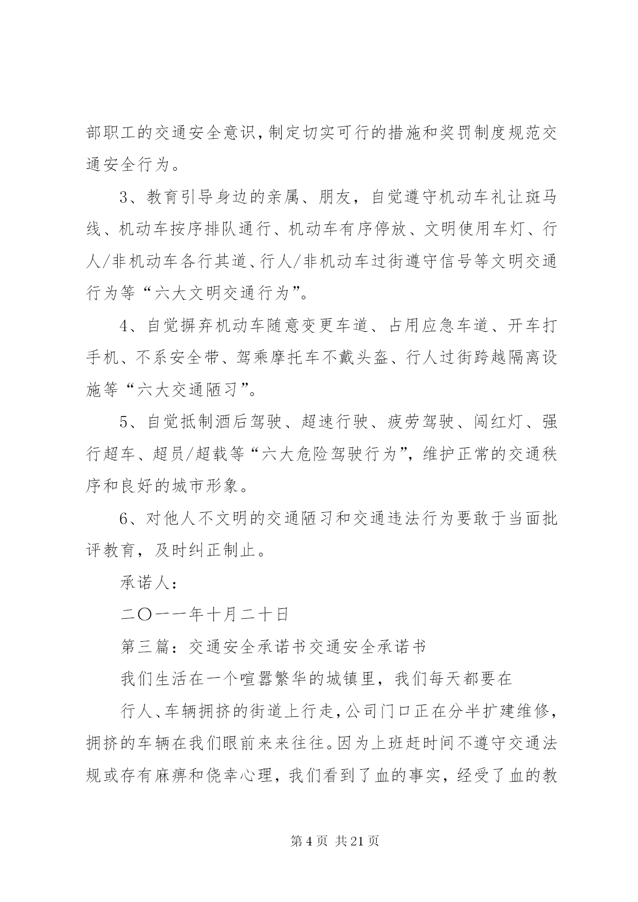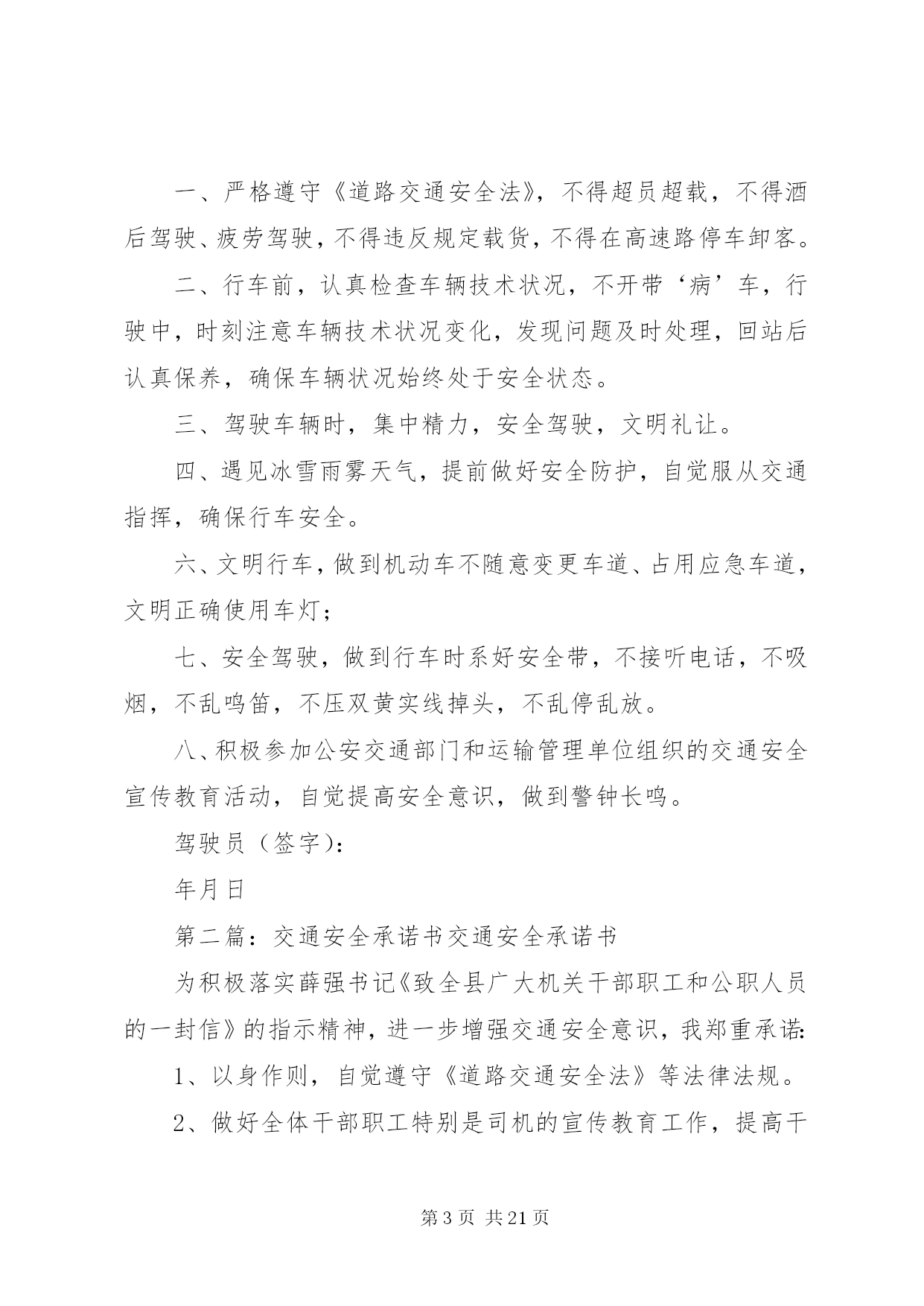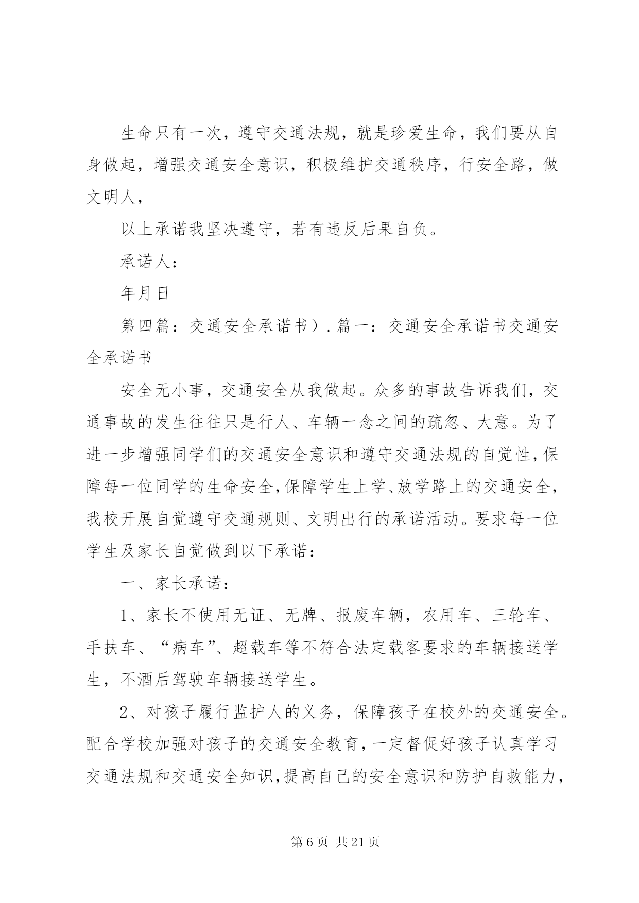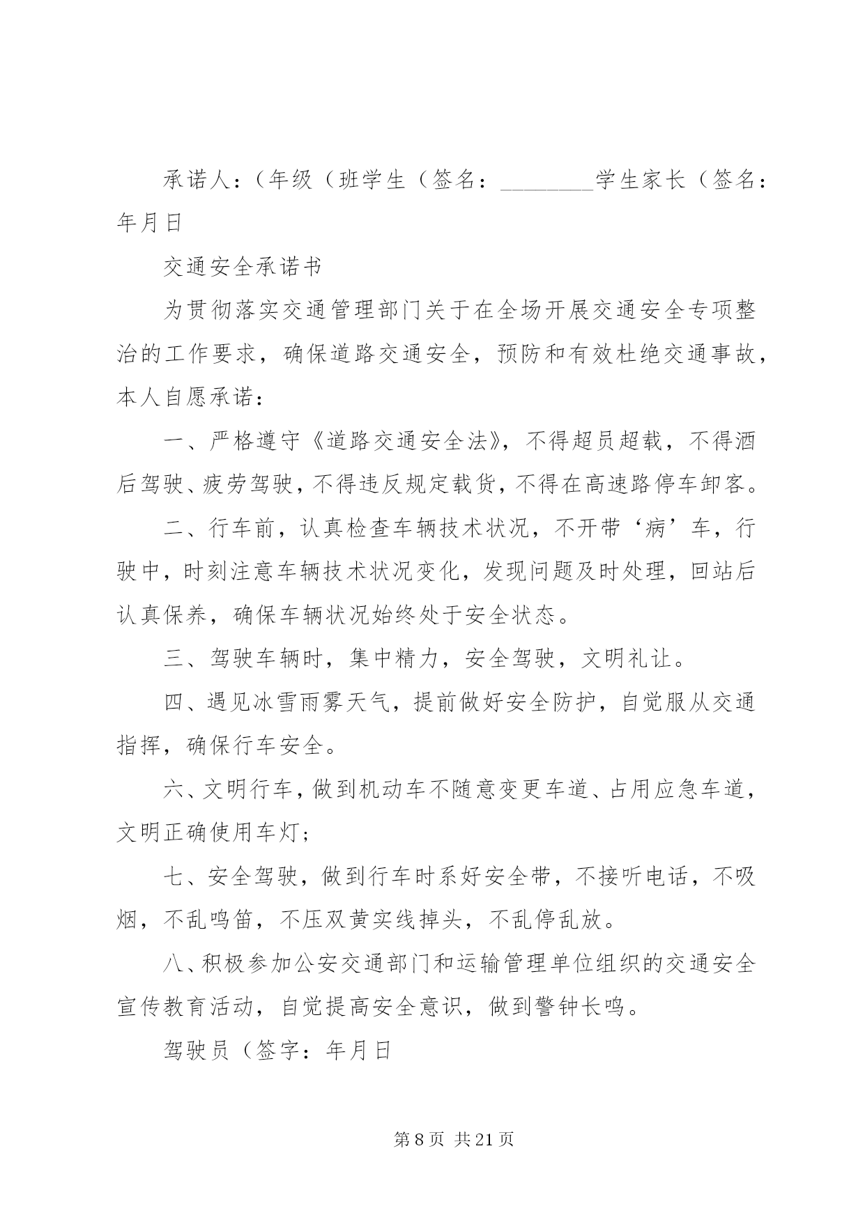 第PAGE\*Arabic\*MERGEFORMAT21页共NUMPAGES\*MERGEFORMAT21页交通安全承诺书安全无小事,交通安全从我做起。众多的事故告诉我们,交通事故的发生往往只是行人、车辆一念之间的疏忽、大意。为了进一步增强同学们的交通安全意识和遵守交通法规的自觉性,保障每一位同学的生命安全,保障学生上学、放学路上的交通安全,我校开展自觉遵守交通规则、文明出行的承诺活动。要求每一位学生及家长自觉做到以下承诺:一、家长承诺:1、家长不使用无证、无牌、报废车辆,农用车、三轮车、手扶车、“病车”、超载车等不符合法定载客要求的车辆接送学生,不酒后驾驶车辆接送学生。2、对孩子履行监护人的义务,保障孩子在校外的交通安全。配合学校加强对孩子的交通安全教育,一定督促好孩子认真学习交通法规和交通安全知识,提高自己的安全意识和防护自救能力,时刻提醒自己注意维护自己和他人的交通安全,并教育孩子自觉遵守交通安全法规。发现孩子的不良交通行为及时教育和纠正。3、教育孩子上下学途中不得嬉戏打闹,注意交通法规,过马路时要注意交通信号标志,注意来往车辆,要靠右行走。提高子女的交通安全意识。4、监督并禁止凡不满十二周岁的孩子骑自行车,密切与学校沟通共同教育管理学生。二、学生承诺:1、认真学习交通安全知识,遵守交通法规,提高自己的安全意识和防护自救能力。2、严格遵守交通法规,不追逐打闹,不三五并肩行驶;在道路上行走做到:走路靠右行,不违章过马路,在没有交通信号的交叉路口或横穿公路时要慢行,注意观察、看清来往车辆,做到“一停二看三通过”、“红灯停、绿灯行”等。不骑自行车。3、严格遵守“五不”原则。乘坐汽车时,不得将头、胳膊等身体部位伸向窗外;不准乘坐无证、无牌、证件不全的车辆和报废车辆;不乘坐农用车、三轮车、“病车”、超载车等不符合法定载客要求的车辆;不搭乘司机酒后、疲劳等的车辆;不搭乘危险驾驶的车辆。4、严格执行学校、家长的交通安全教育。服从交警指挥,严格遵守其他应该遵守的交通法规。承诺人:年级班学生(签名):________学生家长(签名):年月日交通安全承诺书为贯彻落实交通管理部门关于在全场开展交通安全专项整治的工作要求,确保道路交通安全,预防和有效杜绝交通事故,本人自愿承诺:一、严格遵守《道路交通安全法》,不得超员超载,不得酒后驾驶、疲劳驾驶,不得违反规定载货,不得在高速路停车卸客。二、行车前,认真检查车辆技术状况,不开带‘病’车,行驶中,时刻注意车辆技术状况变化,发现问题及时处理,回站后认真保养,确保车辆状况始终处于安全状态。三、驾驶车辆时,集中精力,安全驾驶,文明礼让。四、遇见冰雪雨雾天气,提前做好安全防护,自觉服从交通指挥,确保行车安全。六、文明行车,做到机动车不随意变更车道、占用应急车道,文明正确使用车灯;七、安全驾驶,做到行车时系好安全带,不接听电话,不吸烟,不乱鸣笛,不压双黄实线掉头,不乱停乱放。八、积极参加公安交通部门和运输管理单位组织的交通安全宣传教育活动,自觉提高安全意识,做到警钟长鸣。驾驶员(签字):年月日第二篇:交通安全承诺书交通安全承诺书为积极落实薛强书记《致全县广大机关干部职工和公职人员的一封信》的指示精神,进一步增强交通安全意识,我郑重承诺:1、以身作则,自觉遵守《道路交通安全法》等法律法规。2、做好全体干部职工特别是司机的宣传教育工作,提高干部职工的交通安全意识,制定切实可行的措施和奖罚制度规范交通安全行为。3、教育引导身边的亲属、朋友,自觉遵守机动车礼让斑马线、机动车按序排队通行、机动车有序停放、文明使用车灯、行人/非机动车各行其道、行人/非机动车过街遵守信号等文明交通行为等“六大文明交通行为”。4、自觉摒弃机动车随意变更车道、占用应急车道、开车打手机、不系安全带、驾乘摩托车不戴头盔、行人过街跨越隔离设施等“六大交通陋习”。5、自觉抵制酒后驾驶、超速行驶、疲劳驾驶、闯红灯、强行超车、超员/超载等“六大危险驾驶行为”,维护正常的交通秩序和良好的城市形象。6、对他人不文明的交通陋习和交通违法行为要敢于当面批评教育,及时纠正制止。承诺人:二〇一一年十月二十日第三篇:交通安全承诺书交通安全承诺书我们生活在一个喧嚣繁华的城镇里,我们每天都要在行人、车辆拥挤的街道上行走,公司门口正在分半扩建维修,拥挤的车辆在我们眼前来来往往。因为上班赶时间不遵守交通法规或存有麻痹和侥幸心理,我们看到了血的事实,经受了血的教训。多少惨痛的教训和血的代价让我们深深地体悟到维护交通安全的重要性,遵守交通法规是我们应尽的责任和义务,只有遵守交通法规,平安才会伴我们一生,只有文明交通,事故才会与我们无缘。为了珍惜和关爱自己和他人的生命,做一名自觉遵守交通法规的模范,我们承诺如下:一、认真学习交通法规知识,自觉遵守交通法规规