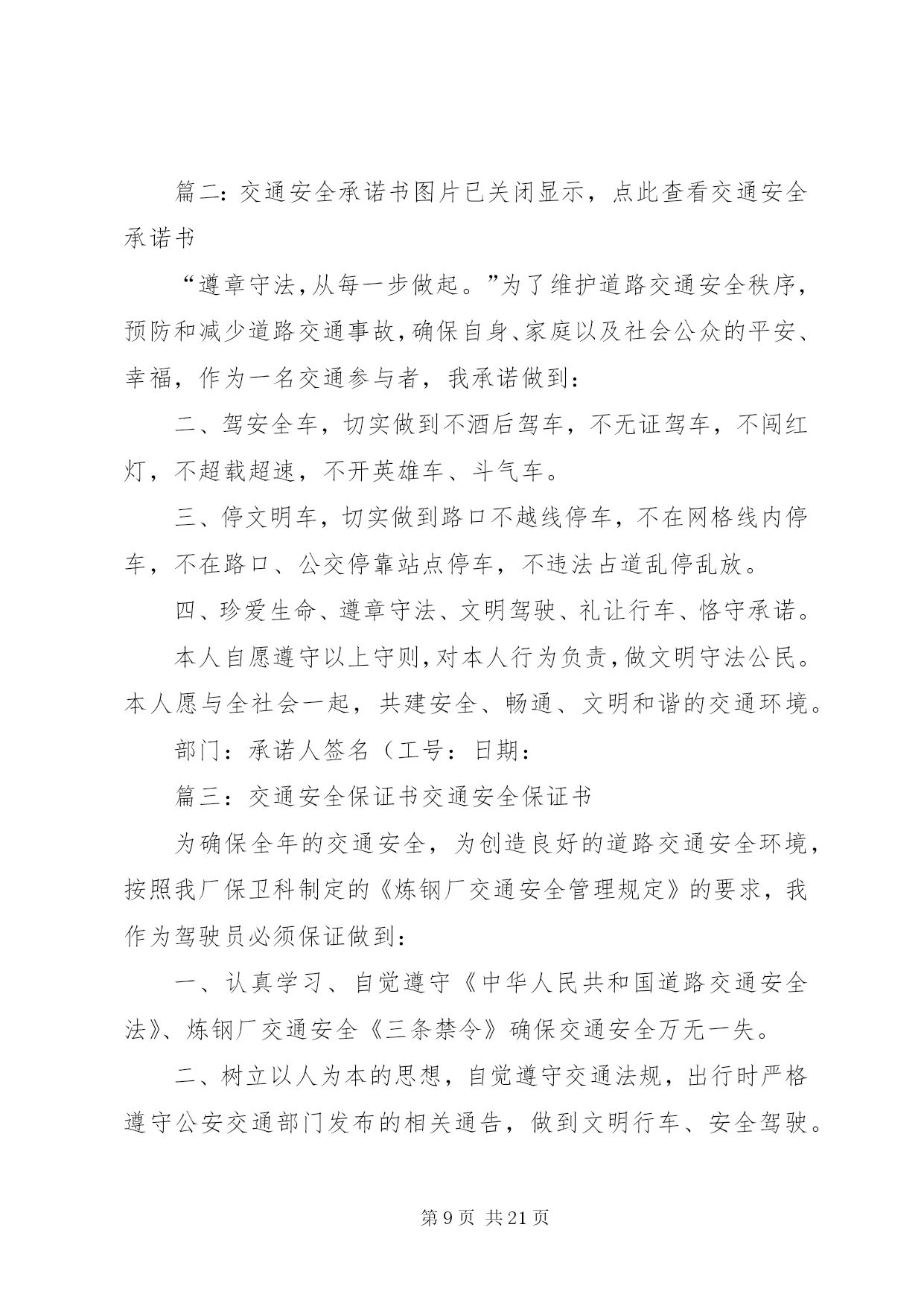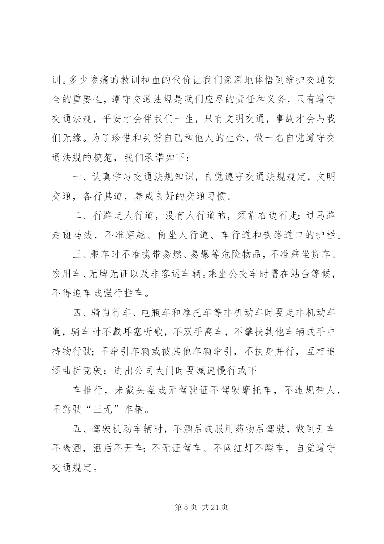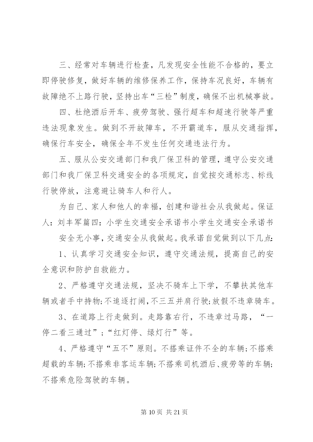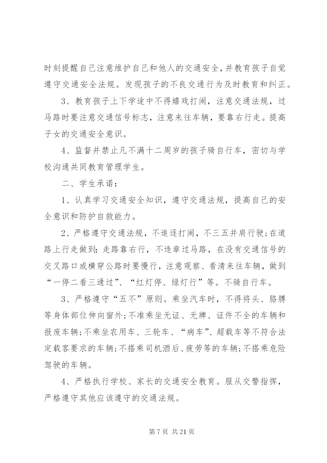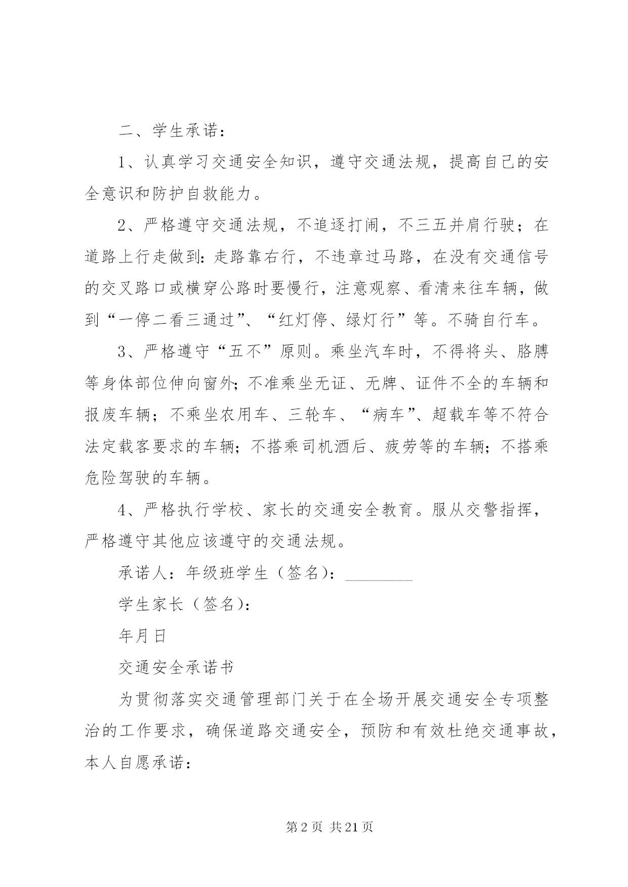 第PAGE\*Arabic\*MERGEFORMAT21页共NUMPAGES\*MERGEFORMAT21页交通安全承诺书安全无小事,交通安全从我做起。众多的事故告诉我们,交通事故的发生往往只是行人、车辆一念之间的疏忽、大意。为了进一步增强同学们的交通安全意识和遵守交通法规的自觉性,保障每一位同学的生命安全,保障学生上学、放学路上的交通安全,我校开展自觉遵守交通规则、文明出行的承诺活动。要求每一位学生及家长自觉做到以下承诺:一、家长承诺:1、家长不使用无证、无牌、报废车辆,农用车、三轮车、手扶车、“病车”、超载车等不符合法定载客要求的车辆接送学生,不酒后驾驶车辆接送学生。2、对孩子履行监护人的义务,保障孩子在校外的交通安全。配合学校加强对孩子的交通安全教育,一定督促好孩子认真学习交通法规和交通安全知识,提高自己的安全意识和防护自救能力,时刻提醒自己注意维护自己和他人的交通安全,并教育孩子自觉遵守交通安全法规。发现孩子的不良交通行为及时教育和纠正。3、教育孩子上下学途中不得嬉戏打闹,注意交通法规,过马路时要注意交通信号标志,注意来往车辆,要靠右行走。提高子女的交通安全意识。4、监督并禁止凡不满十二周岁的孩子骑自行车,密切与学校沟通共同教育管理学生。二、学生承诺:1、认真学习交通安全知识,遵守交通法规,提高自己的安全意识和防护自救能力。2、严格遵守交通法规,不追逐打闹,不三五并肩行驶;在道路上行走做到:走路靠右行,不违章过马路,在没有交通信号的交叉路口或横穿公路时要慢行,注意观察、看清来往车辆,做到“一停二看三通过”、“红灯停、绿灯行”等。不骑自行车。3、严格遵守“五不”原则。乘坐汽车时,不得将头、胳膊等身体部位伸向窗外;不准乘坐无证、无牌、证件不全的车辆和报废车辆;不乘坐农用车、三轮车、“病车”、超载车等不符合法定载客要求的车辆;不搭乘司机酒后、疲劳等的车辆;不搭乘危险驾驶的车辆。4、严格执行学校、家长的交通安全教育。服从交警指挥,严格遵守其他应该遵守的交通法规。承诺人:年级班学生(签名):________学生家长(签名):年月日交通安全承诺书为贯彻落实交通管理部门关于在全场开展交通安全专项整治的工作要求,确保道路交通安全,预防和有效杜绝交通事故,本人自愿承诺:一、严格遵守《道路交通安全法》,不得超员超载,不得酒后驾驶、疲劳驾驶,不得违反规定载货,不得在高速路停车卸客。二、行车前,认真检查车辆技术状况,不开带‘病’车,行驶中,时刻注意车辆技术状况变化,发现问题及时处理,回站后认真保养,确保车辆状况始终处于安全状态。三、驾驶车辆时,集中精力,安全驾驶,文明礼让。四、遇见冰雪雨雾天气,提前做好安全防护,自觉服从交通指挥,确保行车安全。六、文明行车,做到机动车不随意变更车道、占用应急车道,文明正确使用车灯;七、安全驾驶,做到行车时系好安全带,不接听电话,不吸烟,不乱鸣笛,不压双黄实线掉头,不乱停乱放。八、积极参加公安交通部门和运输管理单位组织的交通安全宣传教育活动,自觉提高安全意识,做到警钟长鸣。驾驶员(签字):年月日第二篇:交通安全承诺书交通安全承诺书为积极落实薛强书记《致全县广大机关干部职工和公职人员的一封信》的指示精神,进一步增强交通安全意识,我郑重承诺:1、以身作则,自觉遵守《道路交通安全法》等法律法规。2、做好全体干部职工特别是司机的宣传教育工作,提高干部职工的交通安全意识,制定切实可行的措施和奖罚制度规范交通安全行为。3、教育引导身边的亲属、朋友,自觉遵守机动车礼让斑马线、机动车按序排队通行、机动车有序停放、文明使用车灯、行人/非机动车各行其道、行人/非机动车过街遵守信号等文明交通行为等“六大文明交通行为”。4、自觉摒弃机动车随意变更车道、占用应急车道、开车打手机、不系安全带、驾乘摩托车不戴头盔、行人过街跨越隔离设施等“六大交通陋习”。5、自觉抵制酒后驾驶、超速行驶、疲劳驾驶、闯红灯、强行超车、超员/超载等“六大危险驾驶行为”,维护正常的交通秩序和良好的城市形象。6、对他人不文明的交通陋习和交通违法行为要敢于当面批评教育,及时纠正制止。承诺人:二〇一一年十月二十日第三篇:交通安全承诺书交通安全承诺书我们生活在一个喧嚣繁华的城镇里,我们每天都要在行人、车辆拥挤的街道上行走,公司门口正在分半扩建维修,拥挤的车辆在我们眼前来来往往。因为上班赶时间不遵守交通法规或存有麻痹和侥幸心理,我们看到了血的事实,经受了血的教训。多少惨痛的教训和血的代价让我们深深地体悟到维护交通安全的重要性,遵守交通法规是我们应尽的责任和义务,只有遵守交通法规,平安才会伴我们一生,只有文明交通,事故才会与我们无缘。为了珍惜和关爱自己和他人的生命,做一名自觉遵守交通法规的模范,我们承诺如下:一、认真学习交通法规知识,自觉遵守交通法规规