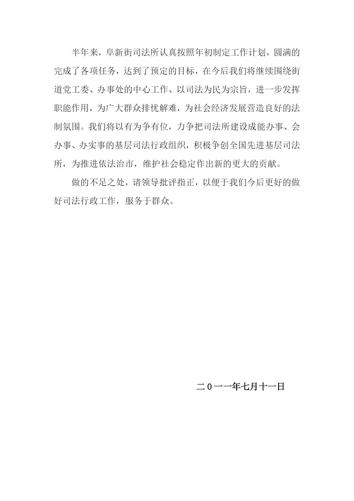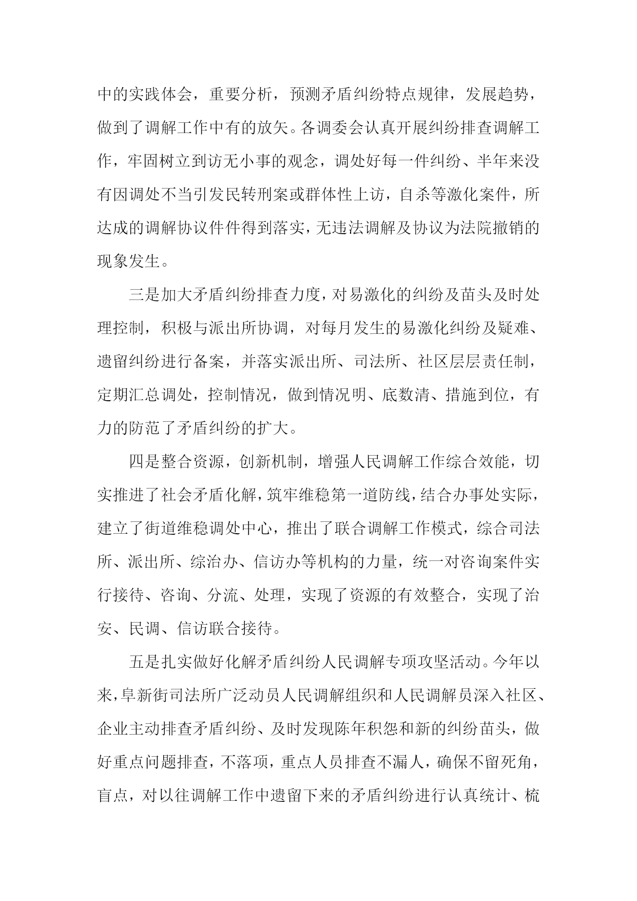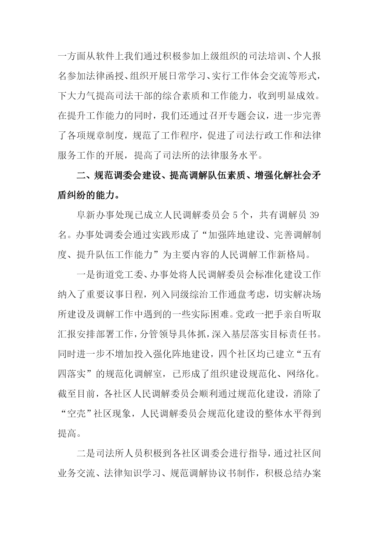 阜新街司法所司法行政工作汇报材料检查组各位领导:欢迎各位到阜新街司法所亲临检查指导工作,现将上半年工作汇报如下:2011年上半年,我办事处司法行政工作在市司法局的正确领导下,在街道党工委、办事处的大力支持下,全面落实科学发展观,牢固树立社会主义法治理念,以服务于街道工作大局为主线,以维护和保障辖区稳定为核心,以强化队伍为基础,充分发挥自身职能,努力探索新时期司法行政工作的新特点、新方法、新措施、开创司法行政工作的新局面。具体开展的工作、做法是:一、规范组织机构,着力提升整体形象阜康市阜新街办事处下辖4个社区居委会,有在编干部职工46人,机关干部和社区居委会工作人员89人。辖区划分为乌奇路以南,乌甘铁路以北,东至新村南路,西至工农兵大乔,总面积5平方公里,总户数6650户,总人口18590人,辖区共有42个行政企事业单位。有基层人民调解组5个,调解员39人;建立办事处矛盾纠纷调处机构1个。根据上级的要求,结合我办事处实际,年初,对司法所工作人员进行了调整和充实,通过调整,司法所现有工作人员2人,其中所长1人,1名协理员,且文化程度均在大专以上,司法所经过调整后,一方面从硬件设施上加大投入添置电脑打字设备,既方便了群众又提高了工作效率,另一方面从软件上我们通过积极参加上级组织的司法培训、个人报名参加法律函授、组织开展日常学习、实行工作体会交流等形式,下大力气提高司法干部的综合素质和工作能力,收到明显成效。在提升工作能力的同时,我们还通过召开专题会议,进一步完善了各项规章制度,规范了工作程序,促进了司法行政工作和法律服务工作的开展,提高了司法所的法律服务水平。二、规范调委会建设、提高调解队伍素质、增强化解社会矛盾纠纷的能力。阜新办事处现已成立人民调解委员会5个,共有调解员39名。办事处调委会通过实践形成了“加强阵地建设、完善调解制度、提升队伍工作能力”为主要内容的人民调解工作新格局。一是街道党工委、办事处将人民调解委员会标准化建设工作纳入了重要议事日程,列入同级综治工作通盘考虑,切实解决场所建设及调解工作中遇到的一些实际困难。党政一把手亲自听取汇报安排部署工作,分管领导具体抓,深入基层落实目标责任书。同时进一步不增加投入强化阵地建设,四个社区均已建立“五有四落实”的规范化调解室,已形成了组织建设规范化、网络化。截至目前,各社区人民调解委员会顺利通过规范化建设,消除了“空壳”社区现象,人民调解委员会规范化建设的整体水平得到提高。二是司法所人员积极到各社区调委会进行指导,通过社区间业务交流、法律知识学习、规范调解协议书制作,积极总结办案中的实践体会,重要分析,预测矛盾纠纷特点规律,发展趋势,做到了调解工作中有的放矢。各调委会认真开展纠纷排查调解工作,牢固树立到访无小事的观念,调处好每一件纠纷、半年来没有因调处不当引发民转刑案或群体性上访,自杀等激化案件,所达成的调解协议件件得到落实,无违法调解及协议为法院撤销的现象发生。三是加大矛盾纠纷排查力度,对易激化的纠纷及苗头及时处理控制,积极与派出所协调,对每月发生的易激化纠纷及疑难、遗留纠纷进行备案,并落实派出所、司法所、社区层层责任制,定期汇总调处,控制情况,做到情况明、底数清、措施到位,有力的防范了矛盾纠纷的扩大。四是整合资源,创新机制,增强人民调解工作综合效能,切实推进了社会矛盾化解,筑牢维稳第一道防线,结合办事处实际,建立了街道维稳调处中心,推出了联合调解工作模式,综合司法所、派出所、综治办、信访办等机构的力量,统一对咨询案件实行接待、咨询、分流、处理,实现了资源的有效整合,实现了治安、民调、信访联合接待。五是扎实做好化解矛盾纠纷人民调解专项攻坚活动。今年以来,阜新街司法所广泛动员人民调解组织和人民调解员深入社区、企业主动排查矛盾纠纷、及时发现陈年积怨和新的纠纷苗头,做好重点问题排查,不落项,重点人员排查不漏人,确保不留死角,盲点,对以往调解工作中遗留下来的矛盾纠纷进行认真统计、梳理和分析,按照纠纷性质,积压时间、难易程度和轻重缓急、制定有针对性的调查预案,充分运用调解手段开展专项攻坚活动,集中力量化解重点纠纷,对涉及民生的劳动争议、征地拆迁、医疗纠纷等各种矛盾纠纷,积极运用人民调解、司法调解、行政调解衔接,指导和组织行业性专业调委会及时做好化解工作。今年1-6月份,我街道5个人民调委会共排查各类矛盾纠纷33件,调解率100%,调解成功率98%,其中:婚姻家庭2起,邻里纠纷15起,施工扰民纠纷1起,合同纠纷1起,劳动纠纷3起,其他纠纷11起,经人民调解委员会及相关部门处理成功32起,未发生一起因调处工作不力而导致事态进一步扩大和“民转刑”案件的发生。真正唱响了:“有纠纷去调解、有上访找司法”的口号。三、多措并举、宣传引路、深入开展普法依法治理工作一是健全