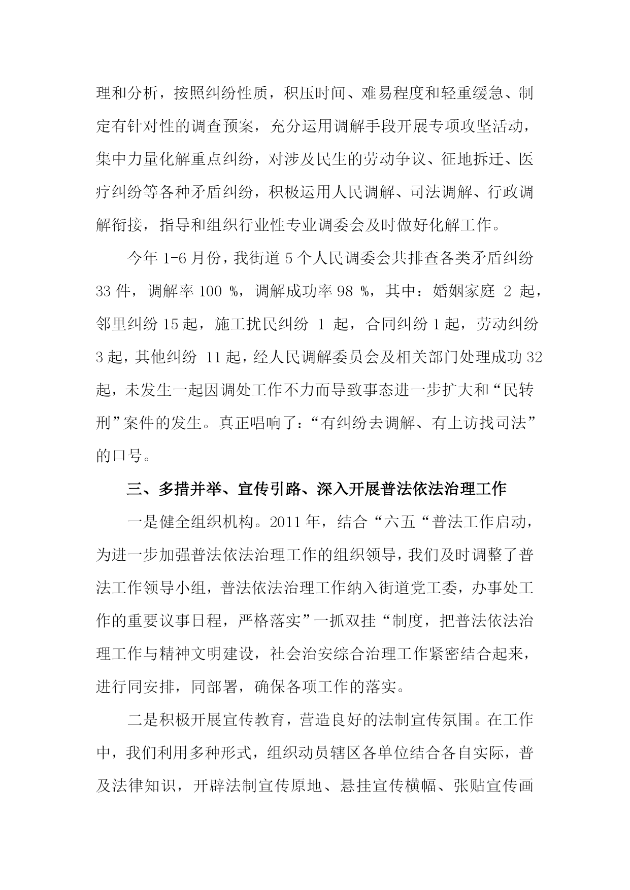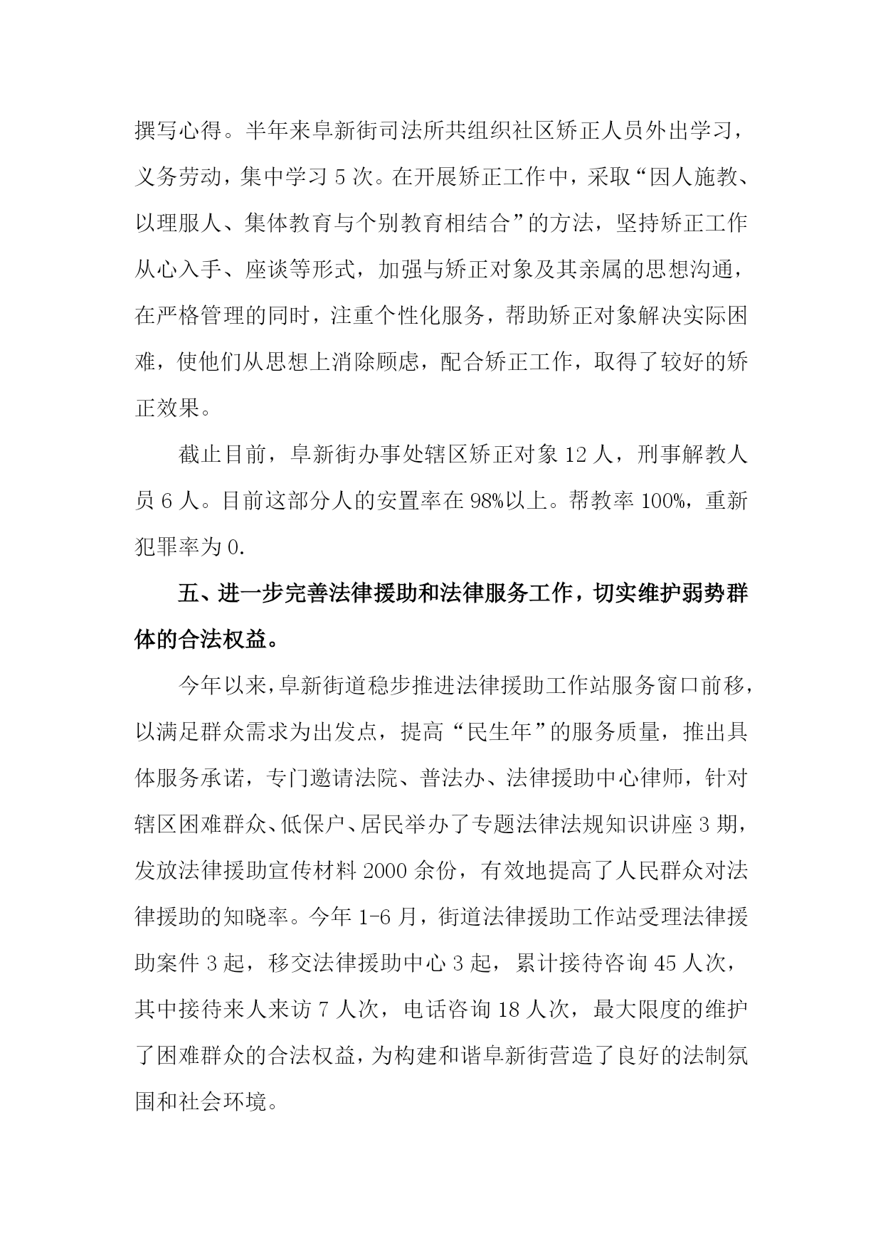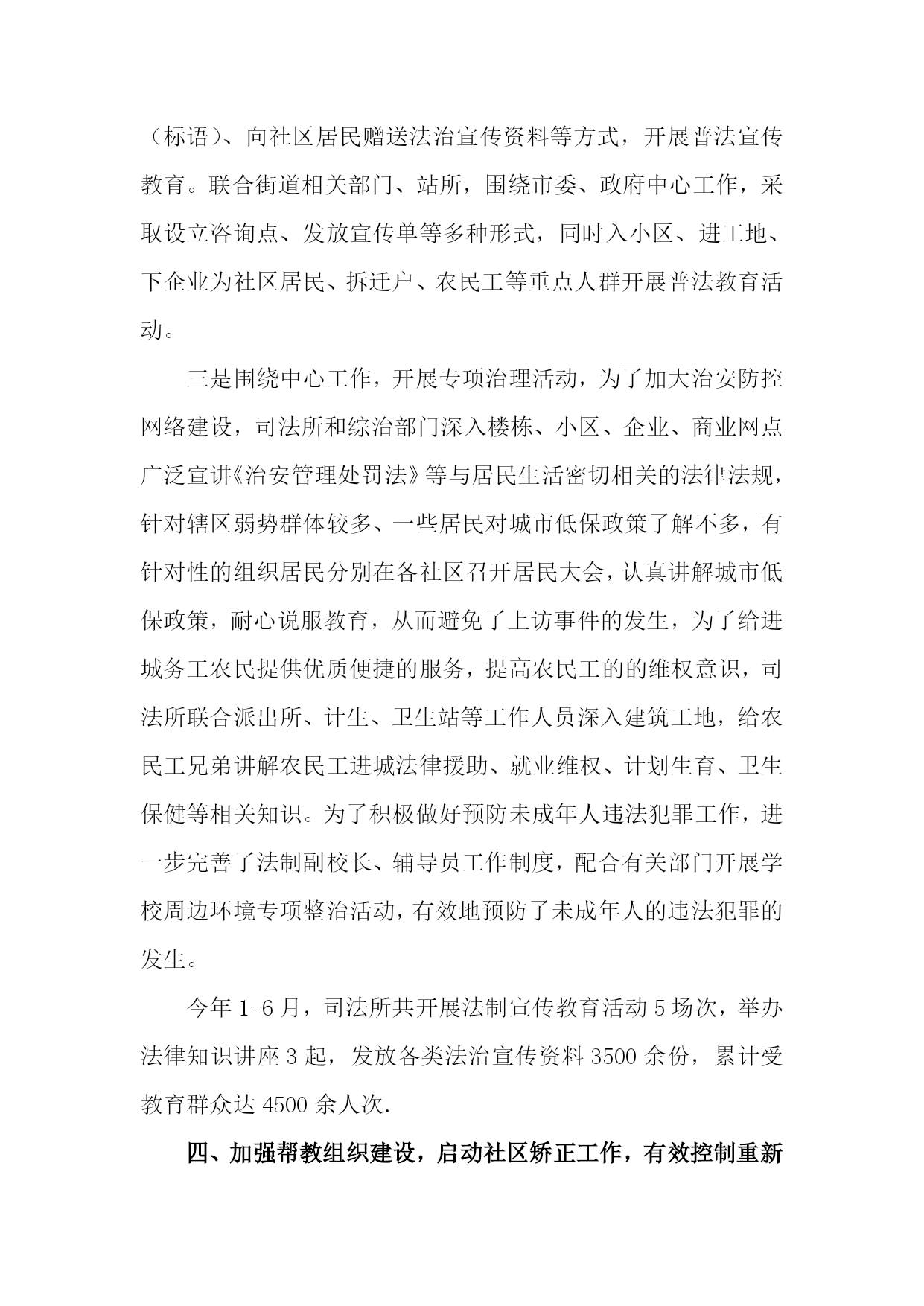 阜新街司法所司法行政工作汇报材料检查组各位领导:欢迎各位到阜新街司法所亲临检查指导工作,现将上半年工作汇报如下:2011年上半年,我办事处司法行政工作在市司法局的正确领导下,在街道党工委、办事处的大力支持下,全面落实科学发展观,牢固树立社会主义法治理念,以服务于街道工作大局为主线,以维护和保障辖区稳定为核心,以强化队伍为基础,充分发挥自身职能,努力探索新时期司法行政工作的新特点、新方法、新措施、开创司法行政工作的新局面。具体开展的工作、做法是:一、规范组织机构,着力提升整体形象阜康市阜新街办事处下辖4个社区居委会,有在编干部职工46人,机关干部和社区居委会工作人员89人。辖区划分为乌奇路以南,乌甘铁路以北,东至新村南路,西至工农兵大乔,总面积5平方公里,总户数6650户,总人口18590人,辖区共有42个行政企事业单位。有基层人民调解组5个,调解员39人;建立办事处矛盾纠纷调处机构1个。根据上级的要求,结合我办事处实际,年初,对司法所工作人员进行了调整和充实,通过调整,司法所现有工作人员2人,其中所长1人,1名协理员,且文化程度均在大专以上,司法所经过调整后,一方面从硬件设施上加大投入添置电脑打字设备,既方便了群众又提高了工作效率,另一方面从软件上我们通过积极参加上级组织的司法培训、个人报名参加法律函授、组织开展日常学习、实行工作体会交流等形式,下大力气提高司法干部的综合素质和工作能力,收到明显成效。在提升工作能力的同时,我们还通过召开专题会议,进一步完善了各项规章制度,规范了工作程序,促进了司法行政工作和法律服务工作的开展,提高了司法所的法律服务水平。二、规范调委会建设、提高调解队伍素质、增强化解社会矛盾纠纷的能力。阜新办事处现已成立人民调解委员会5个,共有调解员39名。办事处调委会通过实践形成了“加强阵地建设、完善调解制度、提升队伍工作能力”为主要内容的人民调解工作新格局。一是街道党工委、办事处将人民调解委员会标准化建设工作纳入了重要议事日程,列入同级综治工作通盘考虑,切实解决场所建设及调解工作中遇到的一些实际困难。党政一把手亲自听取汇报安排部署工作,分管领导具体抓,深入基层落实目标责任书。同时进一步不增加投入强化阵地建设,四个社区均已建立“五有四落实”的规范化调解室,已形成了组织建设规范化、网络化。截至目前,各社区人民调解委员会顺利通过规范化建设,消除了“空壳”社区现象,人民调解委员会规范化建设的整体水平得到提高。二是司法所人员积极到各社区调委会进行指导,通过社区间业务交流、法律知识学习、规范调解协议书制作,积极总结办案中的实践体会,重要分析,预测矛盾纠纷特点规律,发展趋势,做到了调解工作中有的放矢。各调委会认真开展纠纷排查调解工作,牢固树立到访无小事的观念,调处好每一件纠纷、半年来没有因调处不当引发民转刑案或群体性上访,自杀等激化案件,所达成的调解协议件件得到落实,无违法调解及协议为法院撤销的现象发生。三是加大矛盾纠纷排查力度,对易激化的纠纷及苗头及时处理控制,积极与派出所协调,对每月发生的易激化纠纷及疑难、遗留纠纷进行备案,并落实派出所、司法所、社区层层责任制,定期汇总调处,控制情况,做到情况明、底数清、措施到位,有力的防范了矛盾纠纷的扩大。四是整合资源,创新机制,增强人民调解工作综合效能,切实推进了社会矛盾化解,筑牢维稳第一道防线,结合办事处实际,建立了街道维稳调处中心,推出了联合调解工作模式,综合司法所、派出所、综治办、信访办等机构的力量,统一对咨询案件实行接待、咨询、分流、处理,实现了资源的有效整合,实现了治安、民调、信访联合接待。五是扎实做好化解矛盾纠纷人民调解专项攻坚活动。今年以来,阜新街司法所广泛动员人民调解组织和人民调解员深入社区、企业主动排查矛盾纠纷、及时发现陈年积怨和新的纠纷苗头,做好重点问题排查,不落项,重点人员排查不漏人,确保不留死角,盲点,对以往调解工作中遗留下来的矛盾纠纷进行认真统计、梳理和分析,按照纠纷性质,积压时间、难易程度和轻重缓急、制定有针对性的调查预案,充分运用调解手段开展专项攻坚活动,集中力量化解重点纠纷,对涉及民生的劳动争议、征地拆迁、医疗纠纷等各种矛盾纠纷,积极运用人民调解、司法调解、行政调解衔接,指导和组织行业性专业调委会及时做好化解工作。今年1-6月份,我街道5个人民调委会共排查各类矛盾纠纷33件,调解率100%,调解成功率98%,其中:婚姻家庭2起,邻里纠纷15起,施工扰民纠纷1起,合同纠纷1起,劳动纠纷3起,其他纠纷11起,经人民调解委员会及相关部门处理成功32起,未发生一起因调处工作不力而导致事态进一步扩大和“民转刑”案件的发生。真正唱响了:“有纠纷去调解、有上访找司法”的口号。三、多措并举、宣传引路、深入开展普法依法治理工作一是健全