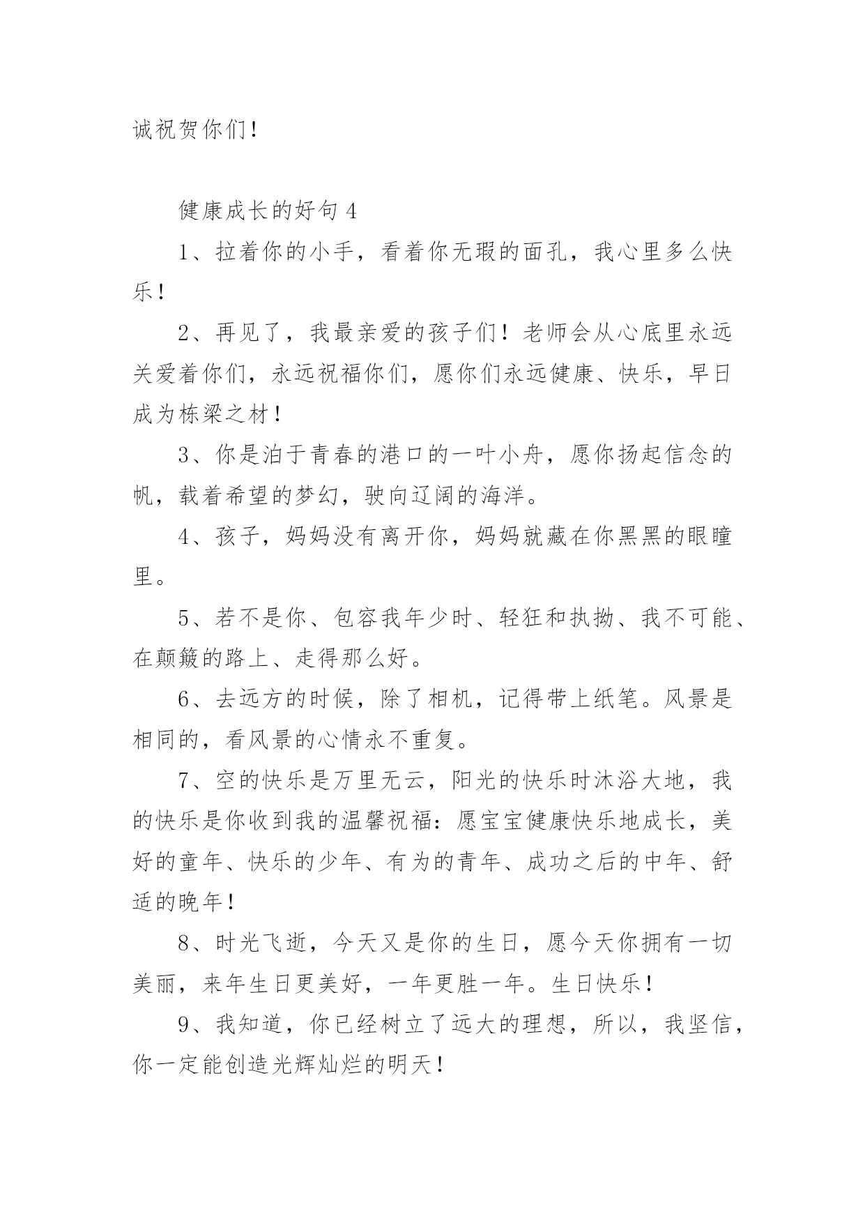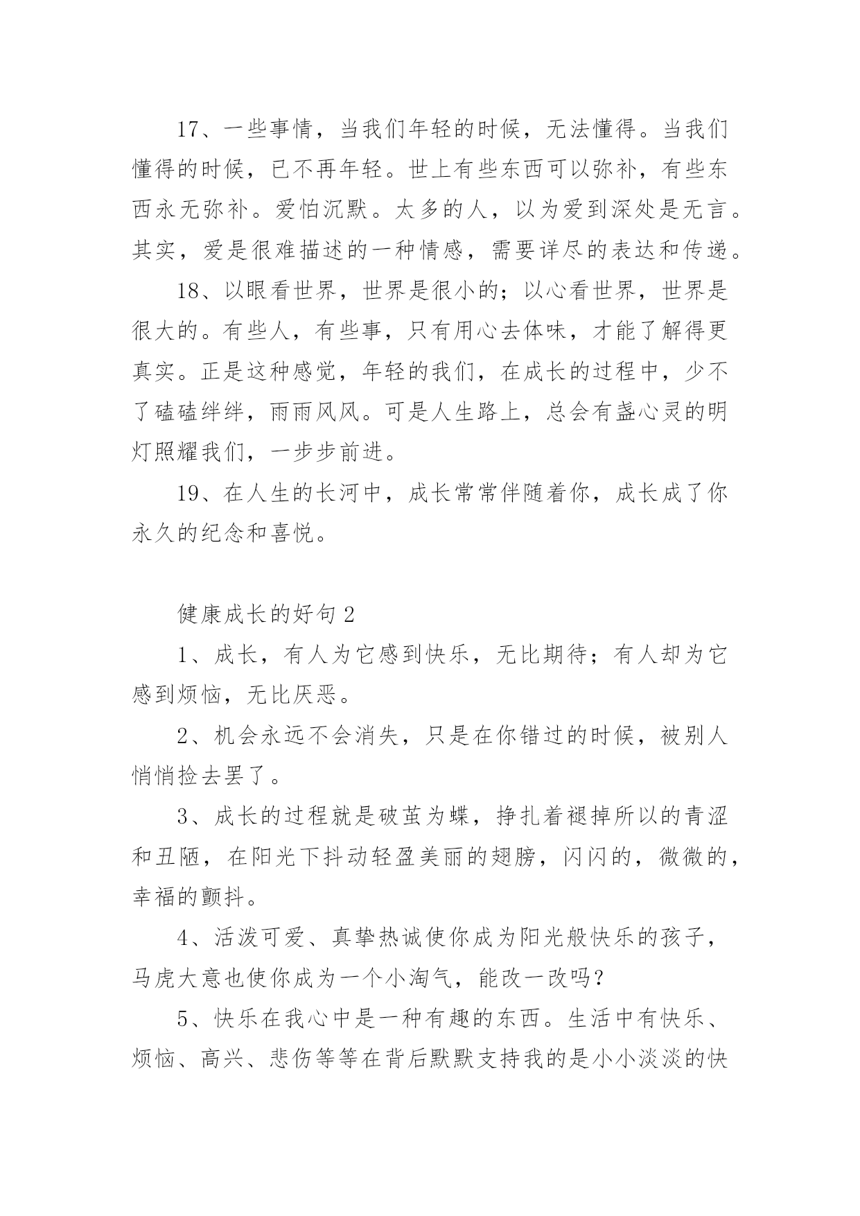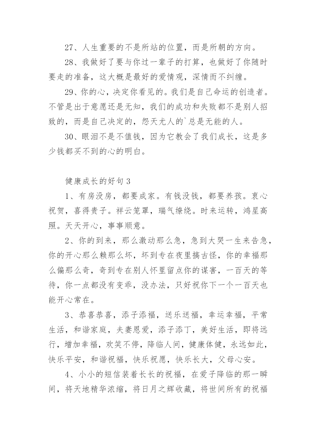 健康成长的好句成长,一般指长大、长成成人,也泛指事物走向成熟,摆脱稚嫩的过程。简而言之,就是自身不断变得成熟稳重的一个变化过程。下面是小编收集整理的健康成长的好句,希望对你有帮助。健康成长的好句11、爱那么短,遗忘那么长。2、不要在意别人在背后怎么看你说你,编造关于你的是非,甚至是攻击你。人贵在大气,要学会对自己说,如果这样说能让你们满足,我愿意接受。并请相信,真正懂你的人绝不会因为那些有的没的而否定你。3、成长的过程就是破茧为蝶,挣扎着褪掉所以的青涩和丑陋,在阳光下抖动轻盈美丽的翅膀,闪闪的,微微的,幸福的颤抖。4、成长就像剥洋葱,剥掉一层就会留一次眼泪。5、成长是放在床头的那一摞摞的武侠小说。英雄美人,侠客伴侣,一部一部惊心动魄,荡气回肠。6、成长是缓缓流淌的溪流。悄然地,我们就长大了。7、成长是色彩的变幻。不见了童话书上多彩的封面,看到的是教科书一脸的严肃。8、成长是锁在抽屉里那带锁的日记本,记录了喜怒哀乐,苦辣酸甜,记录了青春的烦恼和喜欢的那个男孩9、成长是无尽的阶梯。一步一步的攀登,回望来时路,会心一笑;转过头,面对前方,无言而努力的继续攀登。10、成长是一次次的蜕皮。蜕皮是痛苦,是流血,有风险,有失败;但也是对未来的憧憬和期待,变得成熟与美丽。11、成长是一篇等待谱写的乐章,等待着我们谱写出一个个扣人心弦的乐符。12、成长是摘抄本上的一首首小诗。或欢快或哀怨,开心时高声吟唱,低落时黯然泪流。13、很多事情的发展注定有个结束,好好享受美丽的过程,擦身而过的时候,我们应该学会遗忘,放声的笑一回,大胆的哭一场,抬头望一望,一片灿烂的阳光,相信时间可以改变一切!不要轻易让自己掉眼泪。14、每个人都有自己成长的历程。从呀呀学语的儿童,到风华正茂的中学生,到将来走向社会,成为社会的有用之才,每一个成长的过程都饱含了我们奋斗的汗水。15、每个人在成长中都会受很多伤,会哭泣悲伤,会觉得痛。许多事情,总是在经历过后才明白。痛过了,便坚强了;跨过了,便成熟了;傻过了,便懂得了适时的珍惜与放弃。16、我们的一生,是一段充满冒险与考验的旅程,这段旅程会有惊喜,会有欢乐,当然,也不免交织着苦涩,交织着迷茫。由于无法预测下一步将会发生什么,因此我们都充满了期待。只有懂得在考验中磨练自己,才能体现人生的价值,才会逐步成长。17、一些事情,当我们年轻的时候,无法懂得。当我们懂得的时候,已不再年轻。世上有些东西可以弥补,有些东西永无弥补。爱怕沉默。太多的人,以为爱到深处是无言。其实,爱是很难描述的一种情感,需要详尽的表达和传递。18、以眼看世界,世界是很小的;以心看世界,世界是很大的。有些人,有些事,只有用心去体味,才能了解得更真实。正是这种感觉,年轻的我们,在成长的过程中,少不了磕磕绊绊,雨雨风风。可是人生路上,总会有盏心灵的明灯照耀我们,一步步前进。19、在人生的长河中,成长常常伴随着你,成长成了你永久的纪念和喜悦。健康成长的好句21、成长,有人为它感到快乐,无比期待;有人却为它感到烦恼,无比厌恶。2、机会永远不会消失,只是在你错过的时候,被别人悄悄捡去罢了。3、成长的过程就是破茧为蝶,挣扎着褪掉所以的青涩和丑陋,在阳光下抖动轻盈美丽的翅膀,闪闪的,微微的,幸福的颤抖。4、活泼可爱、真挚热诚使你成为阳光般快乐的孩子,马虎大意也使你成为一个小淘气,能改一改吗?5、快乐在我心中是一种有趣的东西。生活中有快乐、烦恼、高兴、悲伤等等在背后默默支持我的是小小淡淡的快乐。6、有时候想想,最大的悲哀莫过于长大。从此以后,笑不再纯粹,哭也不再彻底。7、为什么我们越长大,越孤单,越不安,越不快乐?因为我们在追求快乐的过程中,离真实的自己越来越远了。8、别人永远感受不到自己的痛苦,不要去倾诉,做好自己就好。9、说话不要有攻击性,不要有杀伤力,不夸已能,不扬人恶,自然能化敌为友。10、人世间的一切不平凡,最后都要回归平凡,都要用平凡生活来衡量其价值。伟大精彩成功都不算什么,只有把平凡生活真正过好,人生才是圆满。11、当我们拥有一只鞋子的时候,我们才会明白失去的另一只鞋子的滋味,失去的东西总是最好的。12、孩子,你甜甜的笑真惹人爱!愿你的生活永远充满欢乐!13、我们的距离,只有一颗心的距离,你中有我,我中有你。牵着你的手,赋予我爱情的魔力,对你说着我爱你,一心一意,彼此相惜。14、征服畏惧、建立自信的最快最确实的方法,就是去做你害怕的事,直到你获得成功的经验。15、童话里王子永远只爱公主一个人,那是童话,要保留纯净。现实是,公主和王子都已经慢慢长大,人和人之间会渐行渐远。城堡已经凋敝,粉红的玫瑰早就开始败色。16、恒久不变的浓浓的爱,化作你发奋求知的动力,助你达到理想的彼岸。祝愿你健康永远,爱心永恒!17、成长的烦恼是我们开始理智思索的开始;成长的烦恼是我们人生必