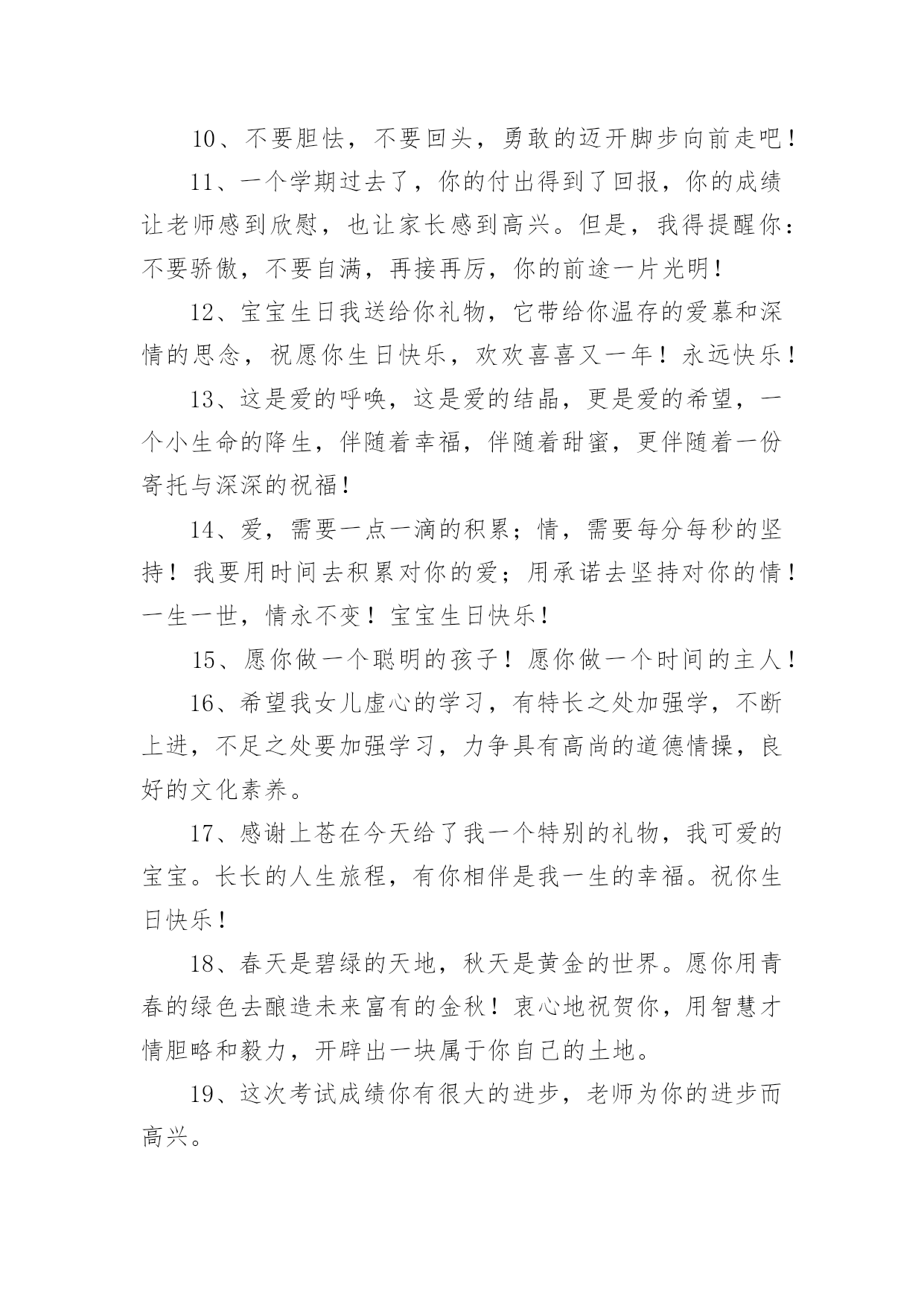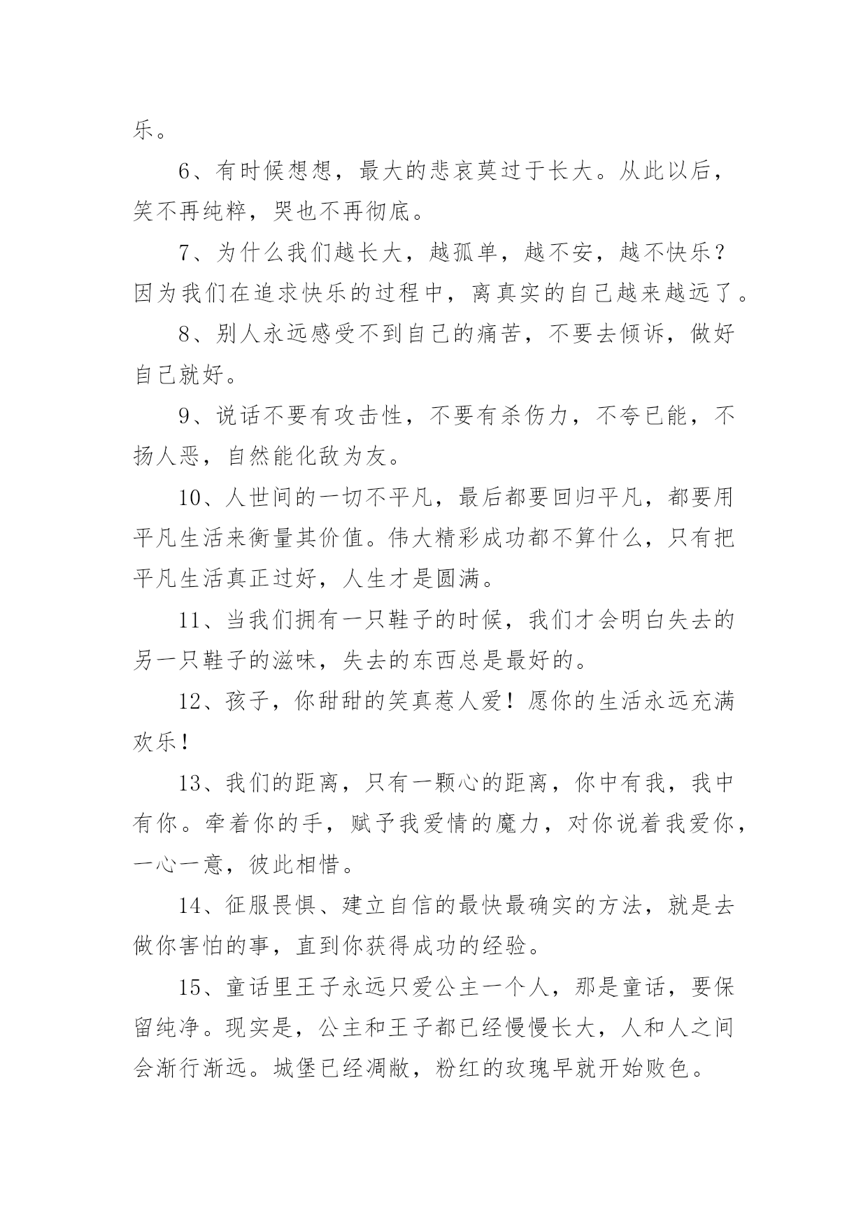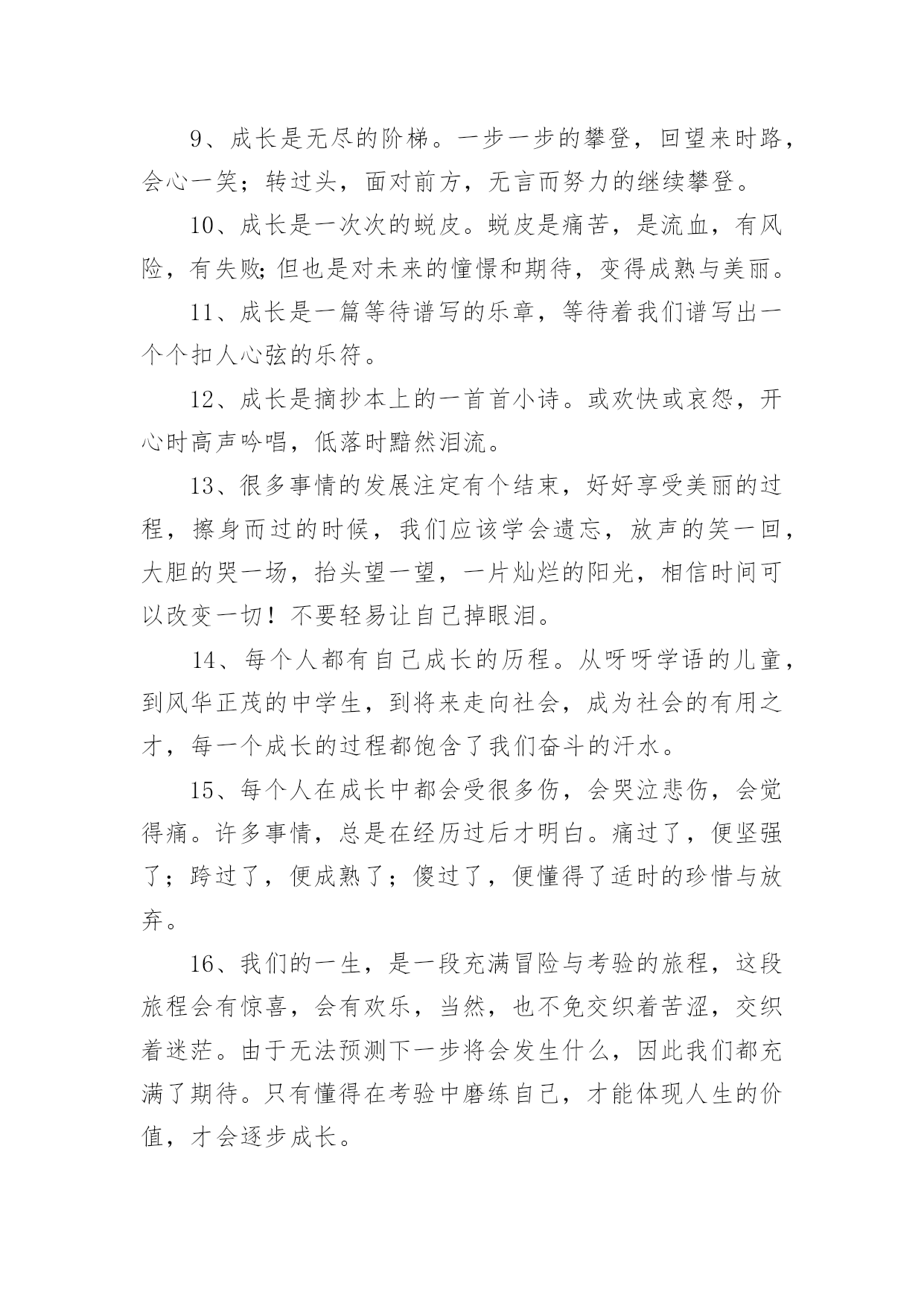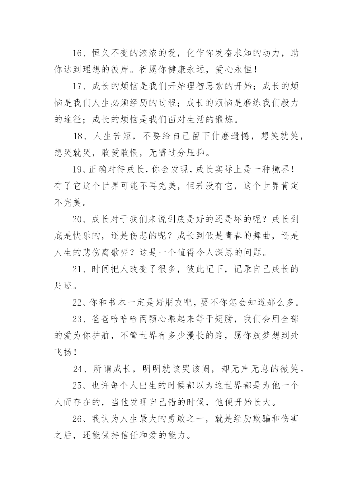 健康成长的好句成长,一般指长大、长成成人,也泛指事物走向成熟,摆脱稚嫩的过程。简而言之,就是自身不断变得成熟稳重的一个变化过程。下面是小编收集整理的健康成长的好句,希望对你有帮助。健康成长的好句11、爱那么短,遗忘那么长。2、不要在意别人在背后怎么看你说你,编造关于你的是非,甚至是攻击你。人贵在大气,要学会对自己说,如果这样说能让你们满足,我愿意接受。并请相信,真正懂你的人绝不会因为那些有的没的而否定你。3、成长的过程就是破茧为蝶,挣扎着褪掉所以的青涩和丑陋,在阳光下抖动轻盈美丽的翅膀,闪闪的,微微的,幸福的颤抖。4、成长就像剥洋葱,剥掉一层就会留一次眼泪。5、成长是放在床头的那一摞摞的武侠小说。英雄美人,侠客伴侣,一部一部惊心动魄,荡气回肠。6、成长是缓缓流淌的溪流。悄然地,我们就长大了。7、成长是色彩的变幻。不见了童话书上多彩的封面,看到的是教科书一脸的严肃。8、成长是锁在抽屉里那带锁的日记本,记录了喜怒哀乐,苦辣酸甜,记录了青春的烦恼和喜欢的那个男孩9、成长是无尽的阶梯。一步一步的攀登,回望来时路,会心一笑;转过头,面对前方,无言而努力的继续攀登。10、成长是一次次的蜕皮。蜕皮是痛苦,是流血,有风险,有失败;但也是对未来的憧憬和期待,变得成熟与美丽。11、成长是一篇等待谱写的乐章,等待着我们谱写出一个个扣人心弦的乐符。12、成长是摘抄本上的一首首小诗。或欢快或哀怨,开心时高声吟唱,低落时黯然泪流。13、很多事情的发展注定有个结束,好好享受美丽的过程,擦身而过的时候,我们应该学会遗忘,放声的笑一回,大胆的哭一场,抬头望一望,一片灿烂的阳光,相信时间可以改变一切!不要轻易让自己掉眼泪。14、每个人都有自己成长的历程。从呀呀学语的儿童,到风华正茂的中学生,到将来走向社会,成为社会的有用之才,每一个成长的过程都饱含了我们奋斗的汗水。15、每个人在成长中都会受很多伤,会哭泣悲伤,会觉得痛。许多事情,总是在经历过后才明白。痛过了,便坚强了;跨过了,便成熟了;傻过了,便懂得了适时的珍惜与放弃。16、我们的一生,是一段充满冒险与考验的旅程,这段旅程会有惊喜,会有欢乐,当然,也不免交织着苦涩,交织着迷茫。由于无法预测下一步将会发生什么,因此我们都充满了期待。只有懂得在考验中磨练自己,才能体现人生的价值,才会逐步成长。17、一些事情,当我们年轻的时候,无法懂得。当我们懂得的时候,已不再年轻。世上有些东西可以弥补,有些东西永无弥补。爱怕沉默。太多的人,以为爱到深处是无言。其实,爱是很难描述的一种情感,需要详尽的表达和传递。18、以眼看世界,世界是很小的;以心看世界,世界是很大的。有些人,有些事,只有用心去体味,才能了解得更真实。正是这种感觉,年轻的我们,在成长的过程中,少不了磕磕绊绊,雨雨风风。可是人生路上,总会有盏心灵的明灯照耀我们,一步步前进。19、在人生的长河中,成长常常伴随着你,成长成了你永久的纪念和喜悦。健康成长的好句21、成长,有人为它感到快乐,无比期待;有人却为它感到烦恼,无比厌恶。2、机会永远不会消失,只是在你错过的时候,被别人悄悄捡去罢了。3、成长的过程就是破茧为蝶,挣扎着褪掉所以的青涩和丑陋,在阳光下抖动轻盈美丽的翅膀,闪闪的,微微的,幸福的颤抖。4、活泼可爱、真挚热诚使你成为阳光般快乐的孩子,马虎大意也使你成为一个小淘气,能改一改吗?5、快乐在我心中是一种有趣的东西。生活中有快乐、烦恼、高兴、悲伤等等在背后默默支持我的是小小淡淡的快乐。6、有时候想想,最大的悲哀莫过于长大。从此以后,笑不再纯粹,哭也不再彻底。7、为什么我们越长大,越孤单,越不安,越不快乐?因为我们在追求快乐的过程中,离真实的自己越来越远了。8、别人永远感受不到自己的痛苦,不要去倾诉,做好自己就好。9、说话不要有攻击性,不要有杀伤力,不夸已能,不扬人恶,自然能化敌为友。10、人世间的一切不平凡,最后都要回归平凡,都要用平凡生活来衡量其价值。伟大精彩成功都不算什么,只有把平凡生活真正过好,人生才是圆满。11、当我们拥有一只鞋子的时候,我们才会明白失去的另一只鞋子的滋味,失去的东西总是最好的。12、孩子,你甜甜的笑真惹人爱!愿你的生活永远充满欢乐!13、我们的距离,只有一颗心的距离,你中有我,我中有你。牵着你的手,赋予我爱情的魔力,对你说着我爱你,一心一意,彼此相惜。14、征服畏惧、建立自信的最快最确实的方法,就是去做你害怕的事,直到你获得成功的经验。15、童话里王子永远只爱公主一个人,那是童话,要保留纯净。现实是,公主和王子都已经慢慢长大,人和人之间会渐行渐远。城堡已经凋敝,粉红的玫瑰早就开始败色。16、恒久不变的浓浓的爱,化作你发奋求知的动力,助你达到理想的彼岸。祝愿你健康永远,爱心永恒!17、成长的烦恼是我们开始理智思索的开始;成长的烦恼是我们人生必