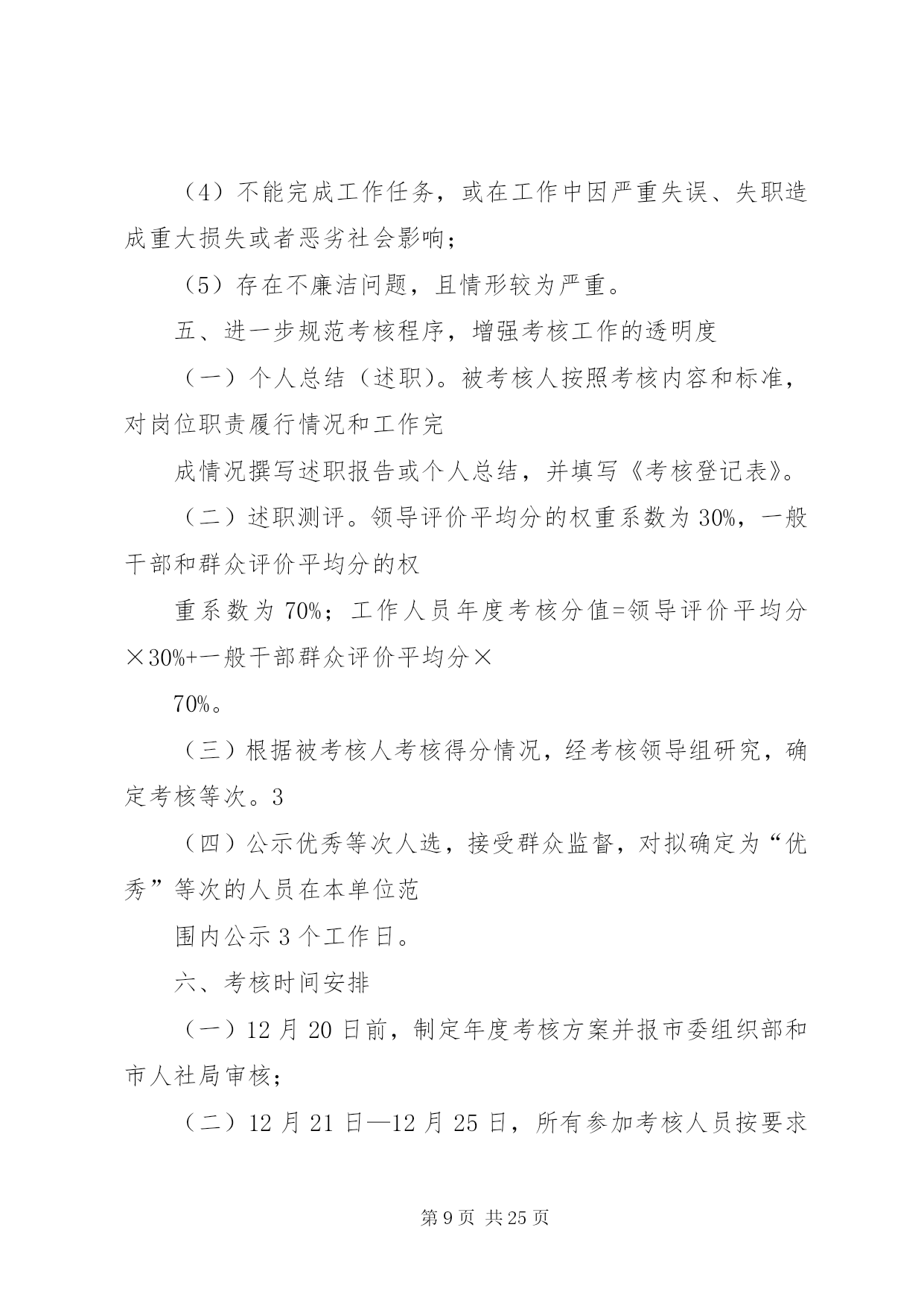 第PAGE\*Arabic\*MERGEFORMAT25页共NUMPAGES\*MERGEFORMAT25页公务员考核实施方案篇一:年度考核实施方案2015年年终绩效考核实施办法(试行)第一章总则一、考核目的1、根本目的:为正确评价与总结员工2015年度的绩效,更好地激励与挖掘员工的潜能,强化员工的责任与竞争意识,提高组织整体效能,推动员工与学院共同发展,特制订本办法。2、直接目的:考核结果将作为工资调整、奖金分配、职务升降、岗位调动和员工培训的参考。二、考核范围2015年12月31日前已正式通过试用期考核的在职员工。三、考核原则1、以提高员工绩效为导向;2、定性与定量考核相结合;3、公平、公正;4、多角度考核。四、考核组织和责任1、办公室(1)负责考核办法的制定、通知和组织实施;(2)负责向学院领导汇报考核情况并提供分析报告供其参考;(3)负责对员工有关考核问题的投拆,进行调查处理。2、各部门(1)各评估人和被考核者应按时、如实提供考核数值;(2)直接领导对考核结果的完整、公正、合理性负责;间接领导对考核结果负有监督责任。第二章员工的考核一、考核方法1、考核内容年度工作业绩、工作能力、工作态度及学习成长,各项考核要素详见附表一:《员工综合考核表》(员工级)。2、评分标准根据不同项目分值也不同,打分分差为1分。详见附件二。《指标的评分标准》二、考核程序三、考核结果处理按照下表,绩效工资从2016年元月开始做相应调整,年终奖比例按照四、绩效投诉与处理如员工对个人绩效结果持异议。可向办公室主任提出绩效复议的要求。办公室主任需在保护员工隐私权的前提下对员工绩效进行复议,并于2个工作日内与员工沟通并作书面回复。第三章附则一、保密管理1、全部考核结果只对部门主任、办公室主任及学院领导公开。2、员工考核成绩除通知被考核者本人外,只告知其部门主任。3、考核结果及所有考核文档全部由人力资部存盘。4、任何人不得随意评论考核结果,并将其告诉无关人员二、本办法的解释权归学院办公室。三、附件附件1员工综合考核表姓名:职位:部门:年月日附件2指标的评分标准表篇二:2014年度考核方案东落堡小学2013年度教师考核方案为认真贯彻执行教育局(2014)30号文件精神,,正确评价全校教职工的德才表现和工作实绩,督促教职工提高业务素质,认真履行岗位职责,为其调整岗位、工资以及聘任、奖励、培训等提供依据,根据中心《关于做好2013年度考核工作的实施办法》的精神,结合我校实际情况,特制定本方案。一、考核的原则(一)客观公正、民主公开、注重实绩的原则。(二)领导考核与群众评议相结合、定性与定量相结合、平时考核与定期考核相结合的原则。(三)考真考实、简便易行的原则。二、考核的范围全校在编在岗的教职工。三、考核内容和标准1、教职工的年度考核内容包括:德、能、勤、绩、廉五个方面,重点考核工作实绩。德:是指思想政治素质及个人品德、职业道德、社会公德等方面的表现,对师德考核不合格的实行一票否决制。能:是指履行职责的业务素质和工作能力。勤:是指责任心、工作态度、工作作风等方面的表现。绩:是指工作数量、质量、效率和所取得的成绩。廉:是指廉洁自律方面的表现。2、考核标准以本校教职工的岗位职责和年度目标工作任务完成情况为基本依据。“教师任职情况的考核”根据考核评价的分值确定优秀比例和名次顺序,被确定为年度考核优秀等次人员应在“教职工职业道德情况考核”优秀人员内产生,并控制在乡中心下达指标额度之内。3、年度考核等次分为“优秀、合格、基本合格、不合格”四个等次,各等次的基本标准执行上级文件精神。四、考核程序及办法:1、成立考核领导小组,制定考核工作实施方案。(2014年3月4日):2、召开全体教师会议,公布考核实施方案,被考核人员进行个人总结,填写《事业单位工作人员年度考核登记表》进行民主测评。3、考核小组审核打分(3月5日):考核工作小组根据民主测评结合被考核人的表现讨论确定考核等次。4、优秀考核名单公示征询意见(3月5-6日):由考核领导小组评议确定年度考核优秀的人员名单,在学校张榜公示征询意见。7、考核结果通知被考核人确认签字(3月6日):被考核人需在《年度考核登记表》上签名。8、考核结果汇总材料上报乡教育中心(3月6日):包括2013年度考核小组领导成员名单、年度考核工作方案,2013年度考核登记表。相关材料进行整理存档,考核工作结束。附:东落堡小学教师年度考核领导小组组长:王峰成员:卢秀玲陈桂霞肖金香东落堡小学2014年3月4日篇三:2012年度考核实施方案xx镇2012年度考核实施方案为认真做好xx镇2012年度机关事业单位工作人员年度考核工作,根据XX县区考核委员会下发的《关于xx市二0一一年度考核工作的通知》文件精神,结合我镇实际,特制定本年度考