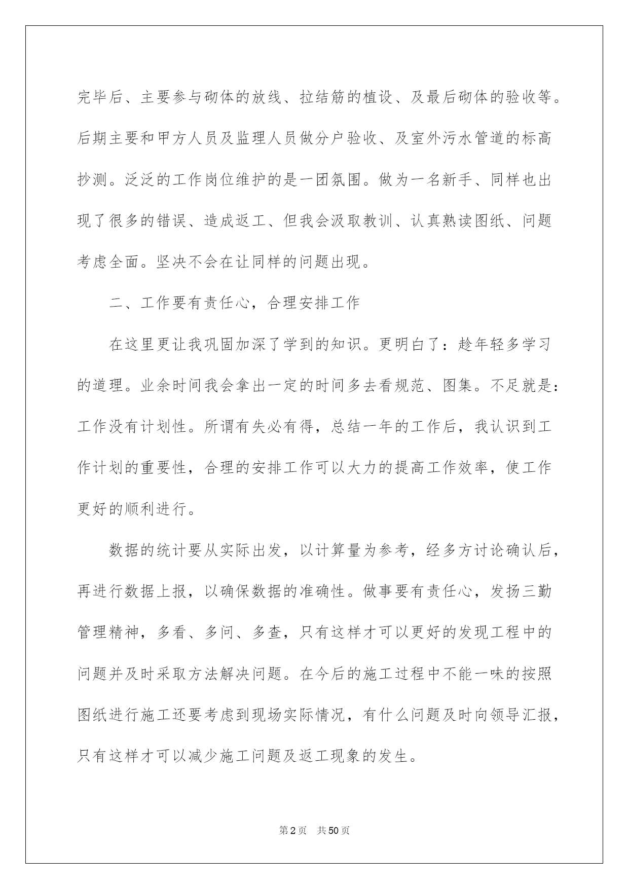 第PAGE\*Arabic\*MERGEFORMAT50页共NUMPAGES\*Arabic\*MERGEFORMAT50页第PAGE\*MERGEFORMAT50页共NUMPAGES\*MERGEFORMAT50页第PAGE\*MERGEFORMAT50页共NUMPAGES\*MERGEFORMAT50页第PAGE\*MERGEFORMAT50页共NUMPAGES\*MERGEFORMAT50页第PAGE\*MERGEFORMAT50页共NUMPAGES\*MERGEFORMAT50页第PAGE\*MERGEFORMAT50页共NUMPAGES\*MERGEFORMAT50页第PAGE\*MERGEFORMAT50页共NUMPAGES\*MERGEFORMAT50页第PAGE\*MERGEFORMAT50页共NUMPAGES\*MERGEFORMAT50页第PAGE\*MERGEFORMAT50页共NUMPAGES\*MERGEFORMAT50页第PAGE\*MERGEFORMAT50页共NUMPAGES\*MERGEFORMAT50页第PAGE\*MERGEFORMAT50页共NUMPAGES\*MERGEFORMAT50页2022技术部门个人年终工作总结技术部门个人年终工作总结总结就是对一个时期的学习、工作或其完成情况进行一次全面系统的回顾和分析的书面材料,它能够使头脑更加清醒,目标更加明确,让我们来为自己写一份总结吧。但是总结有什么要求呢?下面是我为大家收集的技术部门个人年终工作总结,希望能够帮助到大家。技术部门个人年终工作总结1转眼间,辞旧迎新、平凡而又不太忙碌的一年已到尽头,不知不觉时间过的真快,悄然无息、20xx年的日历即将翻过去。伴随着时代前进的步伐、回首自己一年来经历的风雨路程、对自己工作中的不足、我做出如下工作总结:一、务实工作、自我加压、认真工作、有得有失自己着手参加的第一个住宅工程已经竣工,我们主抓质量、进度使规定期间内竣工。同时也让我学会了一些施工工序、包括图纸的一些细部构造、及公司规定的一些细部做法、及技术资料的整理等。包括为人处事都有很大的改进,也为自己积累了一定的经验。主体施工完毕后、主要参与砌体的放线、拉结筋的植设、及最后砌体的验收等。后期主要和甲方人员及监理人员做分户验收、及室外污水管道的标高抄测。泛泛的工作岗位维护的是一团氛围。做为一名新手、同样也出现了很多的错误、造成返工、但我会汲取教训、认真熟读图纸、问题考虑全面。坚决不会在让同样的问题出现。二、工作要有责任心,合理安排工作在这里更让我巩固加深了学到的知识。更明白了:趁年轻多学习的道理。业余时间我会拿出一定的时间多去看规范、图集。不足就是:工作没有计划性。所谓有失必有得,总结一年的工作后,我认识到工作计划的重要性,合理的安排工作可以大力的提高工作效率,使工作更好的顺利进行。数据的统计要从实际出发,以计算量为参考,经多方讨论确认后,再进行数据上报,以确保数据的准确性。做事要有责任心,发扬三勤管理精神,多看、多问、多查,只有这样才可以更好的发现工程中的问题并及时采取方法解决问题。在今后的施工过程中不能一味的按照图纸进行施工还要考虑到现场实际情况,有什么问题及时向领导汇报,只有这样才可以减少施工问题及返工现象的发生。三、工作建议明年开春将会进行拉结筋植设及砌体抹灰工作、这个时候一定要严加谨慎、看好图纸坚决一遍成活、不能造成返工及丢三落四、留尾巴的现象。进行主体施工时、一定要认真、严肃、从大局着想、楼层标高控制好。楼层标高控制好、放线完毕最后要进行较线。要想干好技术工作,就首先要自我营造一个良好的工作氛围。让周围的人认同你,技术工作要依靠大家的,单凭个人能力、一双眼睛、一个脑袋是无法发现这么多现场问题的。干技术员的阶段是搞施工打基础的阶段。施工现场的实际经验的获取和累积,人际关系的基本架构的形成,包括自身处事做事的风格的确立,都是在这一阶段。技术部门个人年终工作总结2时间一晃而过,转眼间来到公司已有了一年,在这一段时间里,在公司领导的精心培育和教导下,加上自身的不断努力,无论是思想上、学习上还是工作上,都取得了长足的发展和巨大的收获,这是我人生中弥足珍贵的经历,也给我留下了精彩而美好的回忆。回顾这一年来的工作,我有很多的感想和体会。现总结如下一、思想方面刚加入公司,在公司领导和同事的指导下,使我在较短的时间内适应了公司的工作环境。在这一年的生活和工作中,我一直能够严格的要求自己,认真、细心且具有较强的责任心和进取心,富于工作热情与团队协作能力,确实完成领导交付的工作,和公司同事之间能够通力