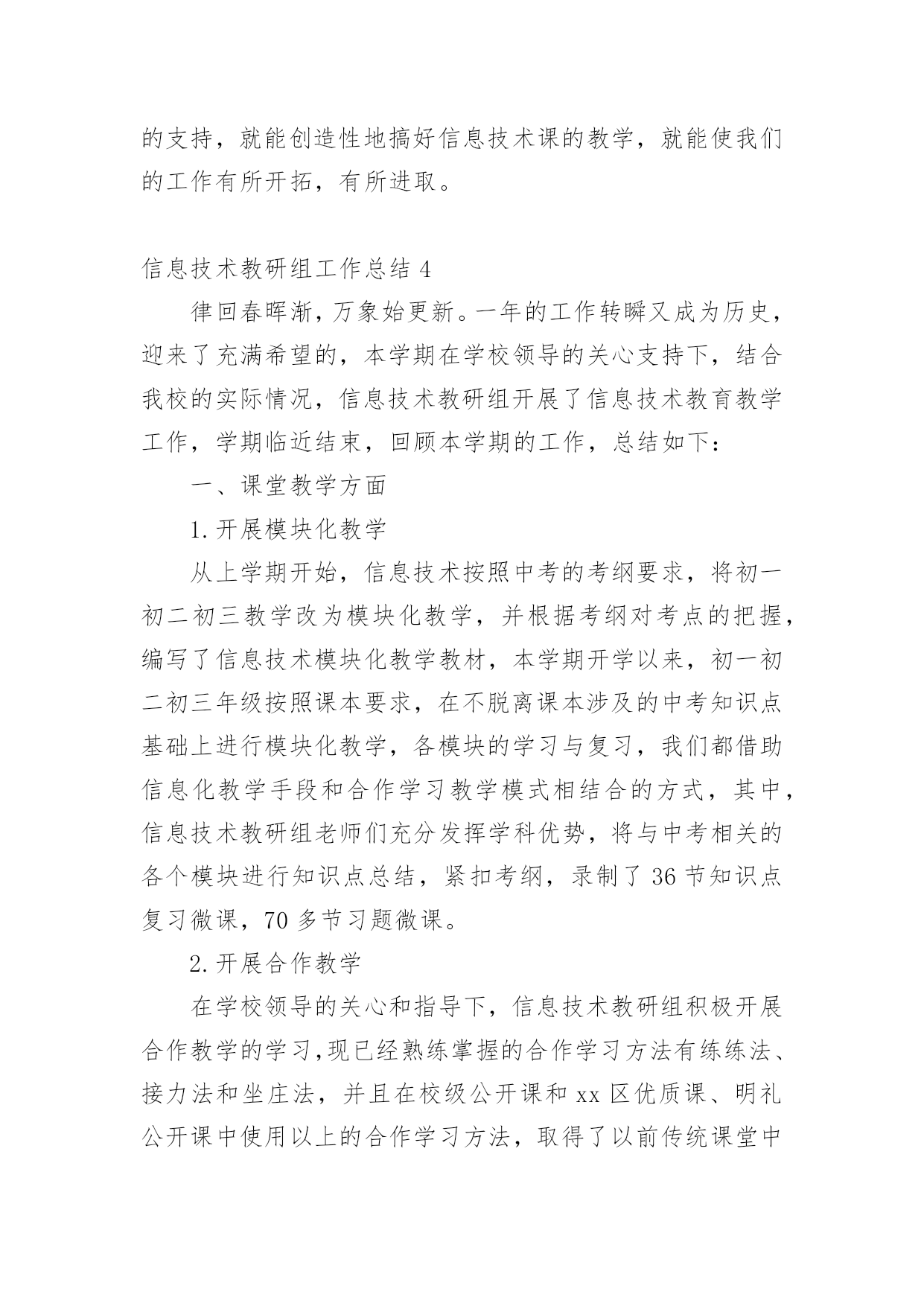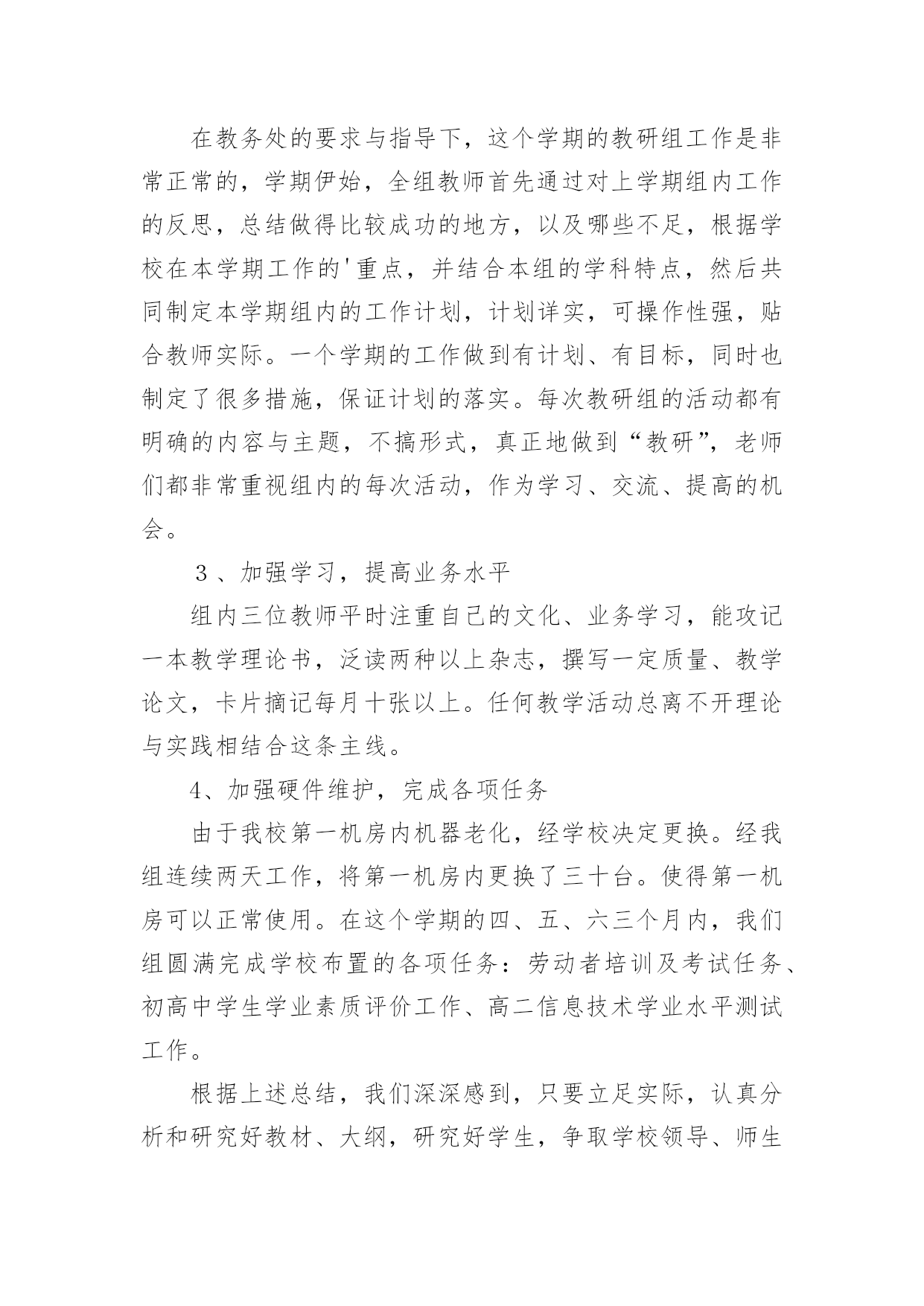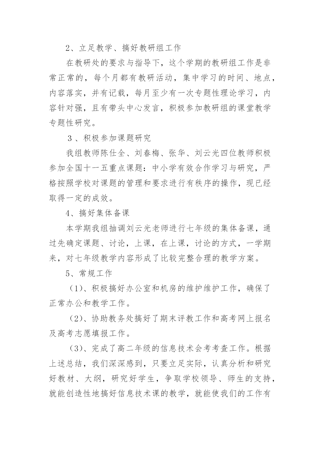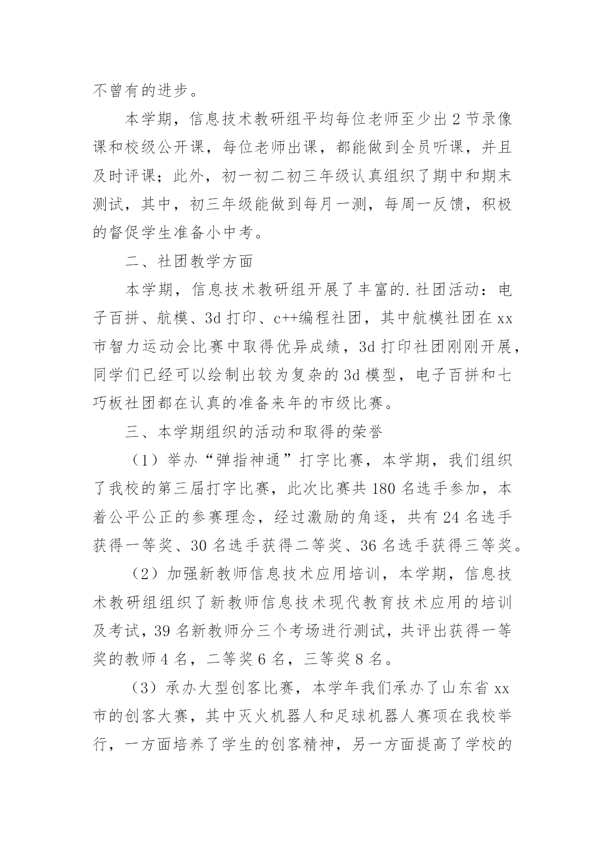 信息技术教研组工作总结信息技术教研组工作总结18篇总结就是把一个时段的学习、工作或其完成情况进行一次全面系统的总结,它可以促使我们思考,让我们好好写一份总结吧。但是总结有什么要求呢?以下是小编为大家收集的信息技术教研组工作总结,欢迎阅读与收藏。信息技术教研组工作总结1在学校领导的关心支持下,我们信息技术组的老师也在这个学期立足实际、搞好教学,并且不断更新知识、提高自身素质,现将这个学期教研组工作总结如下:1、立足实际、搞好教学。我校的学生在信息技术方面的情况比较特殊,因为拥有一些转学生,与其它学科不同的是这些转学生之前从没有学过信息技术,在这方面是个空白,甚至不知道鼠标的用法,不知道开关机的方法,而其他的学生呢?已经会在网上邻居查找游戏,知道怎么将一个文件夹共享、隐藏、给共享加访问权限,有的.时候老师都拿他没有办法。怎样让一个从未接触过信息技术知识的学生,熟练地掌握最基本的知识,我们组的老师进行了“分层教学”的模式,并加强个别辅导、实现同学间一帮一、多帮一,基本解决了常规教学中难以攻克的难题。2、立足教学、搞好教研组工作在教研处的要求与指导下,这个学期的教研组工作是非常正常的,每个月都有教研活动,集中学习的时间、地点,内容落实,并有记载,每月至少有一次专题性理论学习,内容针对强,且有带头中心发言,积极参加教研组的课堂教学专题性研究。3、积极参加课题研究我组教师陈仕全、刘春梅、张华、刘云光四位教师积极参加全国十一五重点课题:中小学有效合作学习与研究,严格按照学校对课题的管理和要求进行有秩序的操作,现已经取得一定的成效。4、搞好集体备课本学期我组抽调刘云光老师进行七年级的集体备课,通过先确定课题、讨论,上课,在上课,讨论的方式,一学期来,对七年级教学内容形成了比较完整合理的教学方案。5、常规工作(1)、积极搞好办公室和机房的维护维护工作,确保了正常办公和教学工作。(2)、协助教务处搞好了期末评教工作和高考网上报名及高考志愿填报工作。(3)、完成了高二年级的信息技术会考考查工作。根据上述总结,我们深深感到,只要立足实际,认真分析和研究好教材、大纲,研究好学生,争取学校领导、师生的支持,就能创造性地搞好信息技术课的教学,就能使我们的工作有所开拓,有所进取。但也存在很多工作中的不足,需要全组教师继续努力,认真钻研教学,更加提高自身的教学能力,从而为教学服务。信息技术教研组工作总结2本学期信息技术组教研活动以学校教务处工作计划为指导,以促进学生素质、技能提高为目标。强化本组专业建设,以课堂教学和实训作为提高教学质量的突破口,全面促进学生的素质和技能的提高。在全组老师的共同努力下,本学期取得了较好的成绩。现将本学期教研组工作总结如下:1、加强教学常规管理检查工作,做好教学计划、教案、课堂教学、作业及辅导、听课、职业技能展示、学生成绩考核等教学环节督促检查。2、积极组织本组教师参加各级教研活动,开展听课、评课、教学经验交流等活动,营造良好的教学教研氛围,提高本组老师教学教研与专业技术水平。3、组织开展校内信息技术学科“技能竞赛”活动,以达到“以赛促教,以赛促学”的'目的,促进了学生学习专业课程的积极性,展示学生的专业技能水平。4、重视学生机房的管理维护,提高设备的使用效率,做好教学服务管理和指导。本学期重点研究“锐起无盘系统”的应用,并将之应用于学生机房,这一研究不仅为学校节约了大笔开支,而且为机房的管理与维护提供了方便。5、承担校园内所有多媒体设备的维护、维修工作,这一学期,共维护多媒体设备两百余次,排除网络故障二十多次,使学校教学工作得以顺利进行。根据上述总结,我们将立足实际,在教学教研工作中定能做出一些成绩。当然,也存在一定的不足,教师教学水平和教研能力有待进一步提高,我们还将要不断学习,学生专业技能及教学评价体系需要进一步完善。总之,在学校领导、师生的共同支持下,创造性地搞好教学教研工作,就能使我们的工作有所开拓,有所进取。信息技术教研组工作总结3在学校领导的关心支持下,我们信息技术组的老师也在这个学期立足实际、搞好教学,并且不断更新知识、提高自身素质。1、立足实际、搞好教学我校的学生在信息技术方面的情况比较特殊,因为拥有一些学生,之前从没有学过信息技术,在这方面是个空白,甚至不知道鼠标的用法,不知道开关机的方法,而其他的学生呢?已经会在网上邻居查找游戏,知道怎么将一个文件夹共享、隐藏、给共享加访问权限,有的时候老师都拿他没有办法。怎样让一个从未接触过信息技术知识的学生,熟练地掌握最基本的知识,我们组的老师进行了“分层教学”的模式,并加强个别辅导、实现同学间一帮一、多帮一,基本解决了常规教学中难以攻克的难题。2、立足教学、搞好教研组工作在教务处的要求与指导下,这个学期的教研组工作是非常正常的,学期伊始,全组教师首先通过对上学期组内