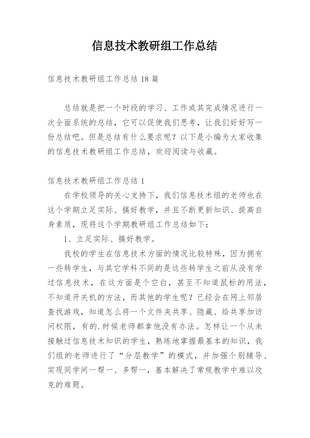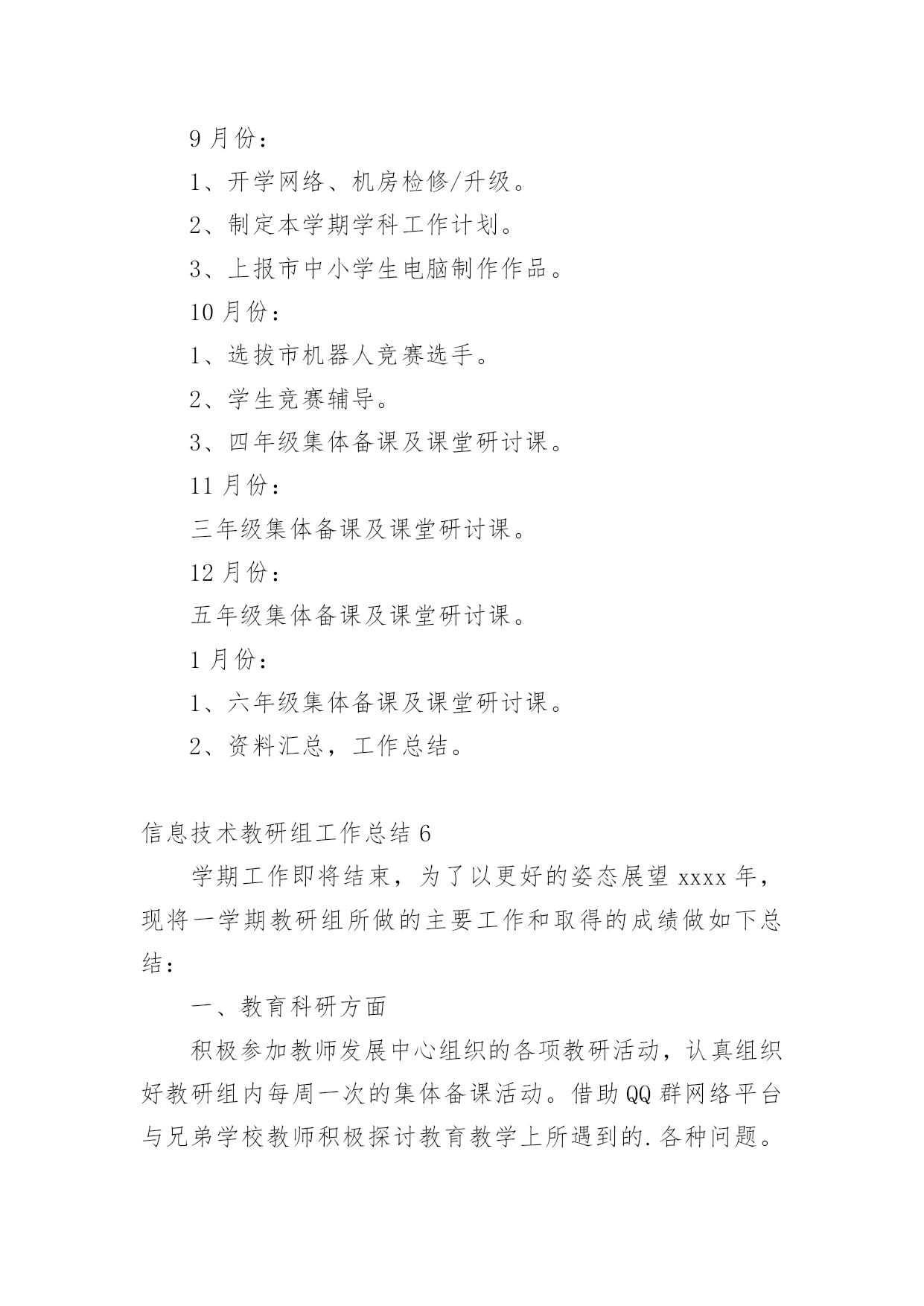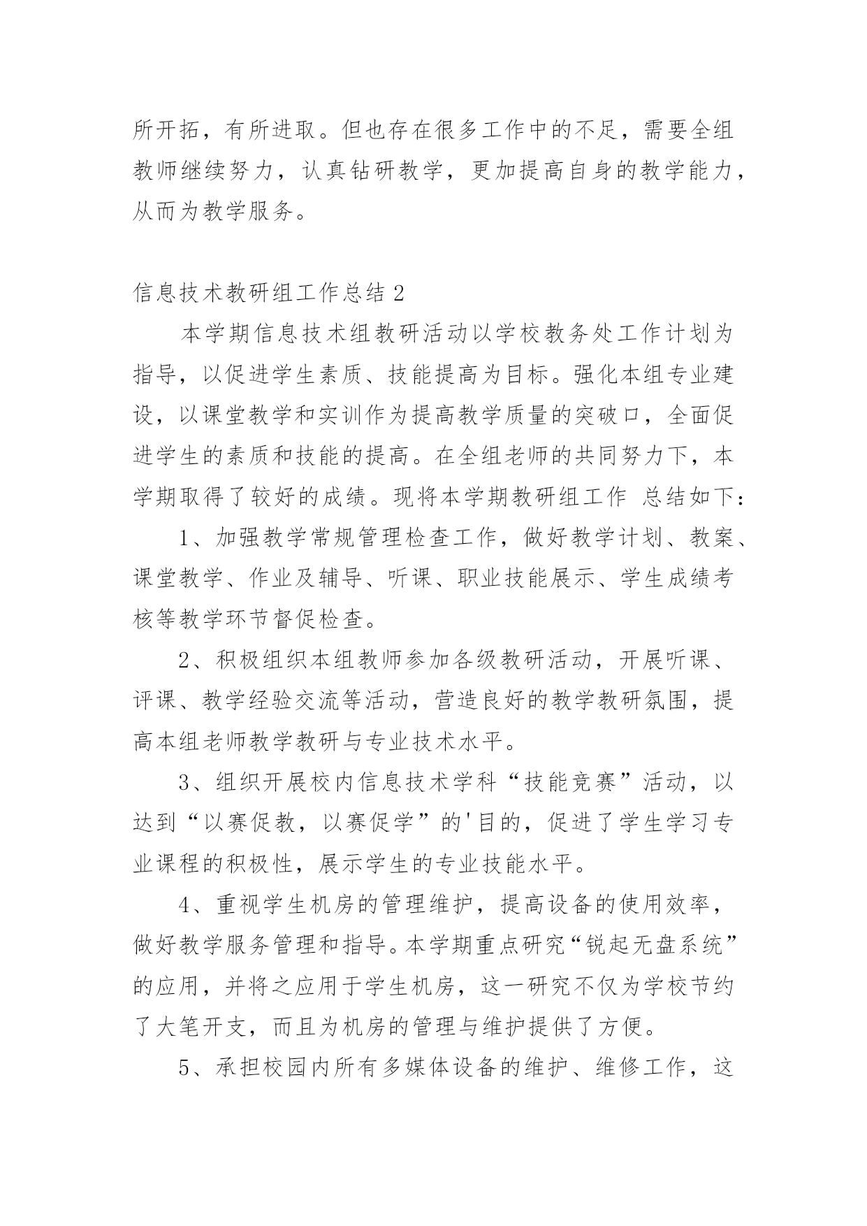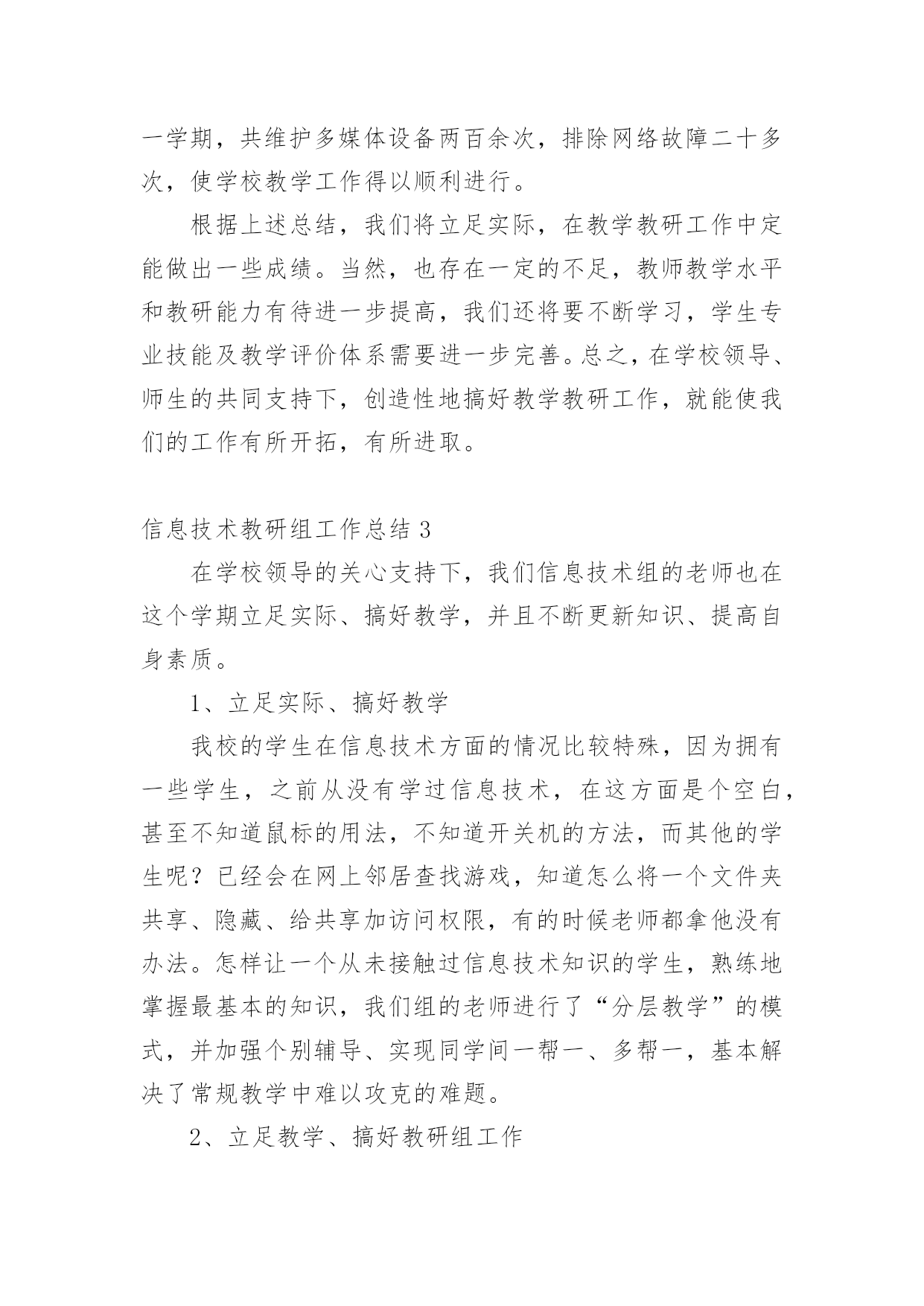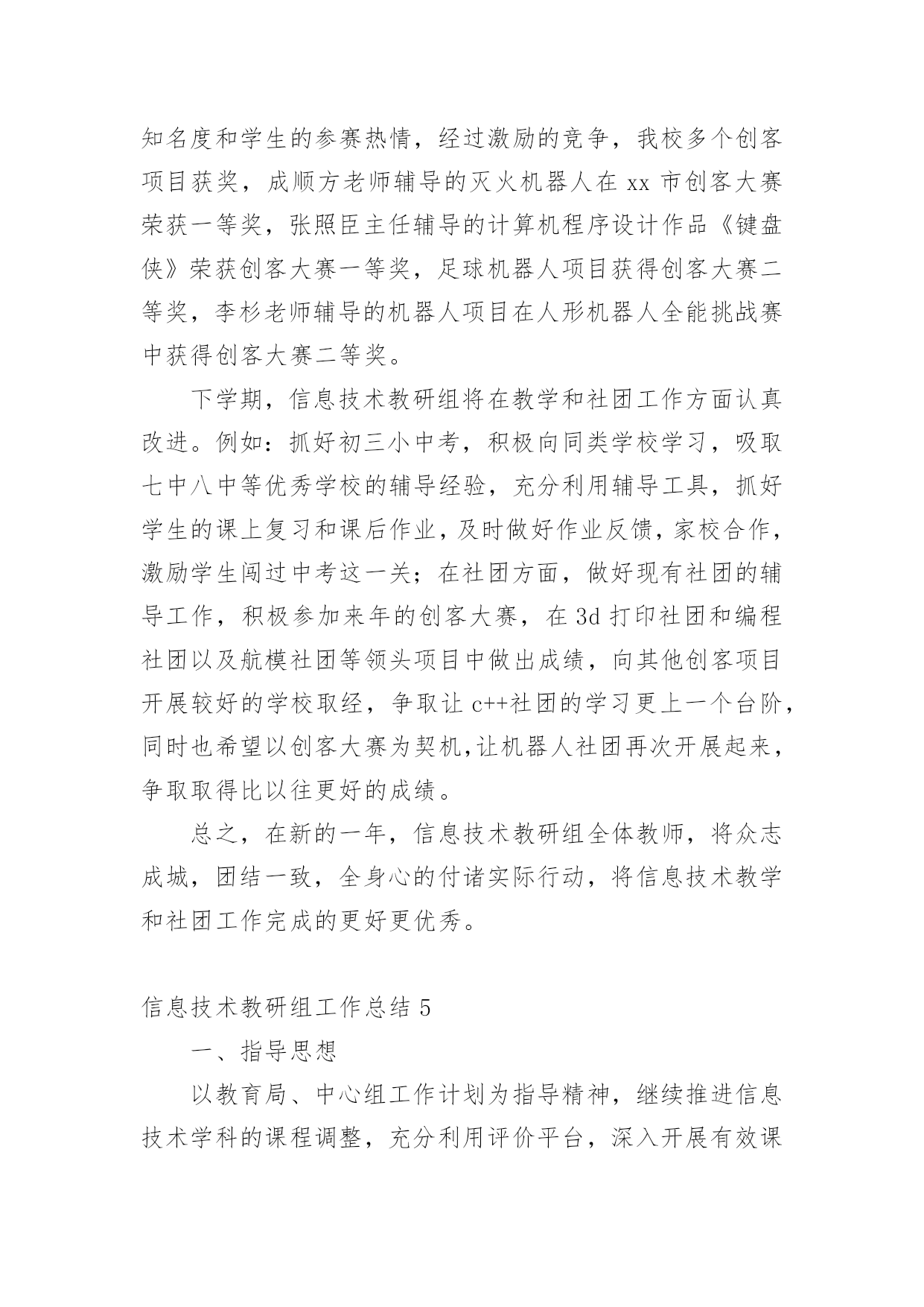信息技术教研组工作总结信息技术教研组工作总结18篇总结就是把一个时段的学习、工作或其完成情况进行一次全面系统的总结,它可以促使我们思考,让我们好好写一份总结吧。但是总结有什么要求呢?以下是小编为大家收集的信息技术教研组工作总结,欢迎阅读与收藏。信息技术教研组工作总结1在学校领导的关心支持下,我们信息技术组的老师也在这个学期立足实际、搞好教学,并且不断更新知识、提高自身素质,现将这个学期教研组工作总结如下:1、立足实际、搞好教学。我校的学生在信息技术方面的情况比较特殊,因为拥有一些转学生,与其它学科不同的是这些转学生之前从没有学过信息技术,在这方面是个空白,甚至不知道鼠标的用法,不知道开关机的方法,而其他的学生呢?已经会在网上邻居查找游戏,知道怎么将一个文件夹共享、隐藏、给共享加访问权限,有的.时候老师都拿他没有办法。怎样让一个从未接触过信息技术知识的学生,熟练地掌握最基本的知识,我们组的老师进行了“分层教学”的模式,并加强个别辅导、实现同学间一帮一、多帮一,基本解决了常规教学中难以攻克的难题。2、立足教学、搞好教研组工作在教研处的要求与指导下,这个学期的教研组工作是非常正常的,每个月都有教研活动,集中学习的时间、地点,内容落实,并有记载,每月至少有一次专题性理论学习,内容针对强,且有带头中心发言,积极参加教研组的课堂教学专题性研究。3、积极参加课题研究我组教师陈仕全、刘春梅、张华、刘云光四位教师积极参加全国十一五重点课题:中小学有效合作学习与研究,严格按照学校对课题的管理和要求进行有秩序的操作,现已经取得一定的成效。4、搞好集体备课本学期我组抽调刘云光老师进行七年级的集体备课,通过先确定课题、讨论,上课,在上课,讨论的方式,一学期来,对七年级教学内容形成了比较完整合理的教学方案。5、常规工作(1)、积极搞好办公室和机房的维护维护工作,确保了正常办公和教学工作。(2)、协助教务处搞好了期末评教工作和高考网上报名及高考志愿填报工作。(3)、完成了高二年级的信息技术会考考查工作。根据上述总结,我们深深感到,只要立足实际,认真分析和研究好教材、大纲,研究好学生,争取学校领导、师生的支持,就能创造性地搞好信息技术课的教学,就能使我们的工作有所开拓,有所进取。但也存在很多工作中的不足,需要全组教师继续努力,认真钻研教学,更加提高自身的教学能力,从而为教学服务。信息技术教研组工作总结2本学期信息技术组教研活动以学校教务处工作计划为指导,以促进学生素质、技能提高为目标。强化本组专业建设,以课堂教学和实训作为提高教学质量的突破口,全面促进学生的素质和技能的提高。在全组老师的共同努力下,本学期取得了较好的成绩。现将本学期教研组工作总结如下:1、加强教学常规管理检查工作,做好教学计划、教案、课堂教学、作业及辅导、听课、职业技能展示、学生成绩考核等教学环节督促检查。2、积极组织本组教师参加各级教研活动,开展听课、评课、教学经验交流等活动,营造良好的教学教研氛围,提高本组老师教学教研与专业技术水平。3、组织开展校内信息技术学科“技能竞赛”活动,以达到“以赛促教,以赛促学”的'目的,促进了学生学习专业课程的积极性,展示学生的专业技能水平。4、重视学生机房的管理维护,提高设备的使用效率,做好教学服务管理和指导。本学期重点研究“锐起无盘系统”的应用,并将之应用于学生机房,这一研究不仅为学校节约了大笔开支,而且为机房的管理与维护提供了方便。5、承担校园内所有多媒体设备的维护、维修工作,这一学期,共维护多媒体设备两百余次,排除网络故障二十多次,使学校教学工作得以顺利进行。根据上述总结,我们将立足实际,在教学教研工作中定能做出一些成绩。当然,也存在一定的不足,教师教学水平和教研能力有待进一步提高,我们还将要不断学习,学生专业技能及教学评价体系需要进一步完善。总之,在学校领导、师生的共同支持下,创造性地搞好教学教研工作,就能使我们的工作有所开拓,有所进取。信息技术教研组工作总结3在学校领导的关心支持下,我们信息技术组的老师也在这个学期立足实际、搞好教学,并且不断更新知识、提高自身素质。1、立足实际、搞好教学我校的学生在信息技术方面的情况比较特殊,因为拥有一些学生,之前从没有学过信息技术,在这方面是个空白,甚至不知道鼠标的用法,不知道开关机的方法,而其他的学生呢?已经会在网上邻居查找游戏,知道怎么将一个文件夹共享、隐藏、给共享加访问权限,有的时候老师都拿他没有办法。怎样让一个从未接触过信息技术知识的学生,熟练地掌握最基本的知识,我们组的老师进行了“分层教学”的模式,并加强个别辅导、实现同学间一帮一、多帮一,基本解决了常规教学中难以攻克的难题。2、立足教学、搞好教研组工作在教务处的要求与指导下,这个学期的教研组工作是非常正常的,学期伊始,全组教师首先通过对上学期组内