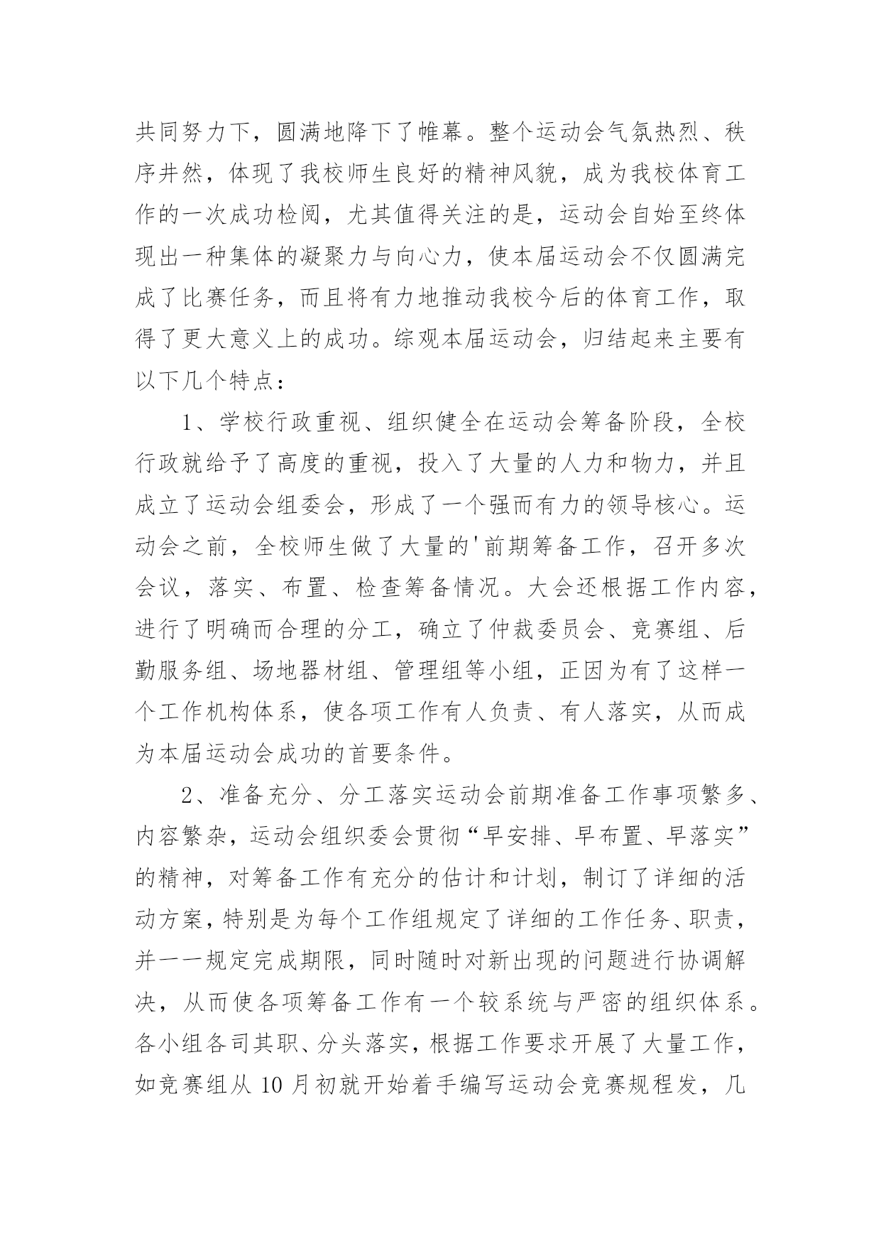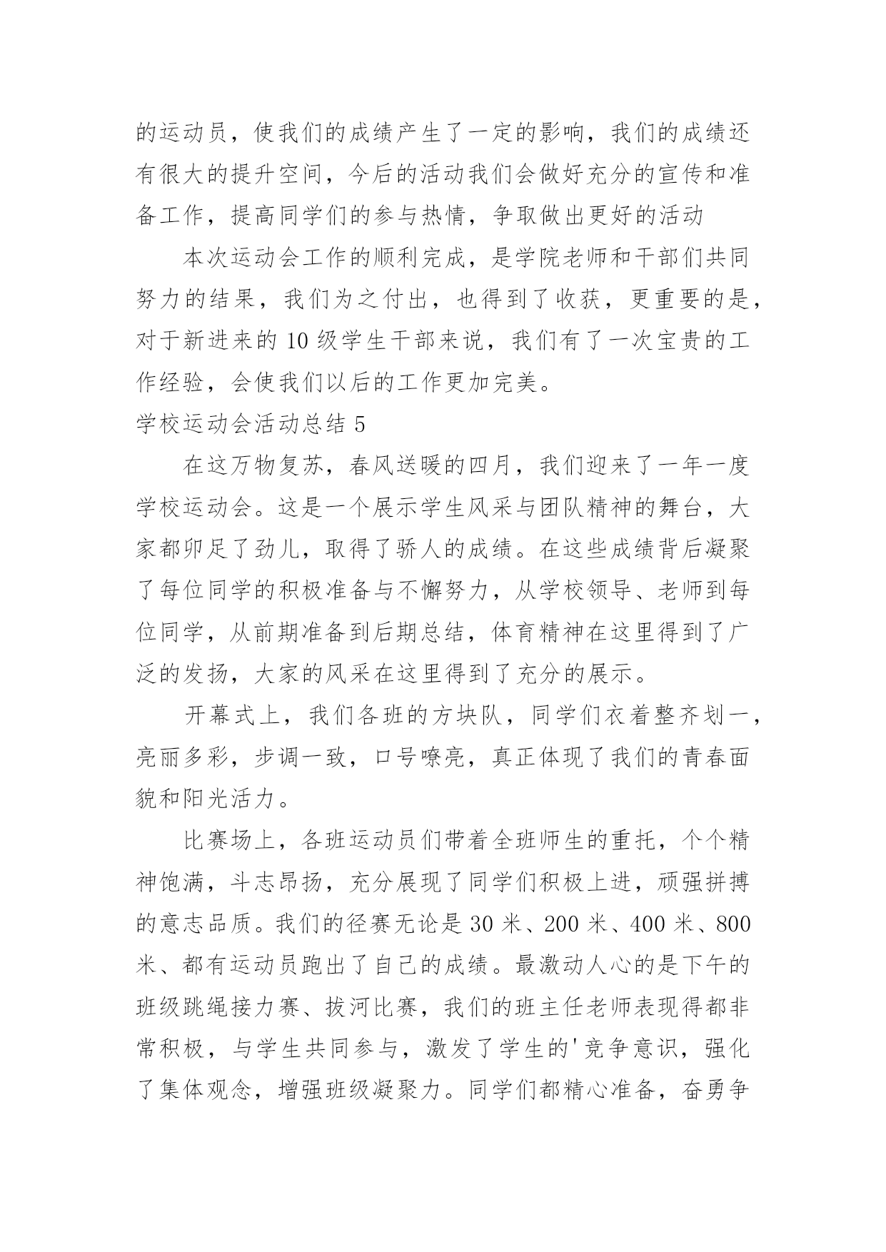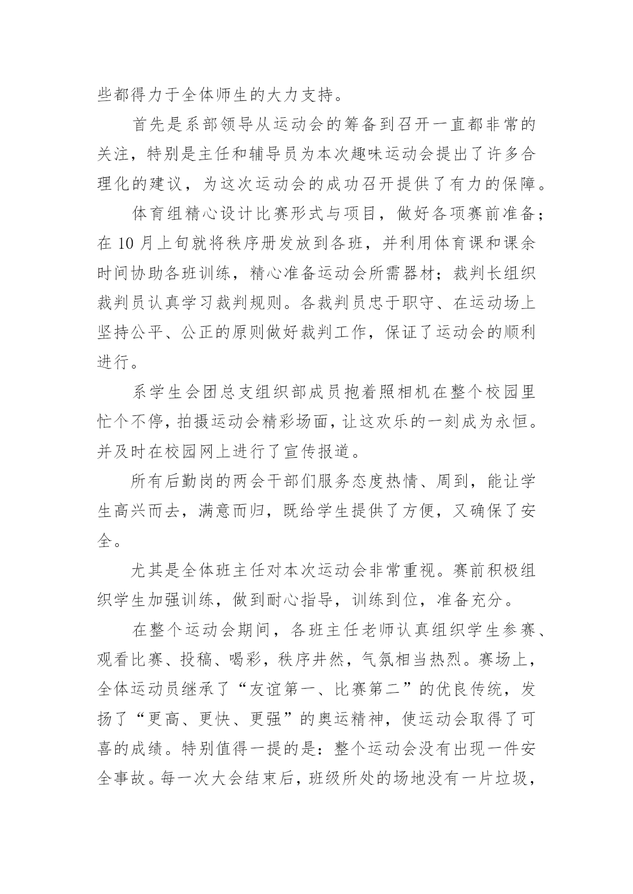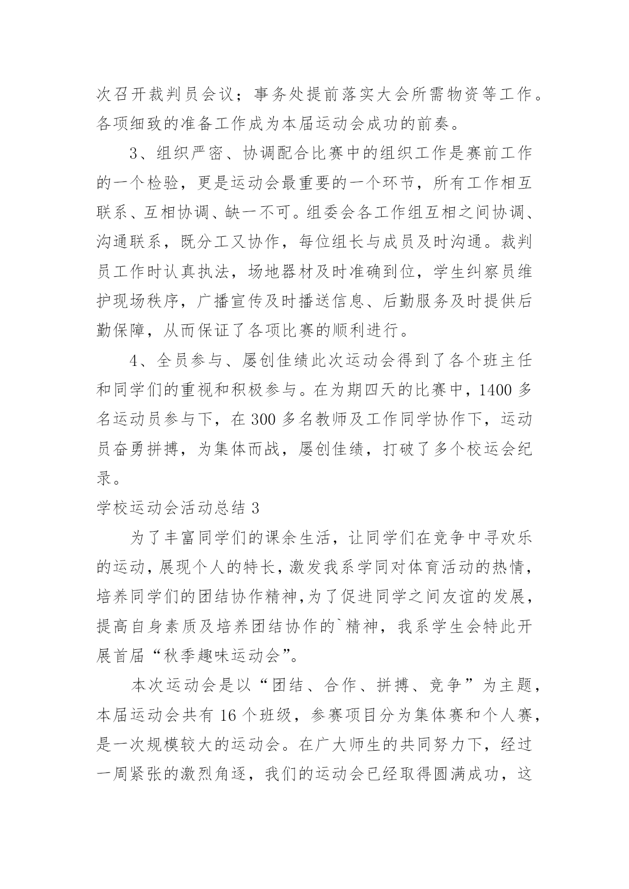 学校运动会活动总结[必备]学校运动会活动总结总结是事后对某一阶段的学习、工作或其完成情况加以回顾和分析的一种书面材料,它有助于我们寻找工作和事物发展的规律,从而掌握并运用这些规律,快快来写一份总结吧。你所见过的总结应该是什么样的?下面是小编为大家整理的学校运动会活动总结,希望对大家有所帮助。学校运动会活动总结1金秋十月,我们大一新生迎来了进入湖北经济学院以来第一次秋季运动会。作为艺术学院这个大家庭中的一员,每个人的心情自然是分外激动。从前期认真严密的筹备:包括队形口号的方阵编排、运动员的训练、运动会服装道具的采购,到运动会开幕当天大家的兴奋紧张,我们从未停止感受本届运动会带给我们的激情活力。20xx年10月8号,运动会开幕式拉开帷幕。整齐的步伐;响亮的口号。各方阵绕场一周,尽情挥洒着自信与风采。接着是拉拉队的精彩表演,身体随着音乐律动,手拿彩球,学生会成员围场助阵,为那些精彩的动作发自内心的鼓掌喝彩。当比赛正式开始,田径项目中,运动员们各个如离弦之箭一般,冲向那胜利的终点。那稳健的步伐,犀利的目光,上演着精彩的速度与激情之战;趣味项目中,老师们之间的默契配合展露无疑,心向一处,劲往一起,比赛之中更见欢笑乐趣,友谊第一才是硬道理。在学生会的带领下,观众席上欢呼呐喊,让整个赛场沸腾,这一句句艺术、加油是对运动员的.鼓励支持,更是对大家的尊重和肯定。没有比赛项目的同学也不会闲着,为了主持人播报的通讯稿,加油打气的、赞扬歌颂的、抒情写意的,真切的加油声,回荡在这操场。比赛一直持续到周六,大家的热情丝毫未减。最后,在大家的依依不舍下,本届运动会圆满落幕。艺术学院最后取得了佳绩。我们将来要再接再厉,化荣誉为前进的动力,争取下次得到更好的'成绩。在人生和学习的赛场上,总有人,总有人落后,可是现在你拥有的并不代表你永远拥有。现在没有的、失去的要去竭力争取,现在拥有的也要不能懈殆!最重要的就是要永不满足和永不放弃!如果你不再拼搏安于现状,如果你畏惧失败放弃追求,你就输了整场比赛。拥有了不代表永远拥有,失去了的不代表不能夺回!重要得是永不言败永远进取。我们都需要这样的体育精神,它会使我们活的更有品质,过的更有意义。凡事都要努力争取,但面对结果时,多一些坦然与豁达,竭尽全力只求无悔。期待着明年的运动会,因为在这里,我们总能享受激情,遇见美好,收获正能量!学校运动会活动总结2本届运动会在行政、竞赛委员会大力支持与全校师生的共同努力下,圆满地降下了帷幕。整个运动会气氛热烈、秩序井然,体现了我校师生良好的精神风貌,成为我校体育工作的一次成功检阅,尤其值得关注的是,运动会自始至终体现出一种集体的凝聚力与向心力,使本届运动会不仅圆满完成了比赛任务,而且将有力地推动我校今后的体育工作,取得了更大意义上的成功。综观本届运动会,归结起来主要有以下几个特点:1、学校行政重视、组织健全在运动会筹备阶段,全校行政就给予了高度的重视,投入了大量的人力和物力,并且成立了运动会组委会,形成了一个强而有力的领导核心。运动会之前,全校师生做了大量的'前期筹备工作,召开多次会议,落实、布置、检查筹备情况。大会还根据工作内容,进行了明确而合理的分工,确立了仲裁委员会、竞赛组、后勤服务组、场地器材组、管理组等小组,正因为有了这样一个工作机构体系,使各项工作有人负责、有人落实,从而成为本届运动会成功的首要条件。2、准备充分、分工落实运动会前期准备工作事项繁多、内容繁杂,运动会组织委会贯彻“早安排、早布置、早落实”的精神,对筹备工作有充分的估计和计划,制订了详细的活动方案,特别是为每个工作组规定了详细的工作任务、职责,并一一规定完成期限,同时随时对新出现的问题进行协调解决,从而使各项筹备工作有一个较系统与严密的组织体系。各小组各司其职、分头落实,根据工作要求开展了大量工作,如竞赛组从10月初就开始着手编写运动会竞赛规程发,几次召开裁判员会议;事务处提前落实大会所需物资等工作。各项细致的准备工作成为本届运动会成功的前奏。3、组织严密、协调配合比赛中的组织工作是赛前工作的一个检验,更是运动会最重要的一个环节,所有工作相互联系、互相协调、缺一不可。组委会各工作组互相之间协调、沟通联系,既分工又协作,每位组长与成员及时沟通。裁判员工作时认真执法,场地器材及时准确到位,学生纠察员维护现场秩序,广播宣传及时播送信息、后勤服务及时提供后勤保障,从而保证了各项比赛的顺利进行。4、全员参与、屡创佳绩此次运动会得到了各个班主任和同学们的重视和积极参与。在为期四天的比赛中,1400多名运动员参与下,在300多名教师及工作同学协作下,运动员奋勇拼搏,为集体而战,屡创佳绩,打破了多个校运会纪录。学校运动会活动总结3为了丰富同学们的课余生活,让同学们在竞争中寻欢乐的运动,展现个人的特长,激发我系学同对体育活动的热