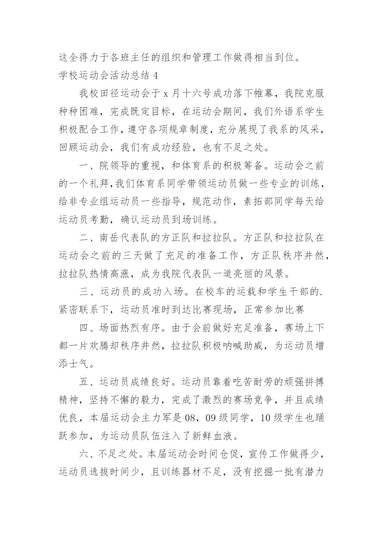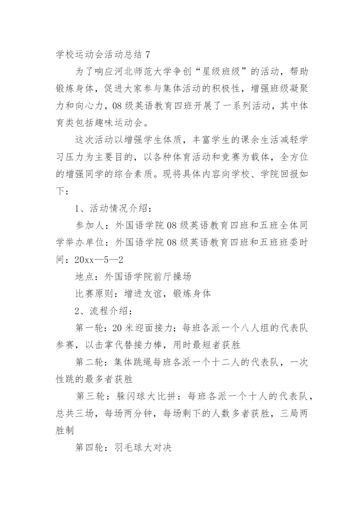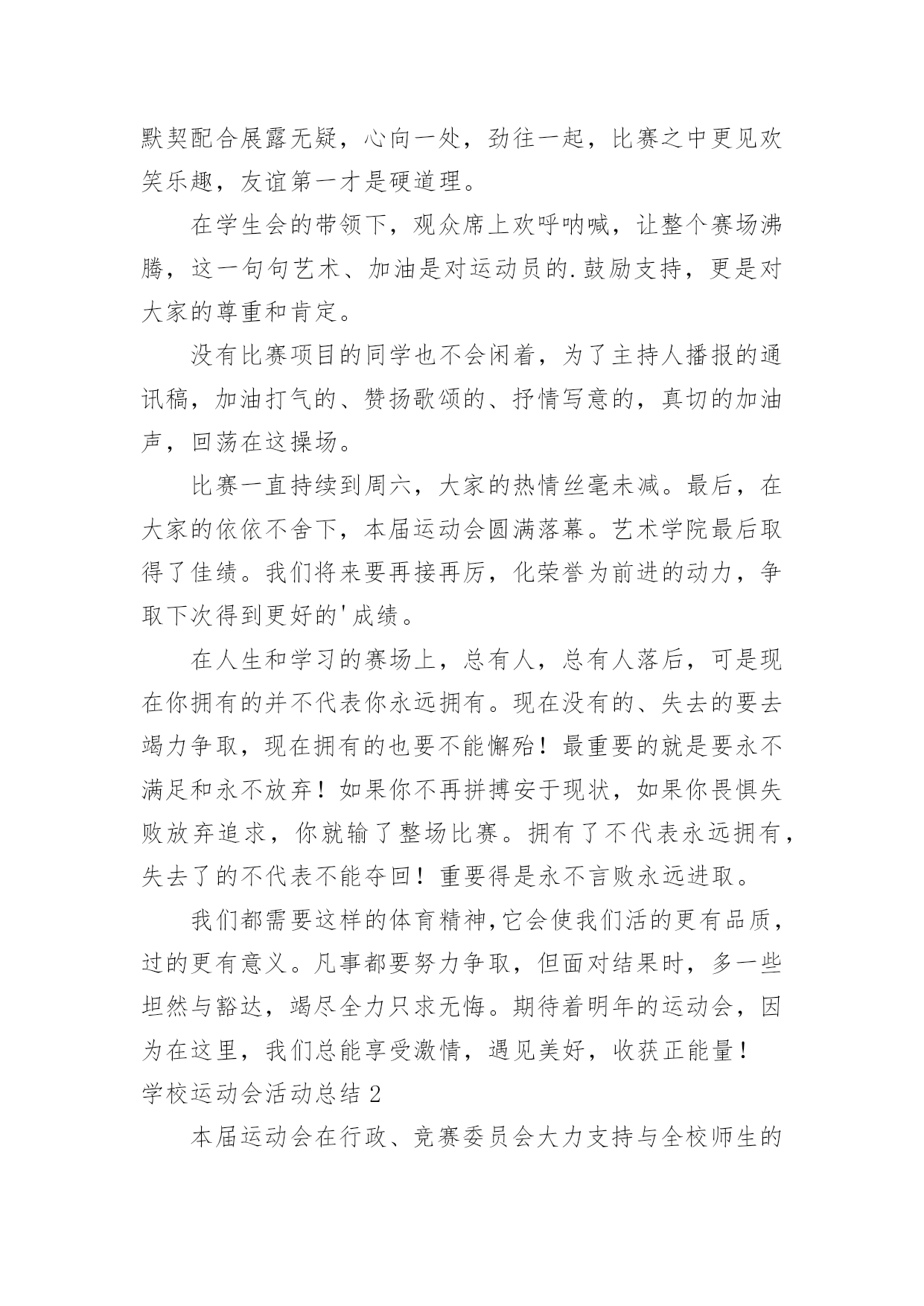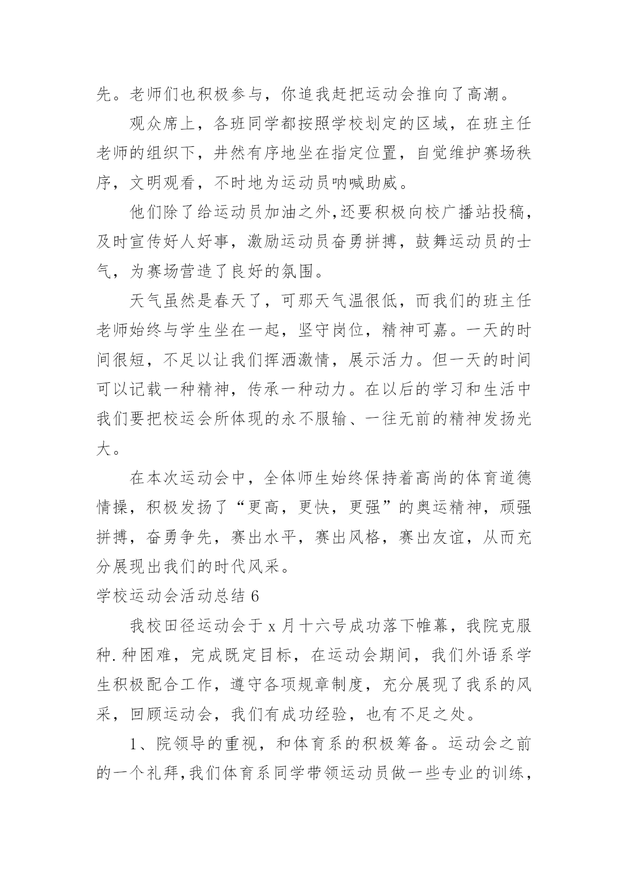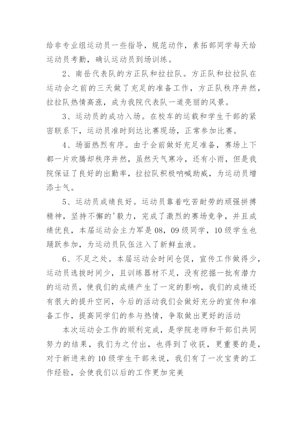 学校运动会活动总结[必备]学校运动会活动总结总结是事后对某一阶段的学习、工作或其完成情况加以回顾和分析的一种书面材料,它有助于我们寻找工作和事物发展的规律,从而掌握并运用这些规律,快快来写一份总结吧。你所见过的总结应该是什么样的?下面是小编为大家整理的学校运动会活动总结,希望对大家有所帮助。学校运动会活动总结1金秋十月,我们大一新生迎来了进入湖北经济学院以来第一次秋季运动会。作为艺术学院这个大家庭中的一员,每个人的心情自然是分外激动。从前期认真严密的筹备:包括队形口号的方阵编排、运动员的训练、运动会服装道具的采购,到运动会开幕当天大家的兴奋紧张,我们从未停止感受本届运动会带给我们的激情活力。20xx年10月8号,运动会开幕式拉开帷幕。整齐的步伐;响亮的口号。各方阵绕场一周,尽情挥洒着自信与风采。接着是拉拉队的精彩表演,身体随着音乐律动,手拿彩球,学生会成员围场助阵,为那些精彩的动作发自内心的鼓掌喝彩。当比赛正式开始,田径项目中,运动员们各个如离弦之箭一般,冲向那胜利的终点。那稳健的步伐,犀利的目光,上演着精彩的速度与激情之战;趣味项目中,老师们之间的默契配合展露无疑,心向一处,劲往一起,比赛之中更见欢笑乐趣,友谊第一才是硬道理。在学生会的带领下,观众席上欢呼呐喊,让整个赛场沸腾,这一句句艺术、加油是对运动员的.鼓励支持,更是对大家的尊重和肯定。没有比赛项目的同学也不会闲着,为了主持人播报的通讯稿,加油打气的、赞扬歌颂的、抒情写意的,真切的加油声,回荡在这操场。比赛一直持续到周六,大家的热情丝毫未减。最后,在大家的依依不舍下,本届运动会圆满落幕。艺术学院最后取得了佳绩。我们将来要再接再厉,化荣誉为前进的动力,争取下次得到更好的'成绩。在人生和学习的赛场上,总有人,总有人落后,可是现在你拥有的并不代表你永远拥有。现在没有的、失去的要去竭力争取,现在拥有的也要不能懈殆!最重要的就是要永不满足和永不放弃!如果你不再拼搏安于现状,如果你畏惧失败放弃追求,你就输了整场比赛。拥有了不代表永远拥有,失去了的不代表不能夺回!重要得是永不言败永远进取。我们都需要这样的体育精神,它会使我们活的更有品质,过的更有意义。凡事都要努力争取,但面对结果时,多一些坦然与豁达,竭尽全力只求无悔。期待着明年的运动会,因为在这里,我们总能享受激情,遇见美好,收获正能量!学校运动会活动总结2本届运动会在行政、竞赛委员会大力支持与全校师生的共同努力下,圆满地降下了帷幕。整个运动会气氛热烈、秩序井然,体现了我校师生良好的精神风貌,成为我校体育工作的一次成功检阅,尤其值得关注的是,运动会自始至终体现出一种集体的凝聚力与向心力,使本届运动会不仅圆满完成了比赛任务,而且将有力地推动我校今后的体育工作,取得了更大意义上的成功。综观本届运动会,归结起来主要有以下几个特点:1、学校行政重视、组织健全在运动会筹备阶段,全校行政就给予了高度的重视,投入了大量的人力和物力,并且成立了运动会组委会,形成了一个强而有力的领导核心。运动会之前,全校师生做了大量的'前期筹备工作,召开多次会议,落实、布置、检查筹备情况。大会还根据工作内容,进行了明确而合理的分工,确立了仲裁委员会、竞赛组、后勤服务组、场地器材组、管理组等小组,正因为有了这样一个工作机构体系,使各项工作有人负责、有人落实,从而成为本届运动会成功的首要条件。2、准备充分、分工落实运动会前期准备工作事项繁多、内容繁杂,运动会组织委会贯彻“早安排、早布置、早落实”的精神,对筹备工作有充分的估计和计划,制订了详细的活动方案,特别是为每个工作组规定了详细的工作任务、职责,并一一规定完成期限,同时随时对新出现的问题进行协调解决,从而使各项筹备工作有一个较系统与严密的组织体系。各小组各司其职、分头落实,根据工作要求开展了大量工作,如竞赛组从10月初就开始着手编写运动会竞赛规程发,几次召开裁判员会议;事务处提前落实大会所需物资等工作。各项细致的准备工作成为本届运动会成功的前奏。3、组织严密、协调配合比赛中的组织工作是赛前工作的一个检验,更是运动会最重要的一个环节,所有工作相互联系、互相协调、缺一不可。组委会各工作组互相之间协调、沟通联系,既分工又协作,每位组长与成员及时沟通。裁判员工作时认真执法,场地器材及时准确到位,学生纠察员维护现场秩序,广播宣传及时播送信息、后勤服务及时提供后勤保障,从而保证了各项比赛的顺利进行。4、全员参与、屡创佳绩此次运动会得到了各个班主任和同学们的重视和积极参与。在为期四天的比赛中,1400多名运动员参与下,在300多名教师及工作同学协作下,运动员奋勇拼搏,为集体而战,屡创佳绩,打破了多个校运会纪录。学校运动会活动总结3为了丰富同学们的课余生活,让同学们在竞争中寻欢乐的运动,展现个人的特长,激发我系学同对体育活动的热