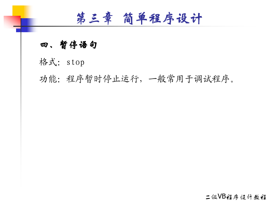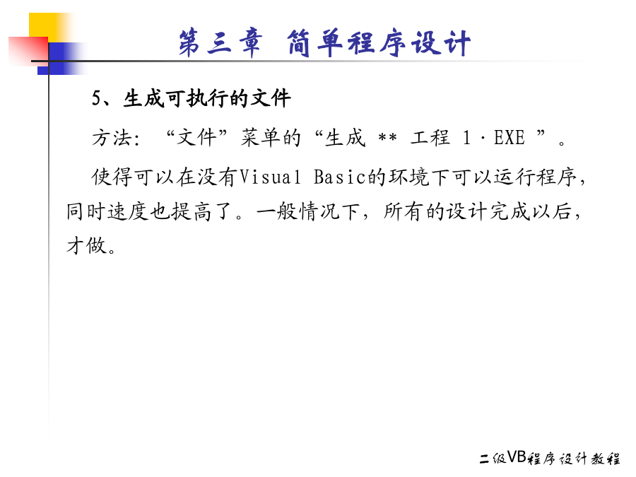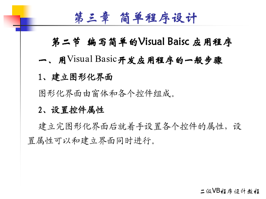 VB程序设计教程第三章第一节VisualBaisc中的语句一、语句概述VB中的语句是执行具体操作的指令,每个语句行以回车(Enter)键结束。语句是VB关键字、属性、函数、运算符以及能够生成VB编辑器可识别指令的符号的任意组合。语句的使用规则:1.自动语法检查2.格式化处理3.复合语句行VB允许把几个语句放在一个语句行中,语句之间用冒号“:”隔开。4.语句的续行当一条语句很长时,用续行符“_”(下划线)将一个较长的语句分为多个语句行。二、赋值语句将等号右侧的表达式的值赋给左侧的变量或者对象的属性。格式:变量名或者属性名=表达式如:X=10text1.text=”欢迎使用VisualBasic程序设计语言”三、注释语句Rem<注释>单独作为一句,Rem关键字与注释之间至少要有一个空格。‘<注释>——单引号引导方式。PrivateSubTextBox_KeyPress(KeyAsciiAsInteger)IfKeyAscii<Asc("0")OrKeyAscii>Asc("9")Then'检验用户输入的字符是否为数字KeyAscii=0'如果输入的不是数字,则不接受这个字符Beep'铃声,发出错误信号。EndIfEndSub注释可以放在一行语句的后面,也可以单独放在一行。四、暂停语句格式:stop功能:程序暂时停止运行,一般常用于调试程序。第二节编写简单的VisualBaisc应用程序一、用VisualBasic开发应用程序的一般步骤1、建立图形化界面图形化界面由窗体和各个控件组成。2、设置控件属性建立完图形化界面后就着手设置各个控件的属性,设置属性可以和建立界面同时进行。3、编写程序代码完成上述两步后,双击窗体或任何一个控件即可进入代码窗口。4、运行方法:“运行”菜单的“启动”,或工具栏上的启动按钮“▲”,或者按下F5。运行可以和前面的几步交叉进行,随时可以看到运行结果。5、生成可执行的文件方法:“文件”菜单的“生成**工程1·EXE”。使得可以在没有VisualBasic的环境下可以运行程序,同时速度也提高了。一般情况下,所有的设计完成以后,才做。二、代码编辑器“代码窗口”又称“代码编辑器”,是编写应用程序的VisualBasic代码的地方。代码由语句、常量和声明部分组成。有4种方法可以打开“代码窗口”:●双击已建立好的控件(或者窗体的任意位置)。●右击控件选“查看代码”。●使用工程窗口中的“查看代码”按钮,或者F7。●选择“视图”菜单中的“代码窗口”命令。在VB代码窗口中编写代码时,具有以下自动功能:(1)自动列出成员特性。(2)自动显示快速信息(提示语法使用格式)。(3)自动语法检查。例如,创建一个简单应用程序,该应用程序由一个文本框和一个命令按钮组成。单击命令按钮,文本框中会出现"Hello,world!"消息。第三节程序的保存、装入和运行一、保存程序1、保存窗体方法:执行“文件”菜单中的“保存(窗体名)”或者“(窗体名)另存为”命令。2、保存工程方法:执行“文件”菜单中的“保存(工程名)”或者“(工程名)另存为”命令。当然也可以单击相应的快捷按钮。二、程序的装入方法:执行“文件”菜单中的“打开工程”命令。工程文件的扩展名为:VBP。第四节VB应用程序的结构与工作方式一、VisualBasic应用程序的构成1、VisualBasic应用程序的结构VisualBasic应用程序的代码是用分层方式以模块的形式组织,代码存储在模块中。一个典型应用程序包括若干模块:●应用程序中每个窗体的窗体模块。●共享代码的可选标准模块。●可选的类模块。①、窗体模块文件扩展名为.frm,是包含一个窗体相关代码的模块,一个窗体有一个窗体模块。②、标准模块文件扩展名为.BAS,存放可被多个窗体共享的代码,其中的过程都是通用过程。③、类模块文件扩展名为.CLS,用于编写代码建立新对象的模块。(这些新对象可以包含自定义的属性和方法。)2、模块的结构每个标准模块、类模块和窗体模块都可包含:◇声明可将常数、类型、变量和动态链接库(DLL)过程的声明放在窗体、类或标准模块的模块级。◇过程Sub、Function过程包含可以作为基本单元来执行的代码片段。<声明部分>过程1(参数表)………EndSub过程2(参数表)………EndSub二、事件驱动VisualBasic应用程序的代码被分为称为“过程”的小的代码块。事件过程包含了事件发生(例如单击按钮)时要执行的代码。控件事件的过程名由控件的名称(Name属性中所指定的)、下划线(_)和事件名组合而成。库存现金的管理与核算第一部分:组织教学第二部分: