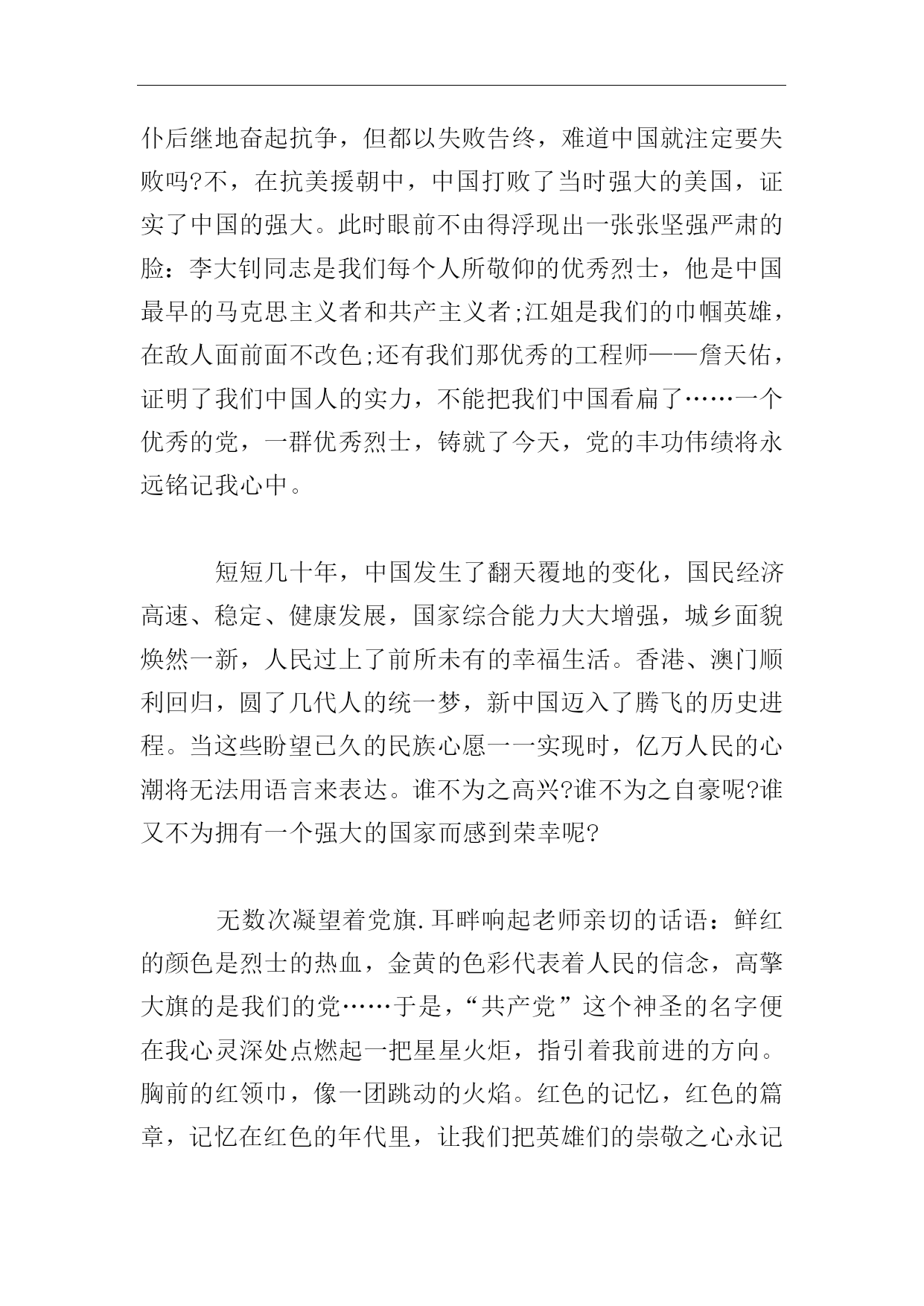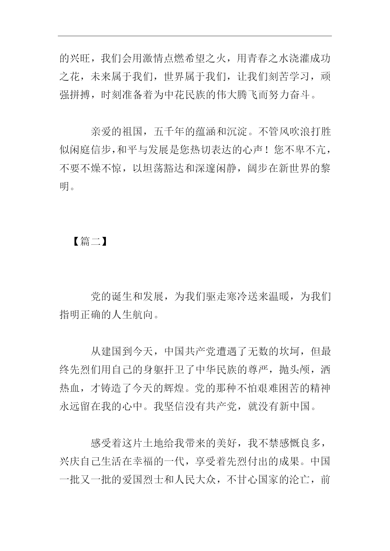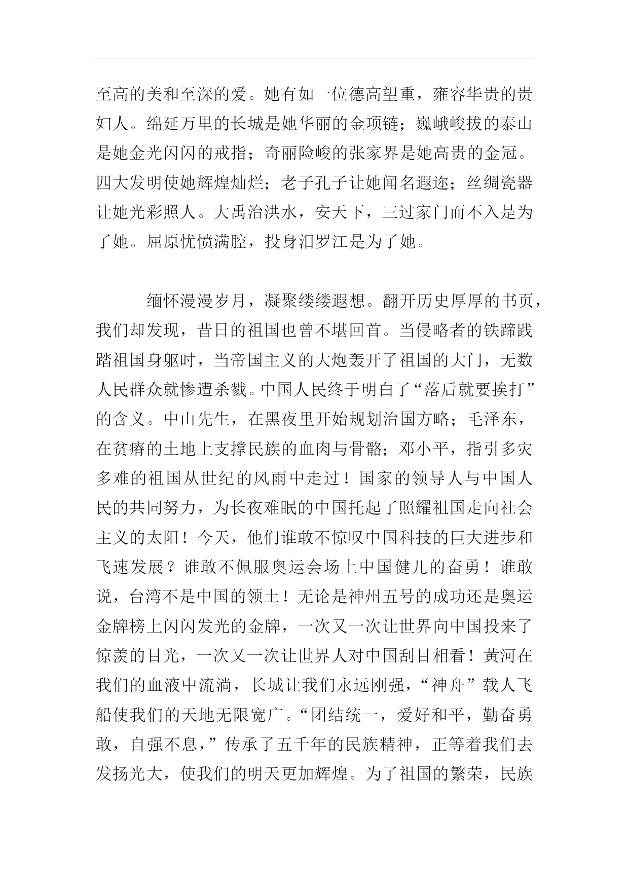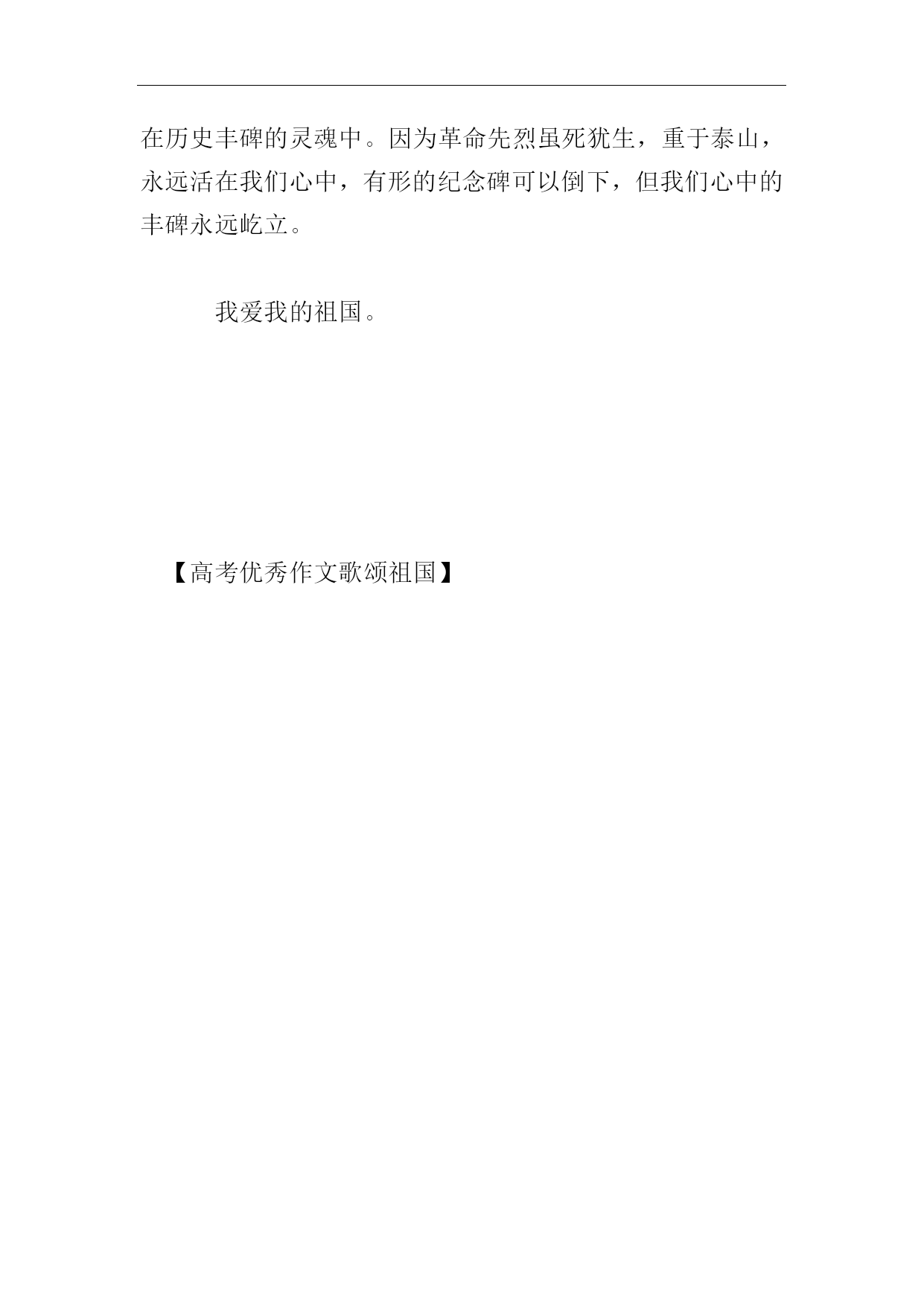 高考优秀作文歌颂祖国【篇一】每每听到祖国的赞歌,我都会心灵一颤,那是为祖国呐喊助威的声音。敲响那一排铜质的编钟,浑厚而清凉的左音右韵由远及近,穿越五千年悠悠岁月和五十三年缤纷花季,在河之洲,水之渭,山之阳,海之滨,泛起层层涟漪,响起阵阵回声,在亿万炎黄子孙的心中凝结一个主题一个主题祖国母亲!时间曾凝聚在1949年10月1日,当巍峨的华表披上曙光,当雄伟的天安门迎来新一轮的太阳,当无数先烈用鲜血染红的五星红旗在天安门广场冉冉升起,伟大的毛主席洪亮的声音传遍了全世界:中华人民共和国成立了!中国人民从此站起来了!这一时刻,对于一个饱经忧患,受尽凌辱的民族来说多么宝贵啊!中国,一个响亮的名字;一个让世界震撼的名字;一个让无数华夏儿女为之骄傲与自豪的名字,从此诞生了。这一激动人心的日子到来时,亿万华夏儿女为之雀跃。沉睡了百年的东方“雄狮”终于昂首于世界之林。这是一个沸腾上升的祖国,是一个如日中天的祖国!祖国这片古老的土地千百年来牵系。造就了我们民族至高的美和至深的爱。她有如一位德高望重,雍容华贵的贵妇人。绵延万里的长城是她华丽的金项链;巍峨峻拔的泰山是她金光闪闪的戒指;奇丽险峻的张家界是她高贵的金冠。四大发明使她辉煌灿烂;老子孔子让她闻名遐迩;丝绸瓷器让她光彩照人。大禹治洪水,安天下,三过家门而不入是为了她。屈原忧愤满腔,投身汨罗江是为了她。缅怀漫漫岁月,凝聚缕缕遐想。翻开历史厚厚的书页,我们却发现,昔日的祖国也曾不堪回首。当侵略者的铁蹄践踏祖国身躯时,当帝国主义的大炮轰开了祖国的大门,无数人民群众就惨遭杀戮。中国人民终于明白了“落后就要挨打”的含义。中山先生,在黑夜里开始规划治国方略;毛泽东,在贫瘠的土地上支撑民族的血肉与骨骼;邓小平,指引多灾多难的祖国从世纪的风雨中走过!国家的领导人与中国人民的共同努力,为长夜难眠的中国托起了照耀祖国走向社会主义的太阳!今天,他们谁敢不惊叹中国科技的巨大进步和飞速发展?谁敢不佩服奥运会场上中国健儿的奋勇!谁敢说,台湾不是中国的领土!无论是神州五号的成功还是奥运金牌榜上闪闪发光的金牌,一次又一次让世界向中国投来了惊羡的目光,一次又一次让世界人对中国刮目相看!黄河在我们的血液中流淌,长城让我们永远刚强,“神舟”载人飞船使我们的天地无限宽广。“团结统一,爱好和平,勤奋勇敢,自强不息,”传承了五千年的民族精神,正等着我们去发扬光大,使我们的明天更加辉煌。为了祖国的繁荣,民族的兴旺,我们会用激情点燃希望之火,用青春之水浇灌成功之花,未来属于我们,世界属于我们,让我们刻苦学习,顽强拼搏,时刻准备着为中花民族的伟大腾飞而努力奋斗。亲爱的祖国,五千年的蕴涵和沉淀。不管风吹浪打胜似闲庭信步,和平与发展是您热切表达的心声!您不卑不亢,不要不燥不惊,以坦荡豁达和深邃闲静,阔步在新世界的黎明。【篇二】党的诞生和发展,为我们驱走寒冷送来温暖,为我们指明正确的人生航向。从建国到今天,中国共产党遭遇了无数的坎坷,但最终先烈们用自己的身躯扞卫了中华民族的尊严,抛头颅,洒热血,才铸造了今天的辉煌。党的那种不怕艰难困苦的精神永远留在我的心中。我坚信没有共产党,就没有新中国。感受着这片土地给我带来的美好,我不禁感慨良多,兴庆自己生活在幸福的一代,享受着先烈付出的成果。中国一批又一批的爱国烈士和人民大众,不甘心国家的沦亡,前仆后继地奋起抗争,但都以失败告终,难道中国就注定要失败吗?不,在抗美援朝中,中国打败了当时强大的美国,证实了中国的强大。此时眼前不由得浮现出一张张坚强严肃的脸:李大钊同志是我们每个人所敬仰的优秀烈士,他是中国最早的马克思主义者和共产主义者;江姐是我们的巾帼英雄,在敌人面前面不改色;还有我们那优秀的工程师——詹天佑,证明了我们中国人的实力,不能把我们中国看扁了……一个优秀的党,一群优秀烈士,铸就了今天,党的丰功伟绩将永远铭记我心中。短短几十年,中国发生了翻天覆地的变化,国民经济高速、稳定、健康发展,国家综合能力大大增强,城乡面貌焕然一新,人民过上了前所未有的幸福生活。香港、澳门顺利回归,圆了几代人的统一梦,新中国迈入了腾飞的历史进程。当这些盼望已久的民族心愿一一实现时,亿万人民的心潮将无法用语言来表达。谁不为之高兴?谁不为之自豪呢?谁又不为拥有一个强大的国家而感到荣幸呢?无数次凝望着党旗.耳畔响起老师亲切的话语:鲜红的颜色是烈士的热血,金黄的色彩代表着人民的信念,高擎大旗的是我们的党……于是,“共产党”这个神圣的名字便在我心灵深处点燃起一把星星火炬,指引着我前进的方向。胸前的红领巾,像一团跳动的火焰。红色的记忆,红色的篇章,记忆在红色的年代里,让我们把英雄们的崇敬之心永记在历史丰碑的灵魂中。因为革命先烈虽死犹生,重