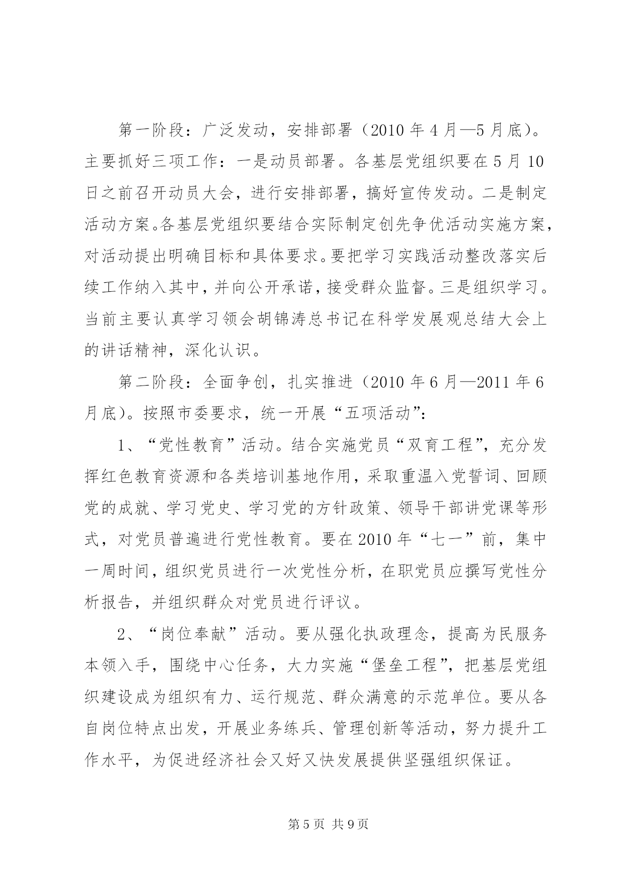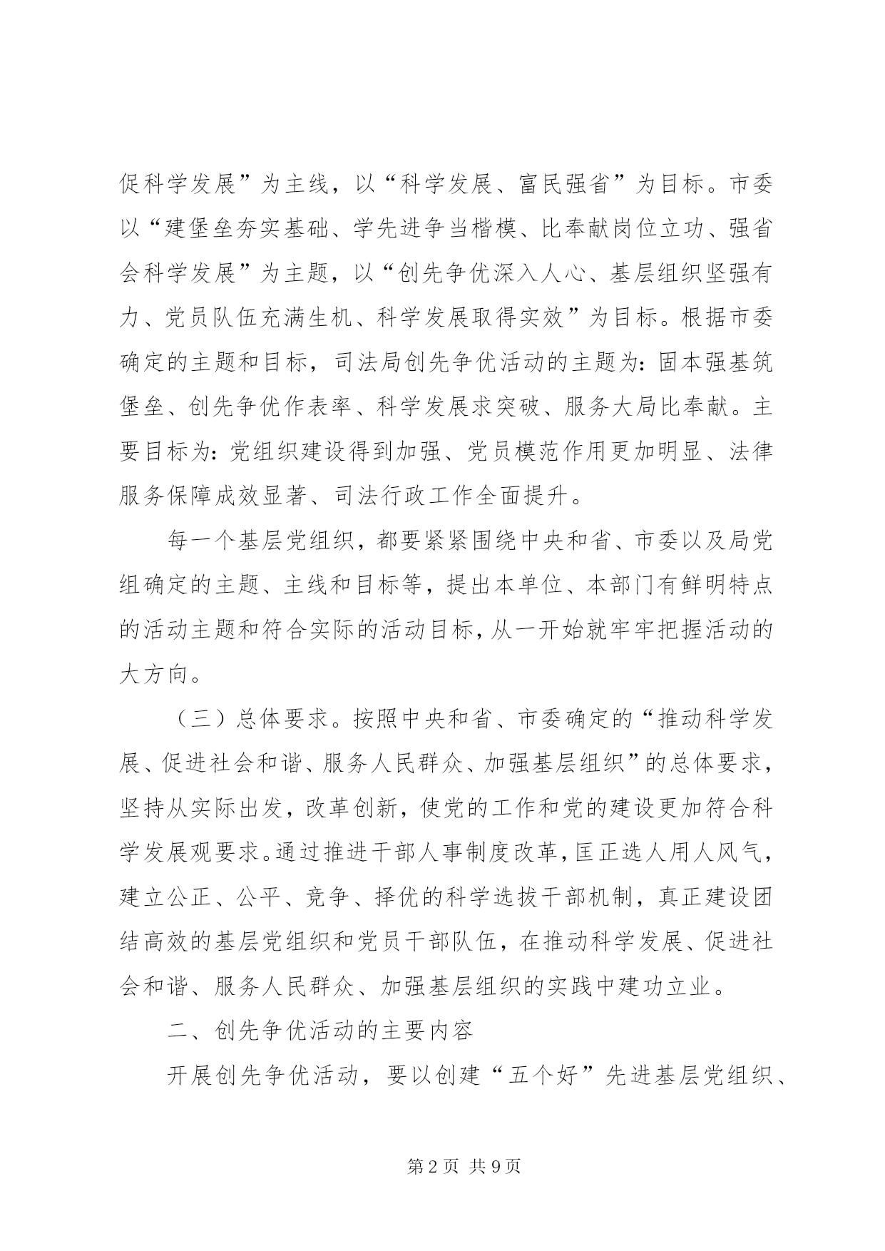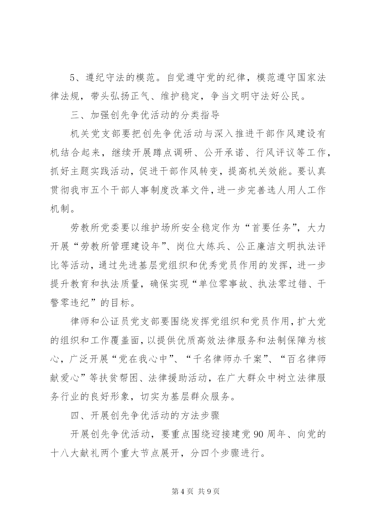 第PAGE\*Arabic\*MERGEFORMAT9页共NUMPAGES\*MERGEFORMAT9页某市司法局创先争优活动实施方案xx市司法局党组关于在基层党组织和全体党员中深入开展创先争优活动的实施方案根据中央和省、市委的安排部署,从2010年4月开始,到党的十八大召开前,按照市委《关于在全市基层党组织和党员中深入开展创先争优活动的实施方案》(石办发〔2010〕3号)要求,结合我局实际,经局党组研究决定,在局机关和下属单位基层党组织和全体党员中深入开展创建先进基层党组织、争当优秀共产党员活动(以下简称“创先争优活动”),现提出如下实施方案。一、指导思想活动主题和总体要求(一)指导思想。深入开展创先争优活动,要以邓--理论和“三个代表”重要思想为指导,深入学习实践科学发展观,围绕打造繁华舒适现代一流的省会城市为目标,进一步深化干部人事制度改革,大力加强基层党组织建设和党员队伍建设,充分发挥基层党组织的战斗堡垒作用和共产党员的先锋模范作用,全面提升司法行政工作水平,促进全市经济社会又好又快发展。(二)活动主题。中央明确创先争优活动要以深入学习实践科学发展观为主题,省委明确要以“筑坚强堡垒、树先锋形象、促科学发展”为主线,以“科学发展、富民强省”为目标。市委以“建堡垒夯实基础、学先进争当楷模、比奉献岗位立功、强省会科学发展”为主题,以“创先争优深入人心、基层组织坚强有力、党员队伍充满生机、科学发展取得实效”为目标。根据市委确定的主题和目标,司法局创先争优活动的主题为:固本强基筑堡垒、创先争优作表率、科学发展求突破、服务大局比奉献。主要目标为:党组织建设得到加强、党员模范作用更加明显、法律服务保障成效显著、司法行政工作全面提升。每一个基层党组织,都要紧紧围绕中央和省、市委以及局党组确定的主题、主线和目标等,提出本单位、本部门有鲜明特点的活动主题和符合实际的活动目标,从一开始就牢牢把握活动的大方向。(三)总体要求。按照中央和省、市委确定的“推动科学发展、促进社会和谐、服务人民群众、加强基层组织”的总体要求,坚持从实际出发,改革创新,使党的工作和党的建设更加符合科学发展观要求。通过推进干部人事制度改革,匡正选人用人风气,建立公正、公平、竞争、择优的科学选拔干部机制,真正建设团结高效的基层党组织和党员干部队伍,在推动科学发展、促进社会和谐、服务人民群众、加强基层组织的实践中建功立业。二、创先争优活动的主要内容开展创先争优活动,要以创建“五个好”先进基层党组织、争当“五个模范”优秀共产党员为主要内容。先进基层党组织的标准:1、领导班子好。深入学习实践科学发展观,团结协作,求真务实,勤政廉洁,有较强的凝聚力和战斗力。要按照深化干部人事制度改革要求,建设充满活力的领导班子。2、党员队伍好。党员素质优良,有较强的党员意识,能够充分发挥先锋模范作用。3、工作机制好。规章制度完善,管理措施到位,工作运行有序。5、群众反映好。基层党组织在群众中有较高威信,党员在群众中有良好形象。优秀共产党员的标准:1、自觉学习的模范。认真学习实践科学发展观,学习新知识、新技能,不断提升党性、提高素质。2、执行政策的模范。积极响应党组织号召,坚决把党组织要求和各项规定落到实处。尤其党员领导干部要在深化干部人事制度改革、树立良好用人导向上起示范带头作用。3、服务群众的模范。主动联系群众,积极为群众解难题、办实事,自觉维护群众正当权益。4、爱岗敬业的模范。在本职岗位上埋头苦干、开拓创新、无私奉献,带头争创佳绩。5、遵纪守法的模范。自觉遵守党的纪律,模范遵守国家法律法规,带头弘扬正气、维护稳定,争当文明守法好公民。三、加强创先争优活动的分类指导机关党支部要把创先争优活动与深入推进干部作风建设有机结合起来,继续开展蹲点调研、公开承诺、行风评议等工作,抓好主题实践活动,促进干部作风转变,提高机关效能。要认真贯彻我市五个干部人事制度改革文件,进一步完善选人用人工作机制。劳教所党委要以维护场所安全稳定作为“首要任务”,大力开展“劳教所管理建设年”、岗位大练兵、公正廉洁文明执法评比等活动,通过先进基层党组织和优秀党员作用的发挥,进一步提升教育和执法质量,确保实现“单位零事故、执法零过错、干警零违纪”的目标。律师和公证员党支部要围绕发挥党组织和党员作用,扩大党的组织和工作覆盖面,以提供优质高效法律服务和法制保障为核心,广泛开展“党在我心中”、“千名律师办千案”、“百名律师献爱心”等扶贫帮困、法律援助活动,在广大群众中树立法律服务行业的良好形象,切实为基层群众服务。四、开展创先争优活动的方法步骤开展创先争优活动,要重点围绕迎接建党90周年、向党的十八大献礼两个重大节点展开,分四个步骤进行。第一阶段:广泛发动,安排部署(2010年4月—5月底)。主要抓好三项工作